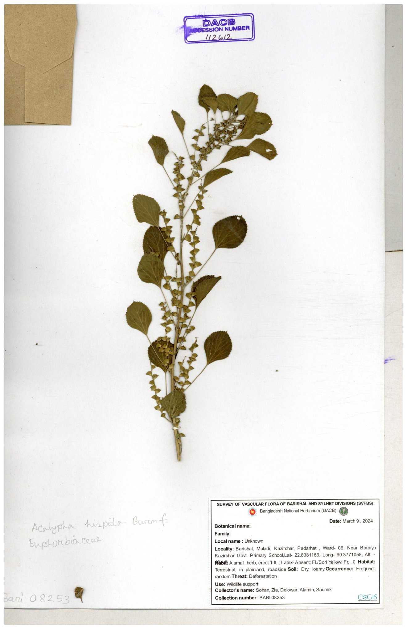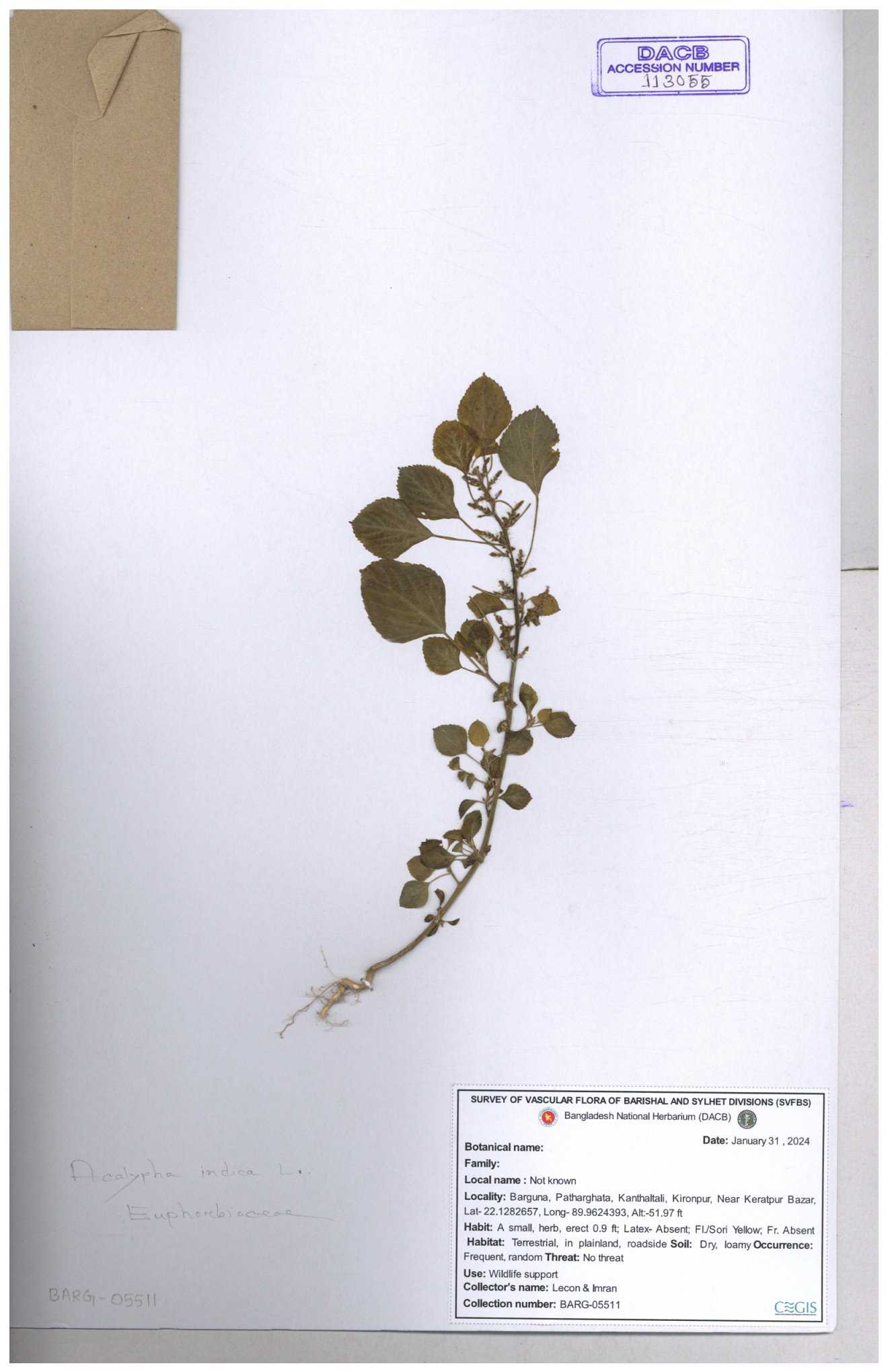 | 11002 | Euphorbiaceae | Acalypha indica Linn. | Hasan, Huq & Nazrul | H-3861 30-11--0001 |