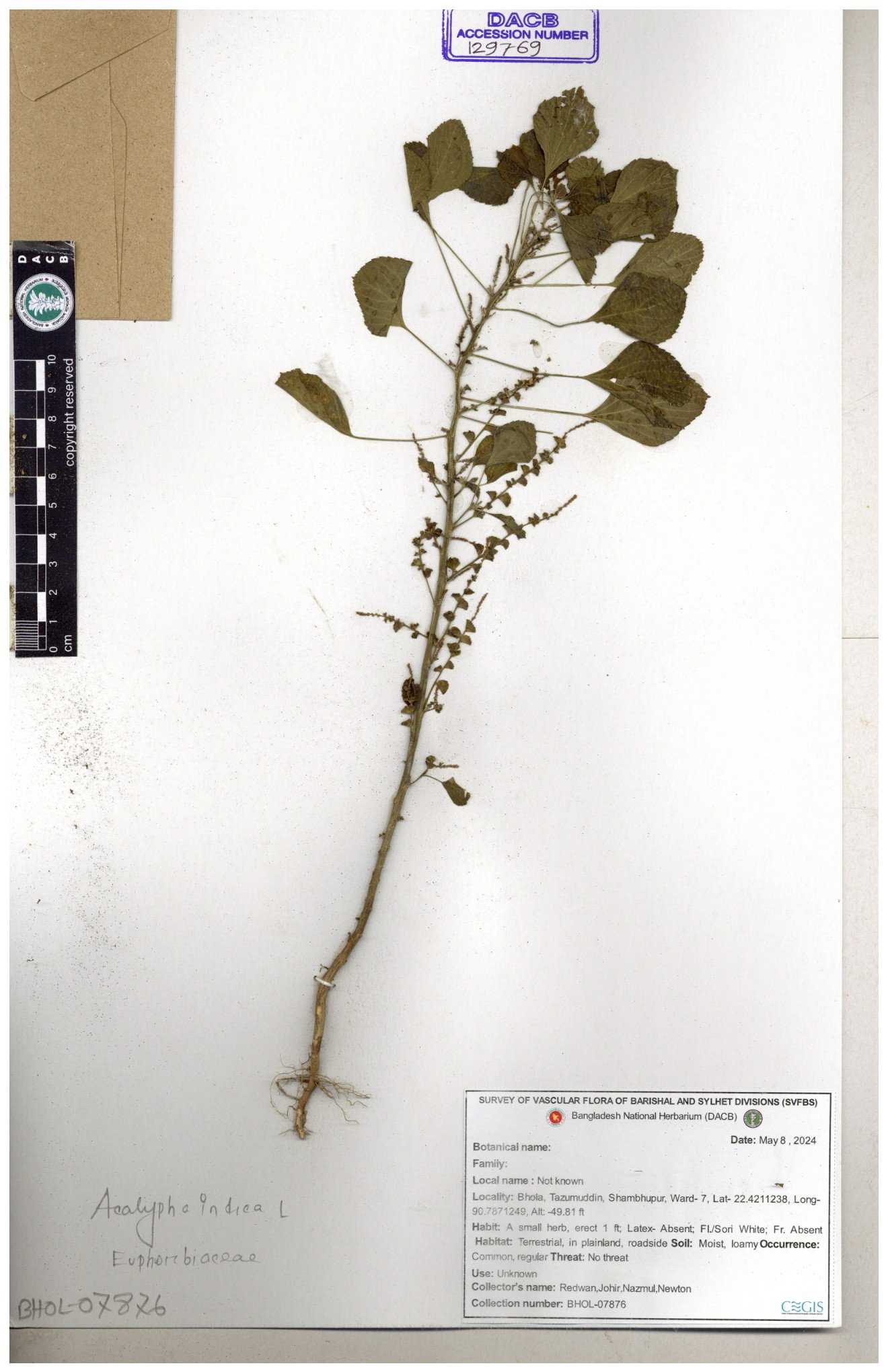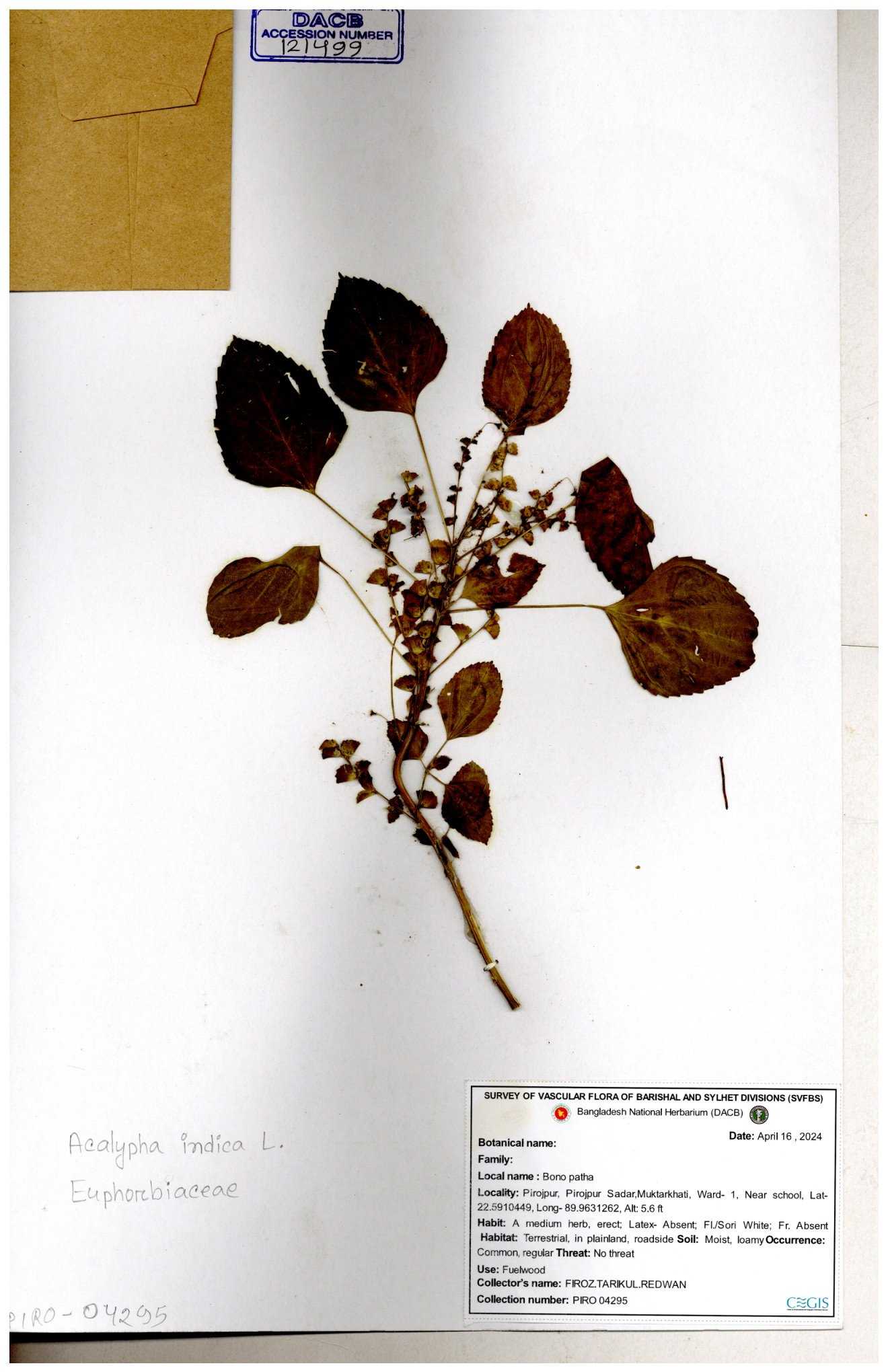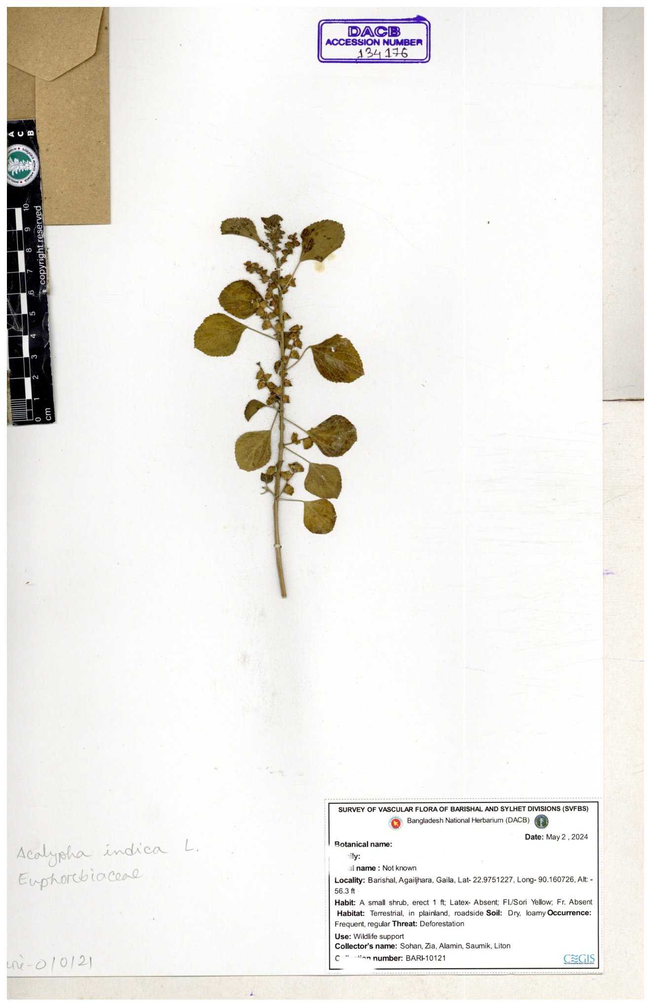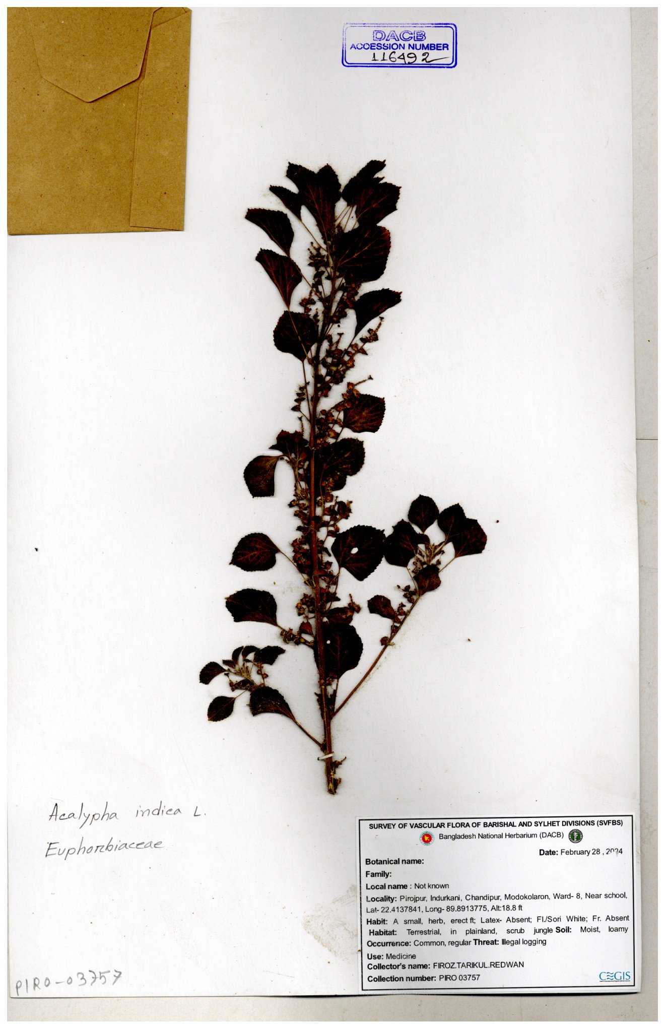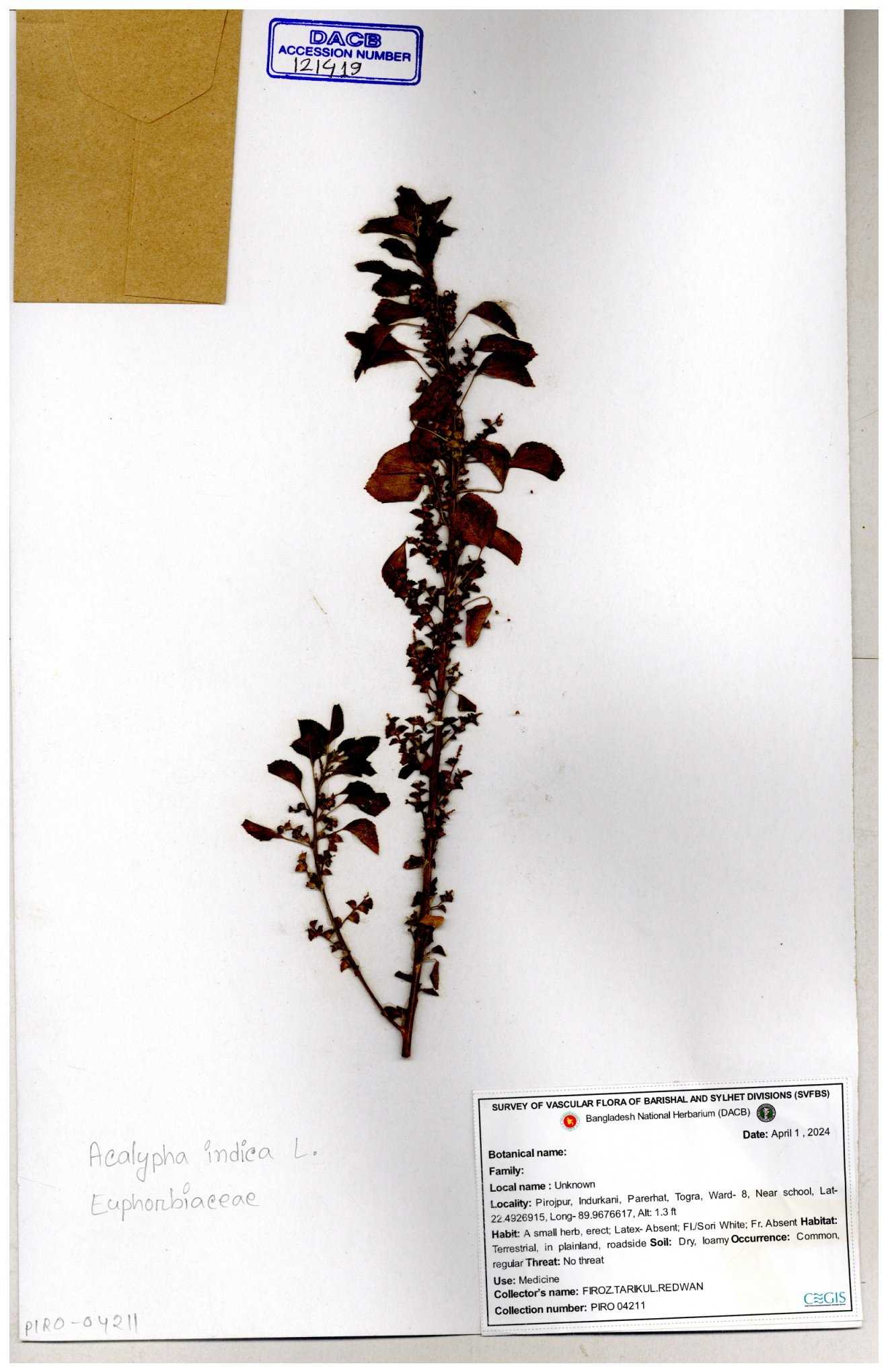 | 10988 | Euphorbiaceae | Acalypha indica Linn. | Mia, Rahman, Mahbuba & Rizia | M-2880 30-11--0001 |
