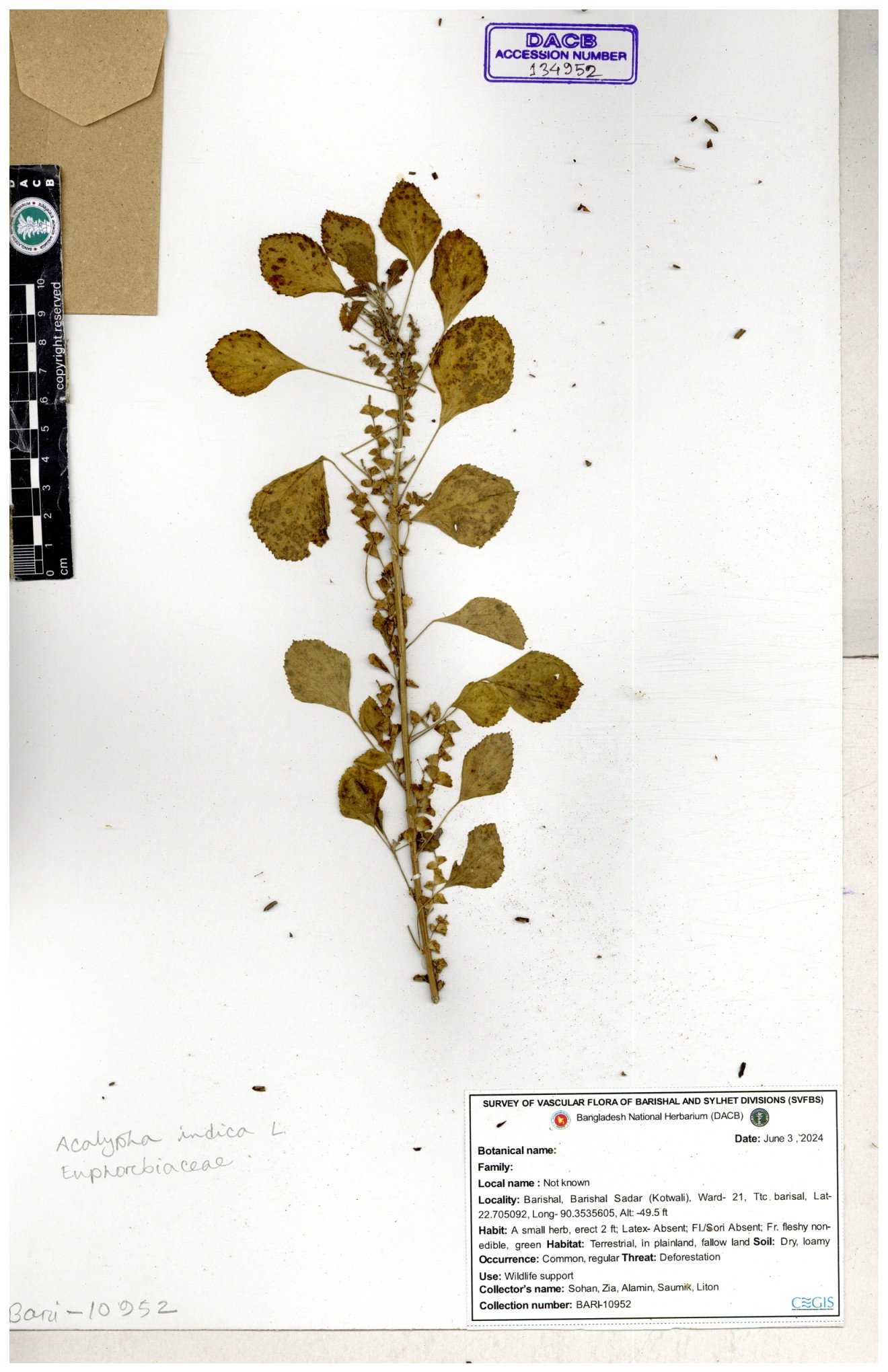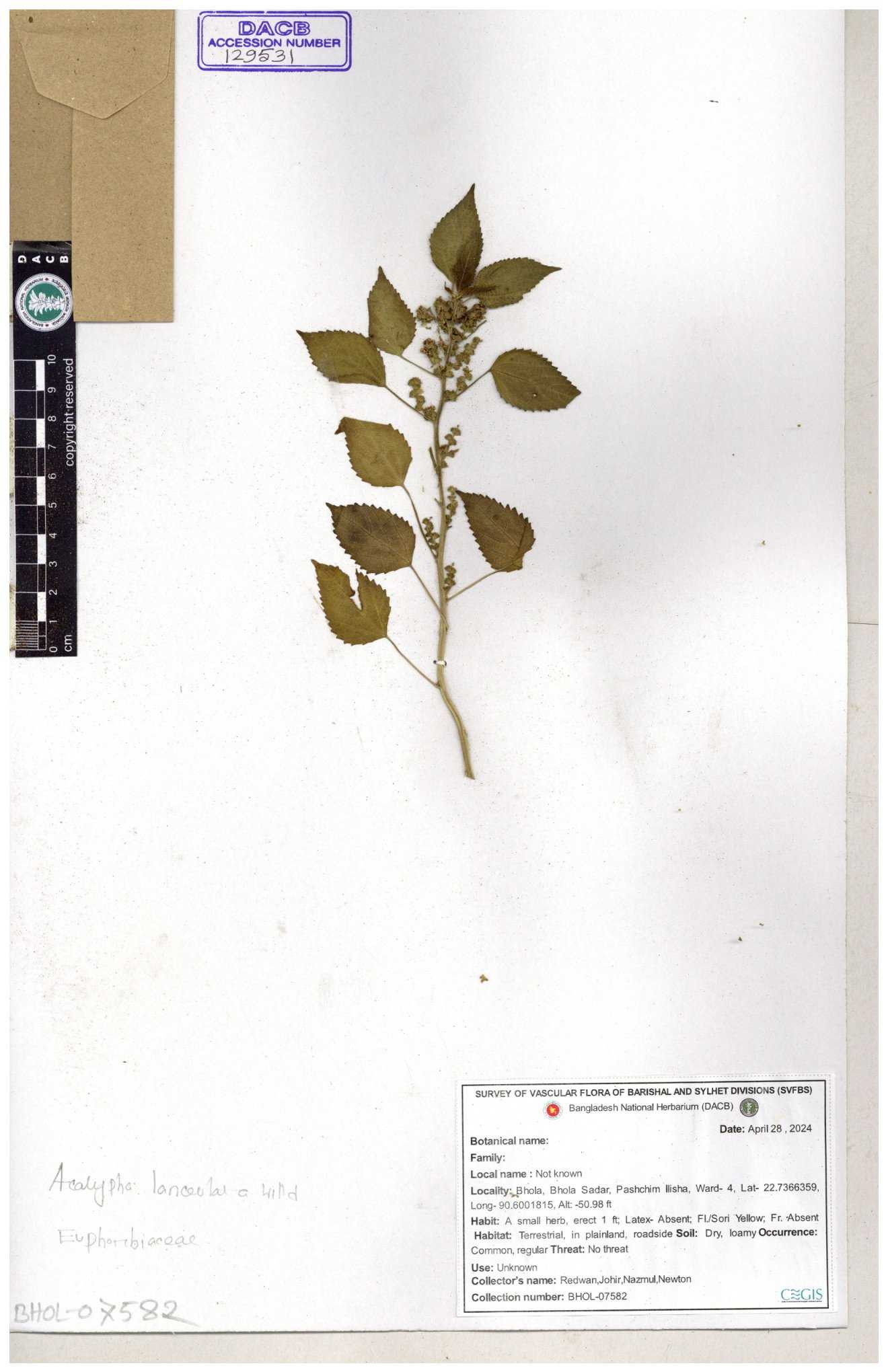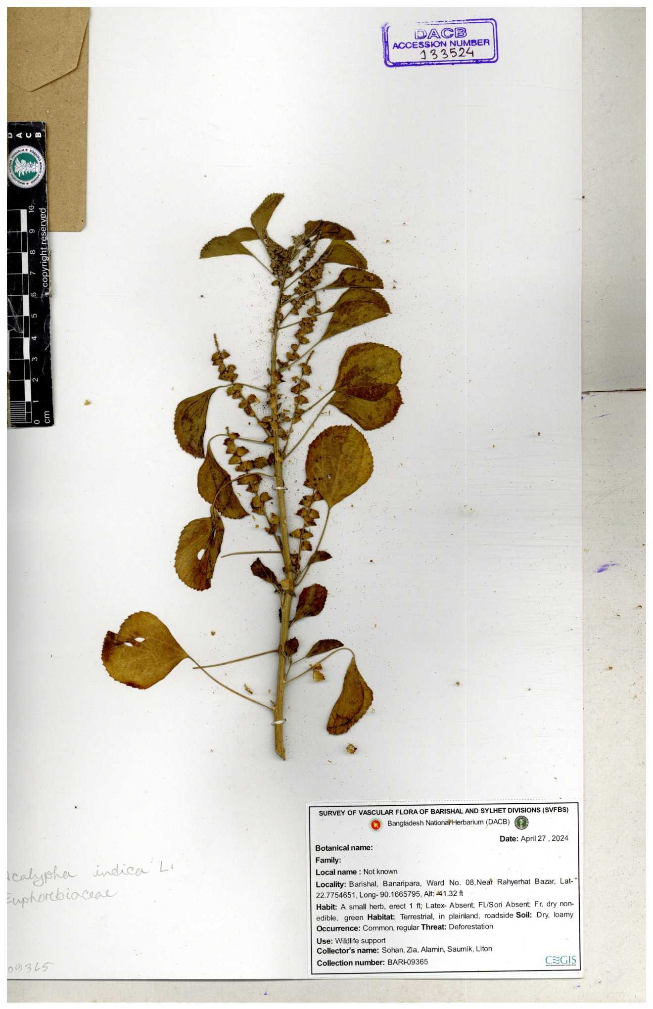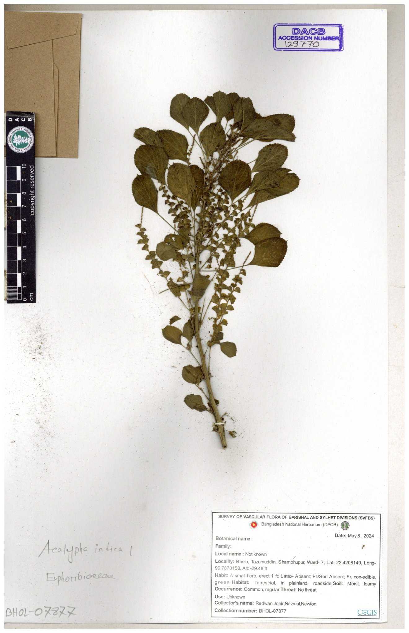 | 10988 | Euphorbiaceae | Acalypha indica Linn. | Mia, Rahman, Mahbuba & Rizia | M-2880 30-11--0001 |