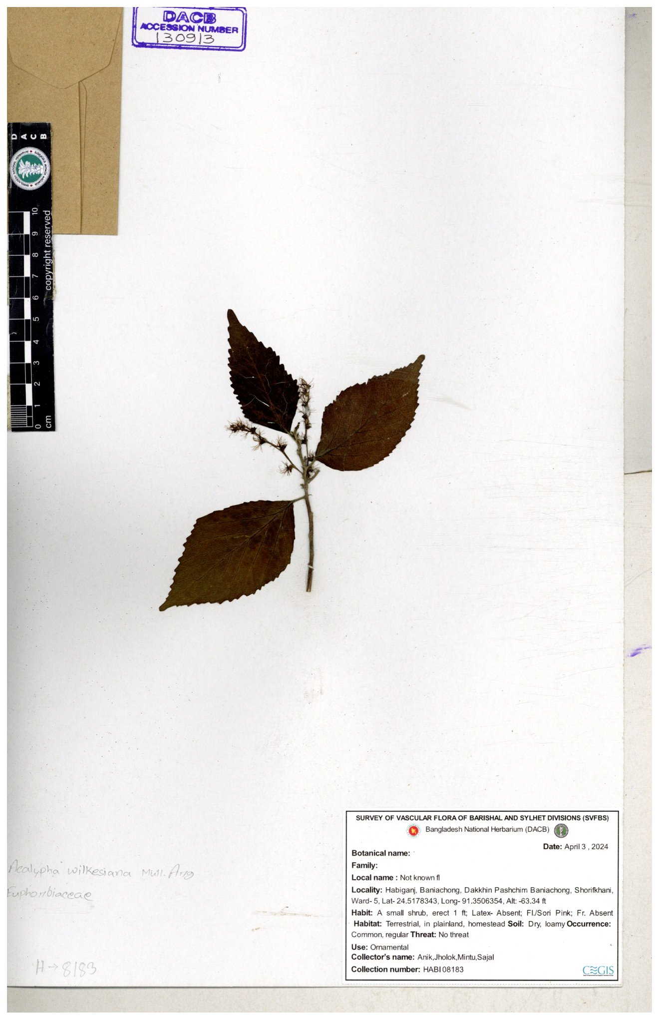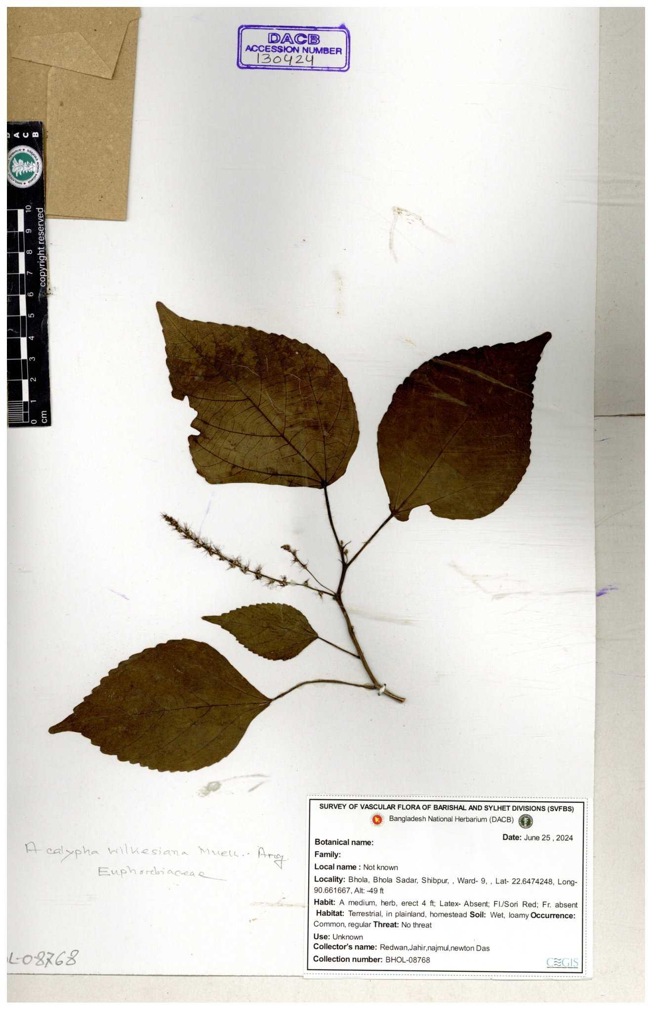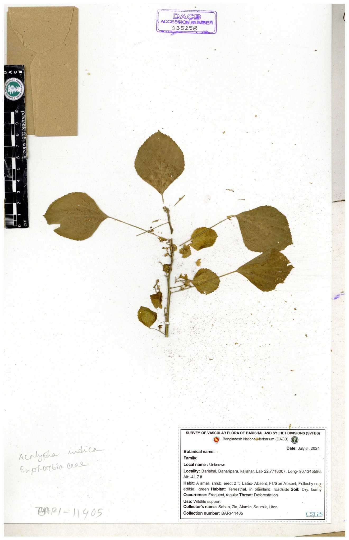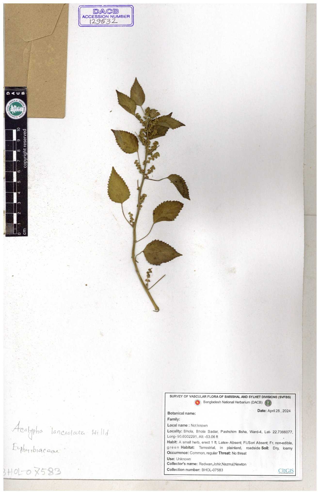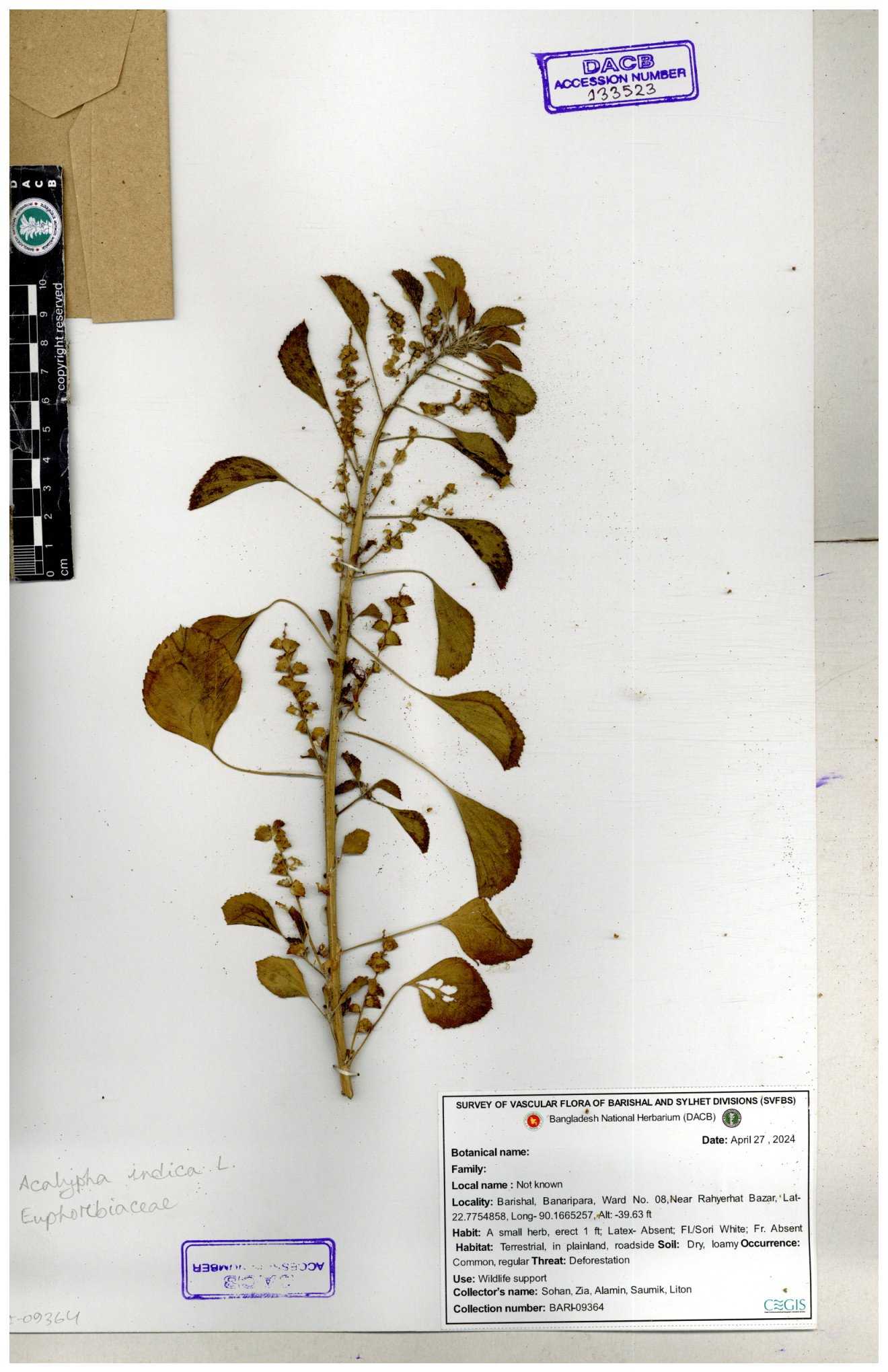 | 10988 | Euphorbiaceae | Acalypha indica Linn. | Mia, Rahman, Mahbuba & Rizia | M-2880 30-11--0001 |