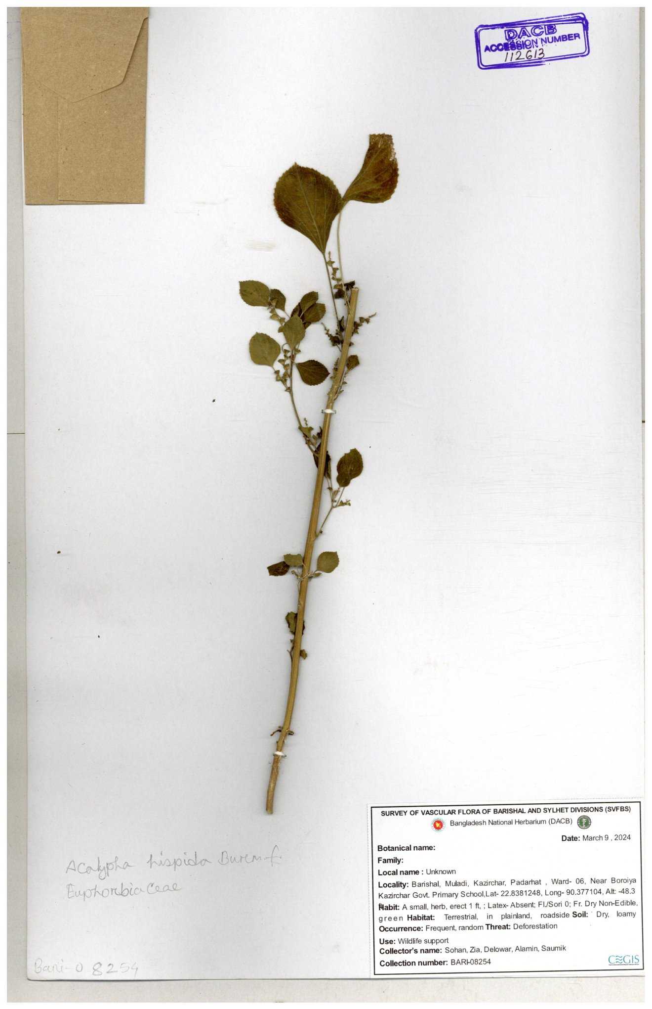 | 10996 | Euphorbiaceae | Acalypha indica Linn. | Huq, Mia & Mahbuba | H-6142 09-02-1983 |