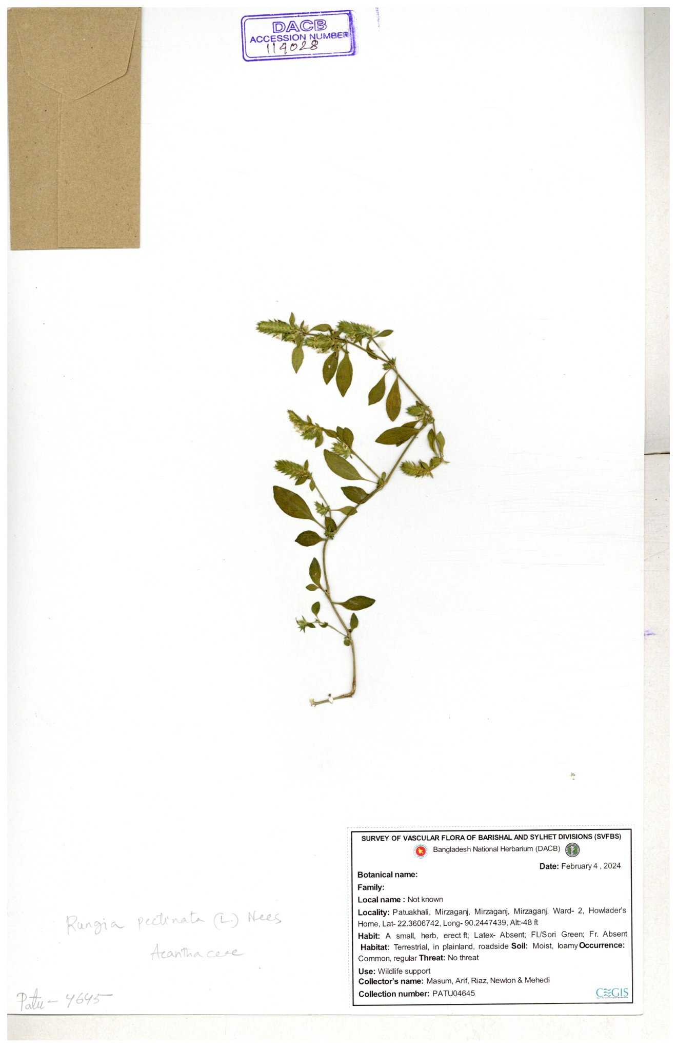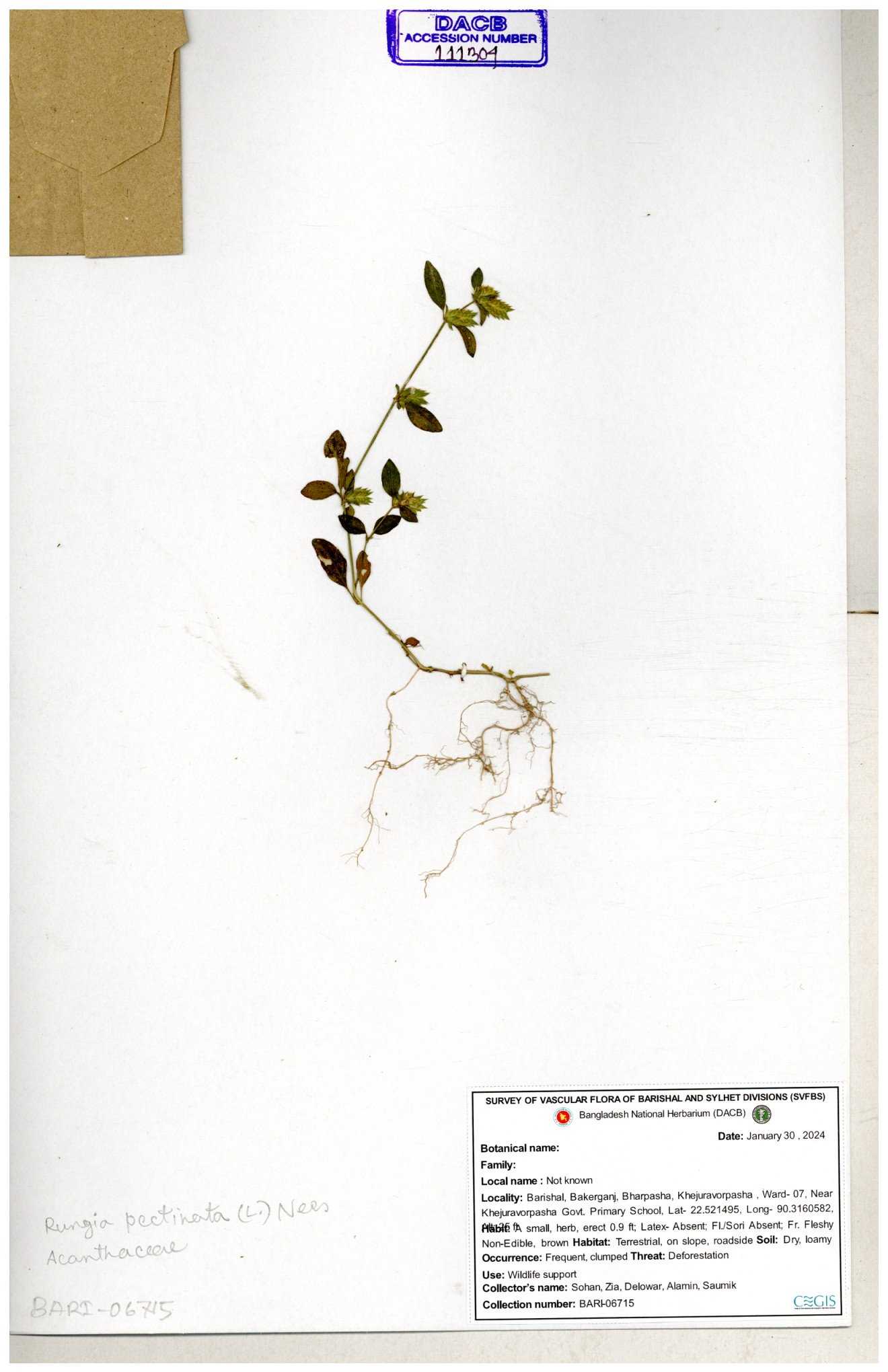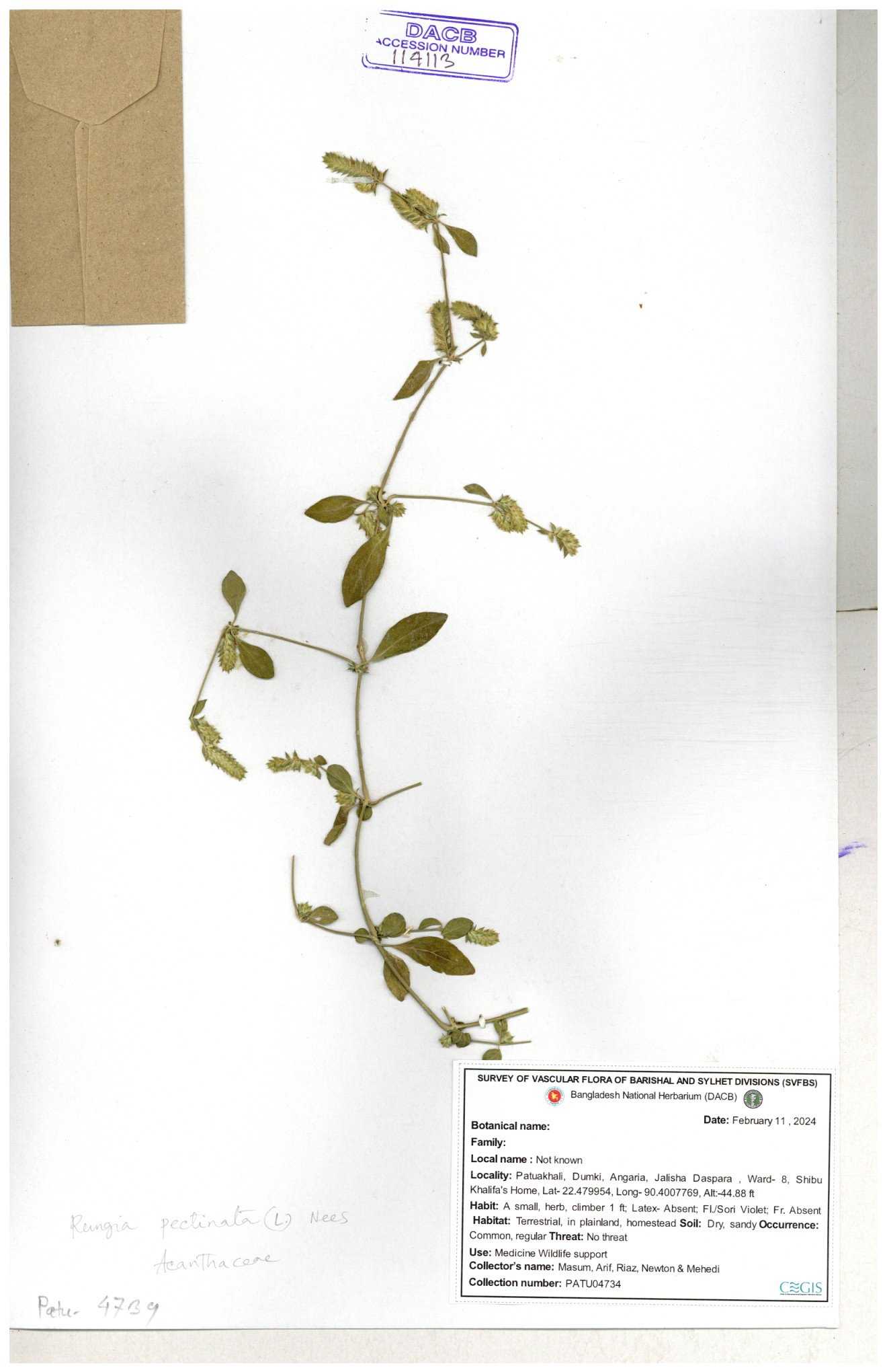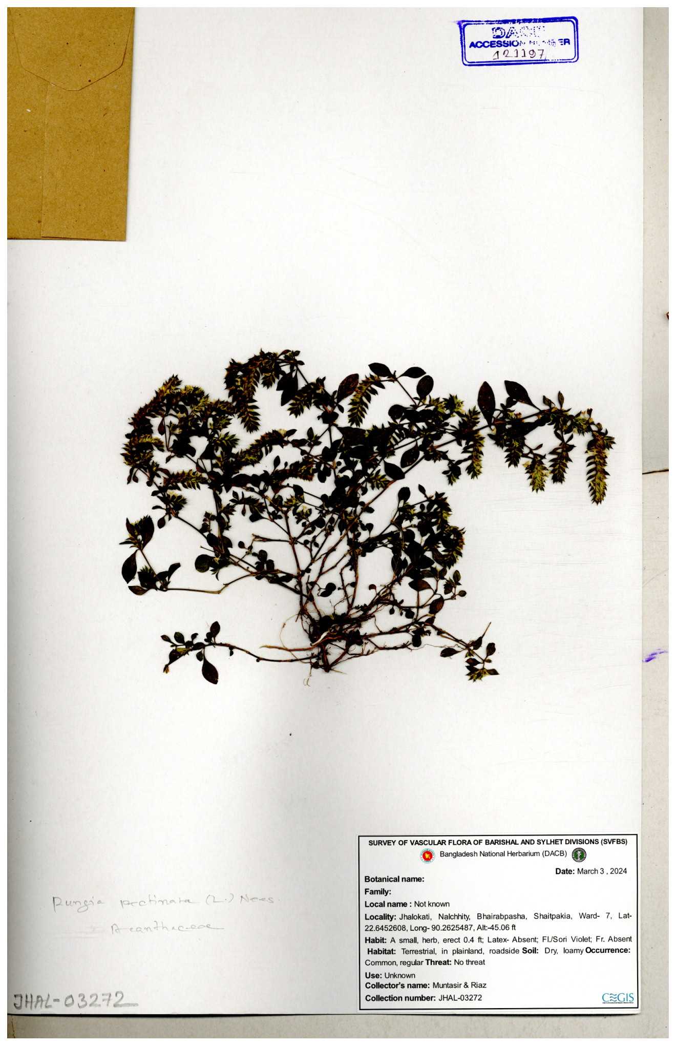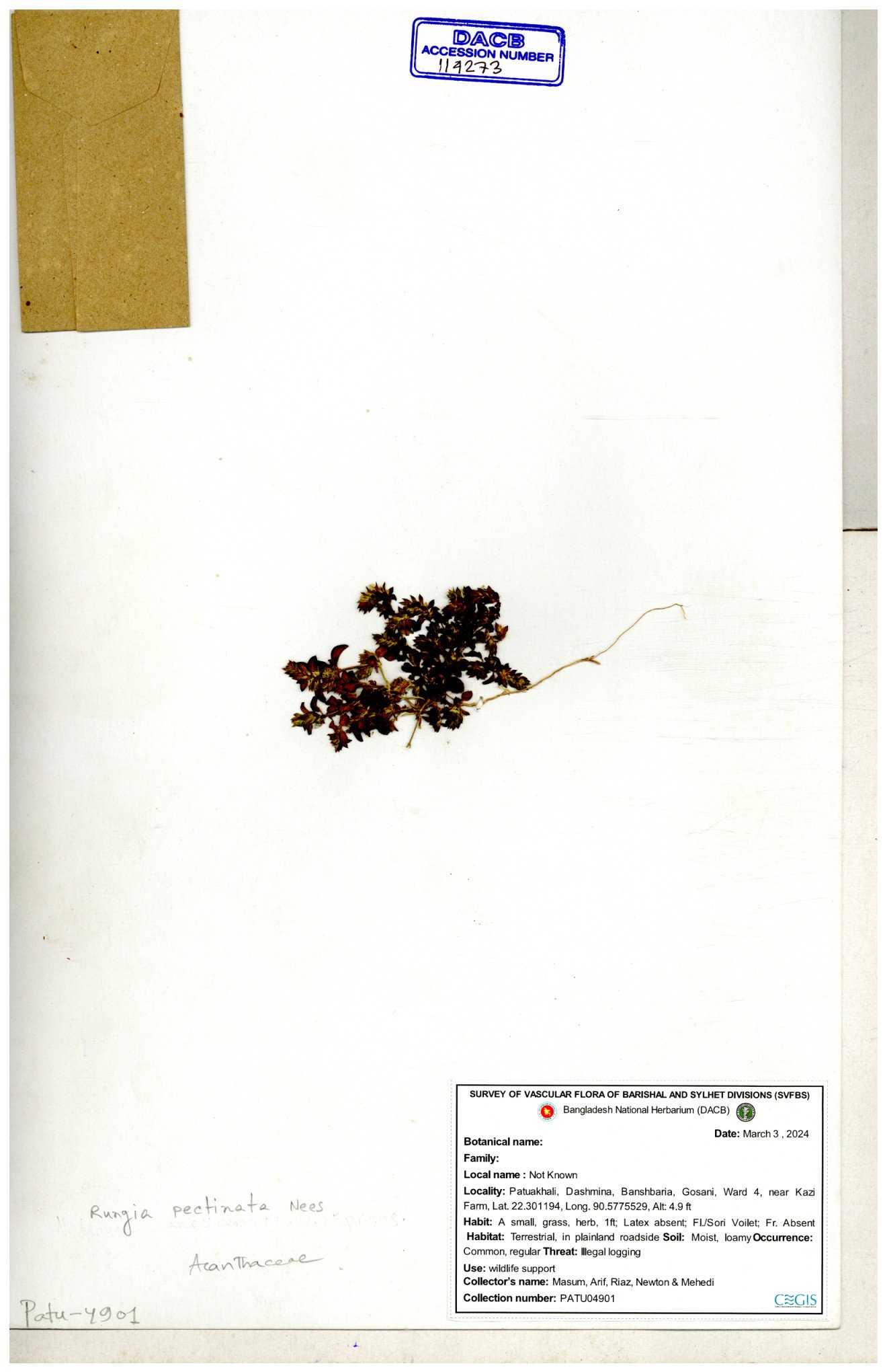 | 66564 | Acanthaceae | Rungia Pectinata | Haktol nogor (Chakma) | Joyanta, Mominur, Al amin, Kamrul & Suborno | JCR-2508 30-01-2017 |