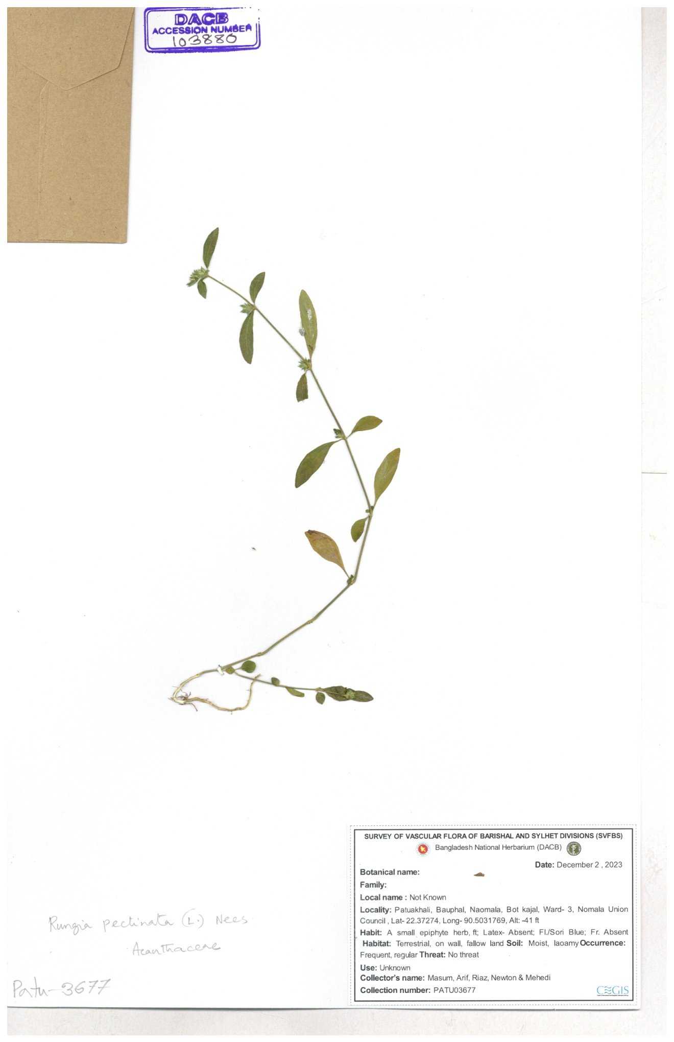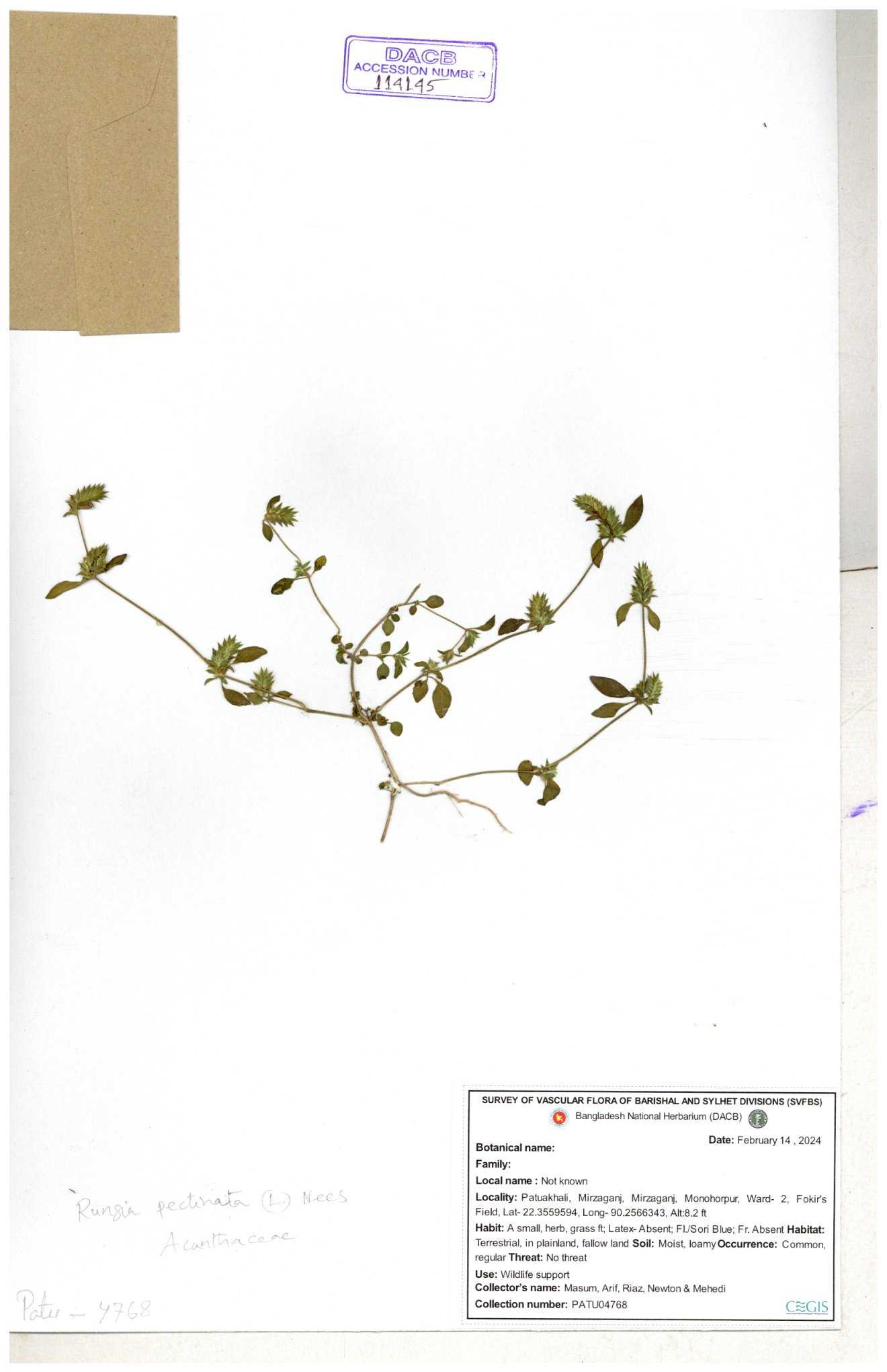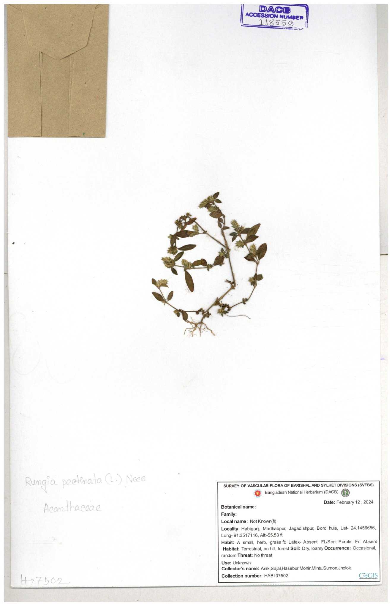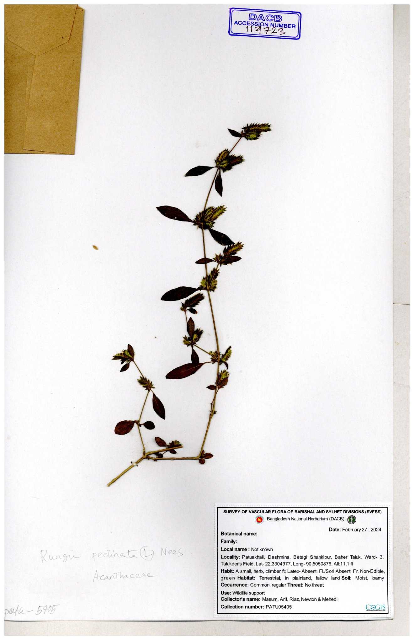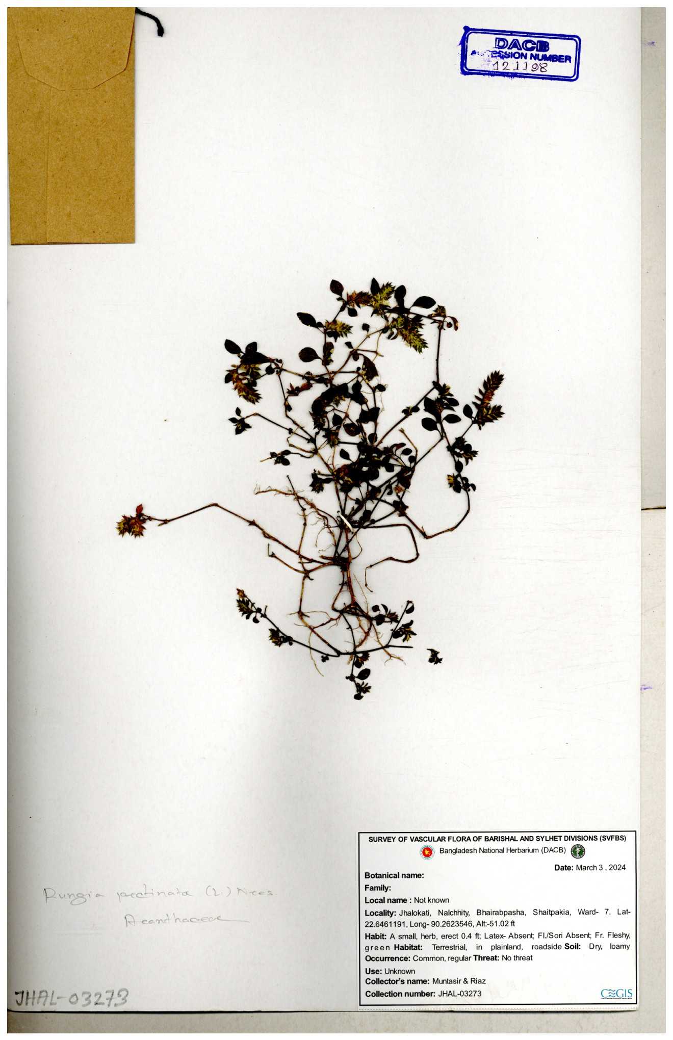 | 66564 | Acanthaceae | Rungia Pectinata | Haktol nogor (Chakma) | Joyanta, Mominur, Al amin, Kamrul & Suborno | JCR-2508 30-01-2017 |