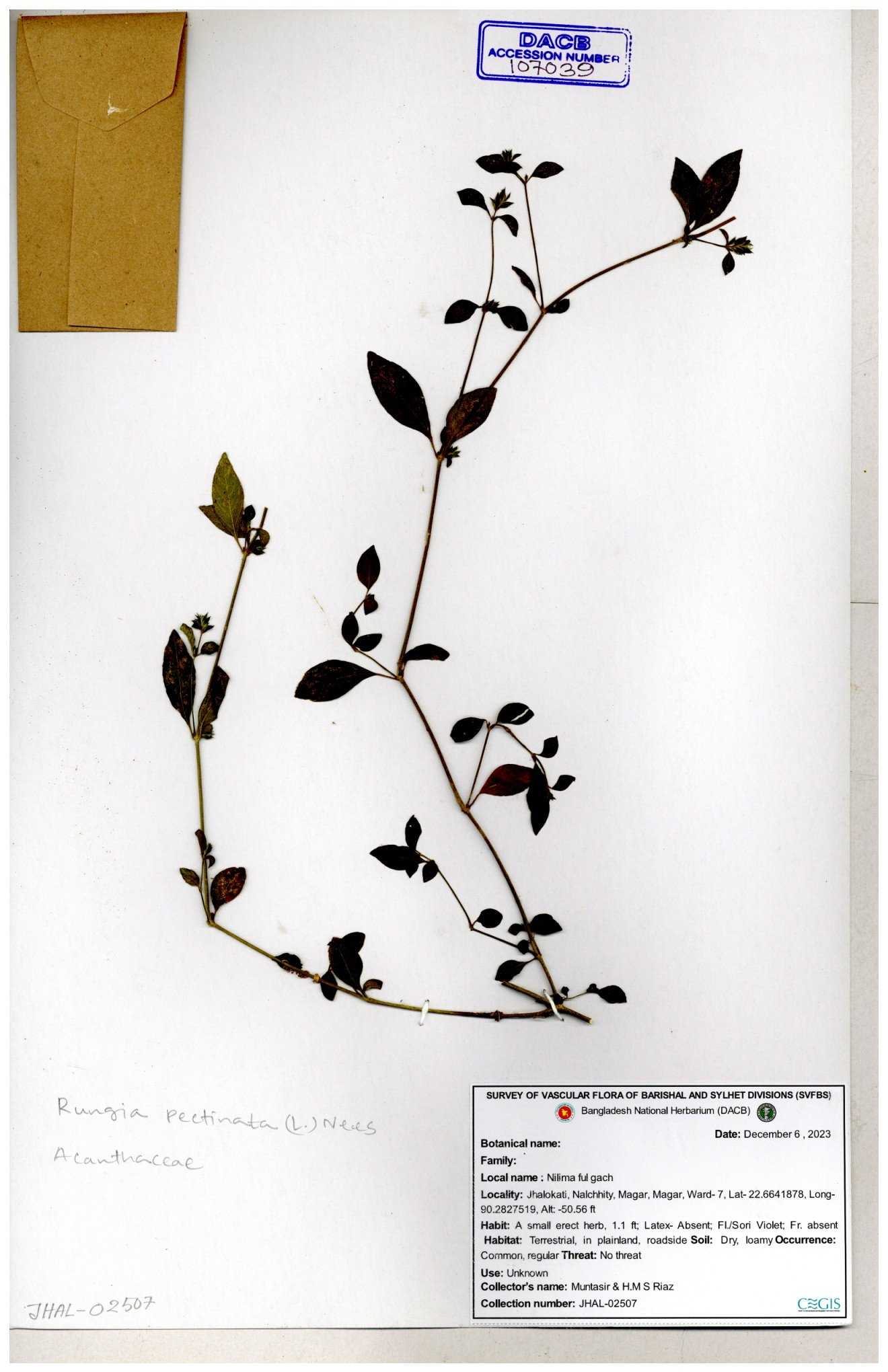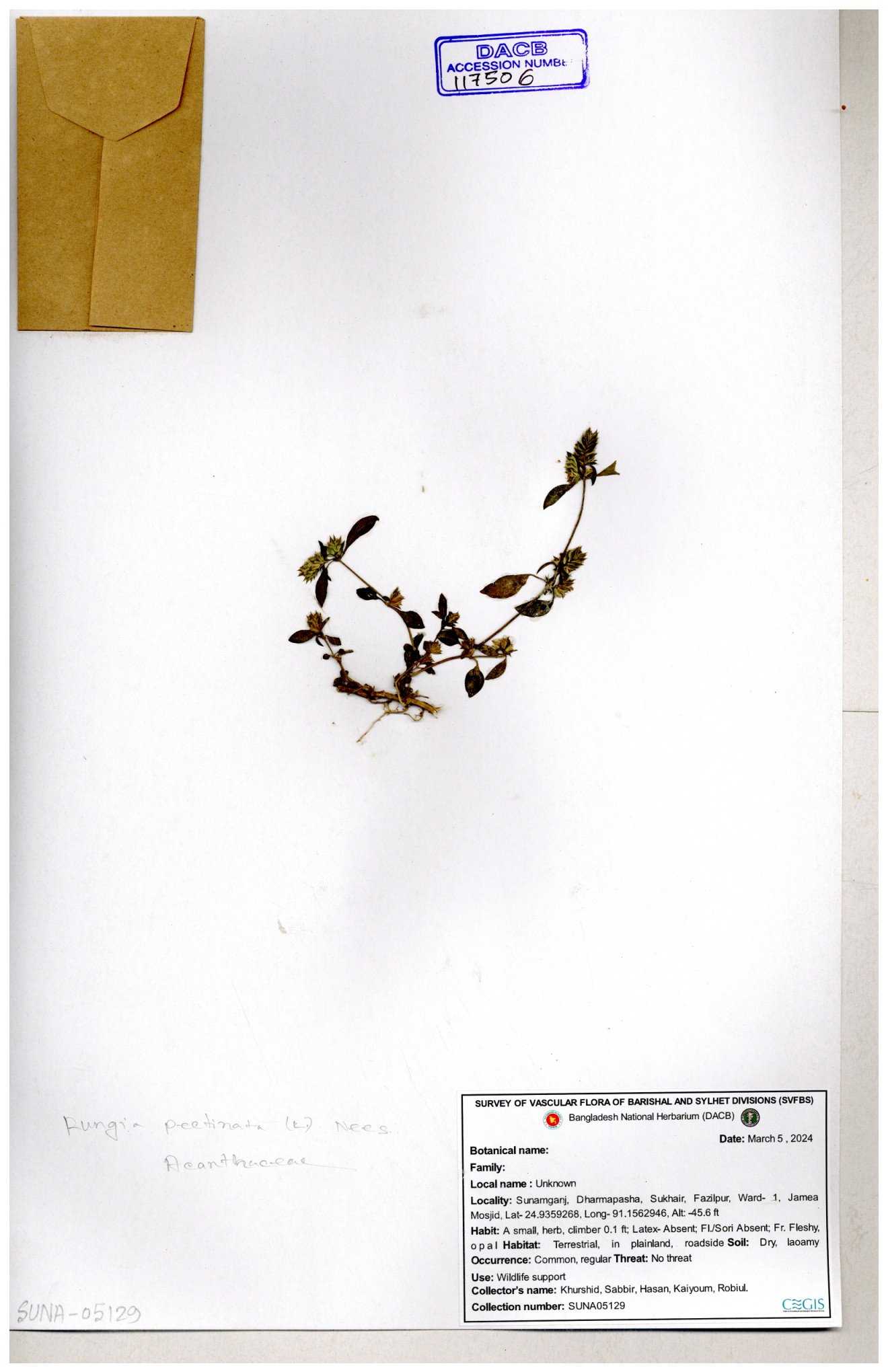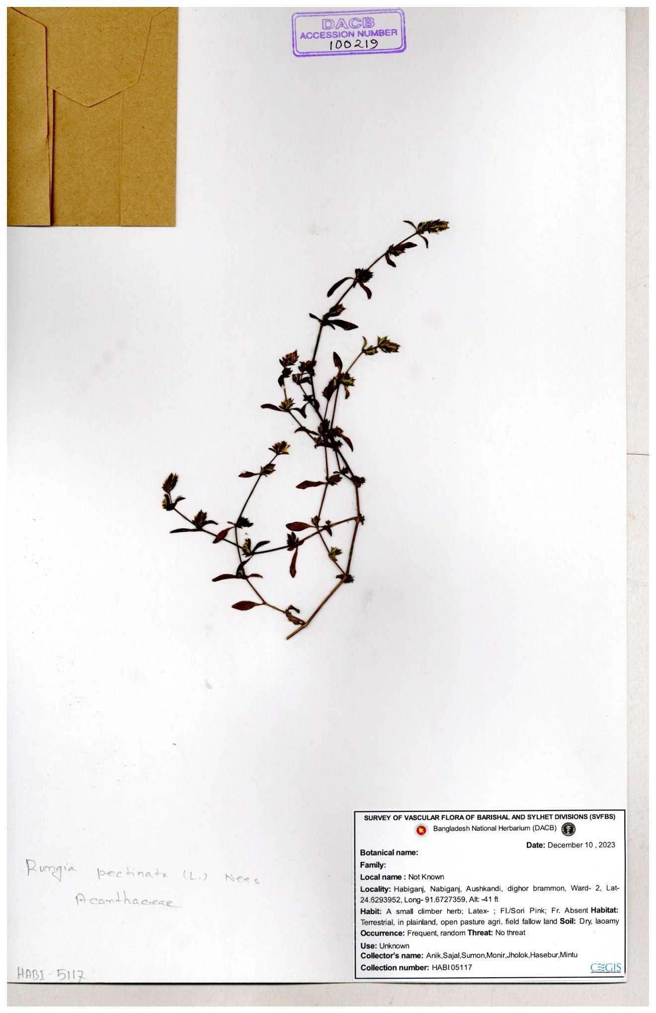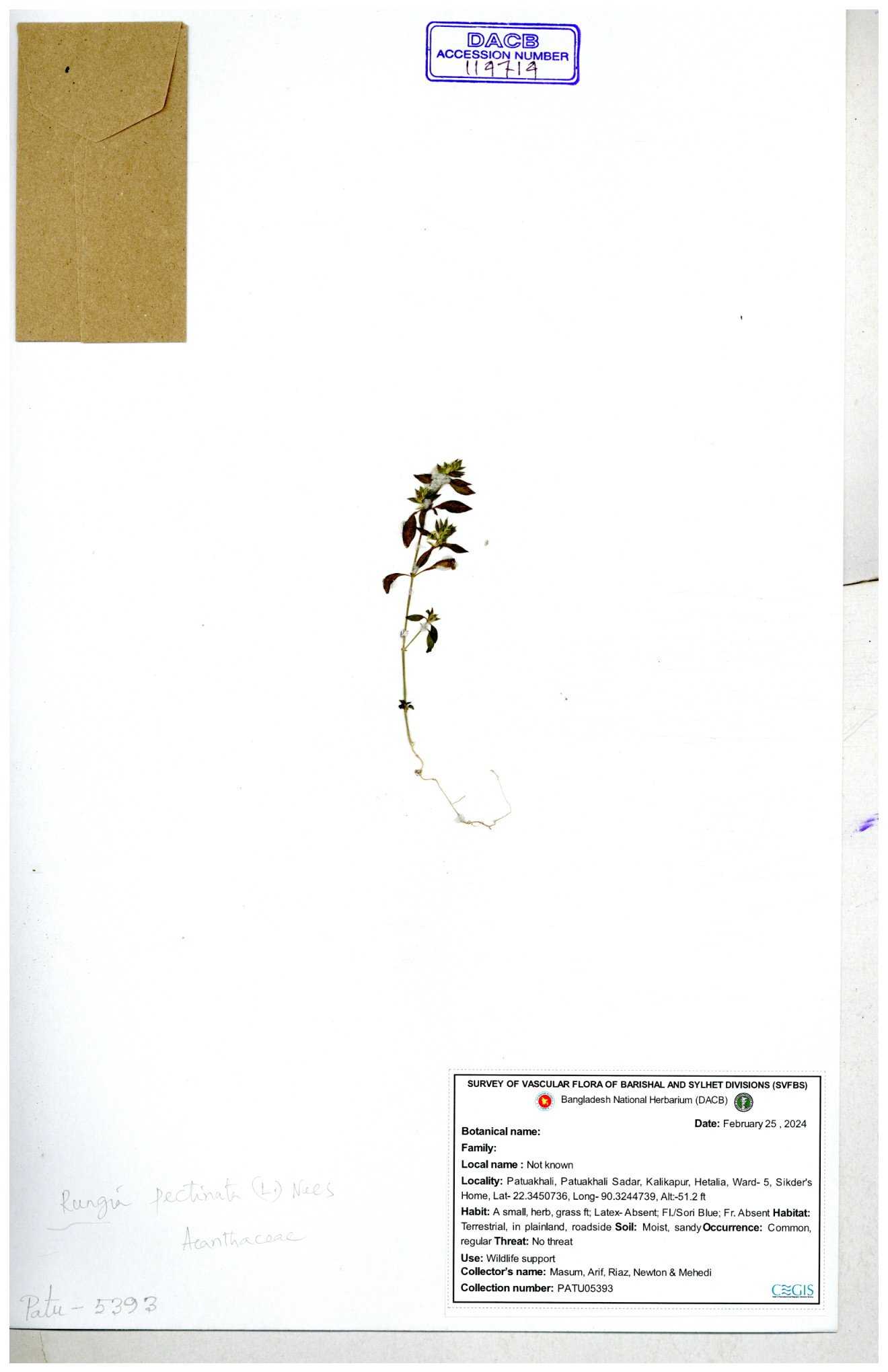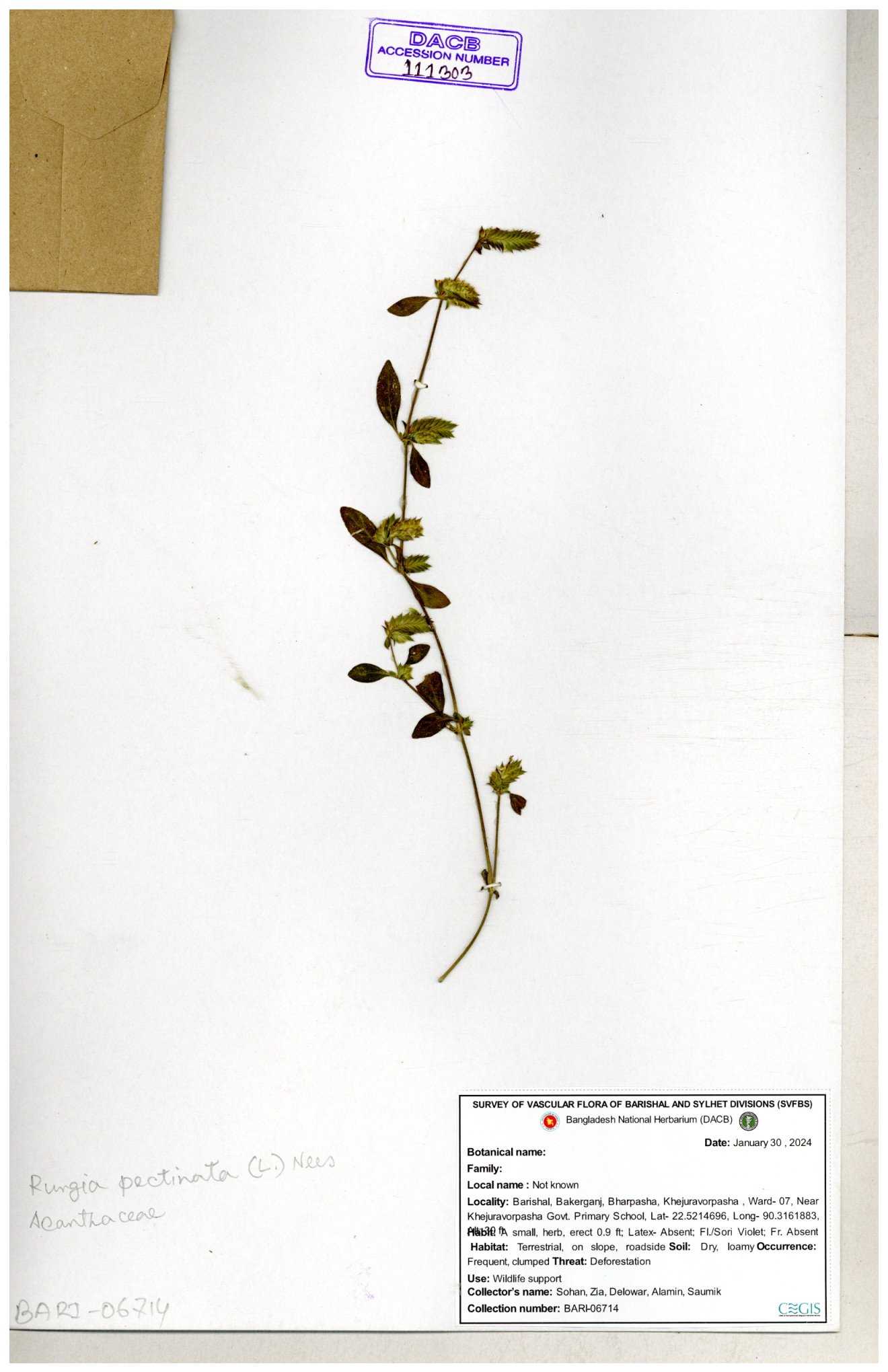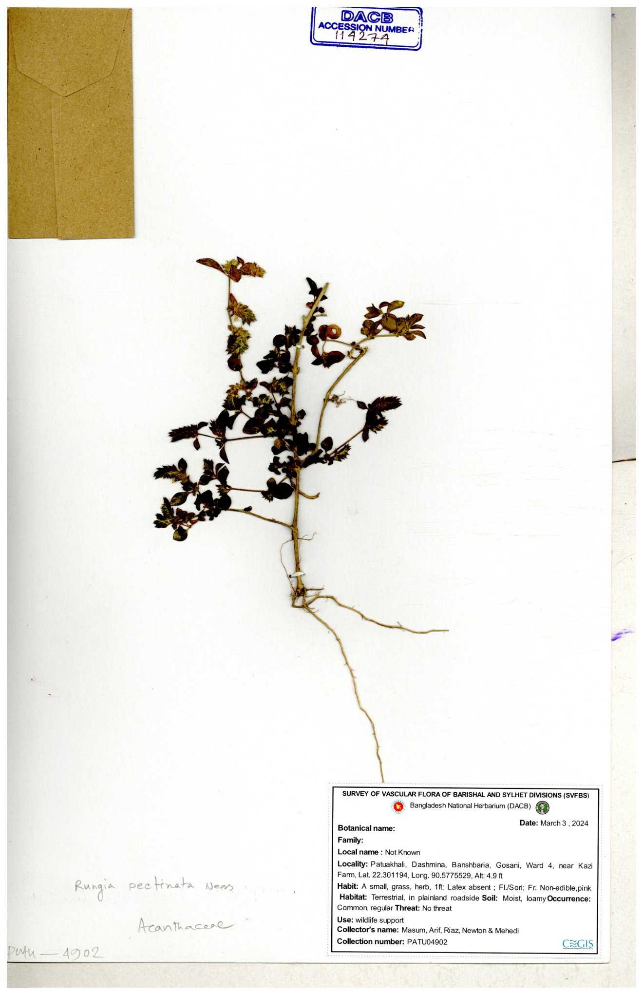 | 66564 | Acanthaceae | Rungia Pectinata | Haktol nogor (Chakma) | Joyanta, Mominur, Al amin, Kamrul & Suborno | JCR-2508 30-01-2017 |