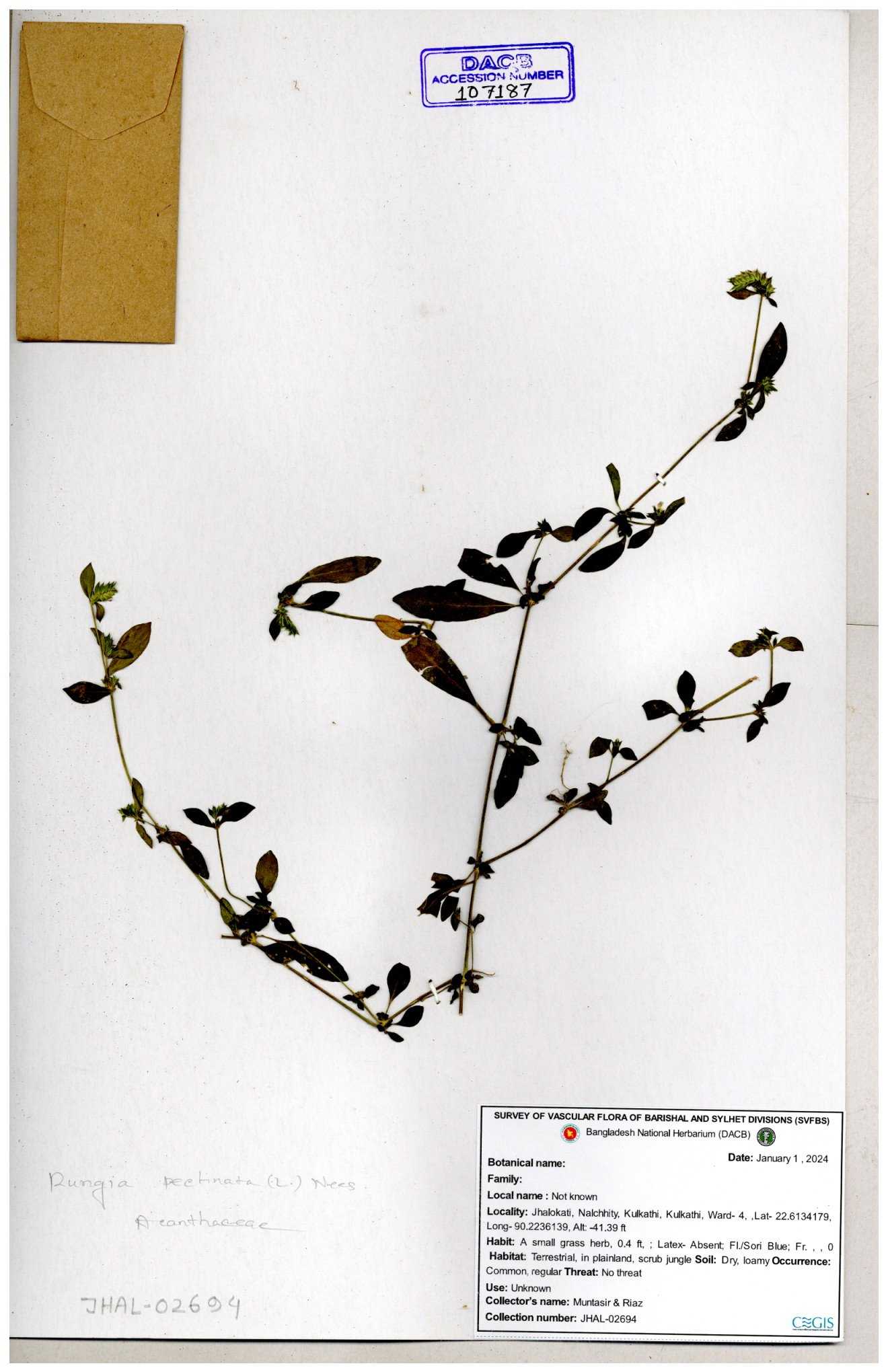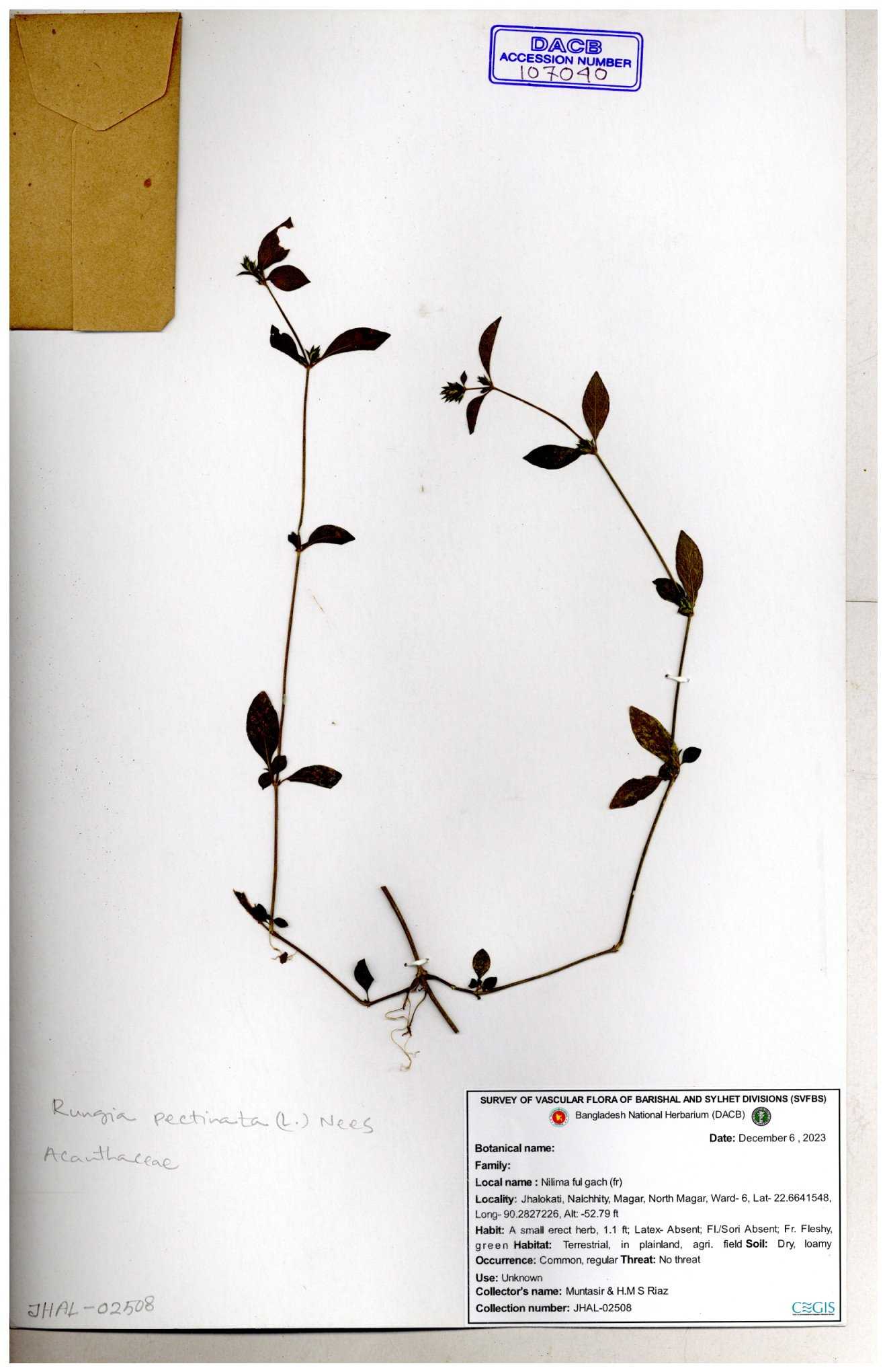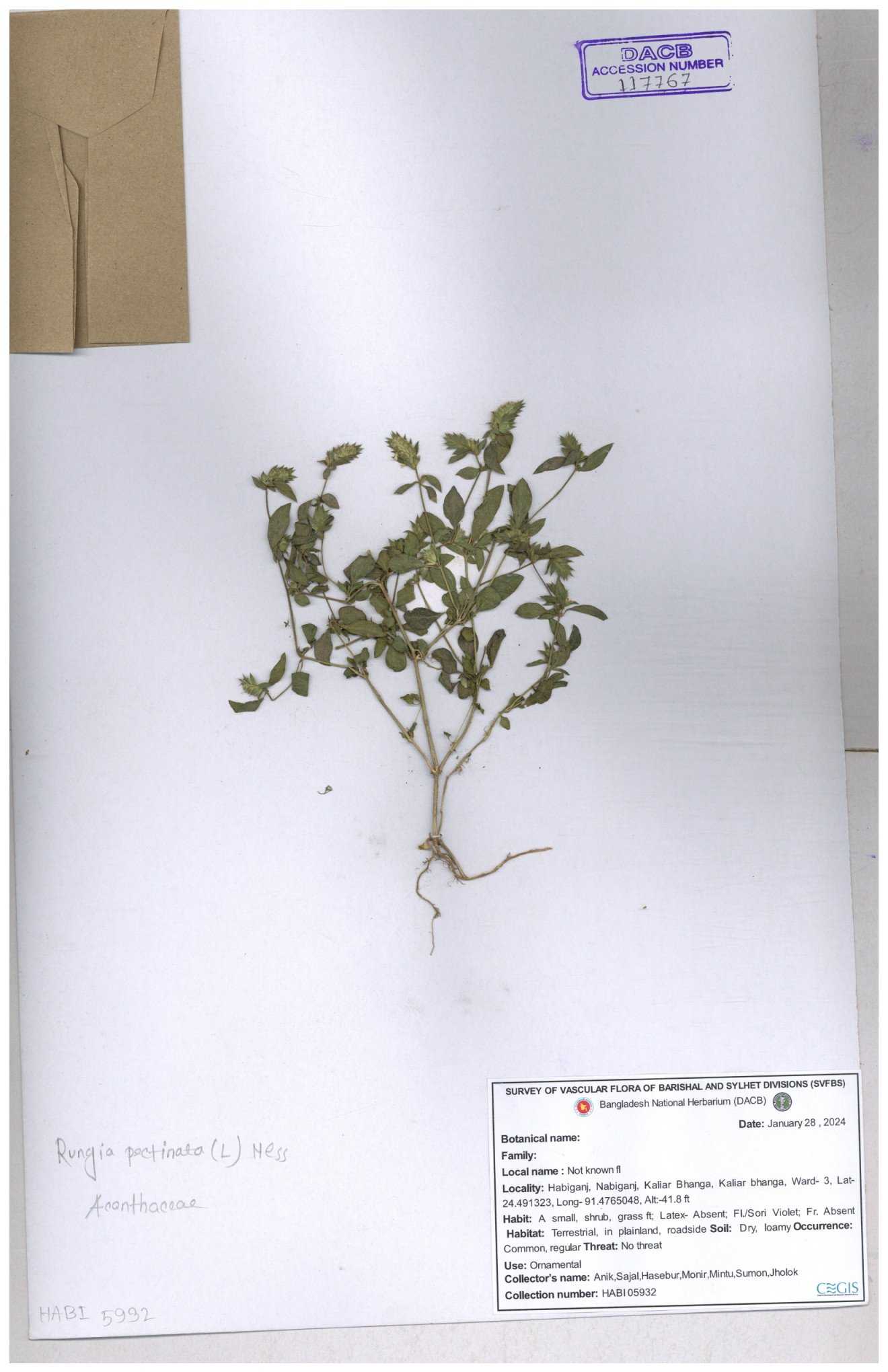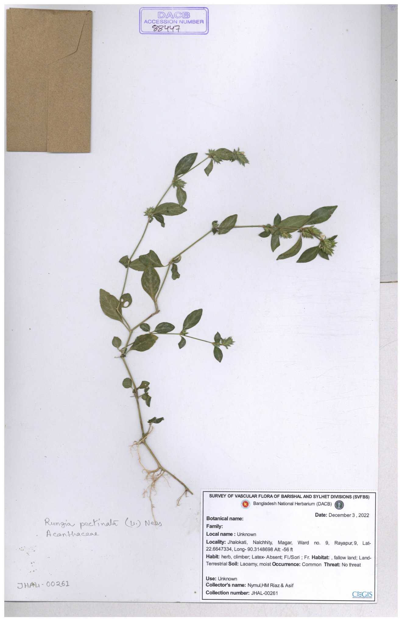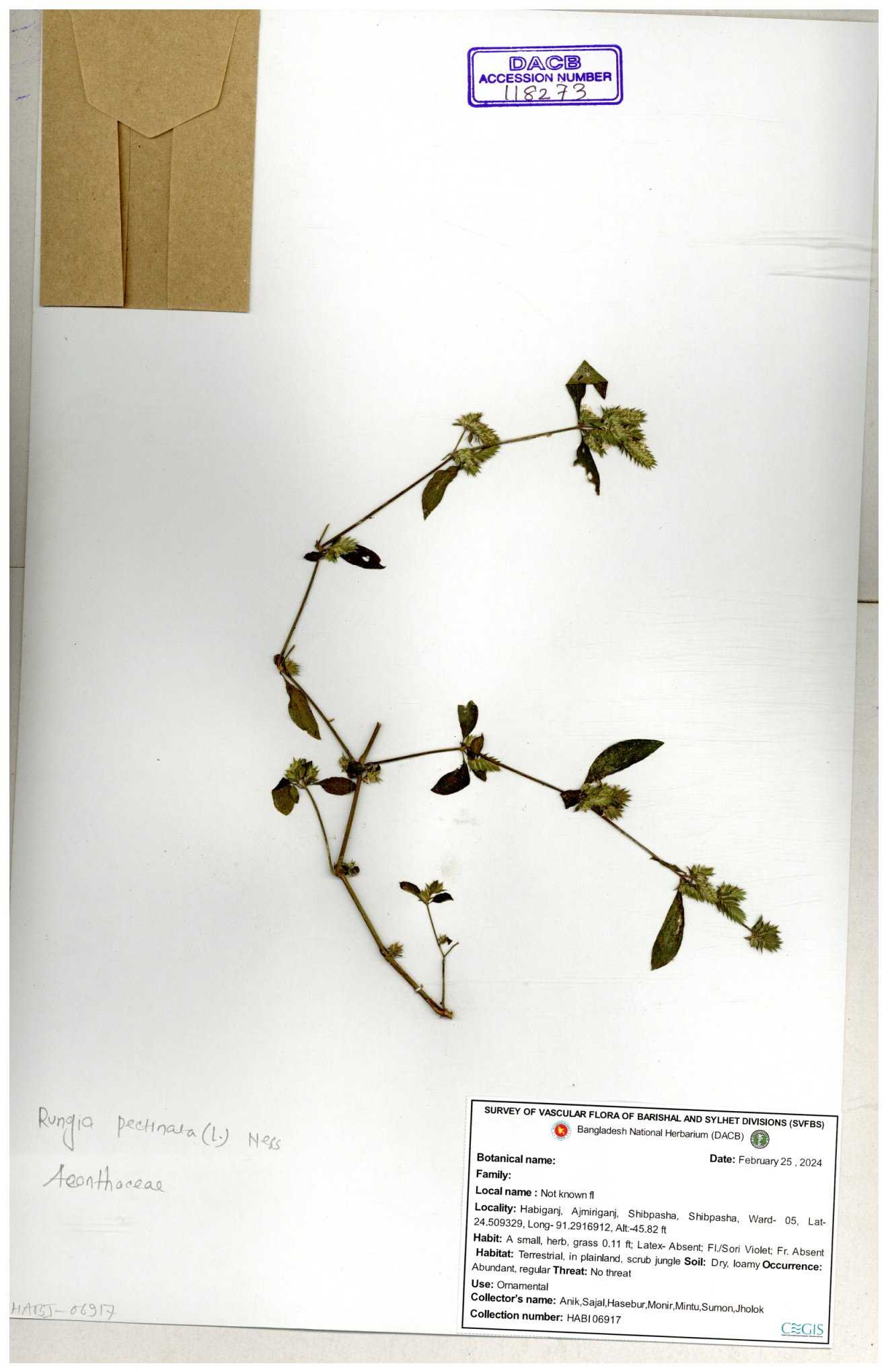 | 66564 | Acanthaceae | Rungia Pectinata | Haktol nogor (Chakma) | Joyanta, Mominur, Al amin, Kamrul & Suborno | JCR-2508 30-01-2017 |