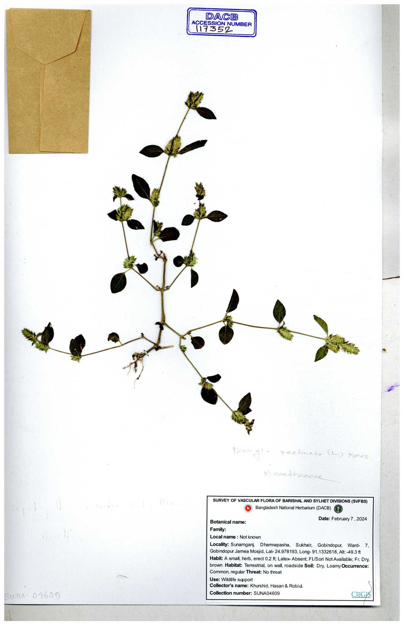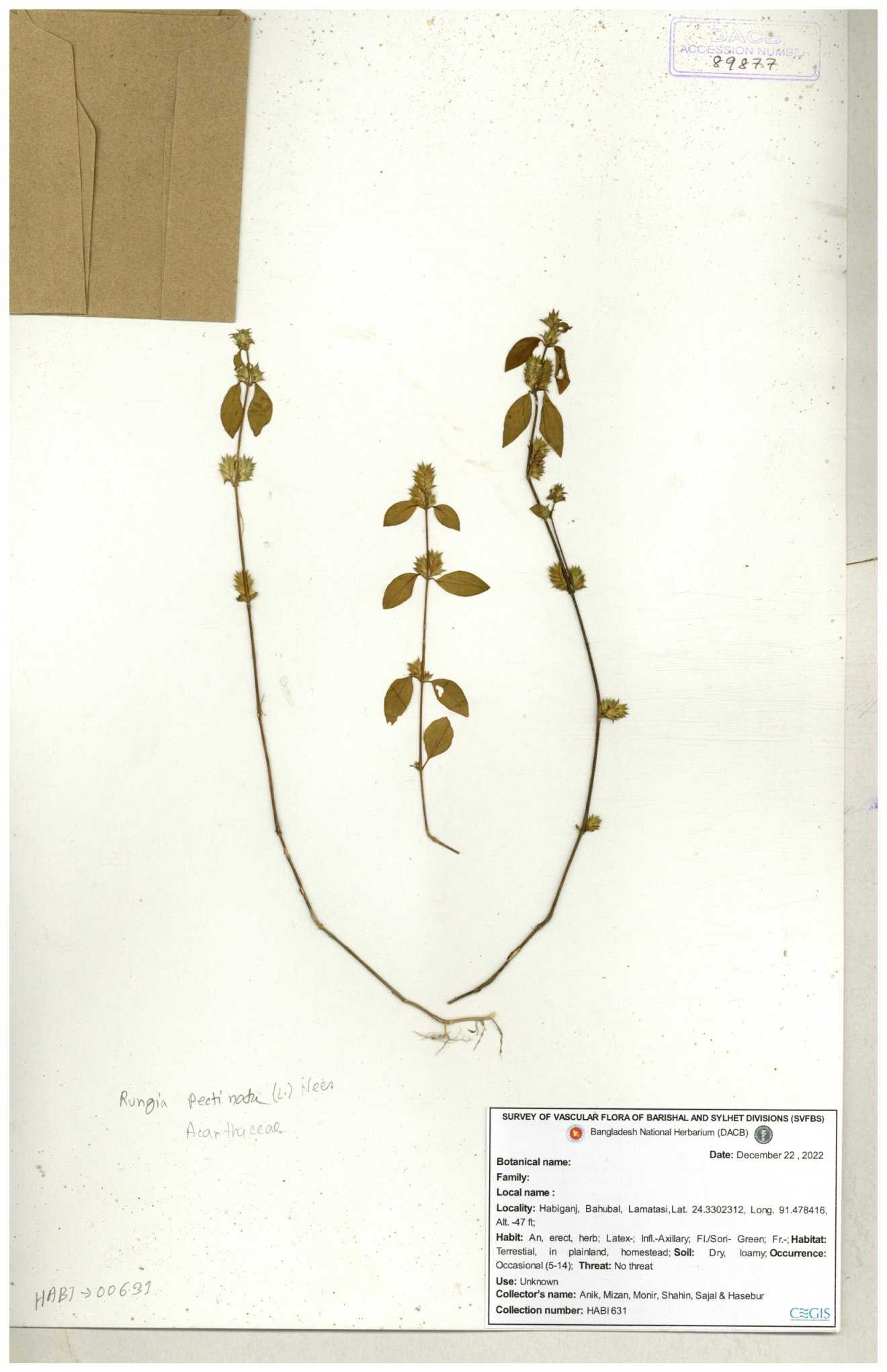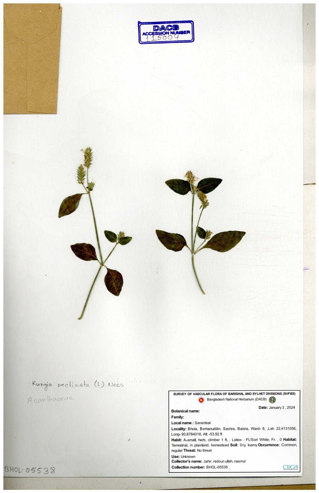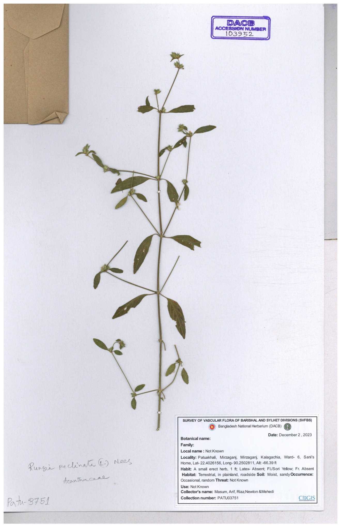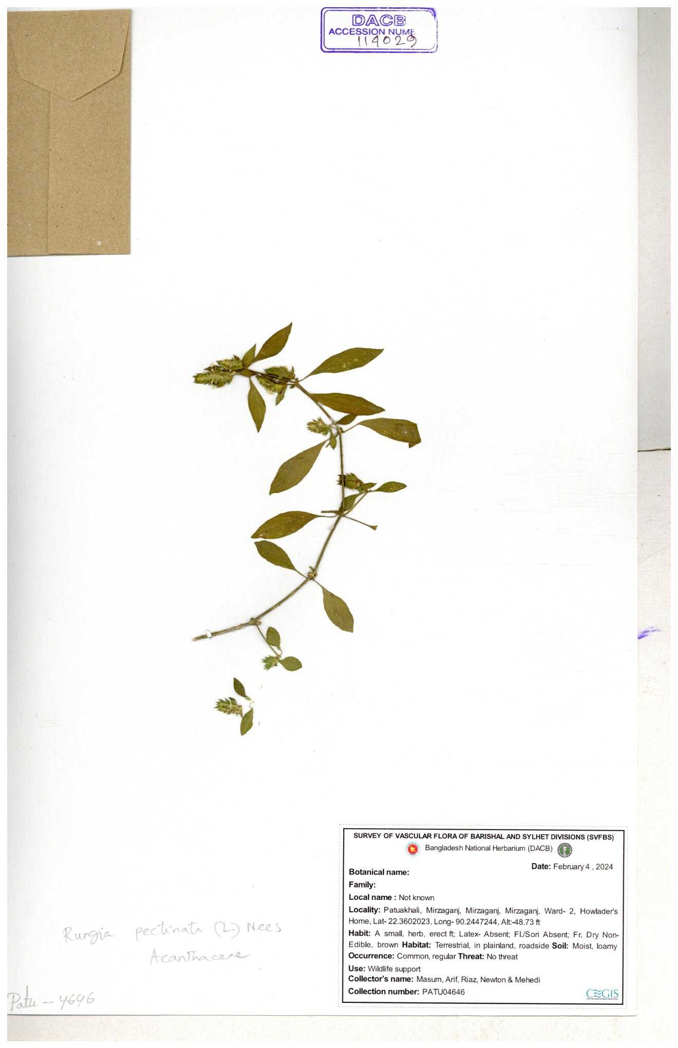 | 66564 | Acanthaceae | Rungia Pectinata | Haktol nogor (Chakma) | Joyanta, Mominur, Al amin, Kamrul & Suborno | JCR-2508 30-01-2017 |
