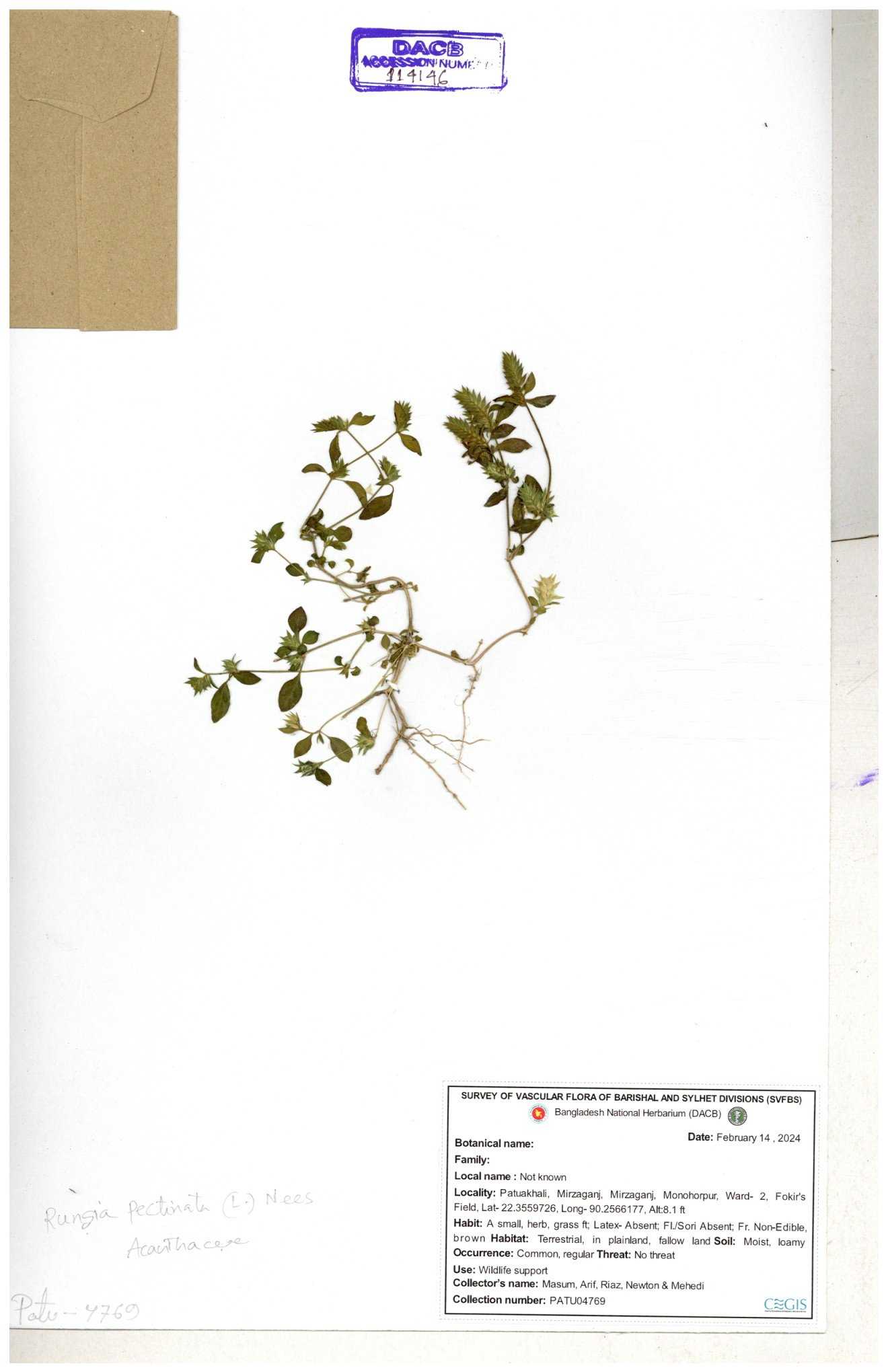 | 114714 | Acanthaceae | Rungia pectinata | 30-11--0001 |