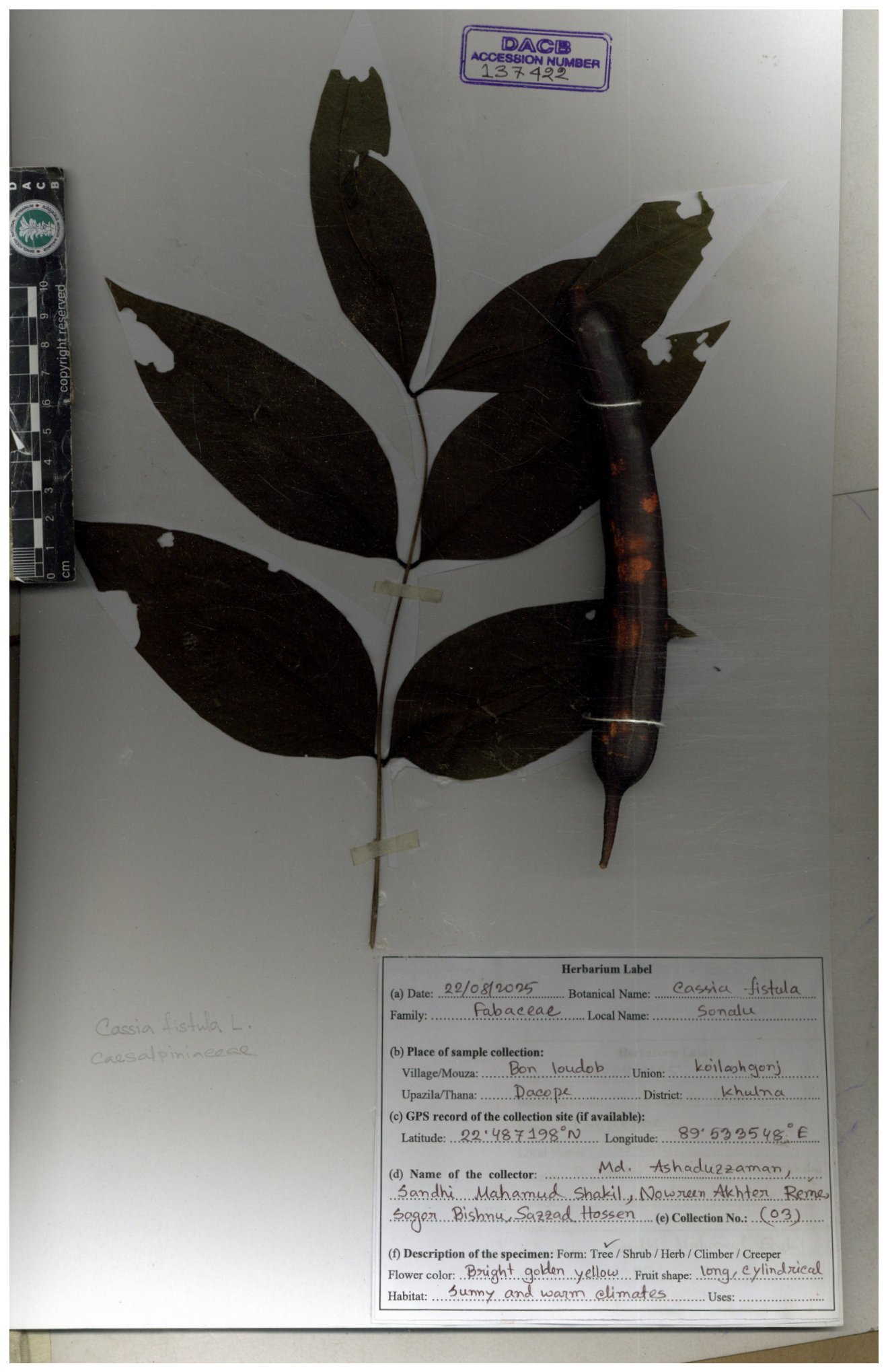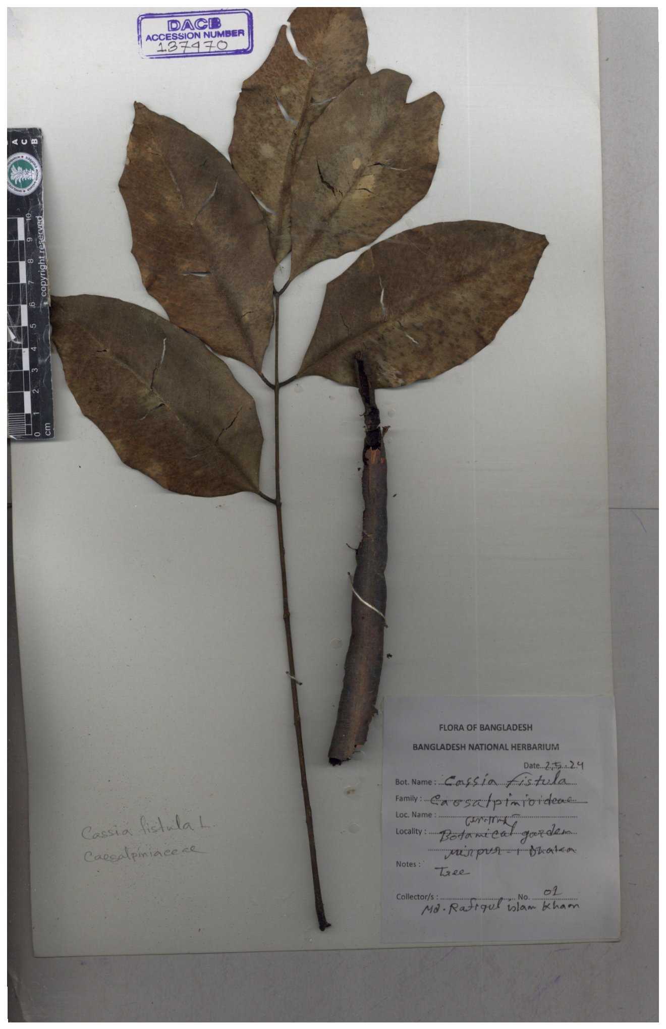 | 65946 | Caesalpiniaceae | Cassia fistula L. | Khandakar Kamrul Islam | KKI-3981 12-02-2020 |