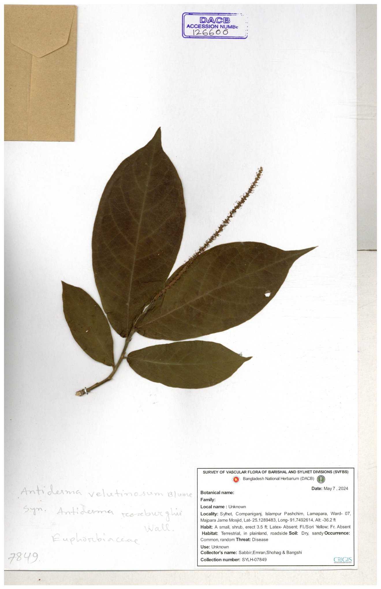 | 11063 | Euphorbiaceae | Antidesma velutinum | Huq & Mia | H-7176 30-11--0001 |
