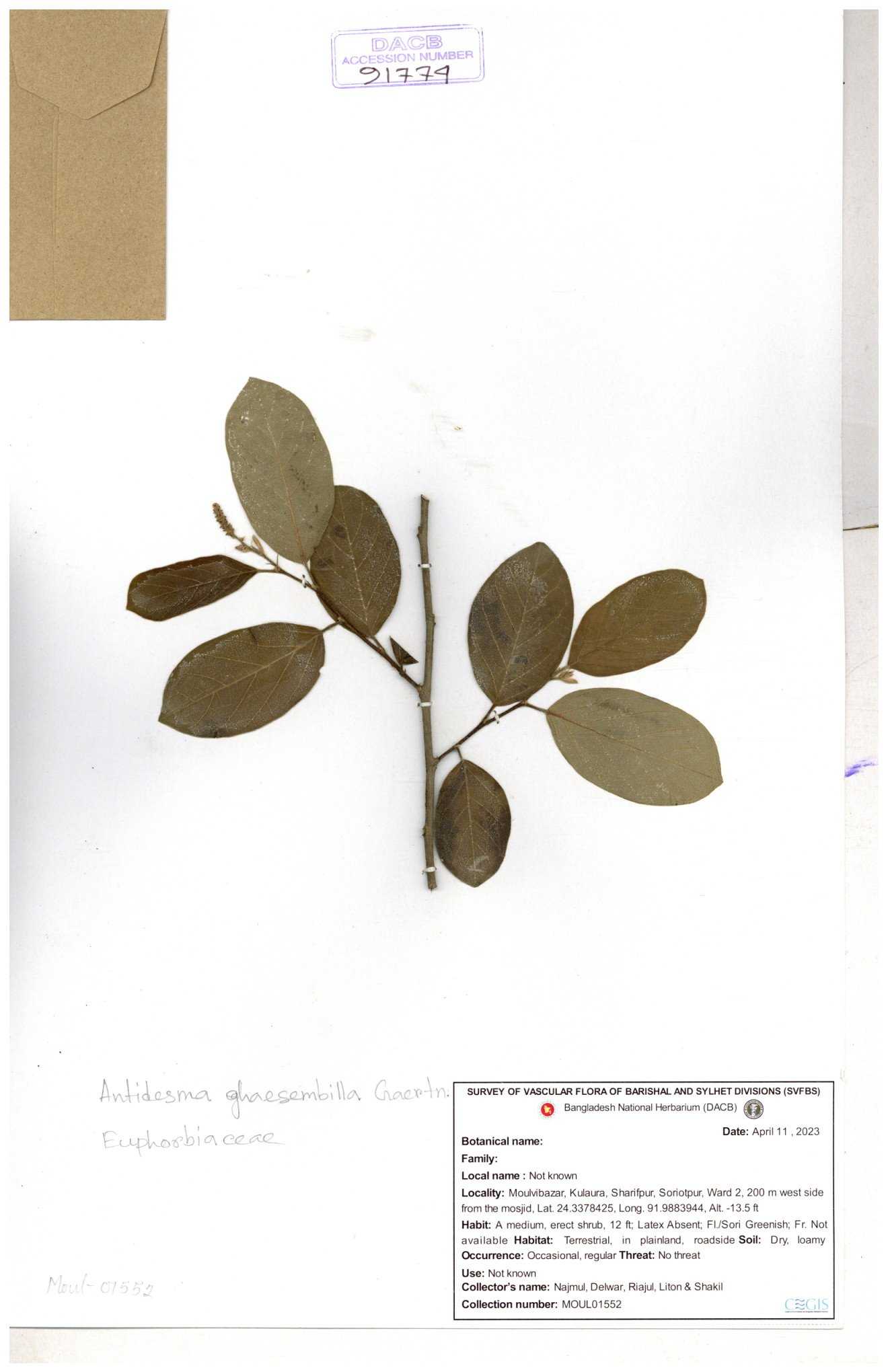 | 57742 | Euphorbiaceae | Antidesma acidum Retz | Ara gula | Ehshanul Hoque | EH-69 30-11--0001 |