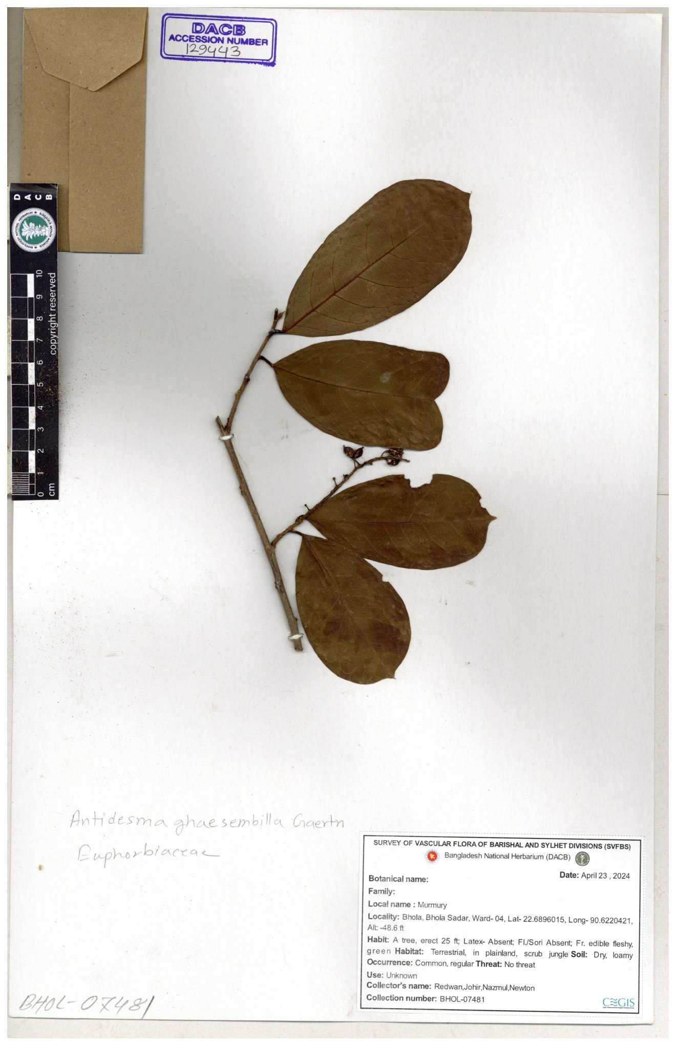 | 72940 | Euphorbiaceae | Antidesma salici | Md. Shahidul Islam & Md. Rashed Miah | MSI-5903 10-04-2017 |