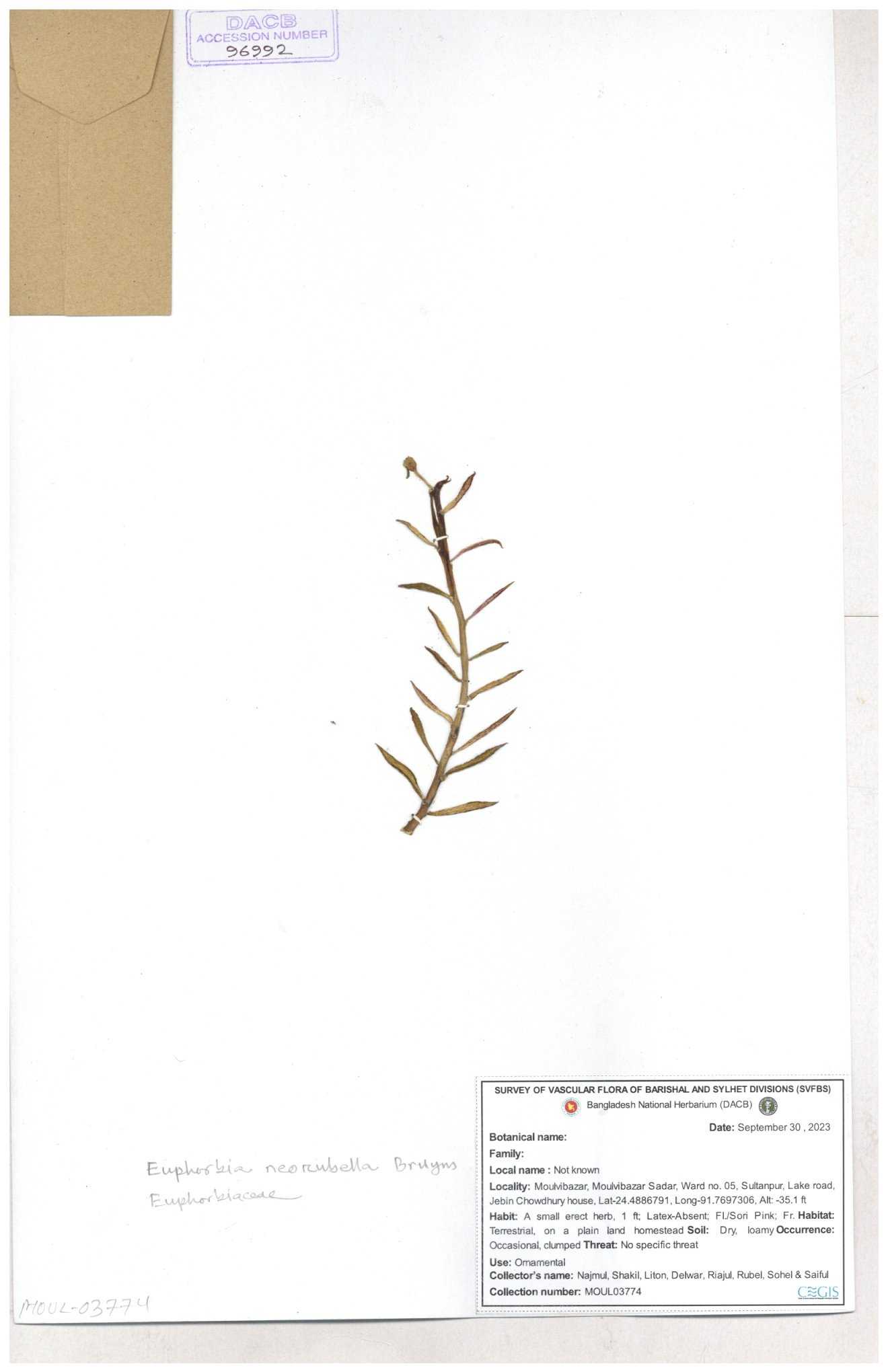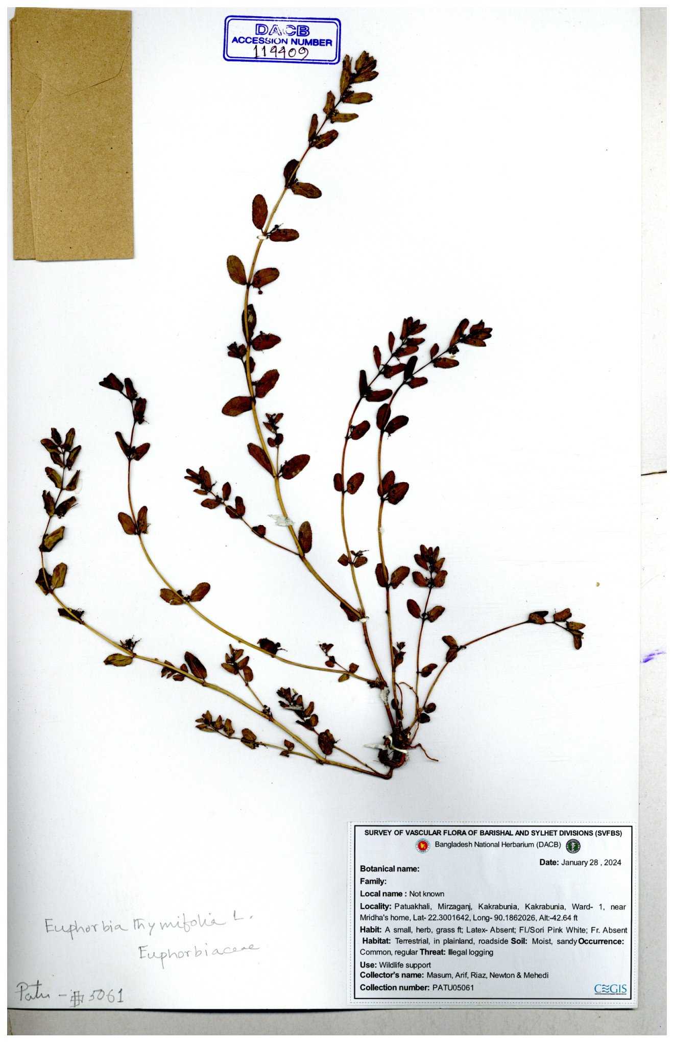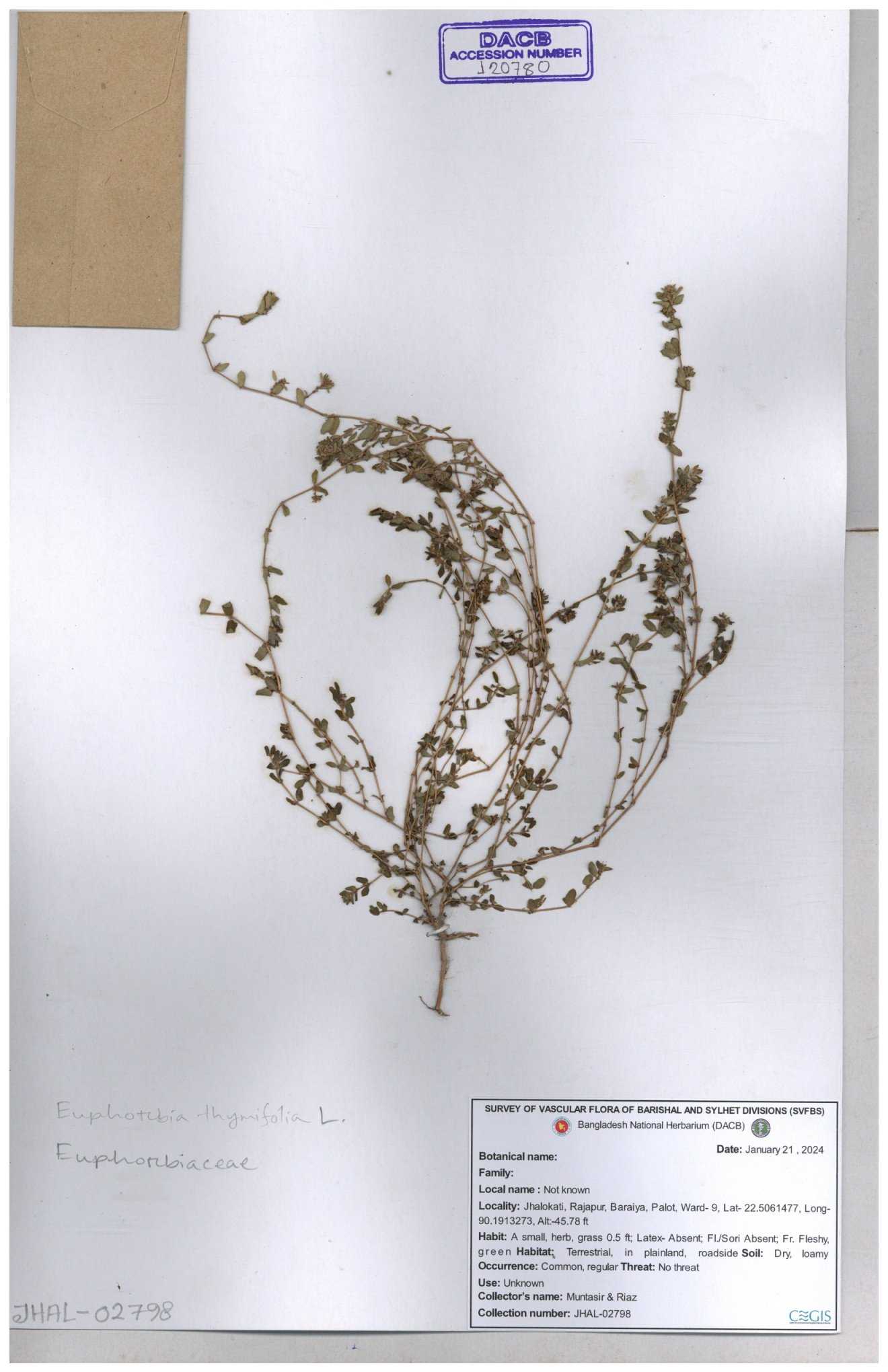 | 77849 | Euphorbiaceae | Euphorbia thymifolia L. | Joyanta, Mominur, Kamrul & Suborno. | JCR-5091 30-11--0001 |