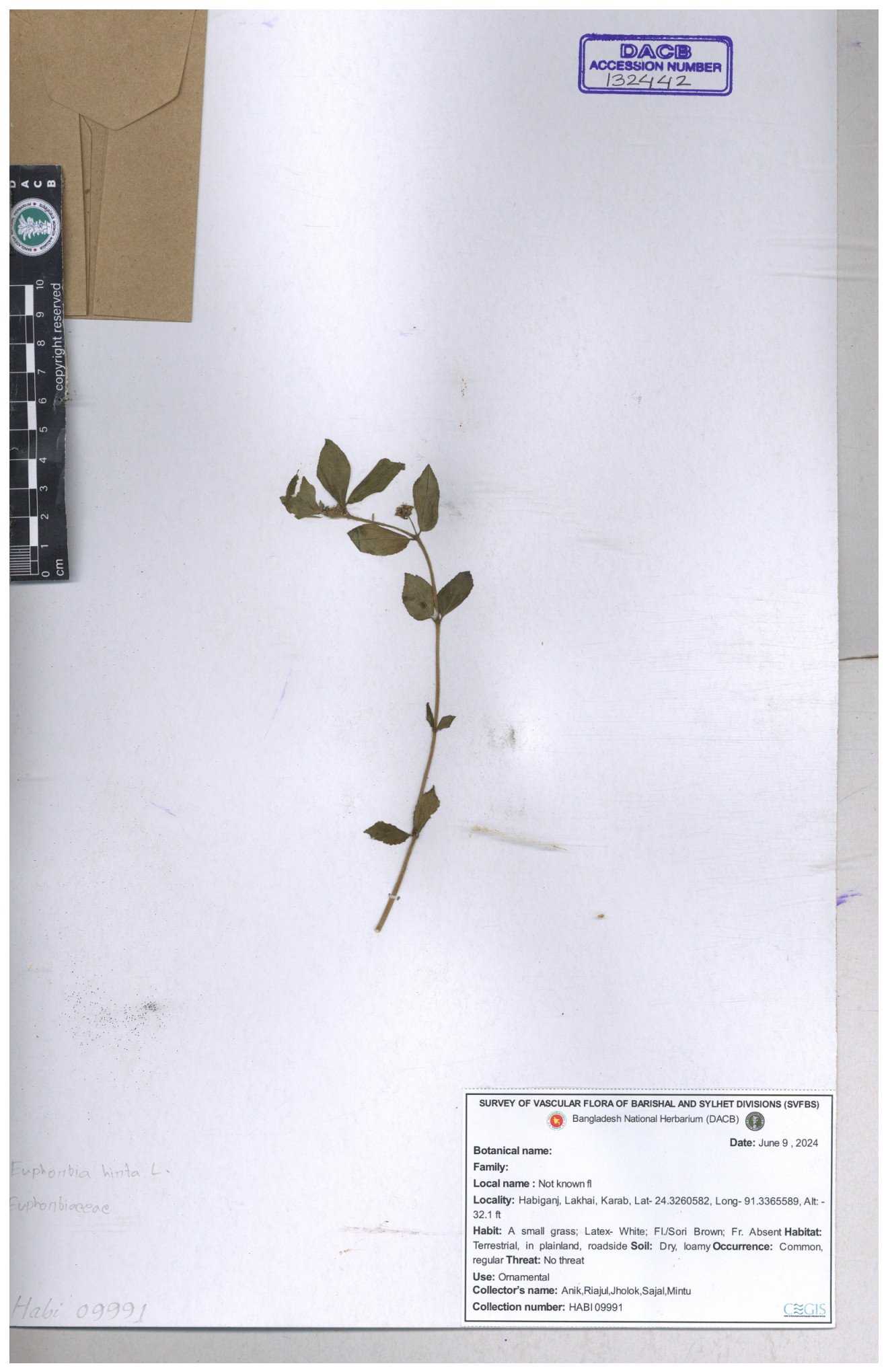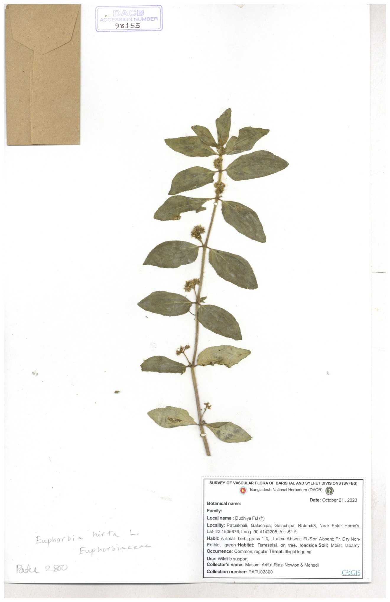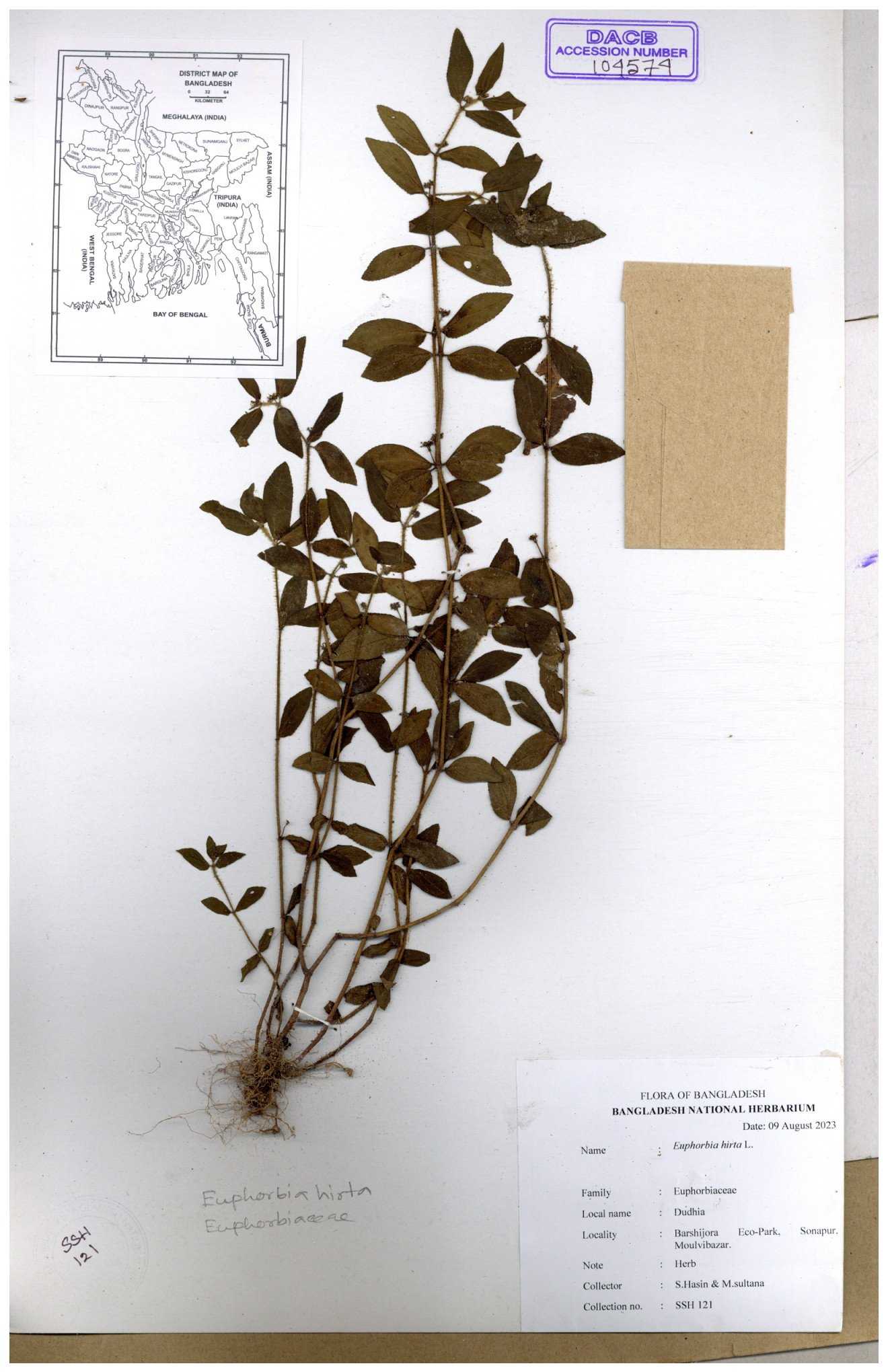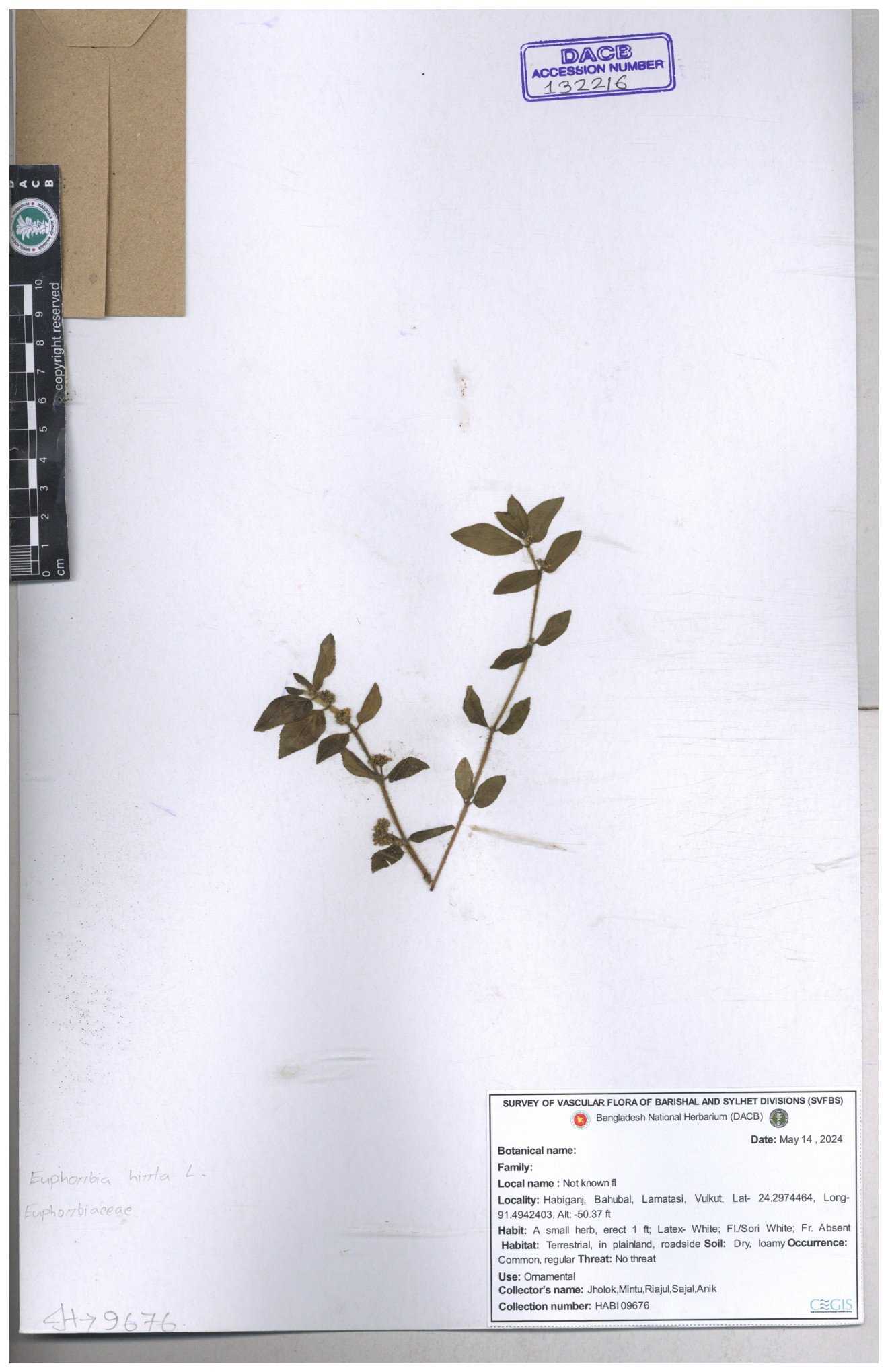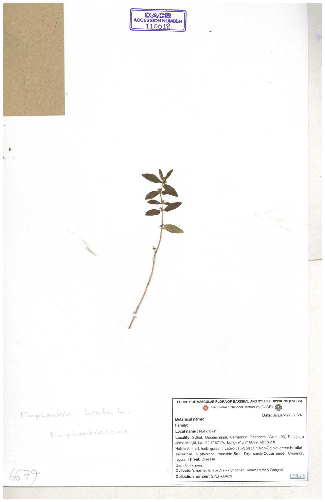 | 69330 | Euphorbiaceae | Euphorbia hirta L. | Dhudia lota | I Hossen, MS Islam, MKR Rahman & MR Miah | IH-4764 03-12-2017 |