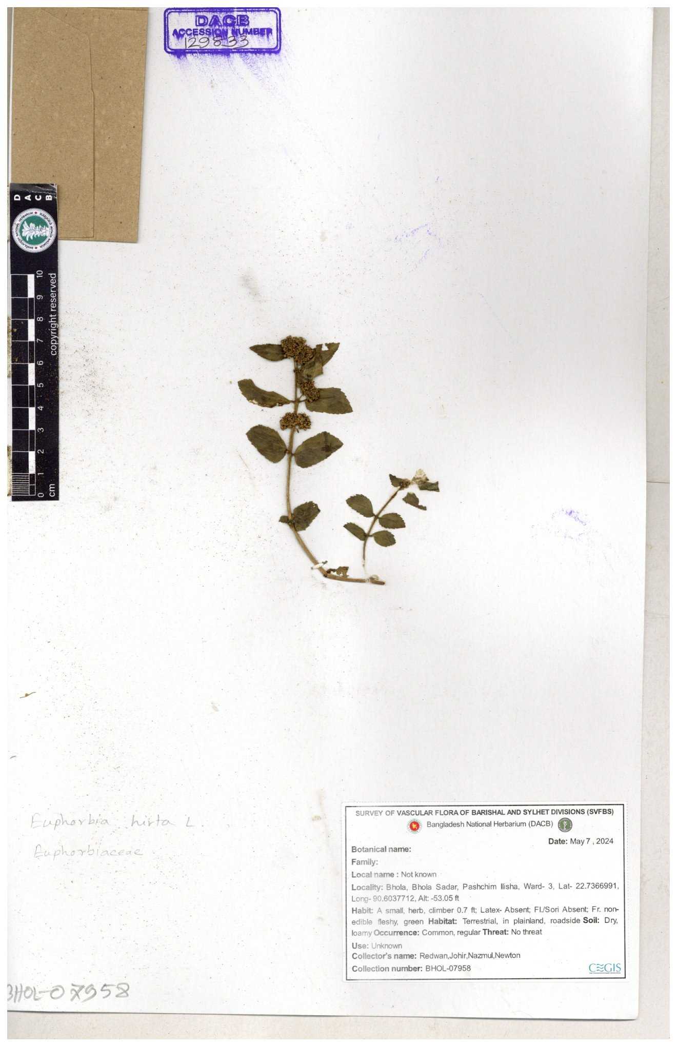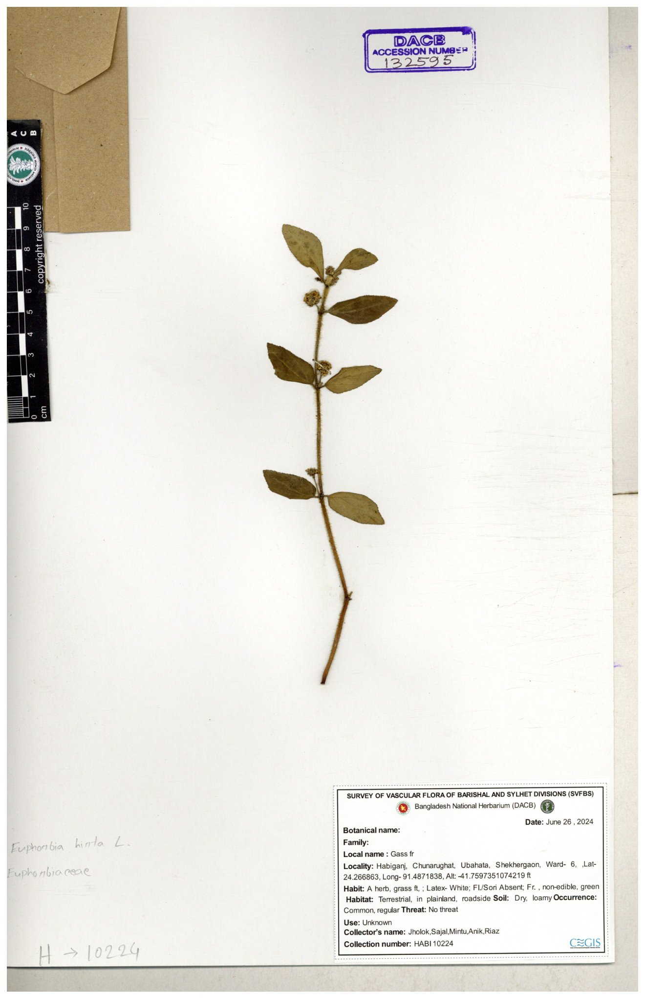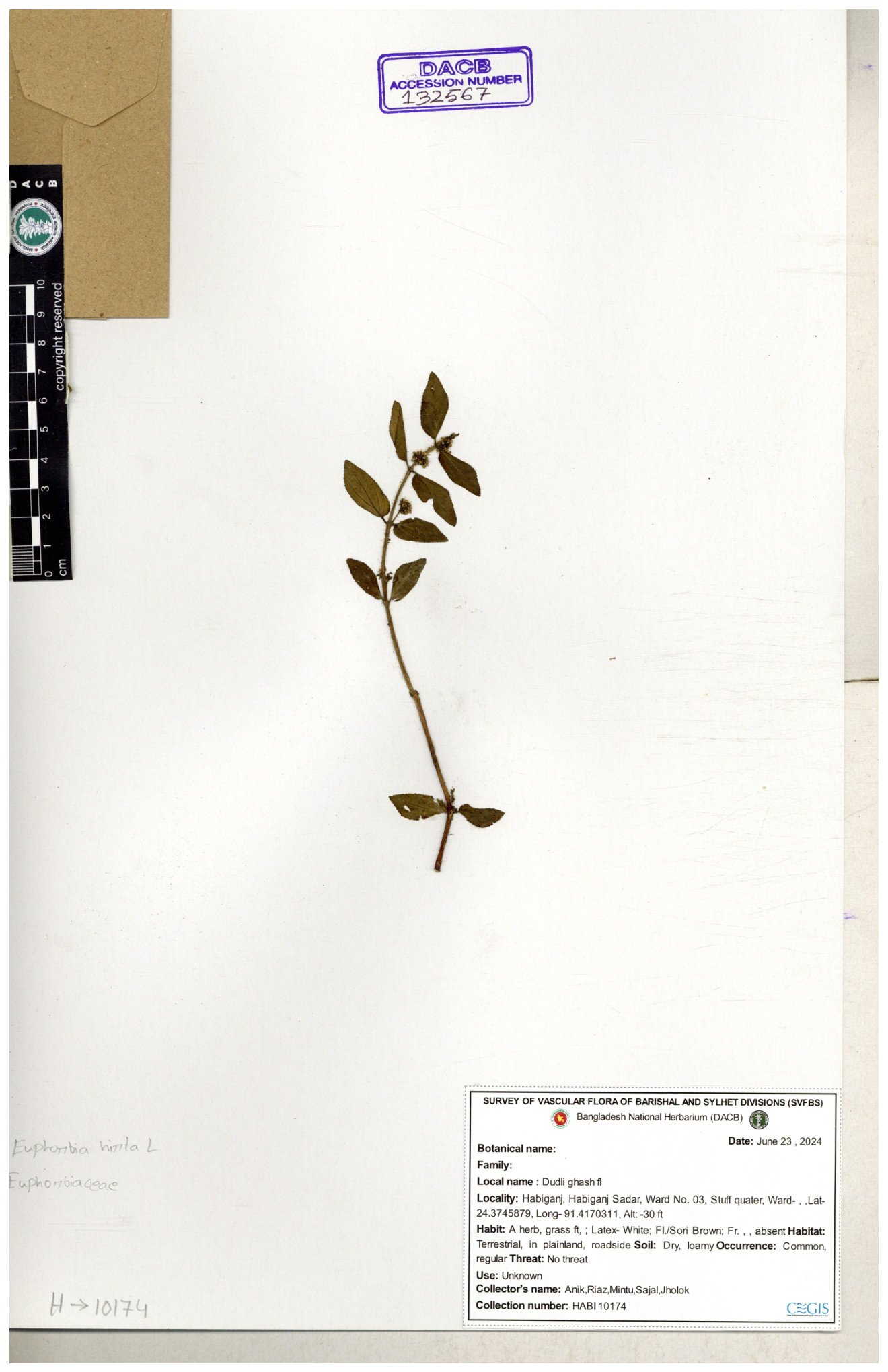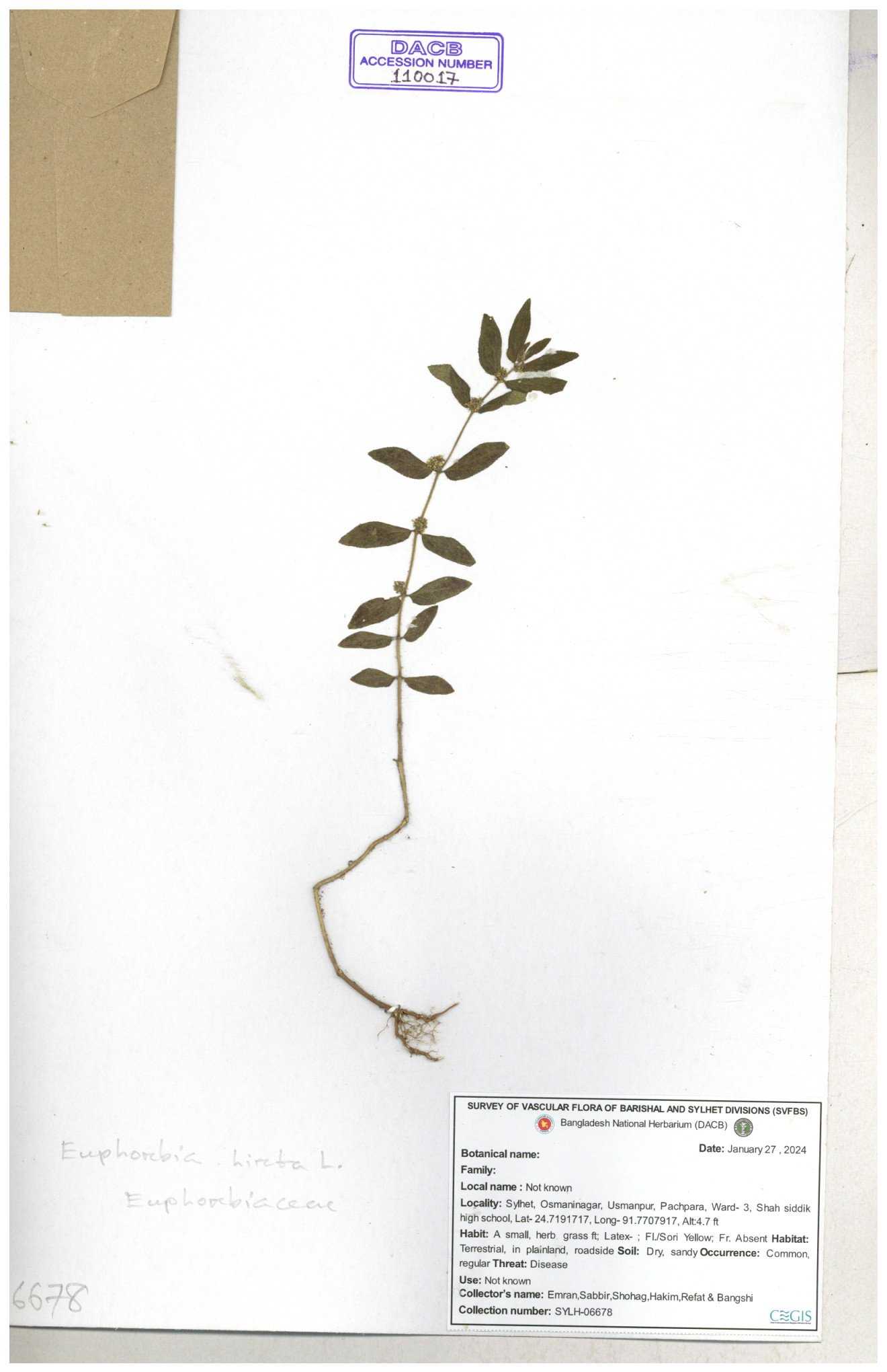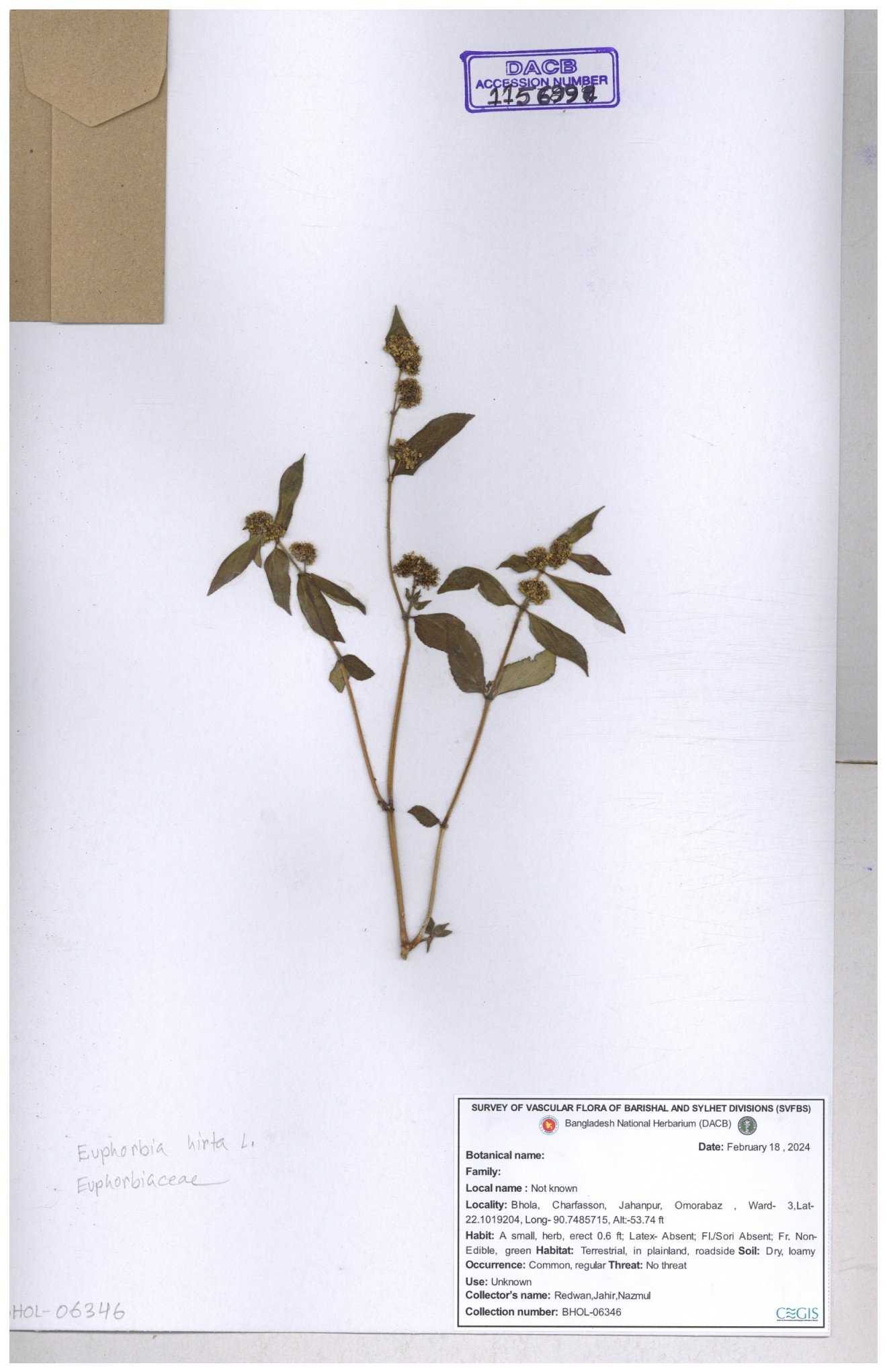 | 69330 | Euphorbiaceae | Euphorbia hirta L. | Dhudia lota | I Hossen, MS Islam, MKR Rahman & MR Miah | IH-4764 03-12-2017 |