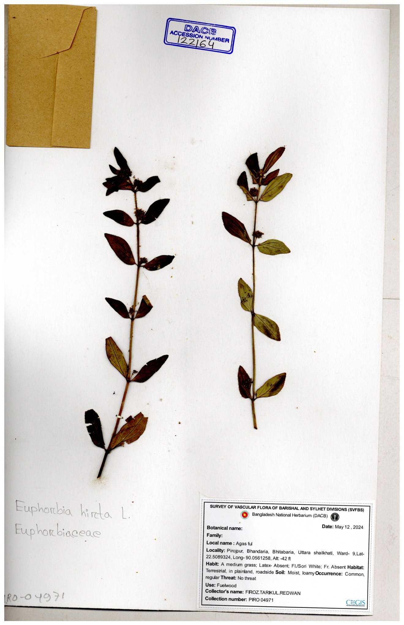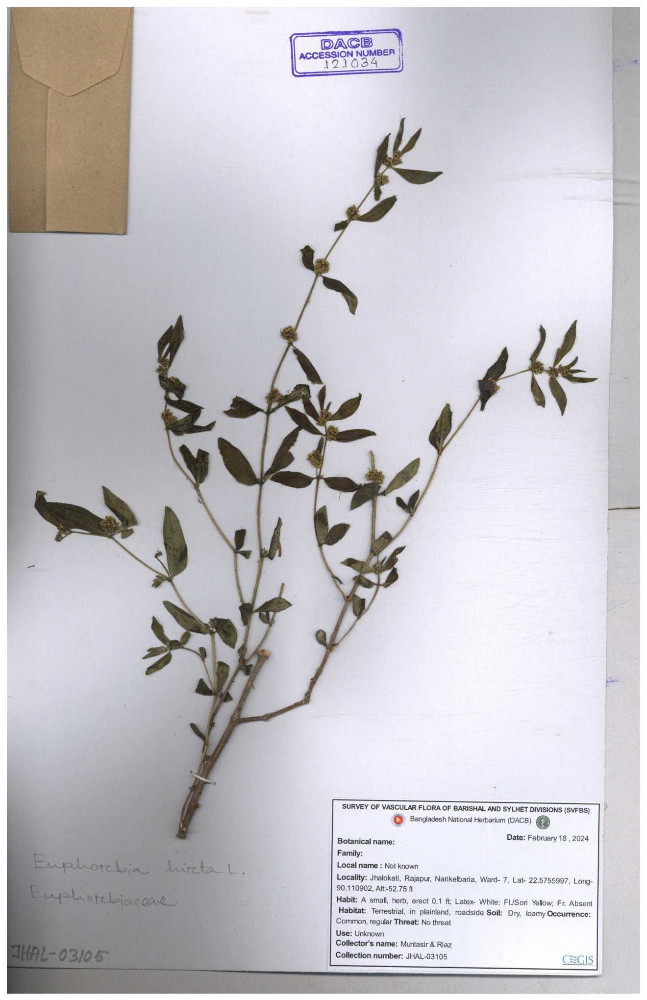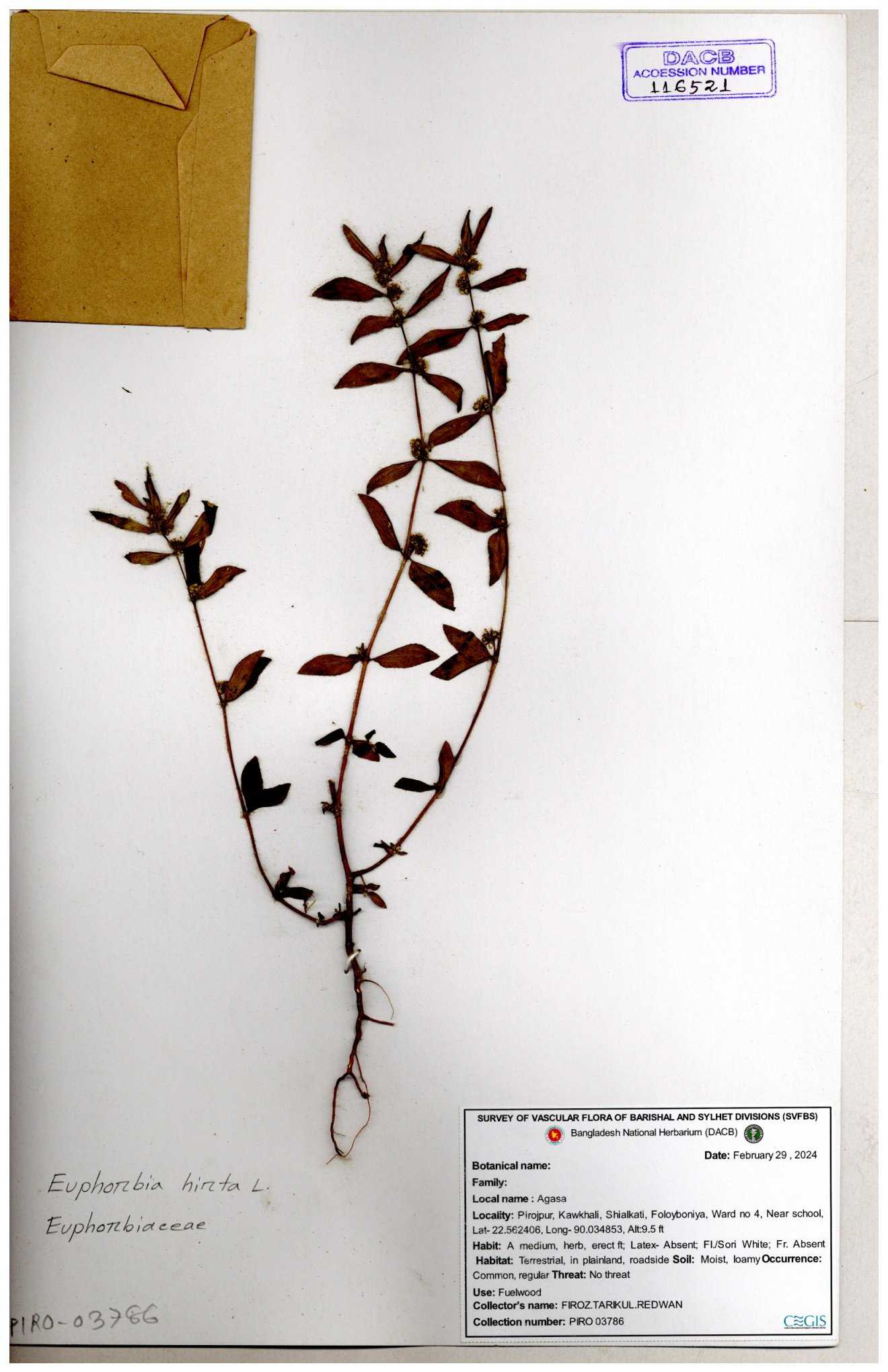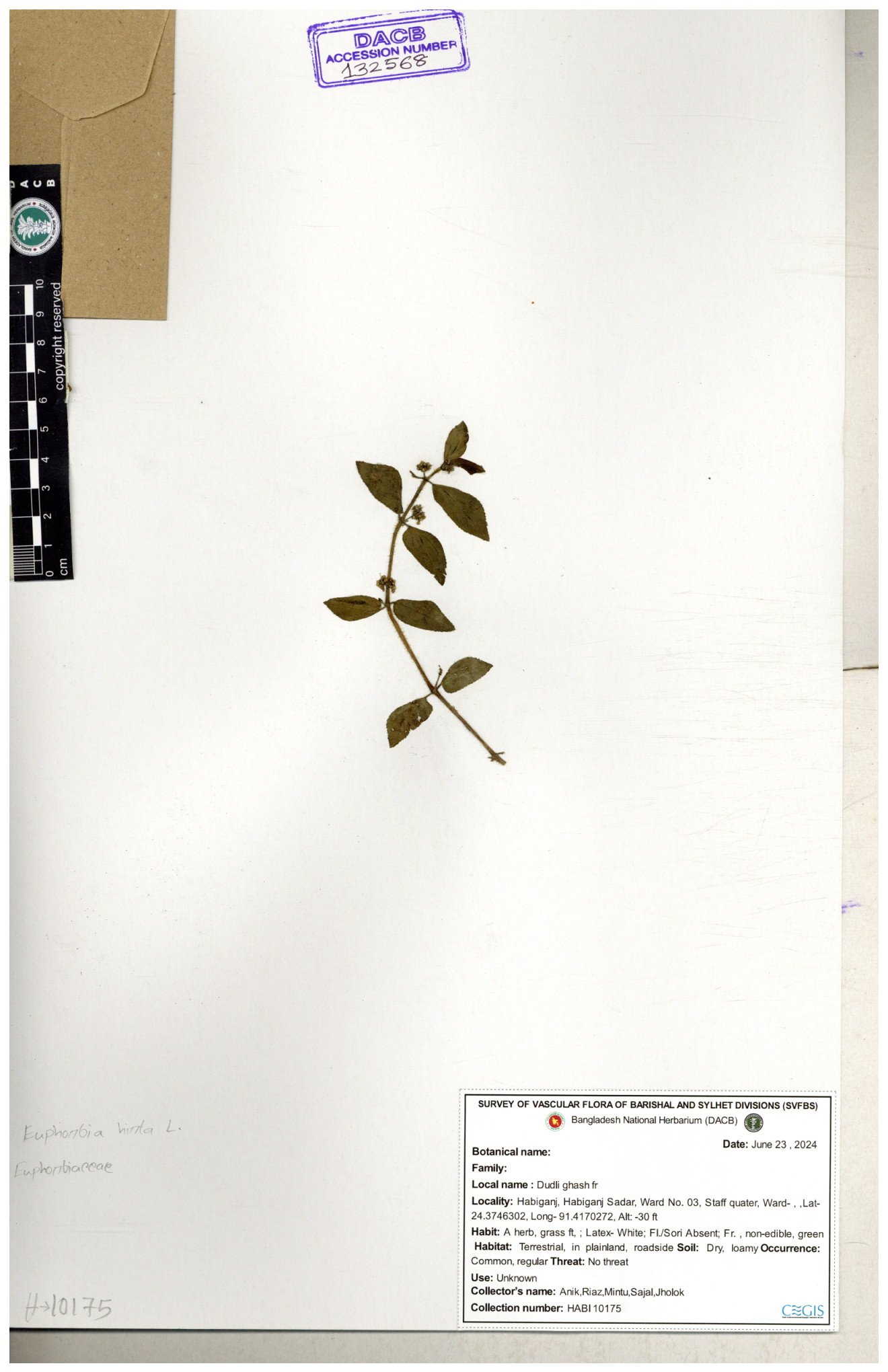 | 69330 | Euphorbiaceae | Euphorbia hirta L. | Dhudia lota | I Hossen, MS Islam, MKR Rahman & MR Miah | IH-4764 03-12-2017 |