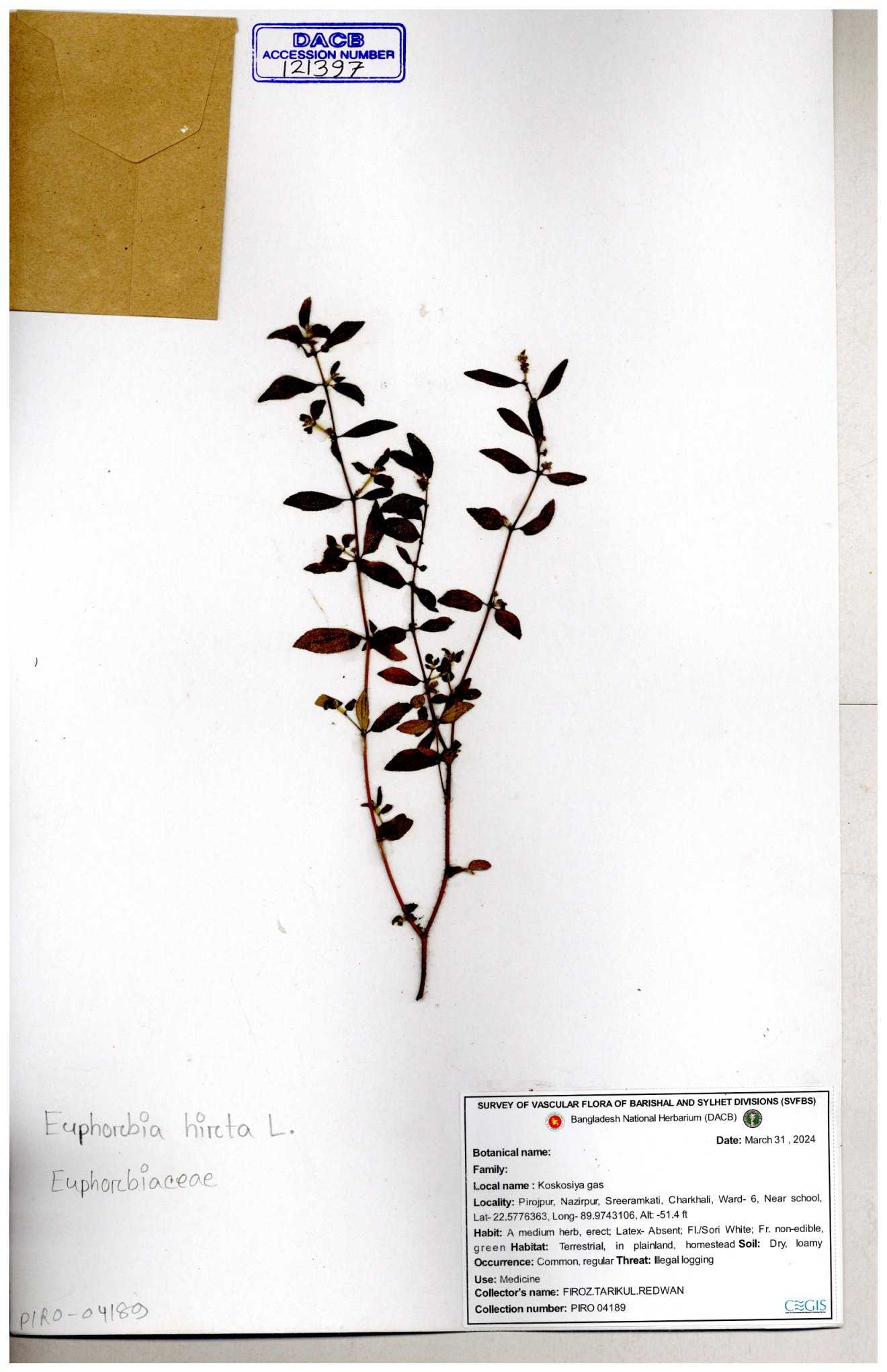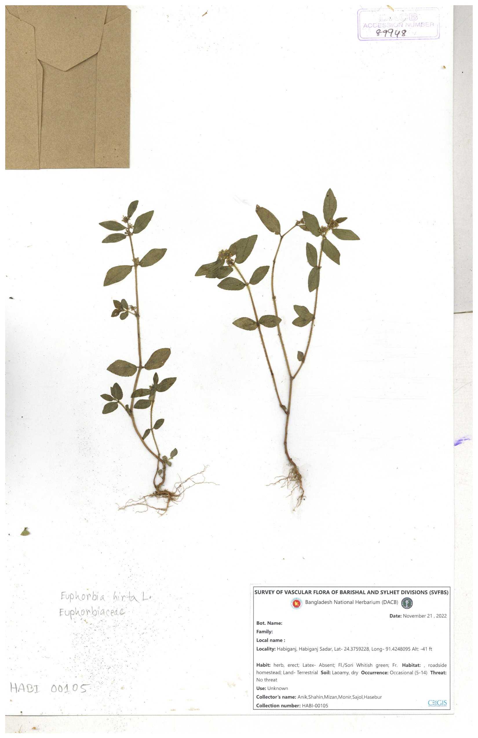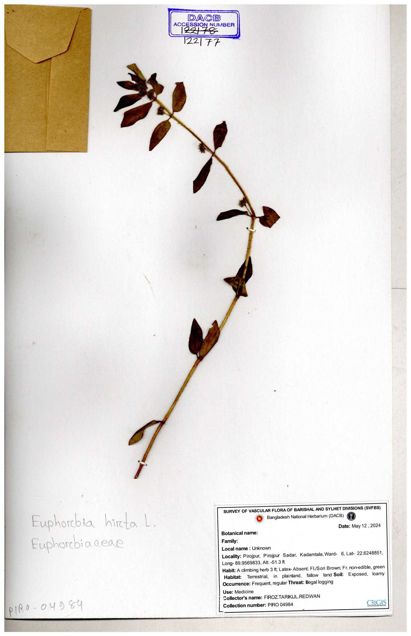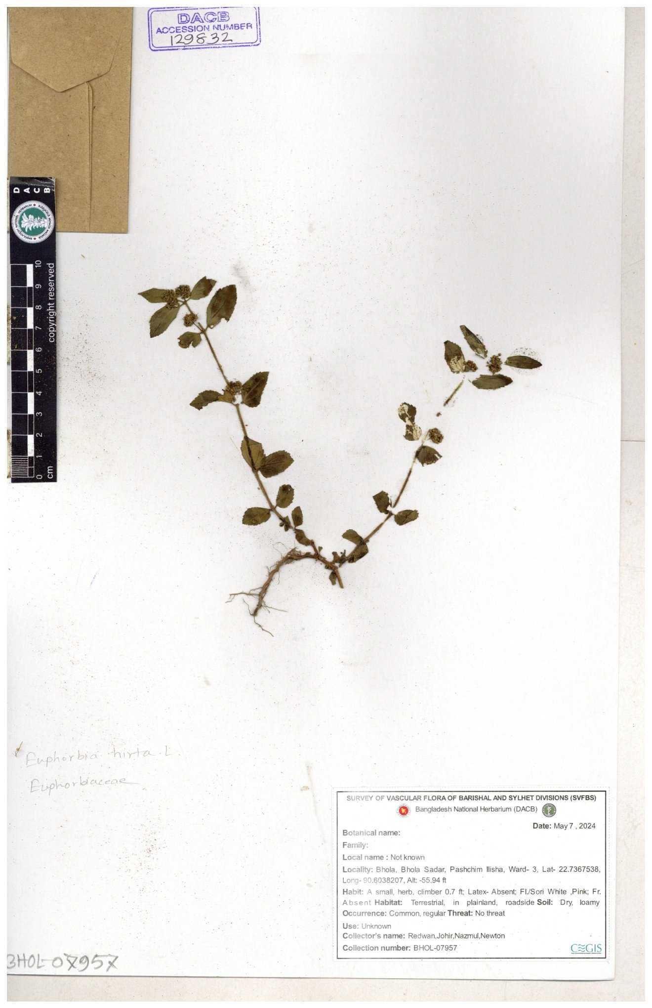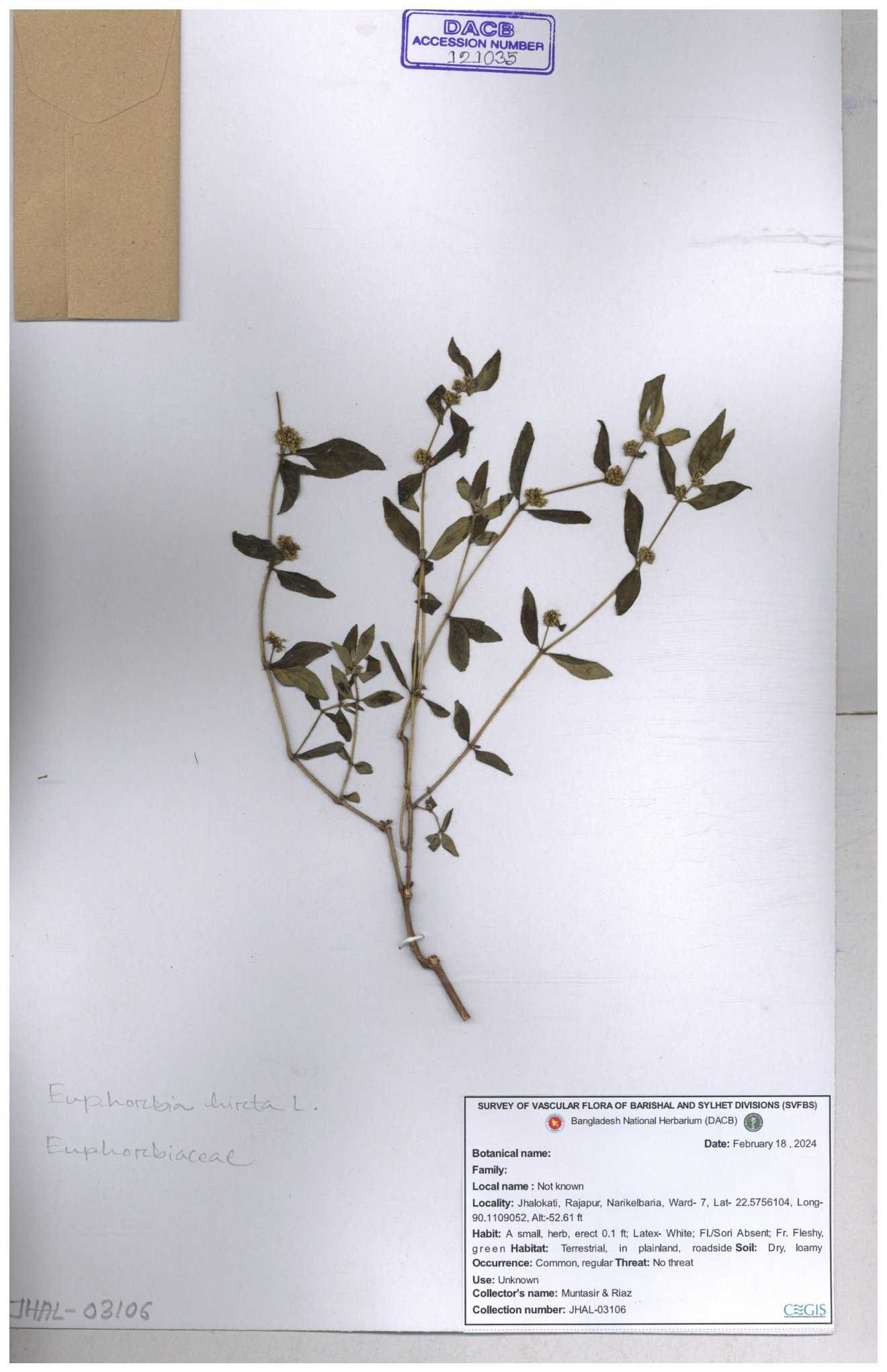 | 69330 | Euphorbiaceae | Euphorbia hirta L. | Dhudia lota | I Hossen, MS Islam, MKR Rahman & MR Miah | IH-4764 03-12-2017 |