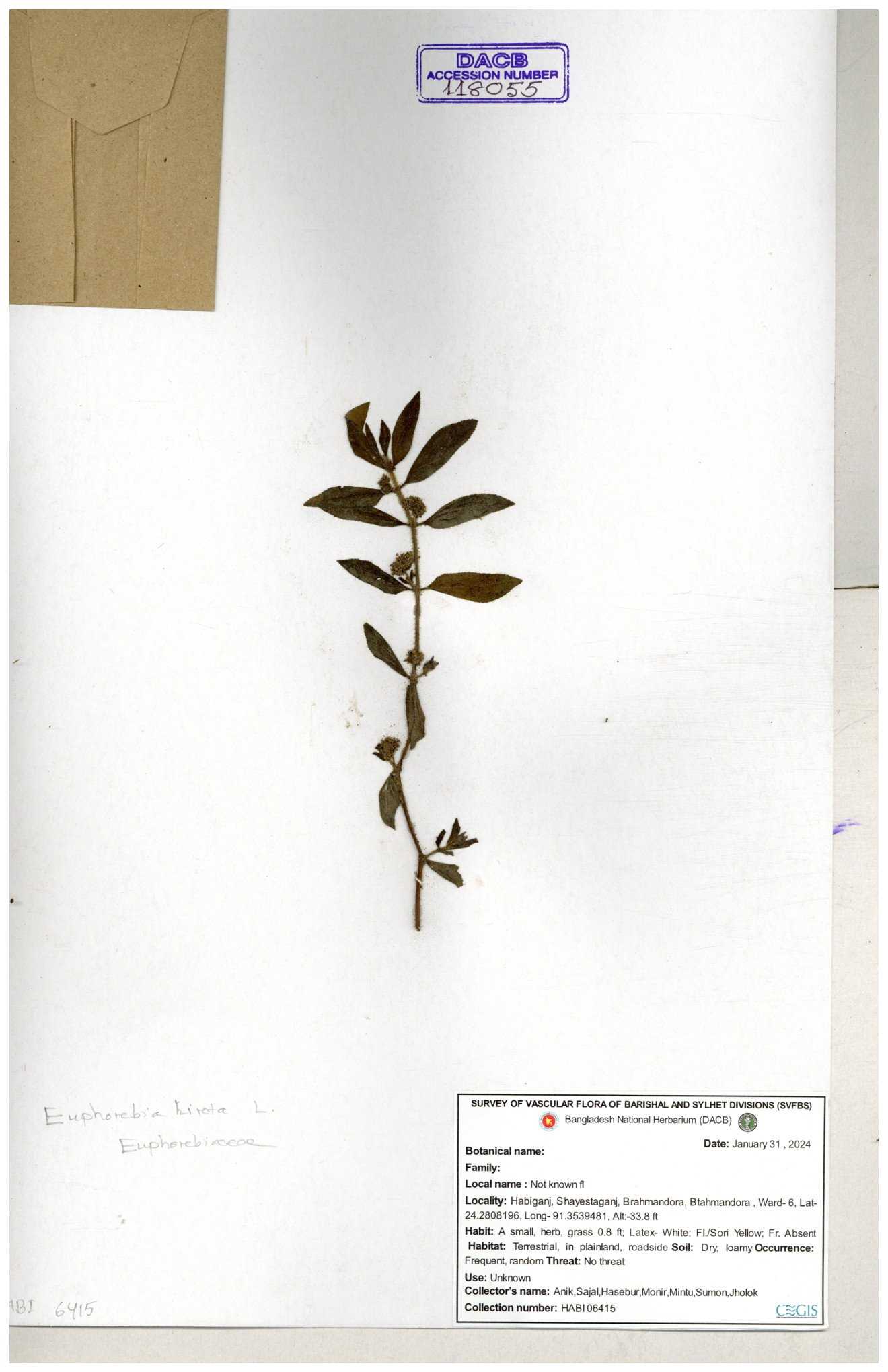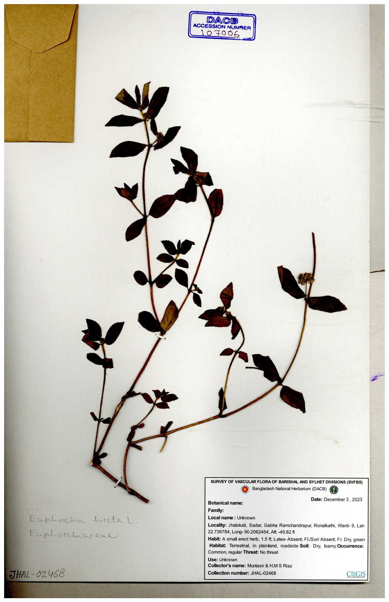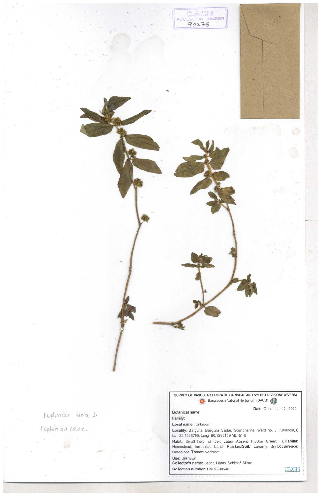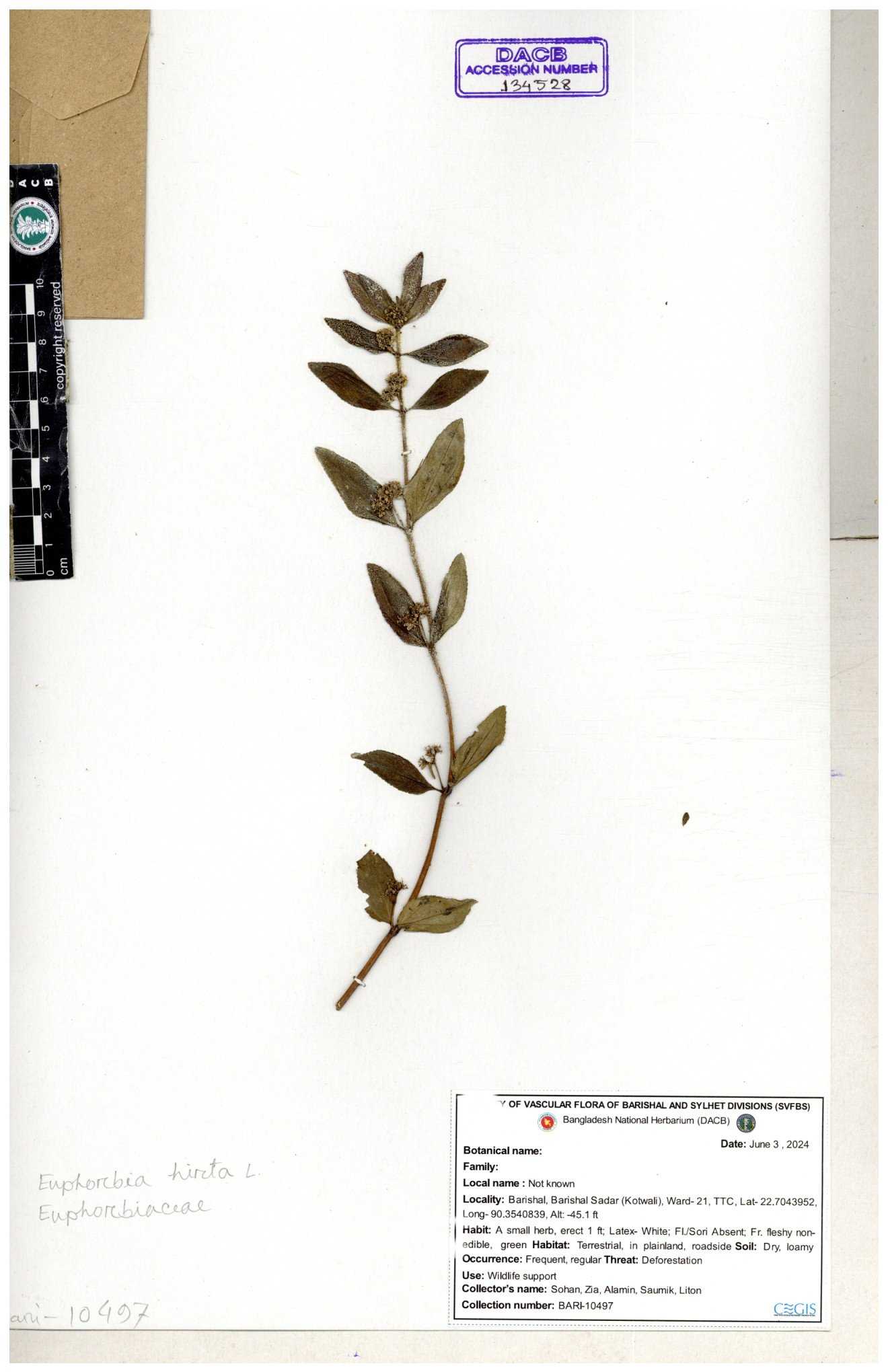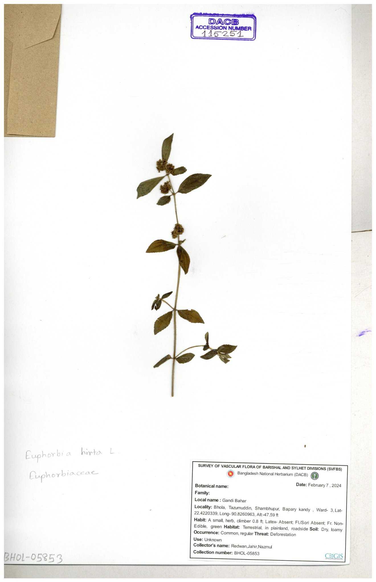 | 69330 | Euphorbiaceae | Euphorbia hirta L. | Dhudia lota | I Hossen, MS Islam, MKR Rahman & MR Miah | IH-4764 03-12-2017 |