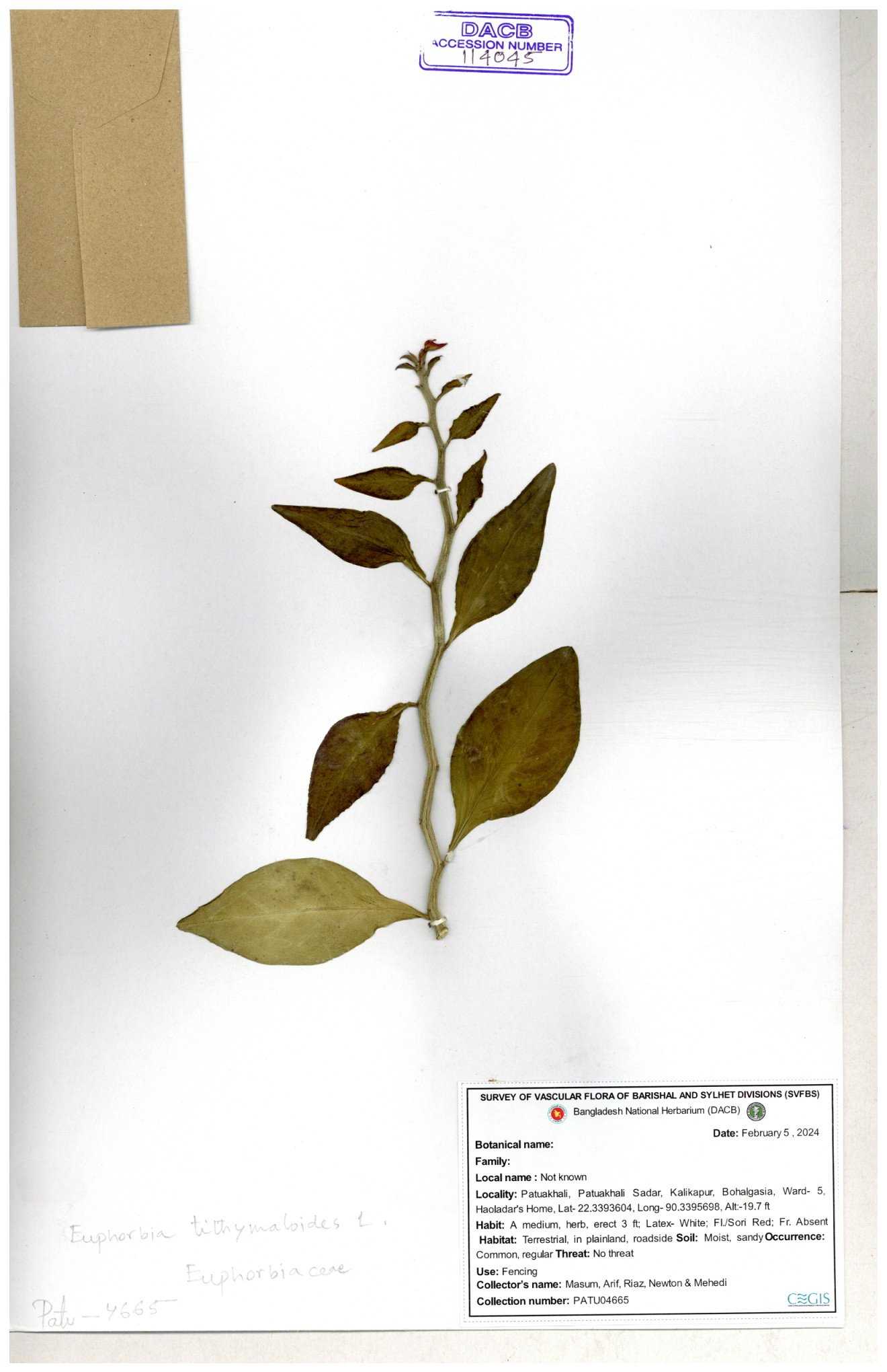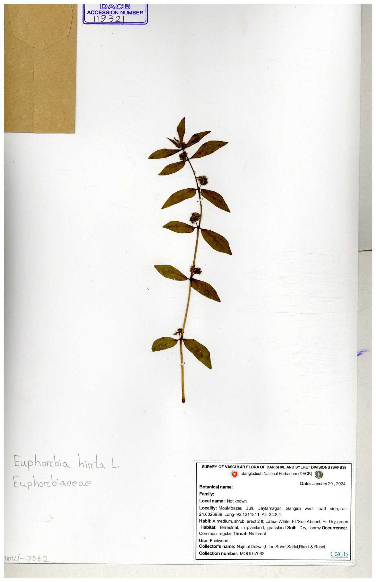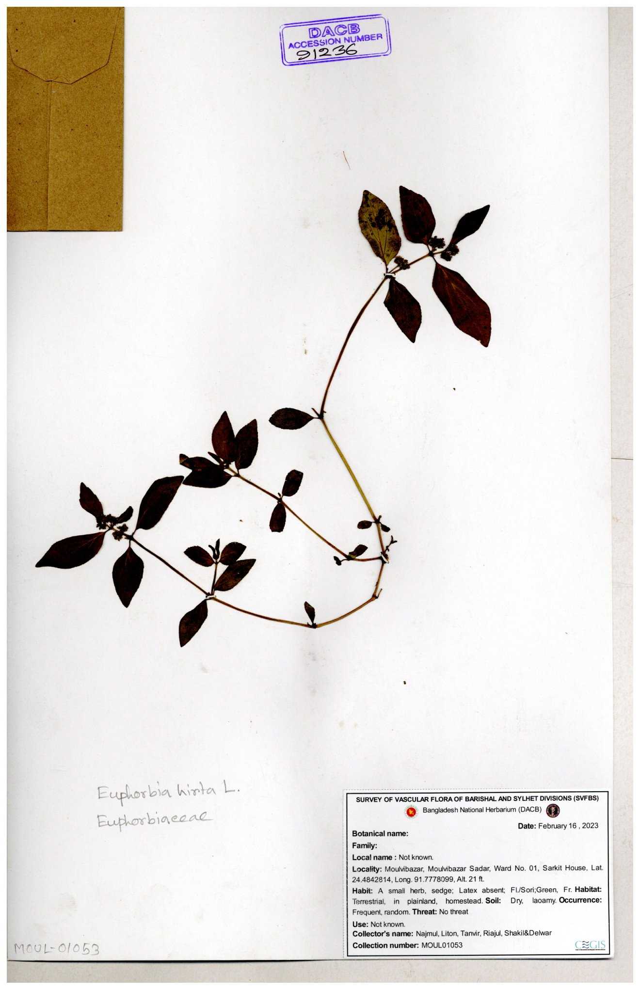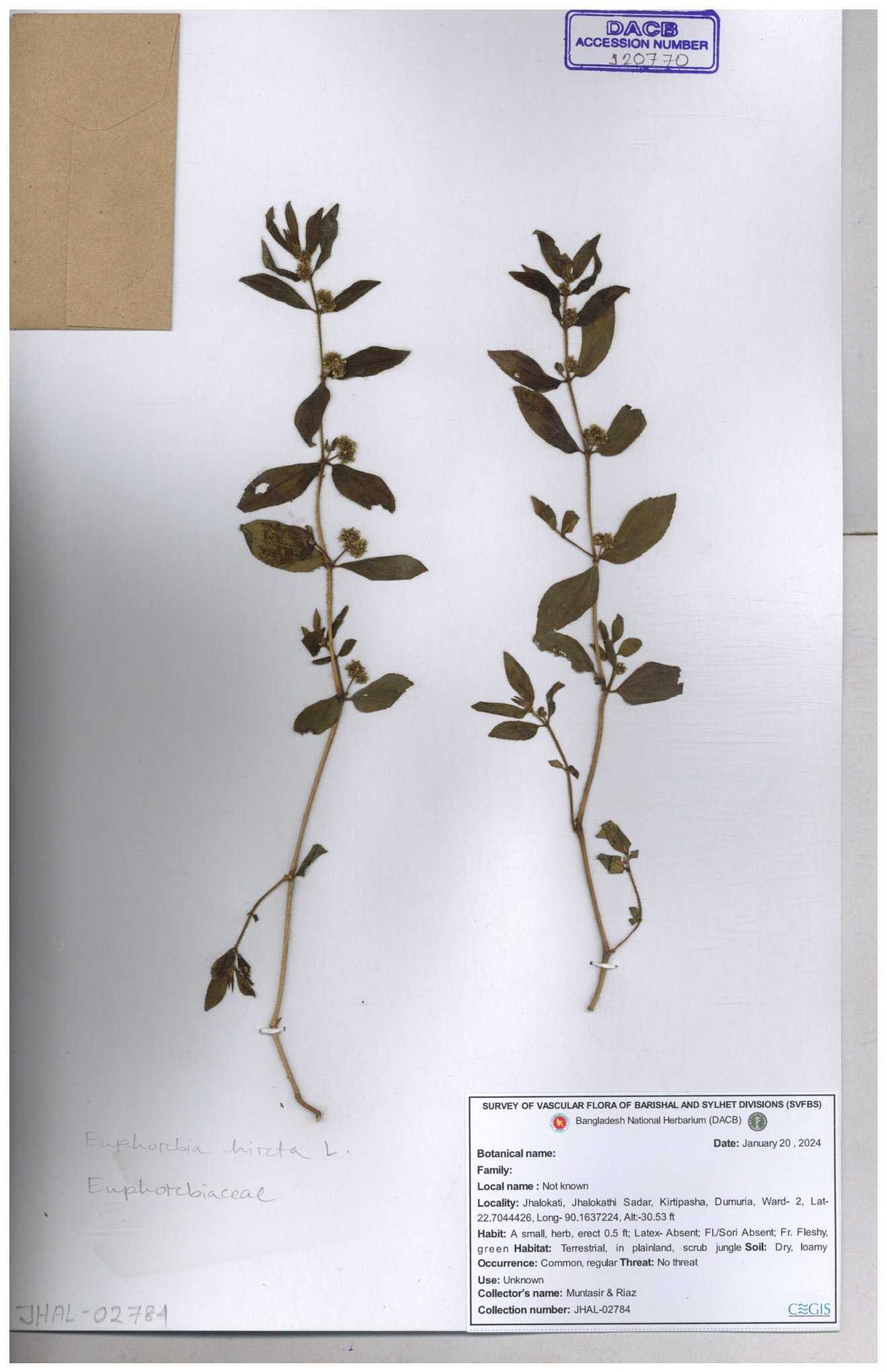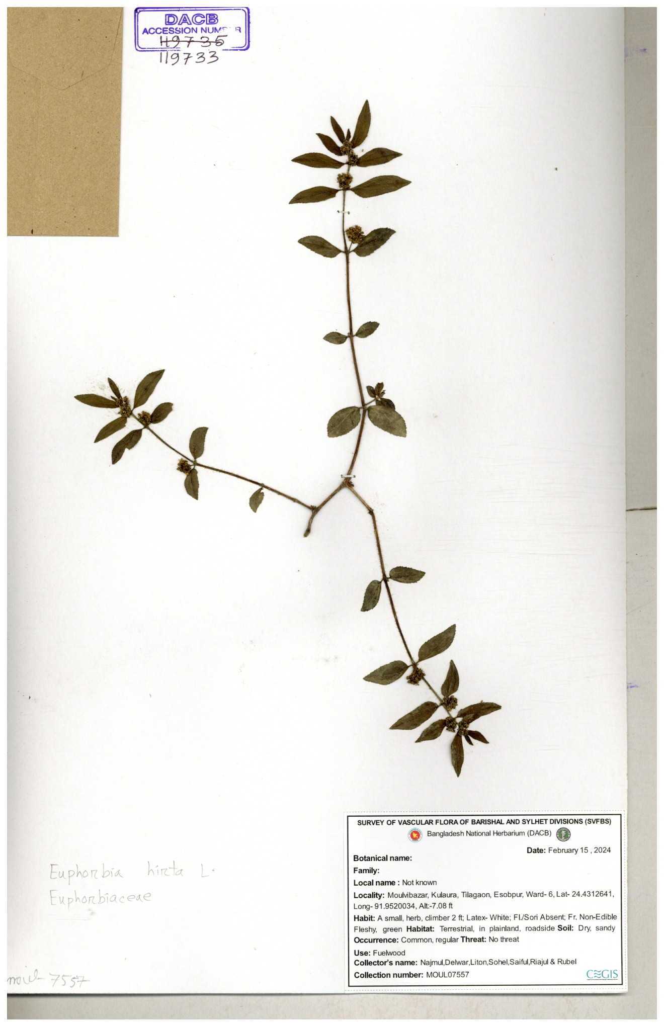 | 69330 | Euphorbiaceae | Euphorbia hirta L. | Dhudia lota | I Hossen, MS Islam, MKR Rahman & MR Miah | IH-4764 03-12-2017 |