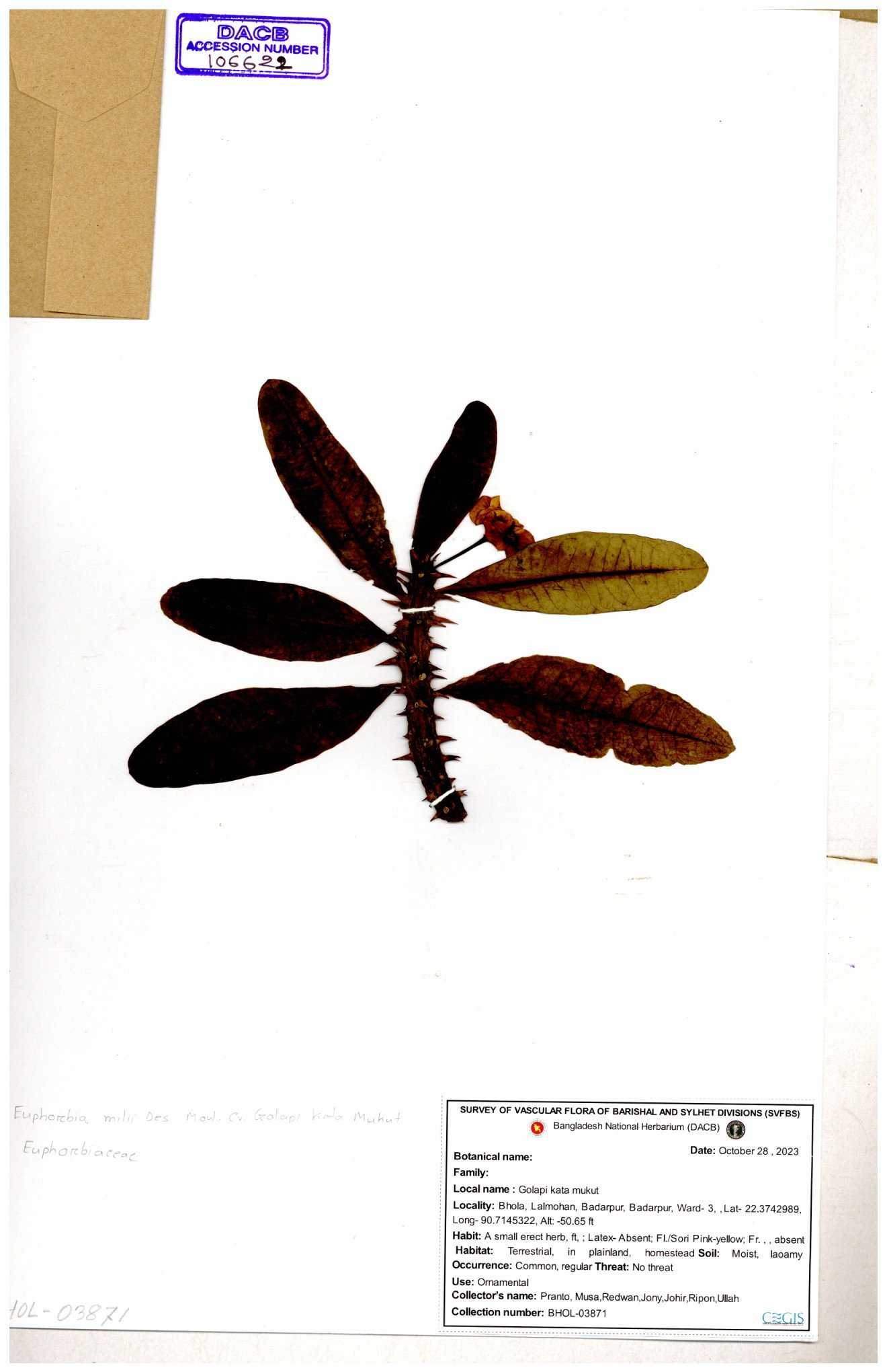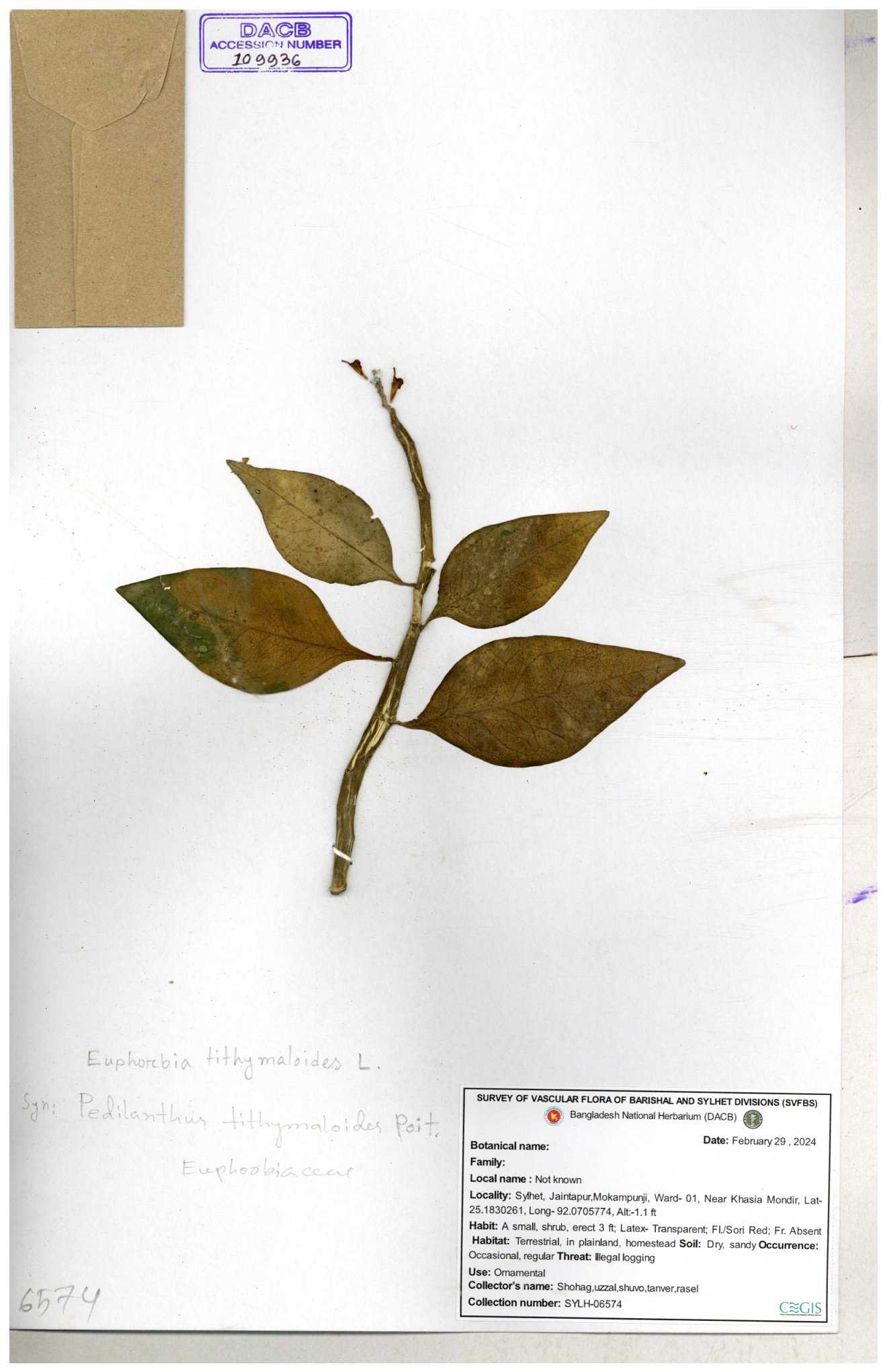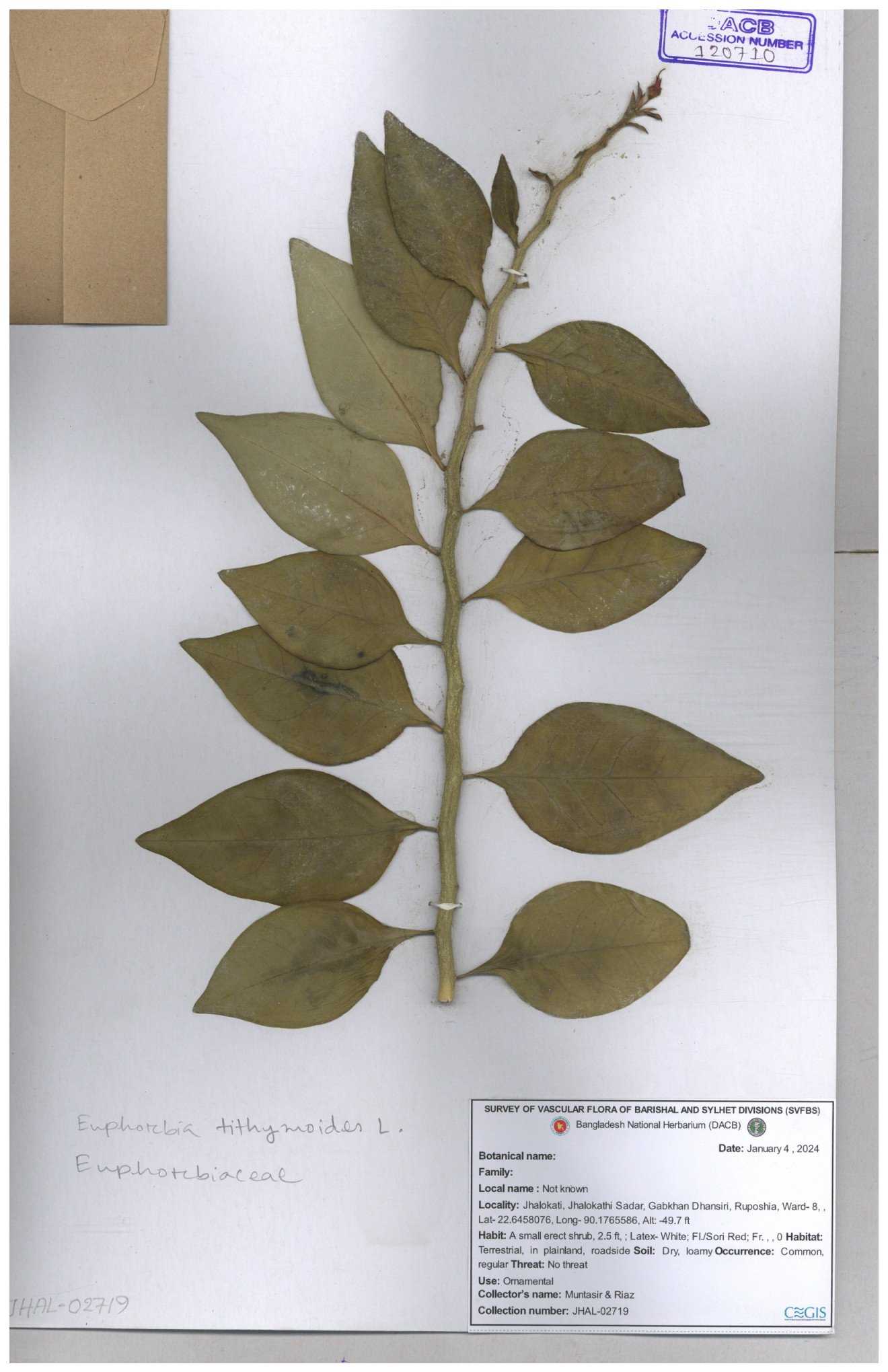 | 50334 | Euphorbiaceae | Euphorbia tithymolaides ( | Ornamental | Tajul, Owahid & Kawsar | TOK-0057 30-11--0001 |