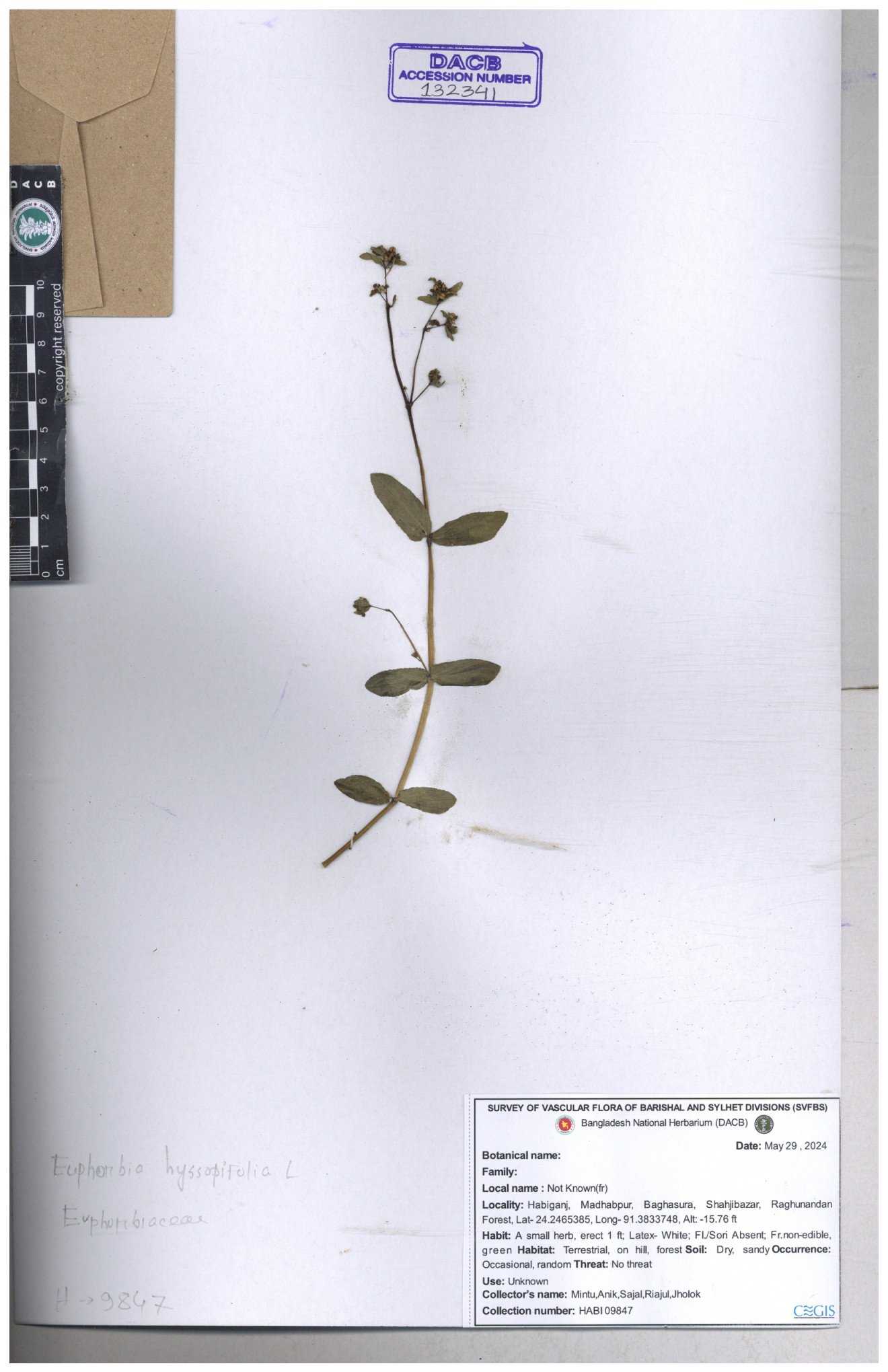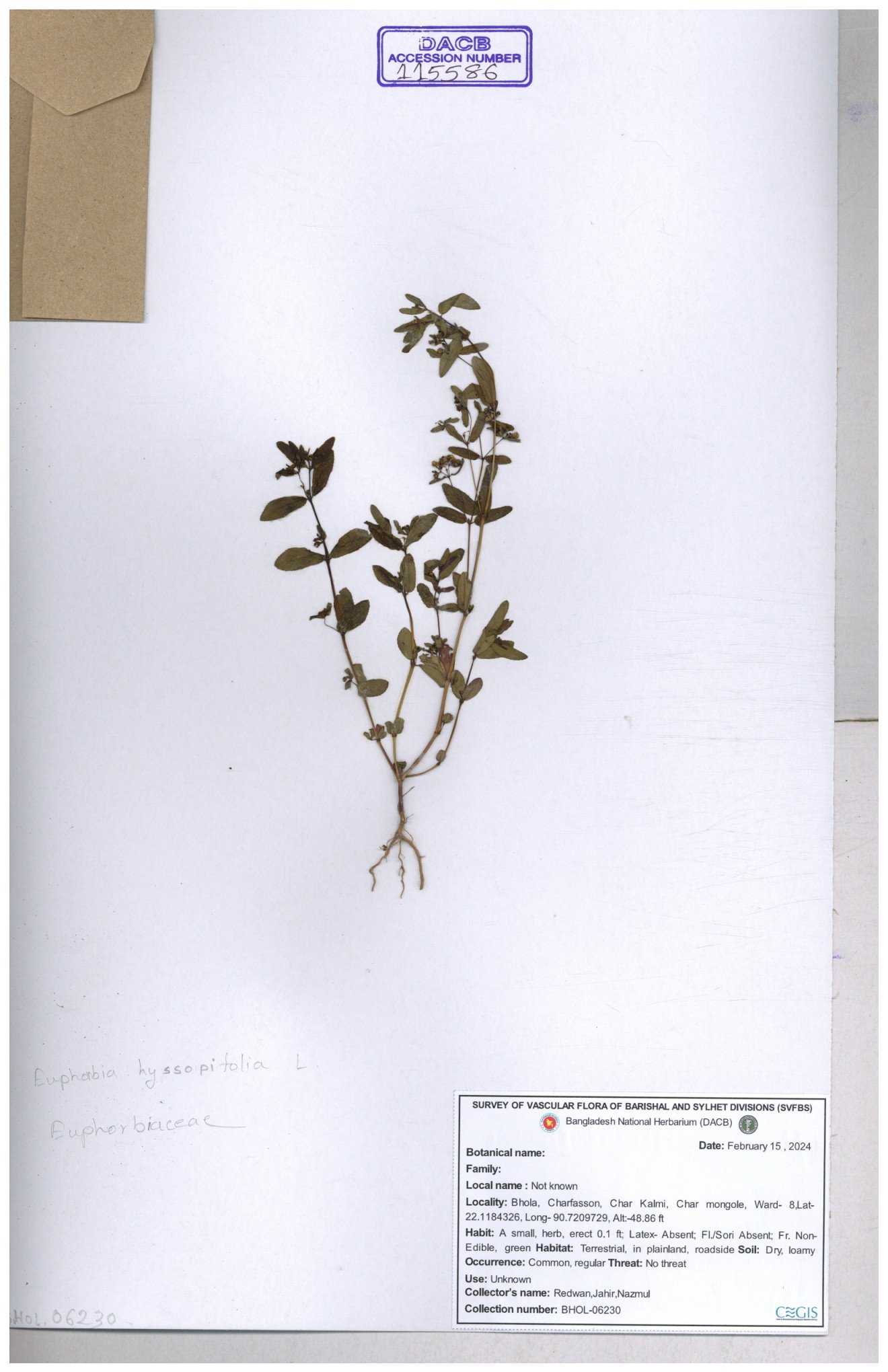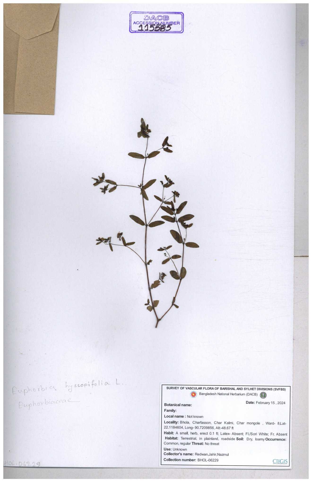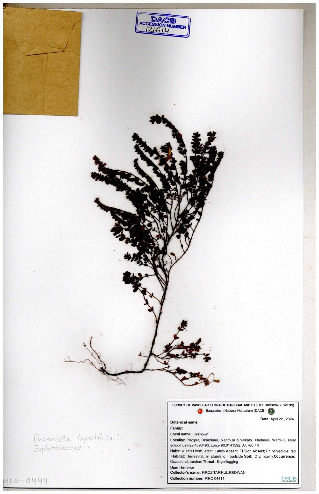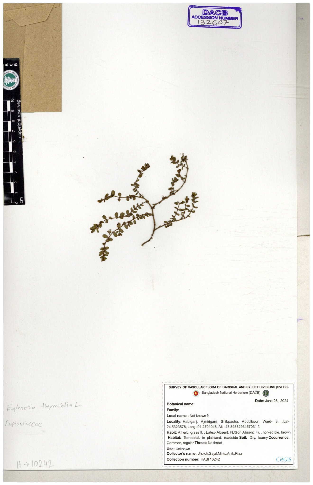| 11607 | Euphorbiaceae | Euphorbia thymifolia L. | Hasan, Huq & Nazrul | H-3873 30-11--0001 |