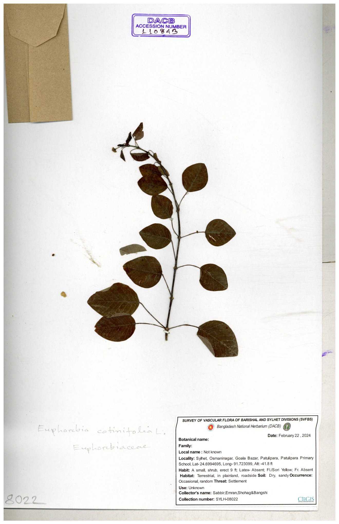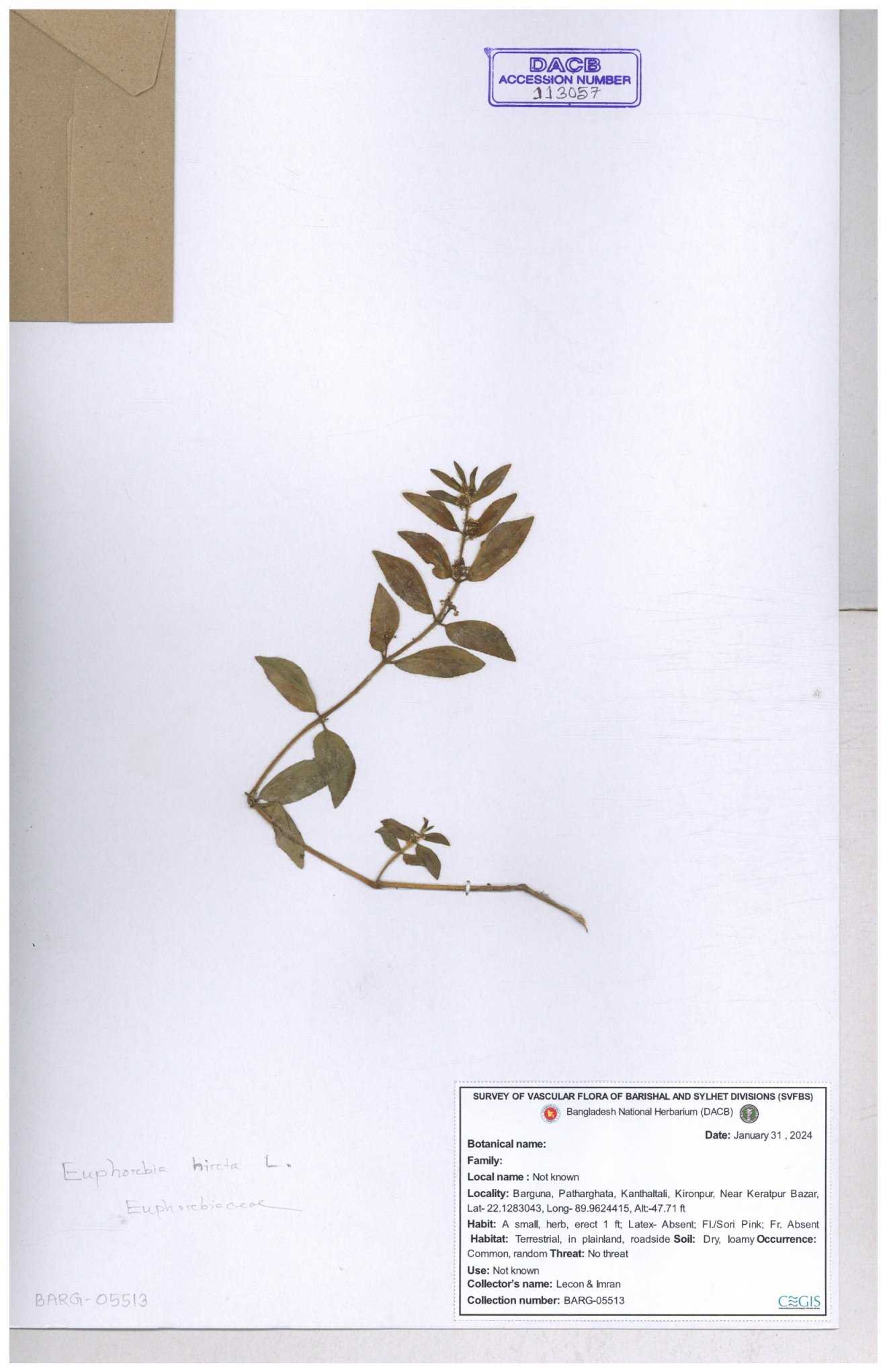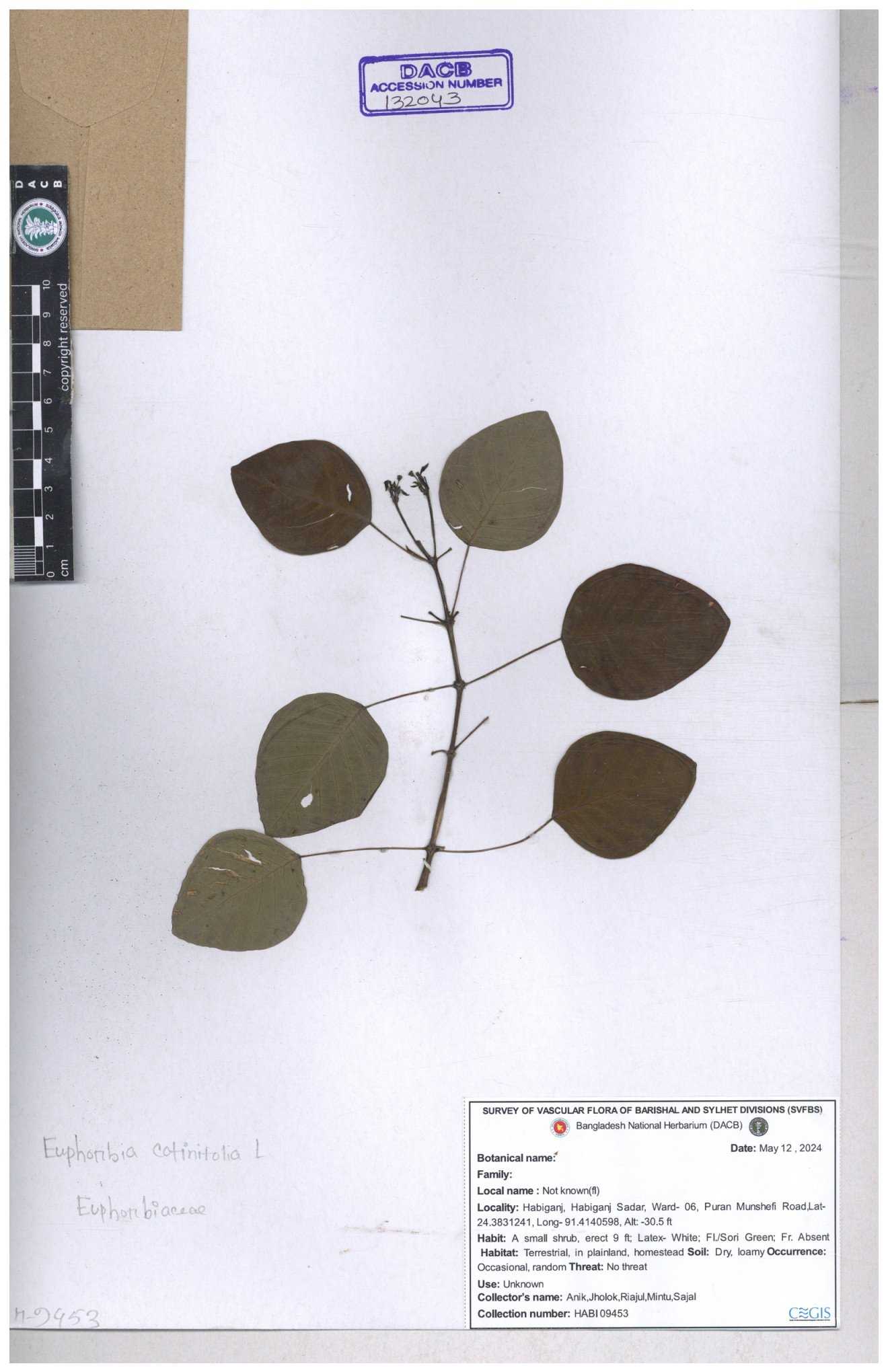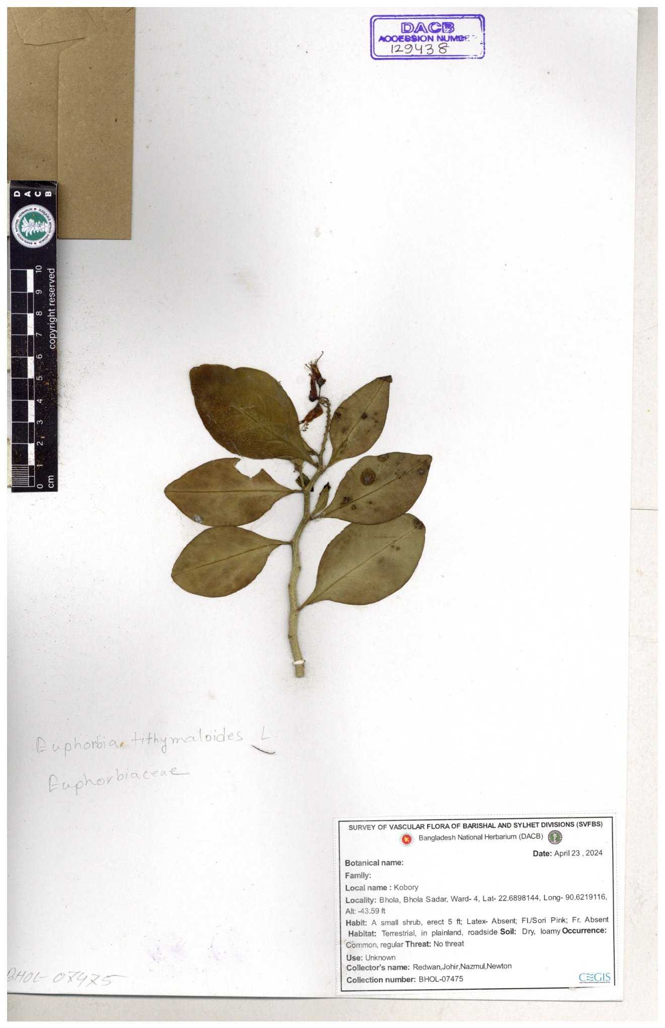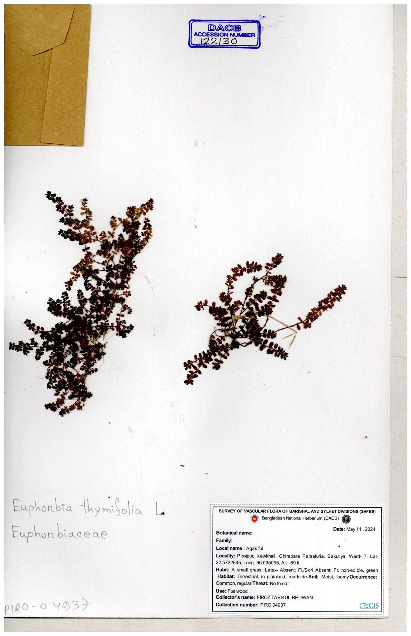 | 11607 | Euphorbiaceae | Euphorbia thymifolia L. | Hasan, Huq & Nazrul | H-3873 30-11--0001 |