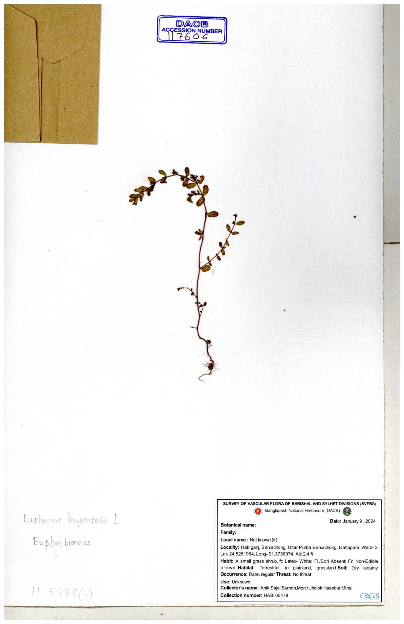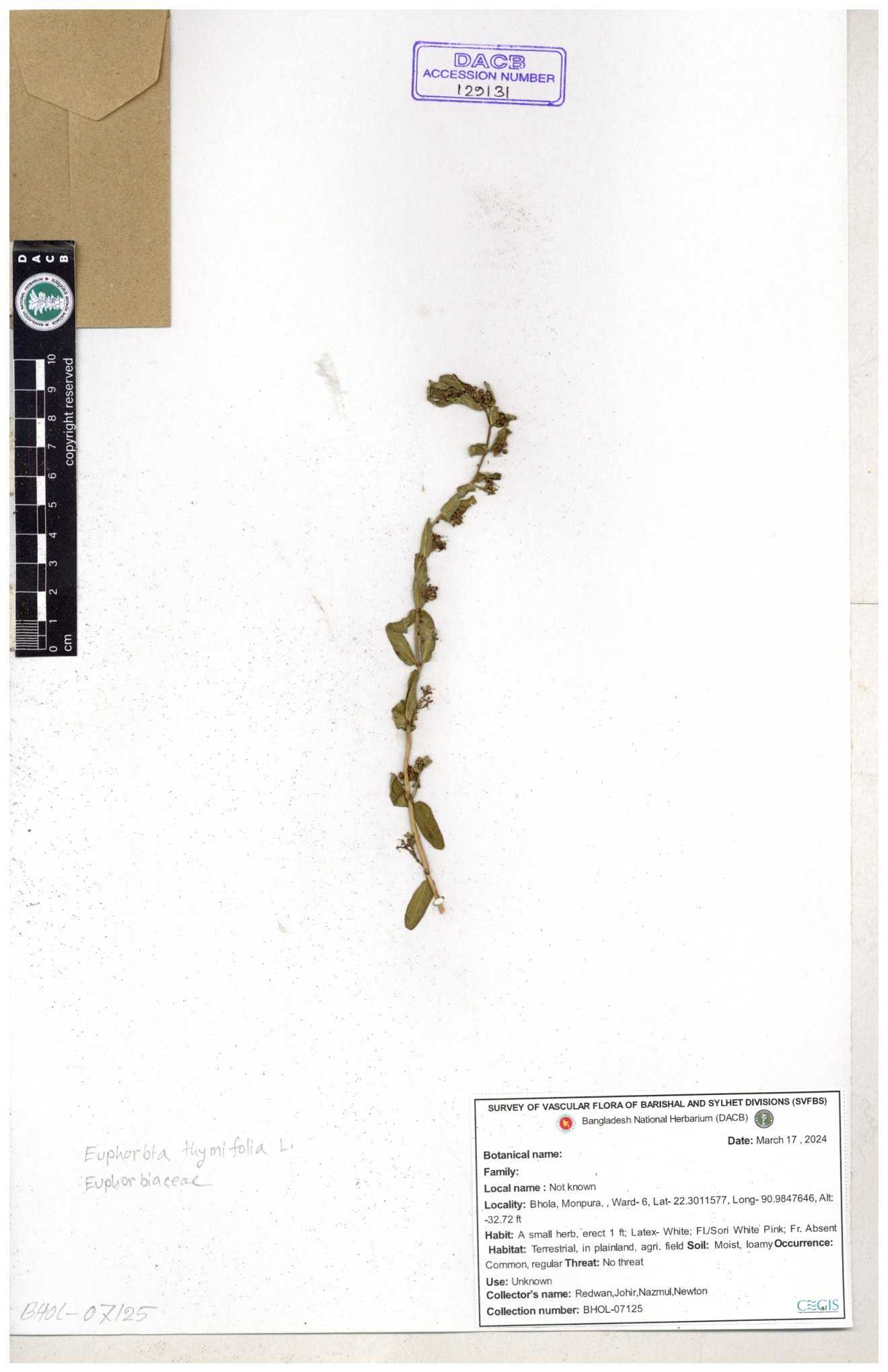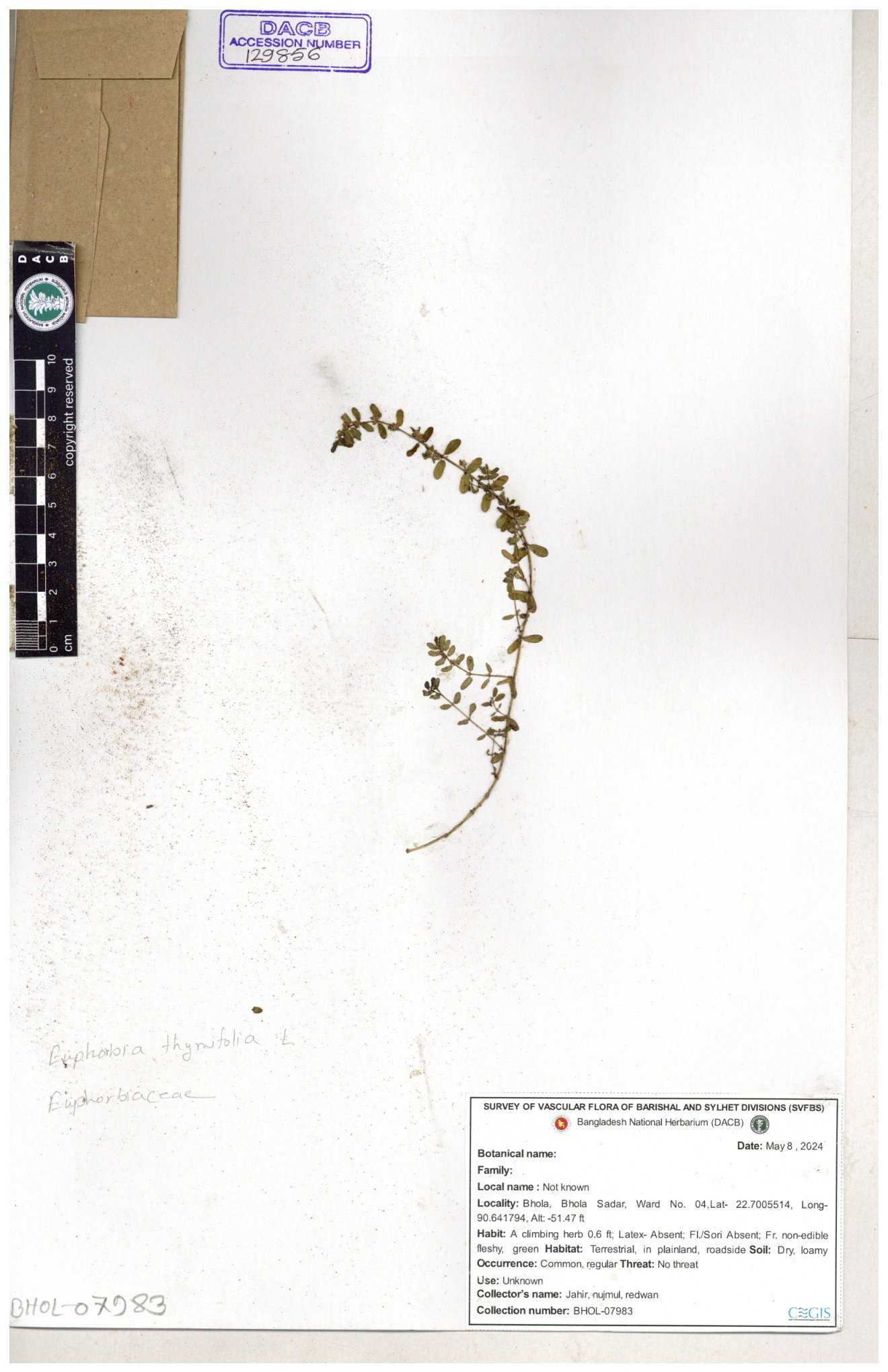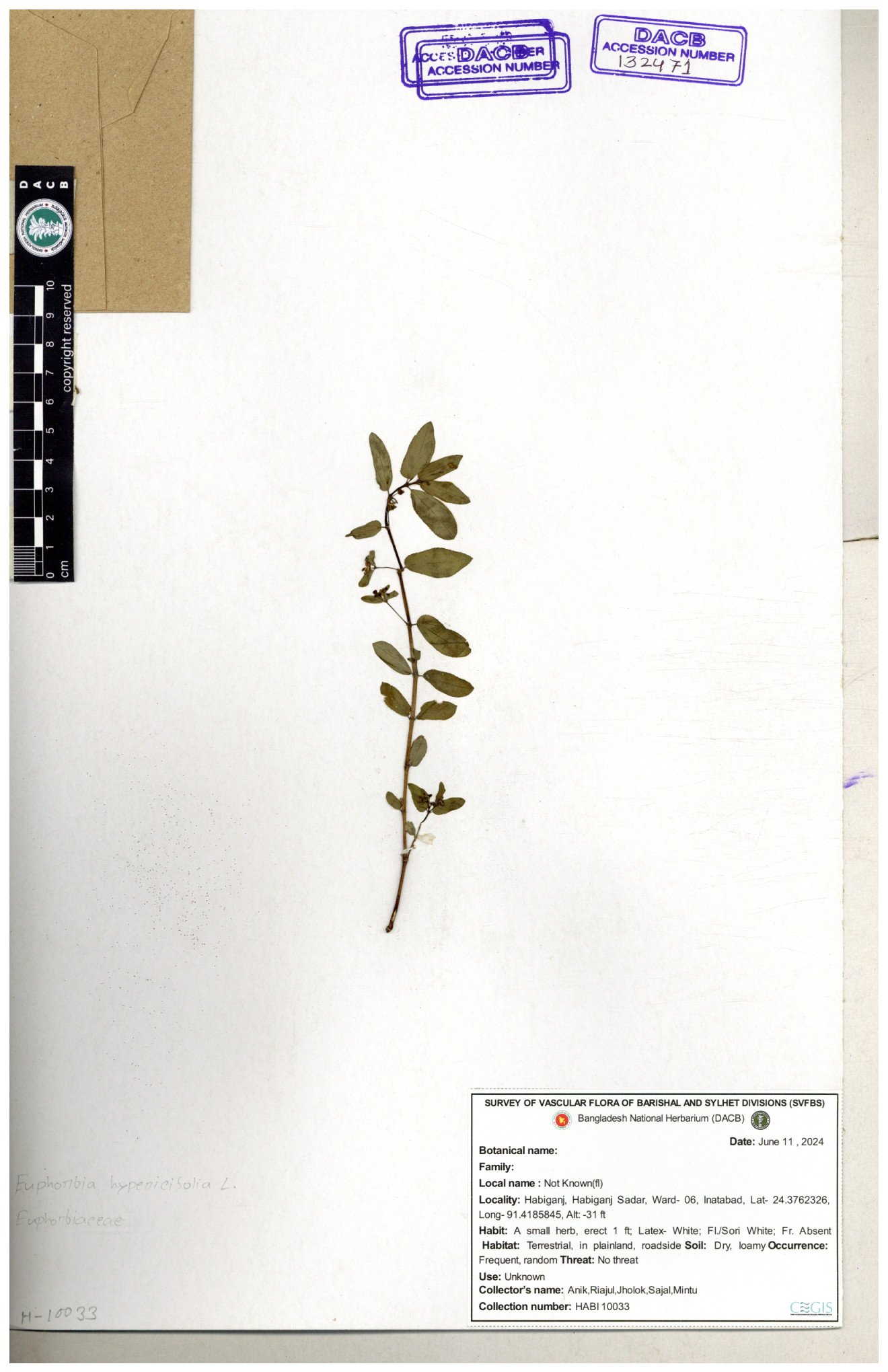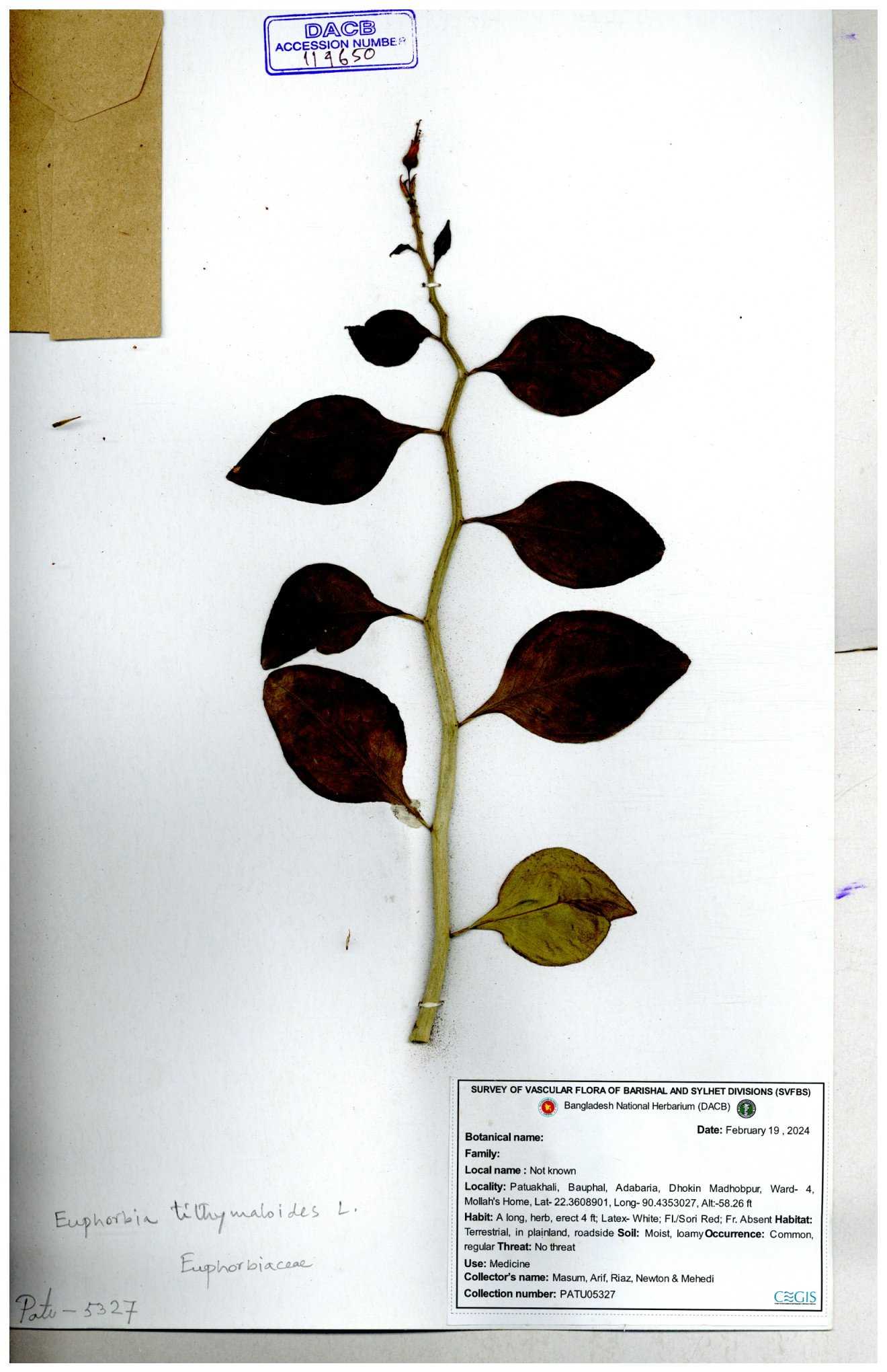 | 11623 | Euphorbiaceae | Euphorbia thymifolia L. | Huq, Mia & Mahbuba | H-6074 30-11--0001 |