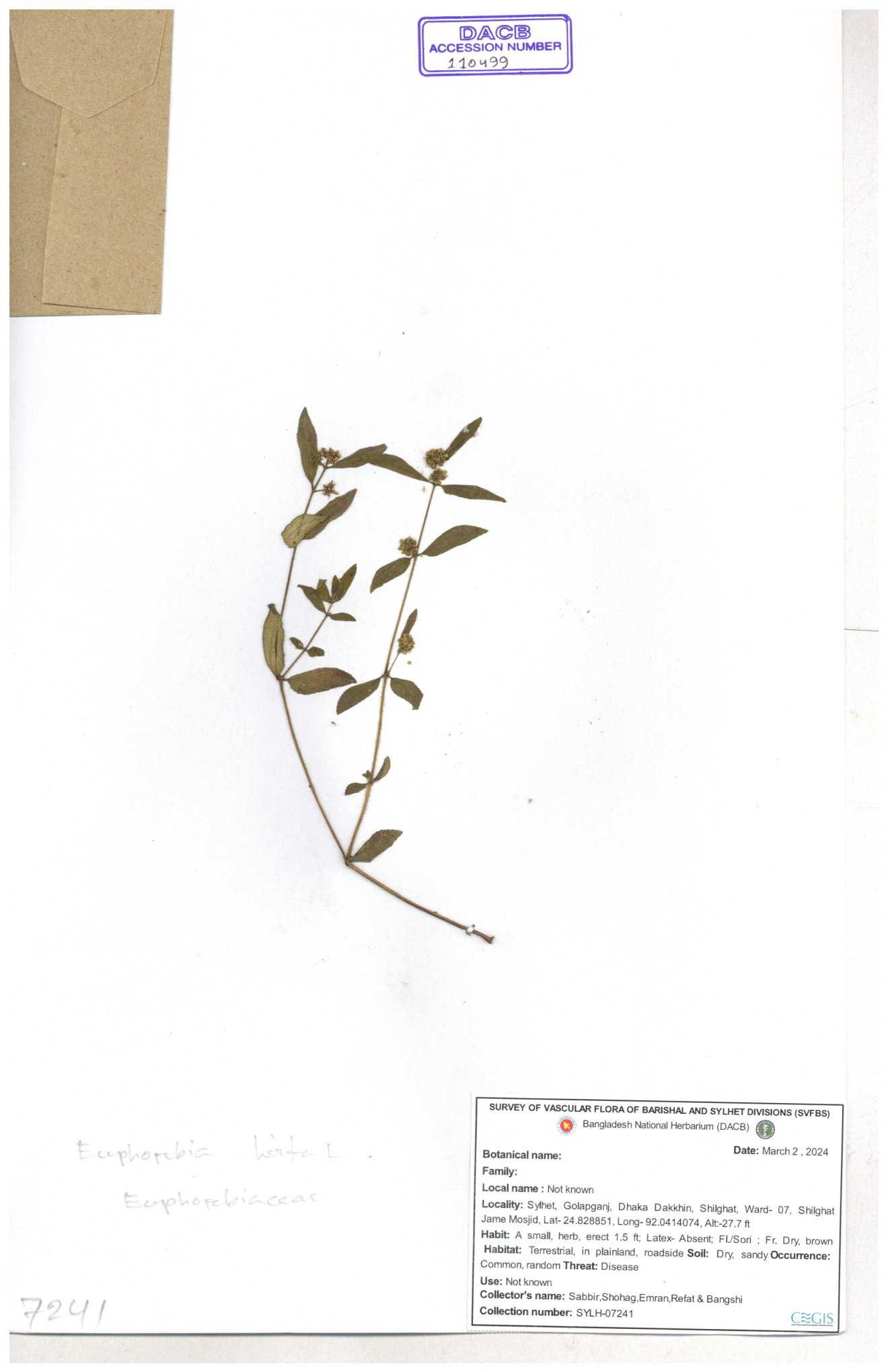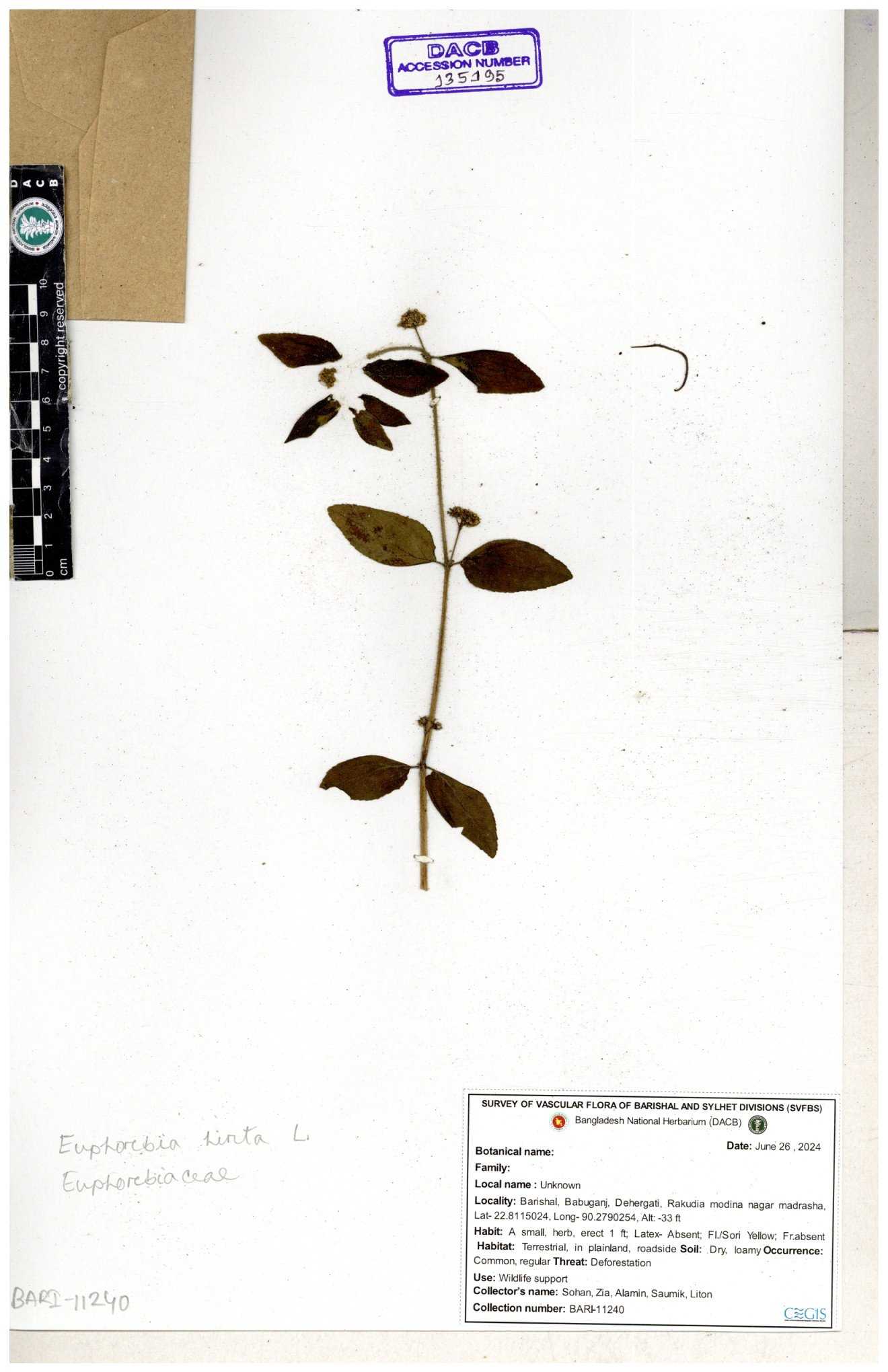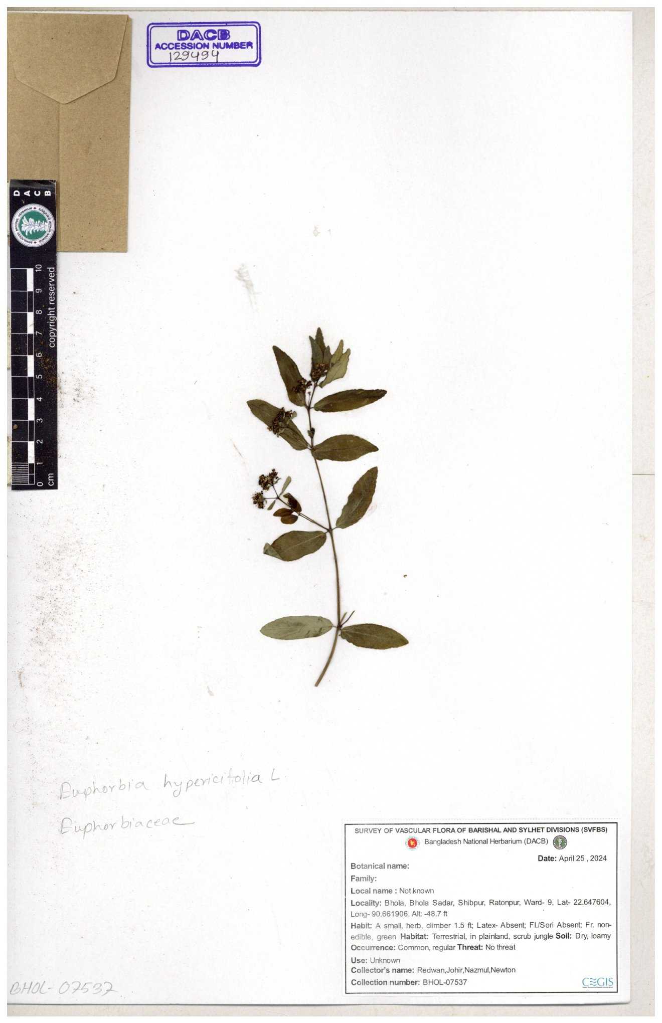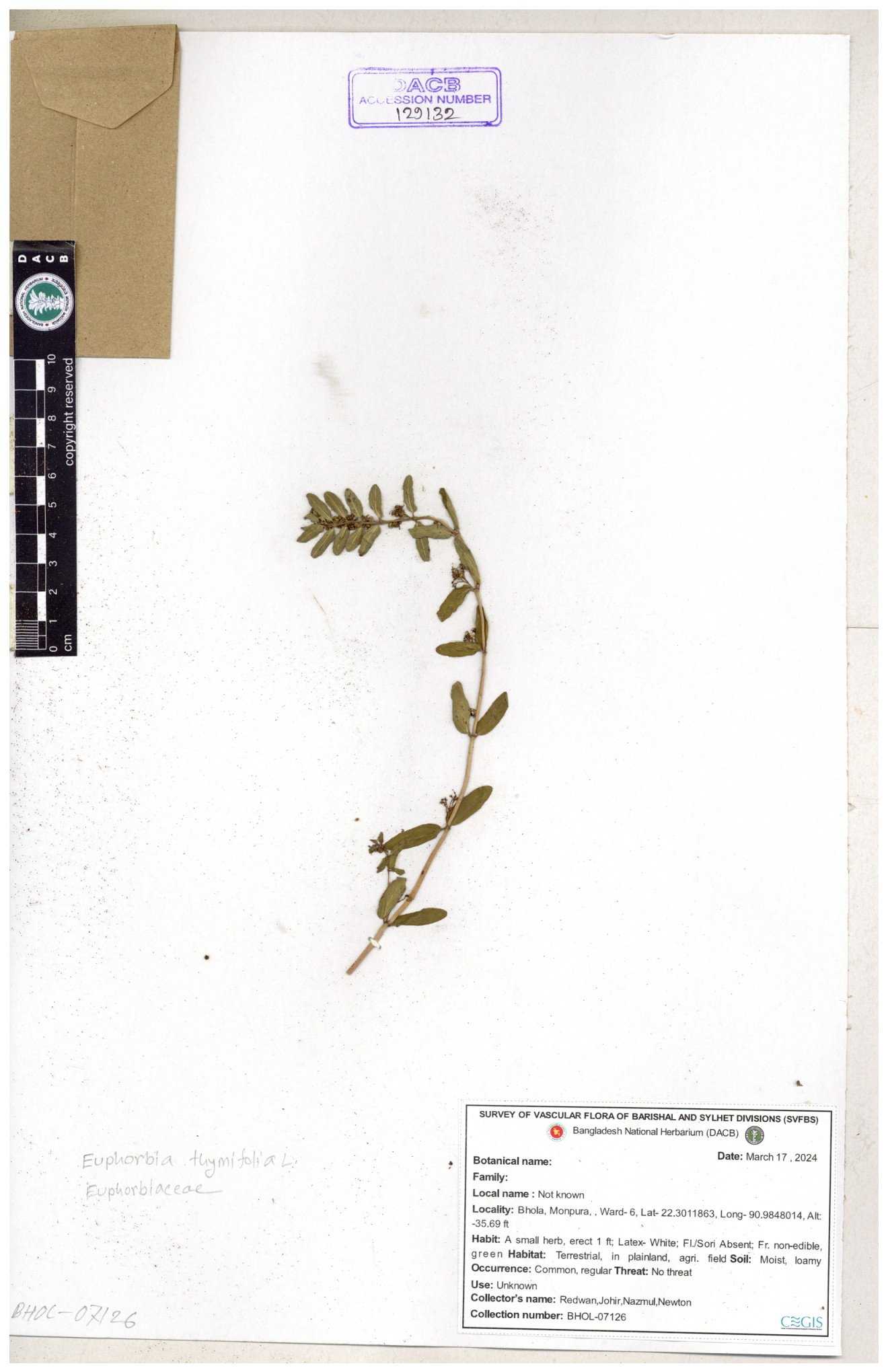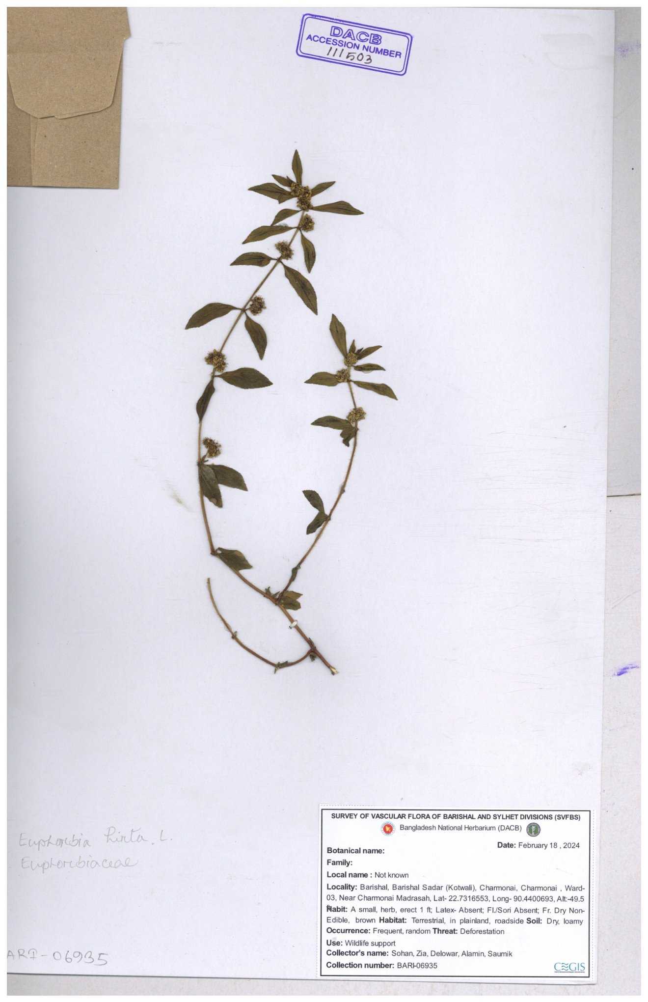 | 11623 | Euphorbiaceae | Euphorbia thymifolia L. | Huq, Mia & Mahbuba | H-6074 30-11--0001 |