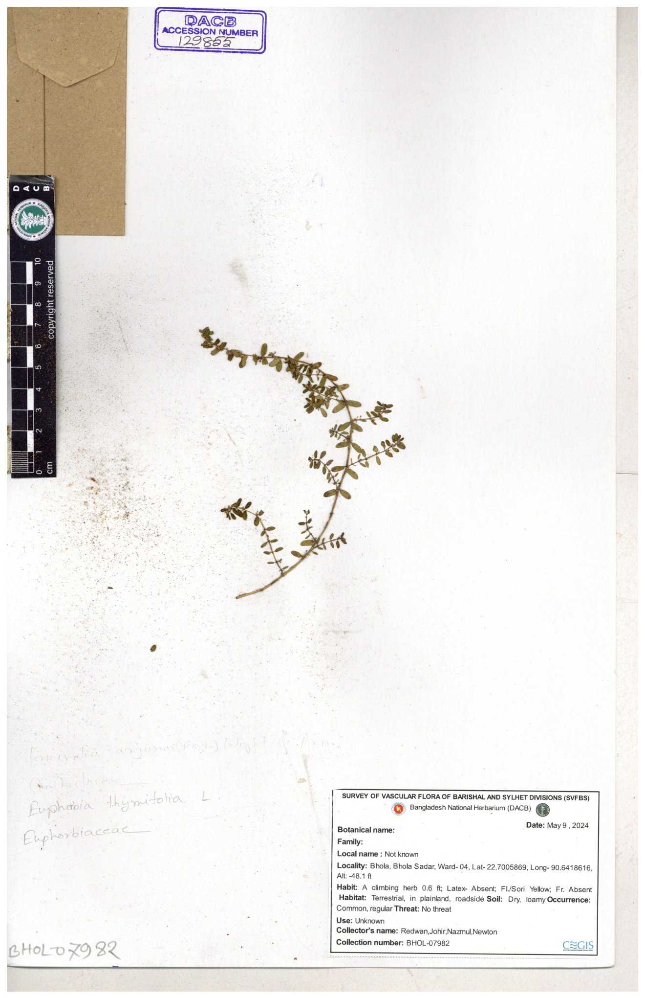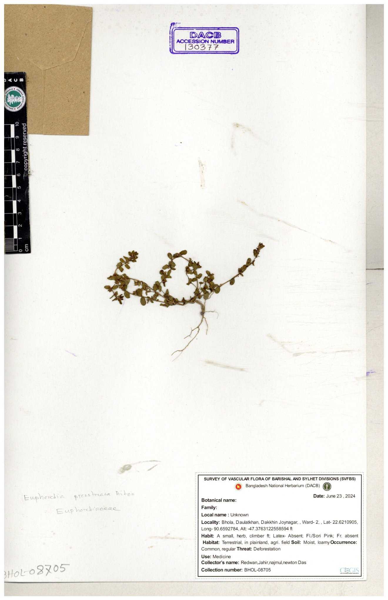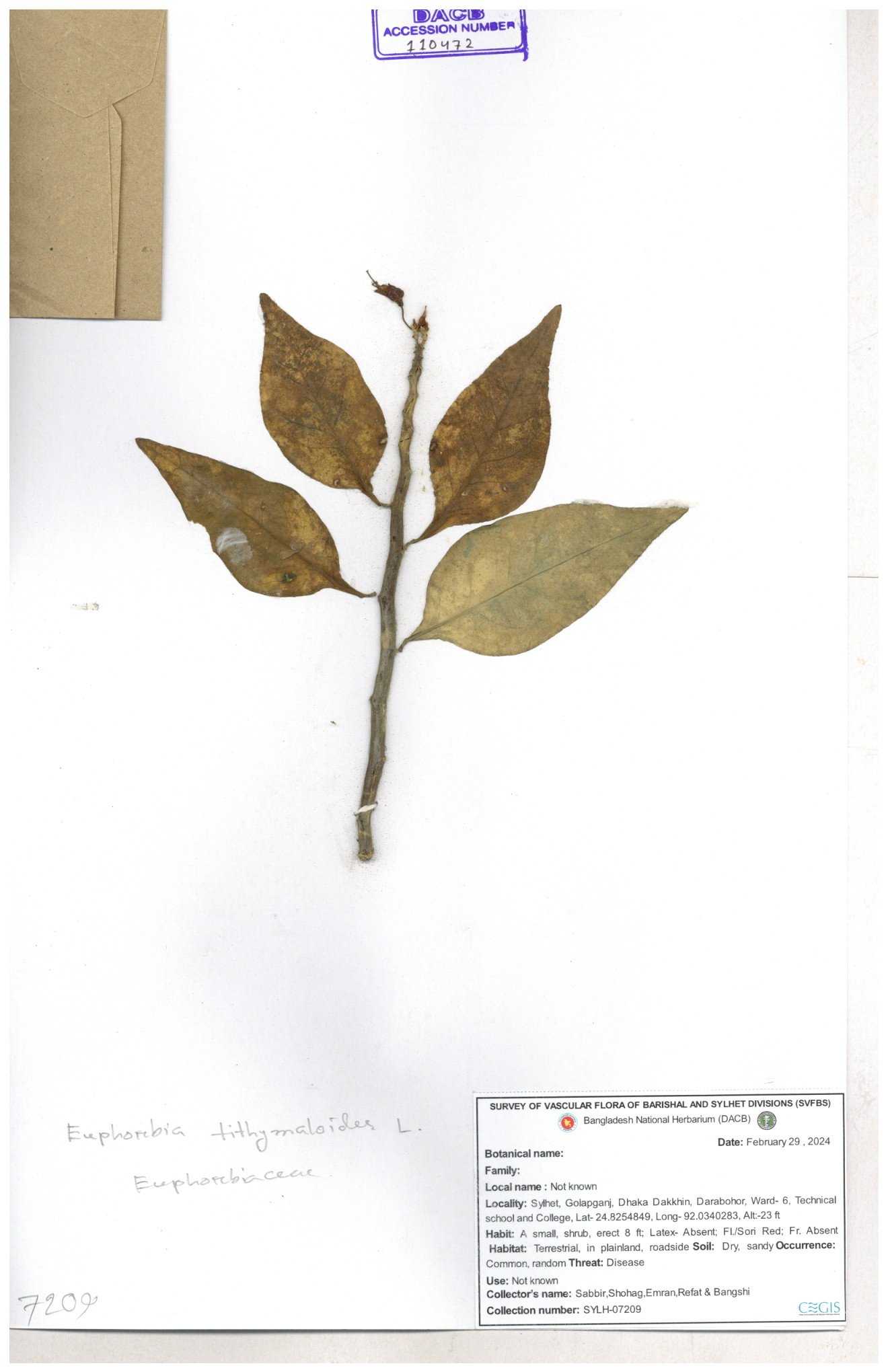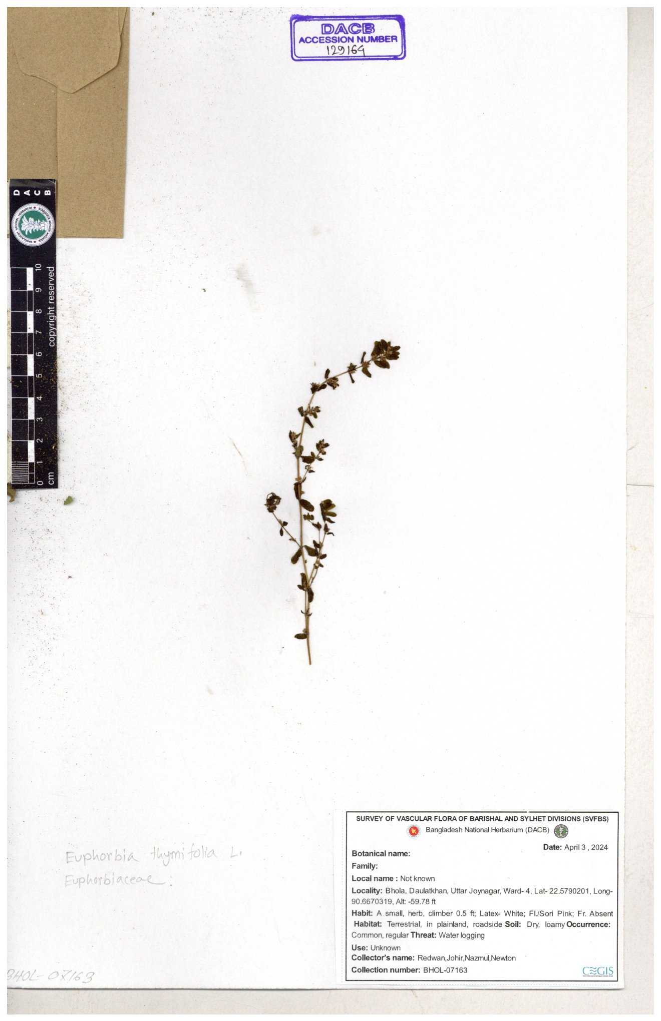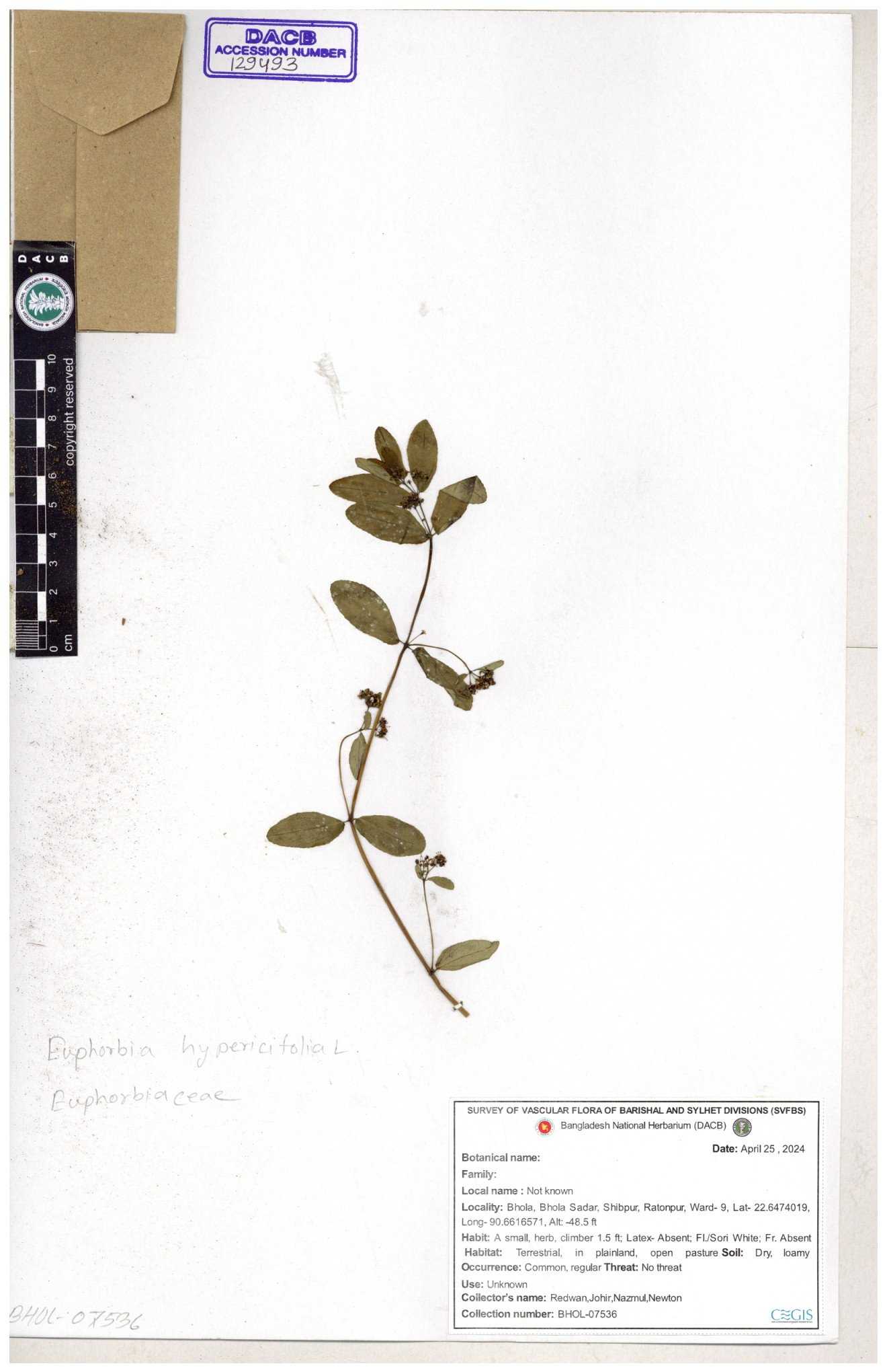 | 11623 | Euphorbiaceae | Euphorbia thymifolia L. | Huq, Mia & Mahbuba | H-6074 30-11--0001 |