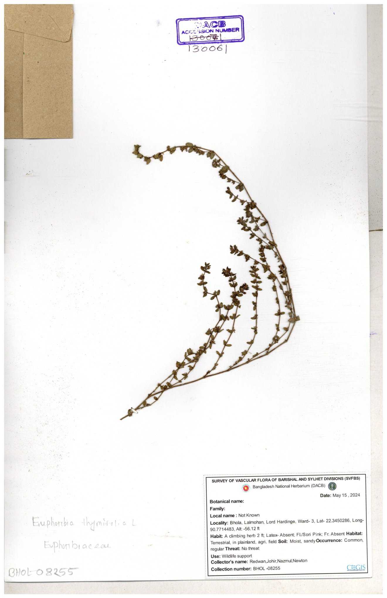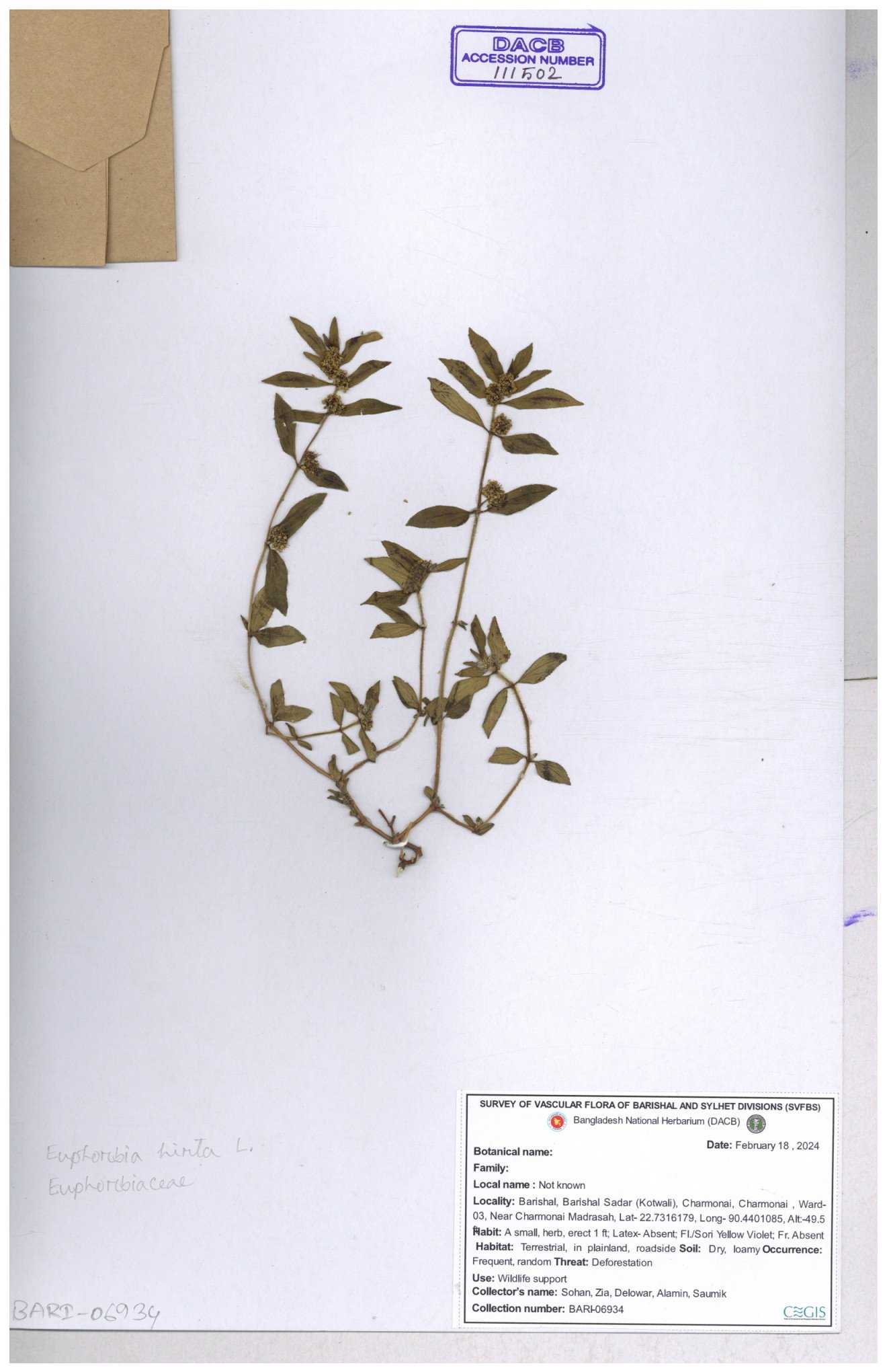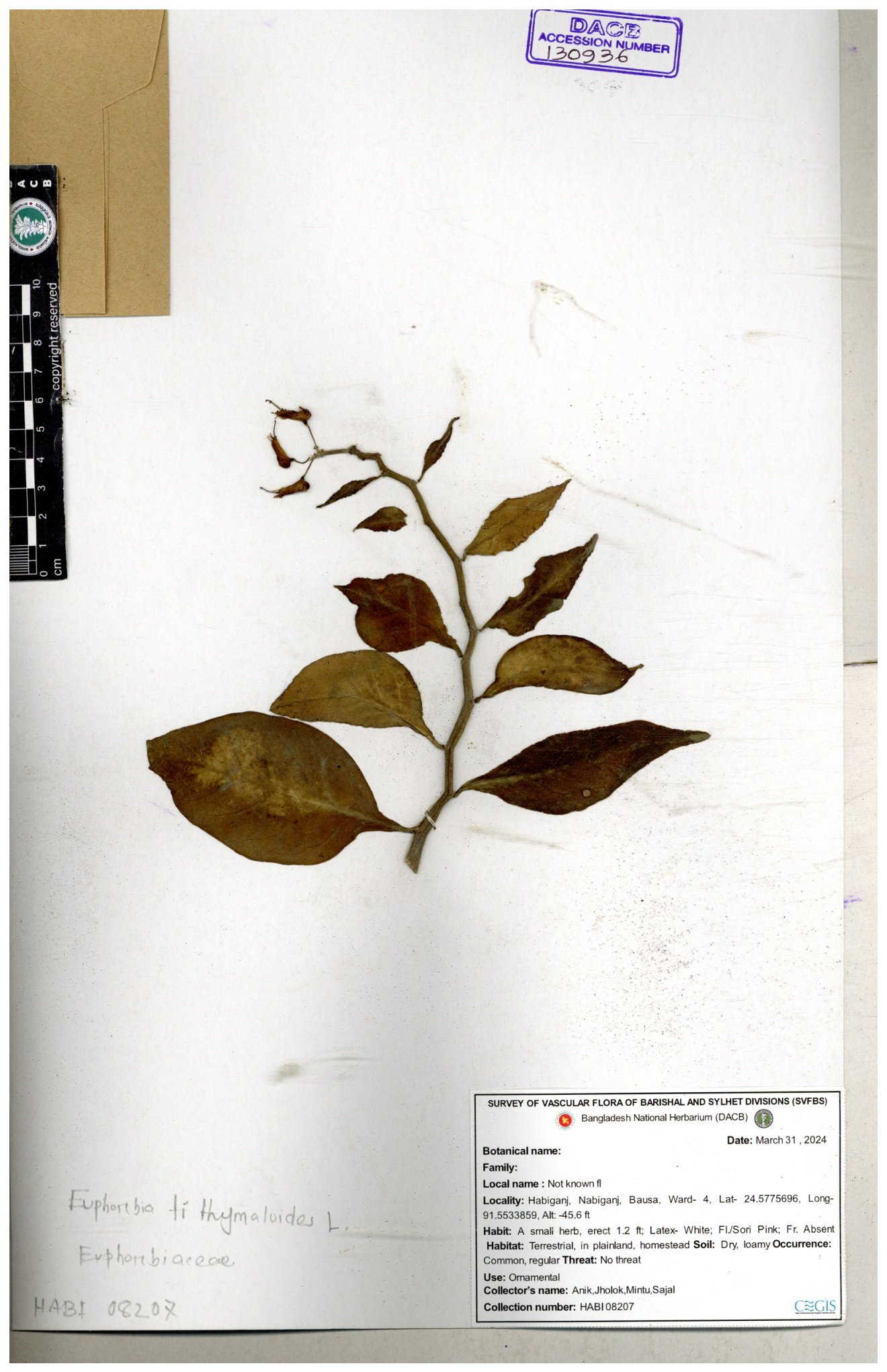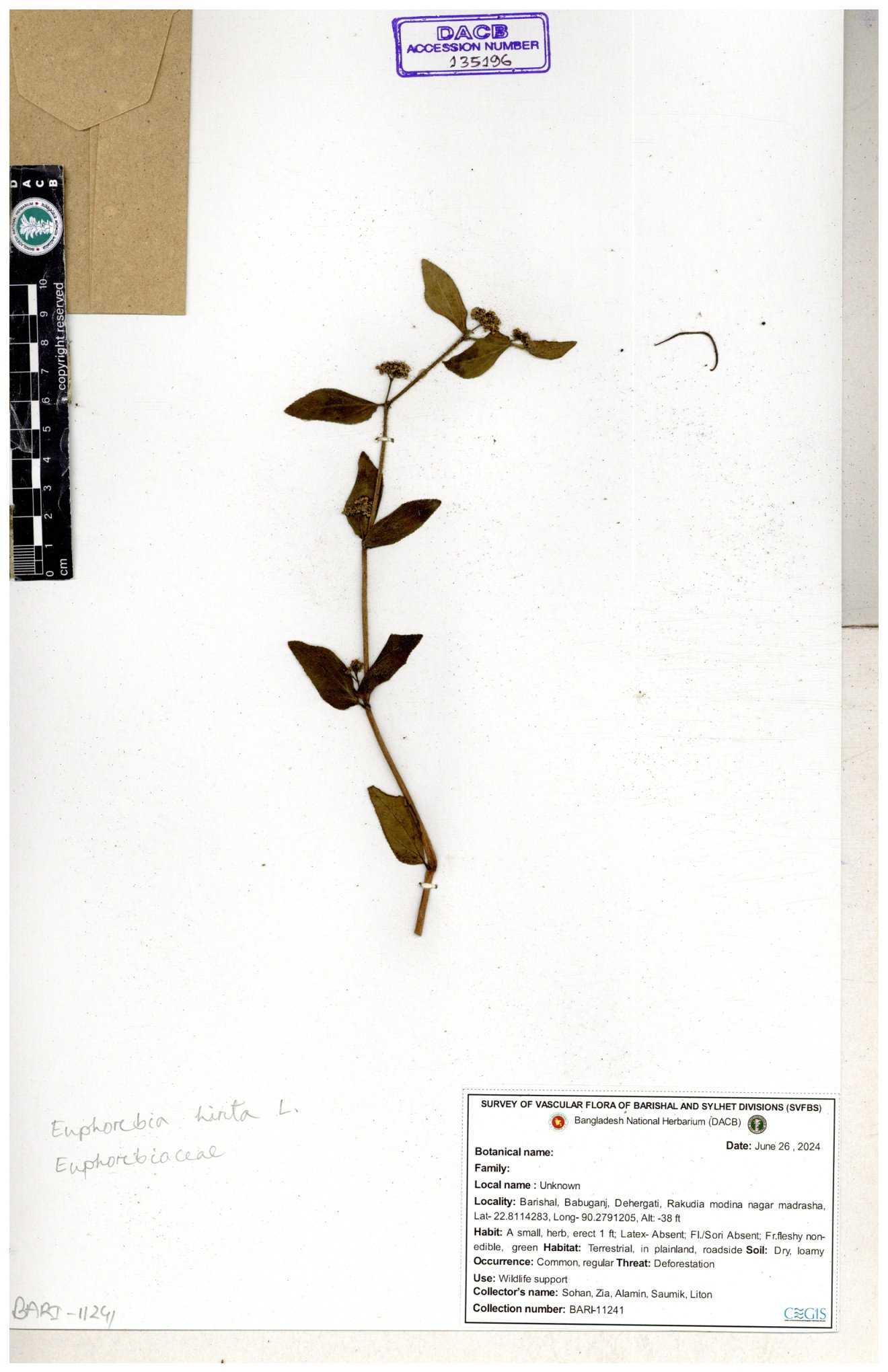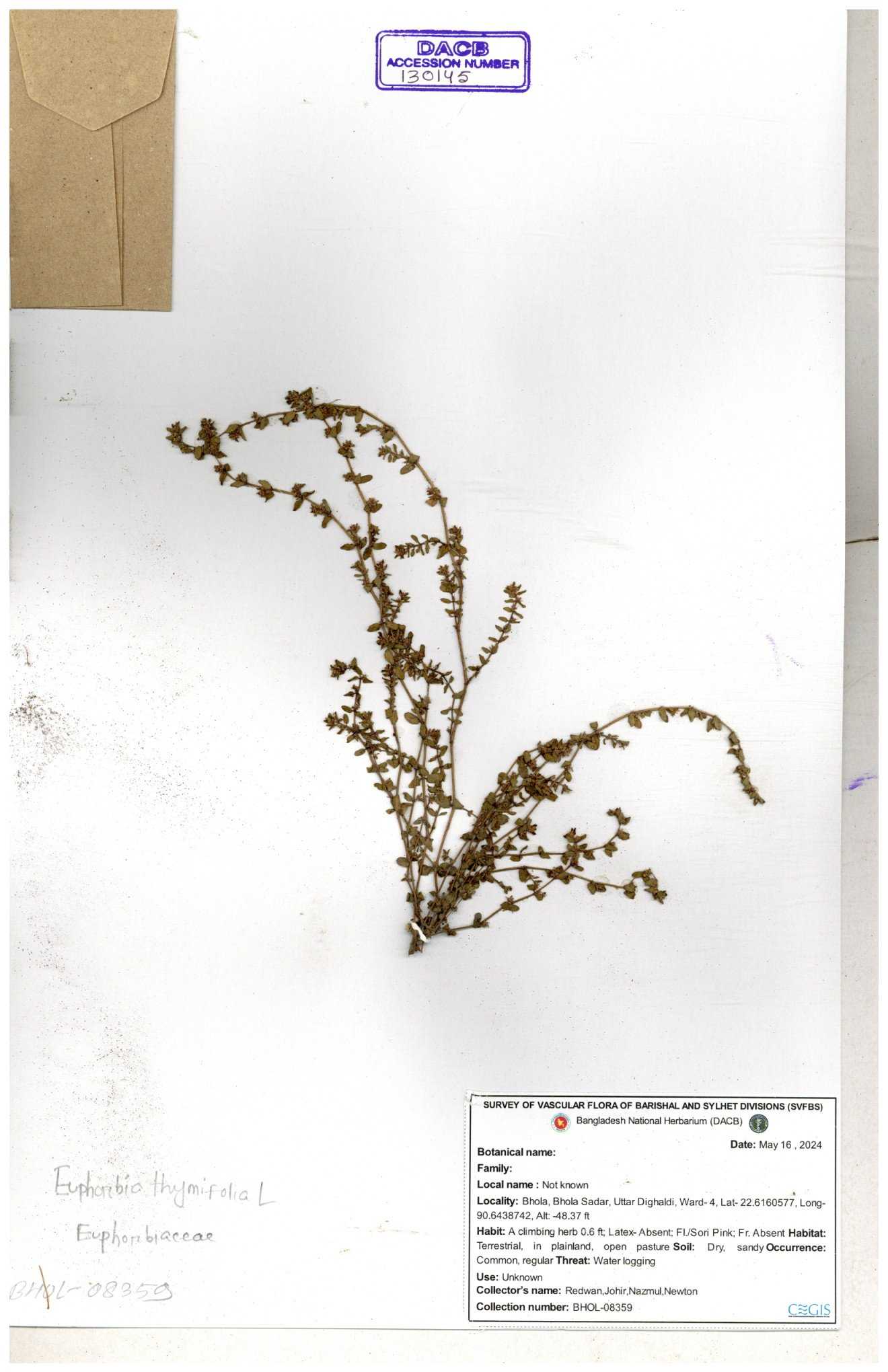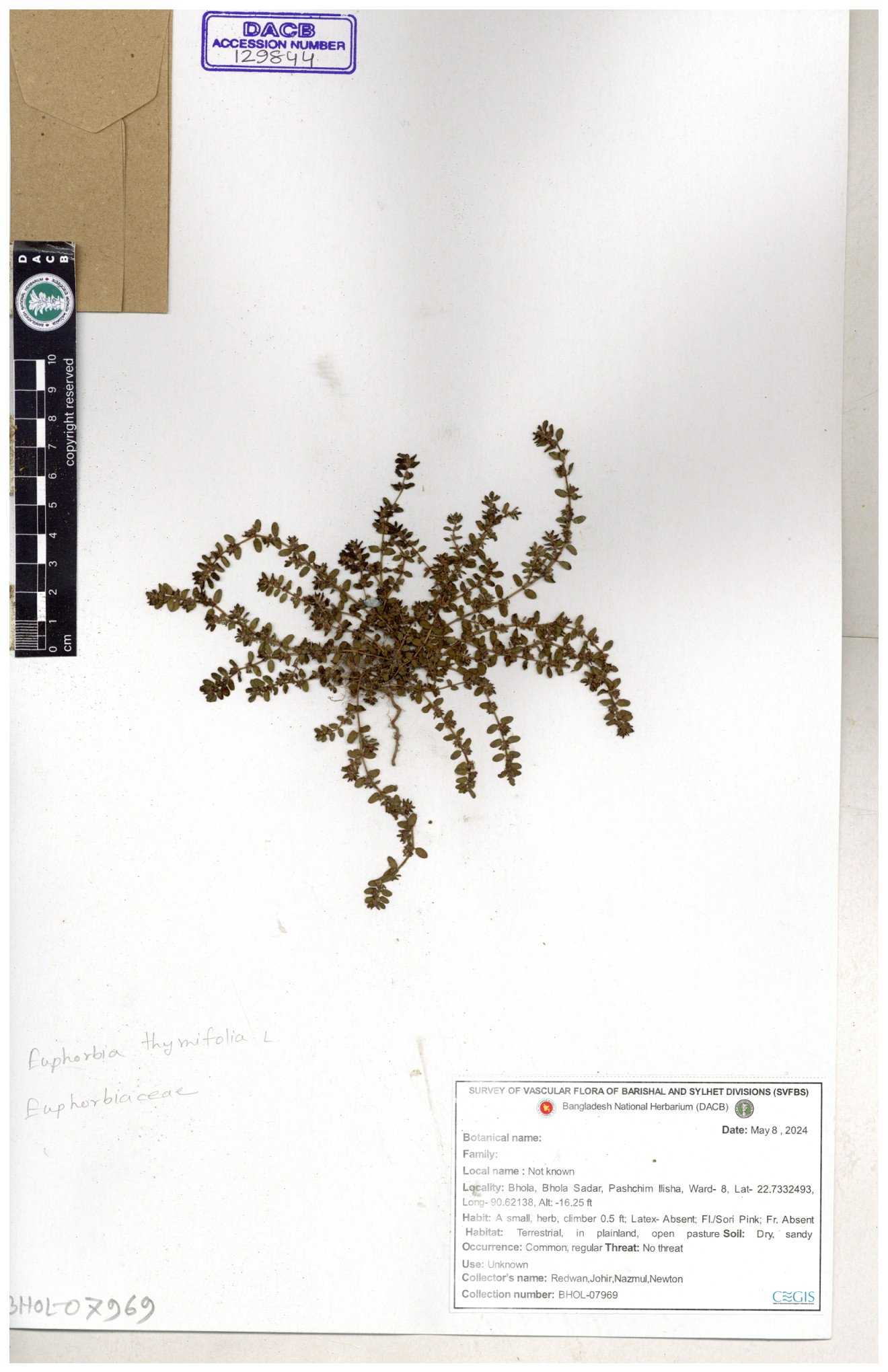 | 11623 | Euphorbiaceae | Euphorbia thymifolia L. | Huq, Mia & Mahbuba | H-6074 30-11--0001 |