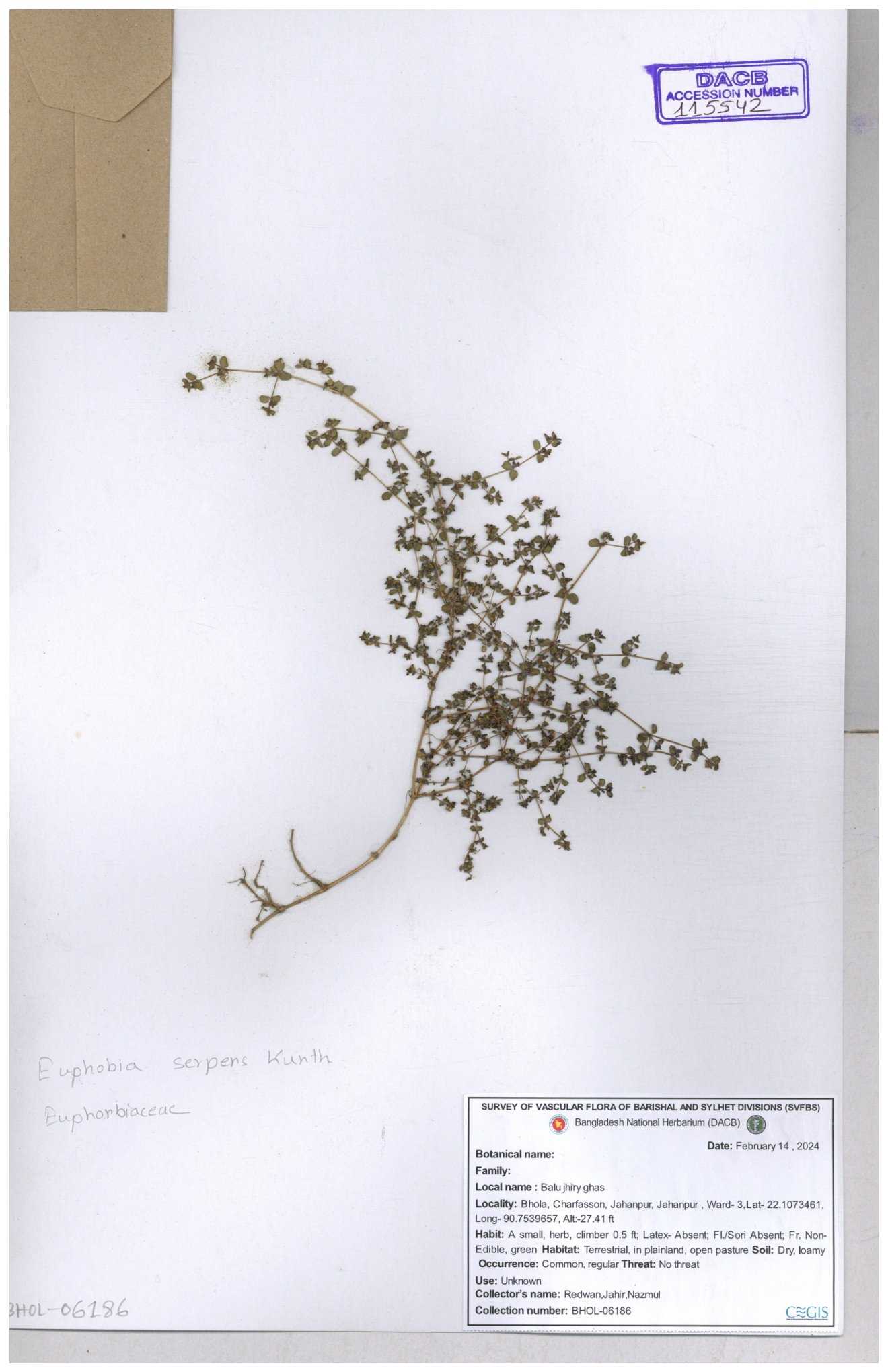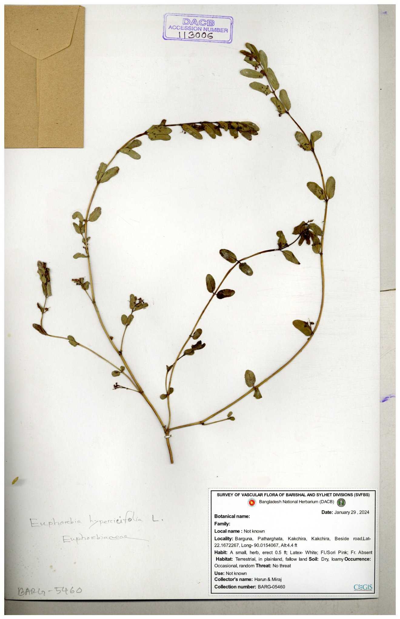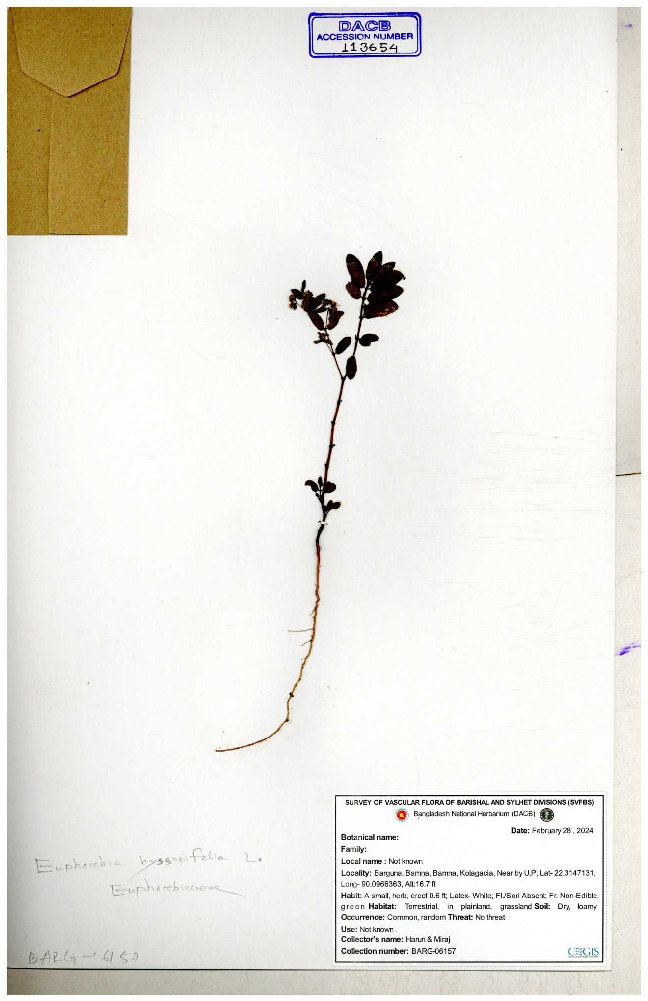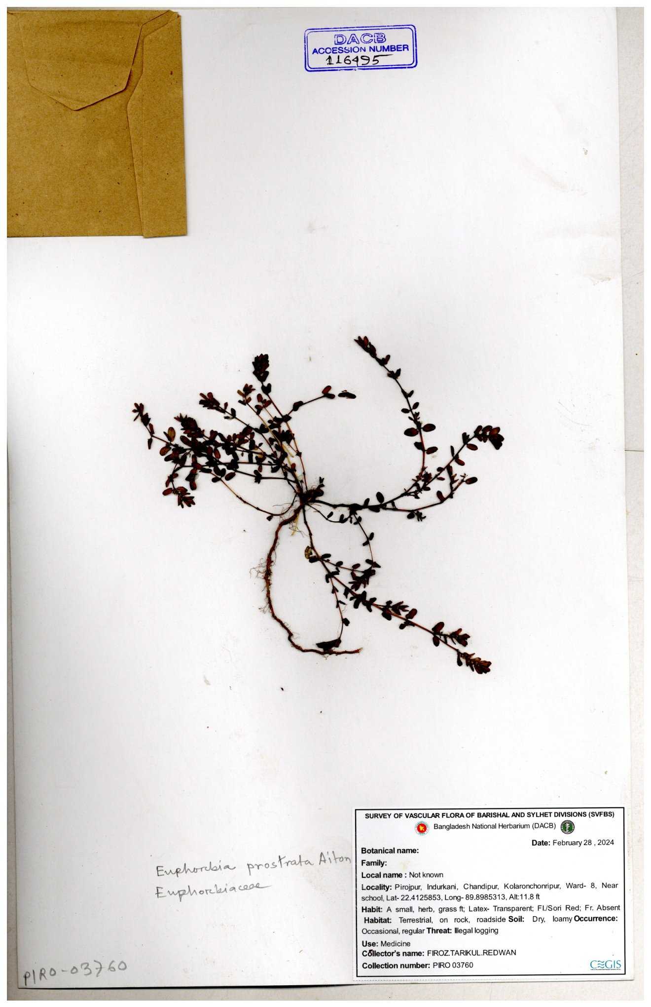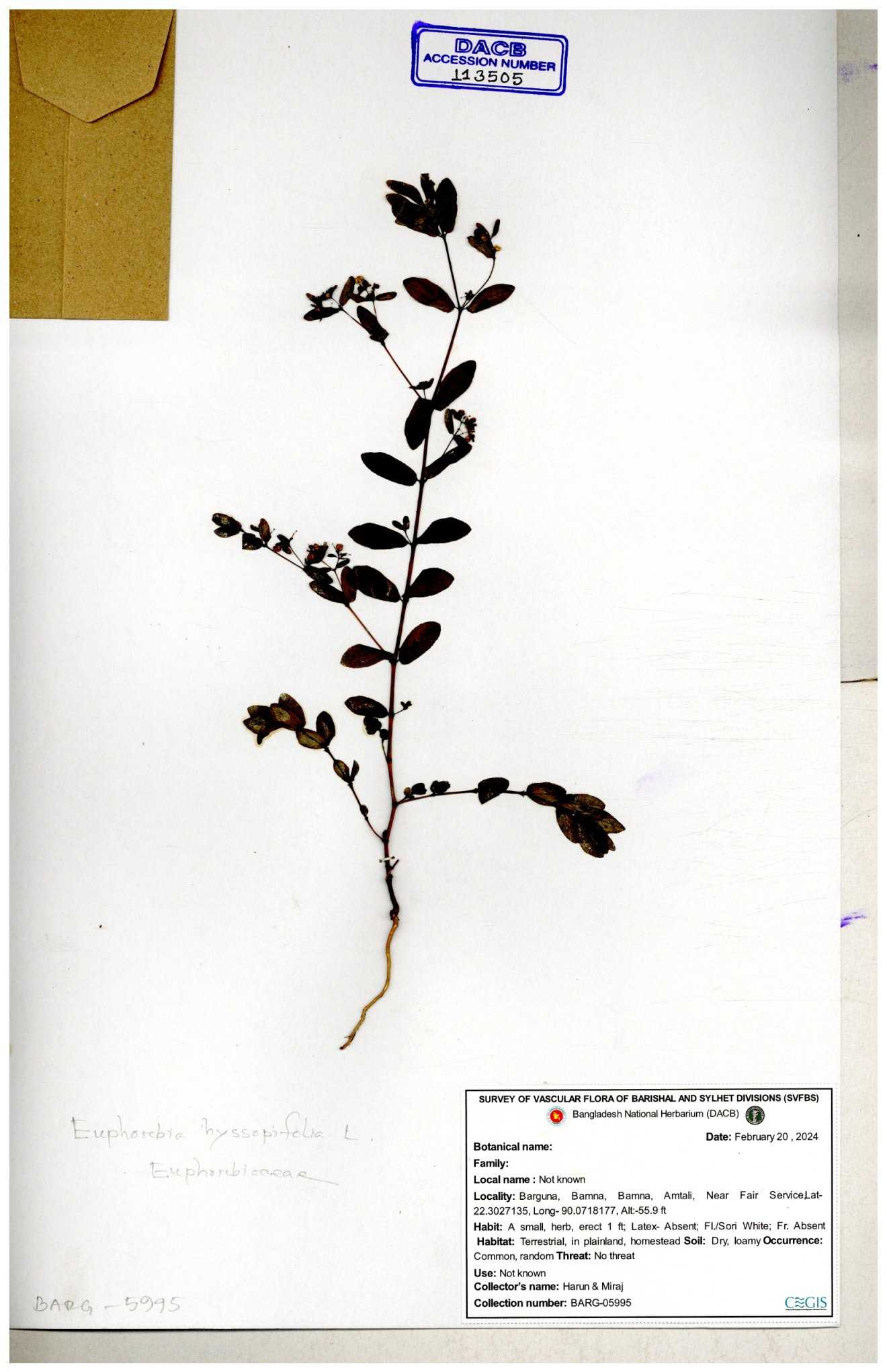 | 11623 | Euphorbiaceae | Euphorbia thymifolia L. | Huq, Mia & Mahbuba | H-6074 30-11--0001 |