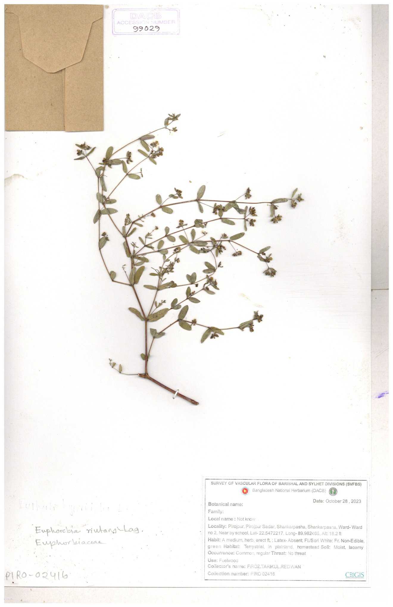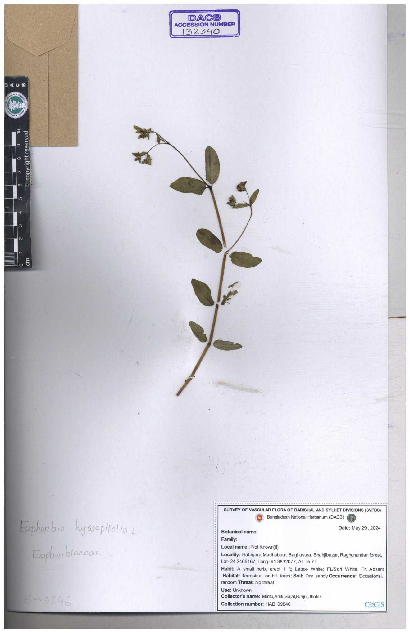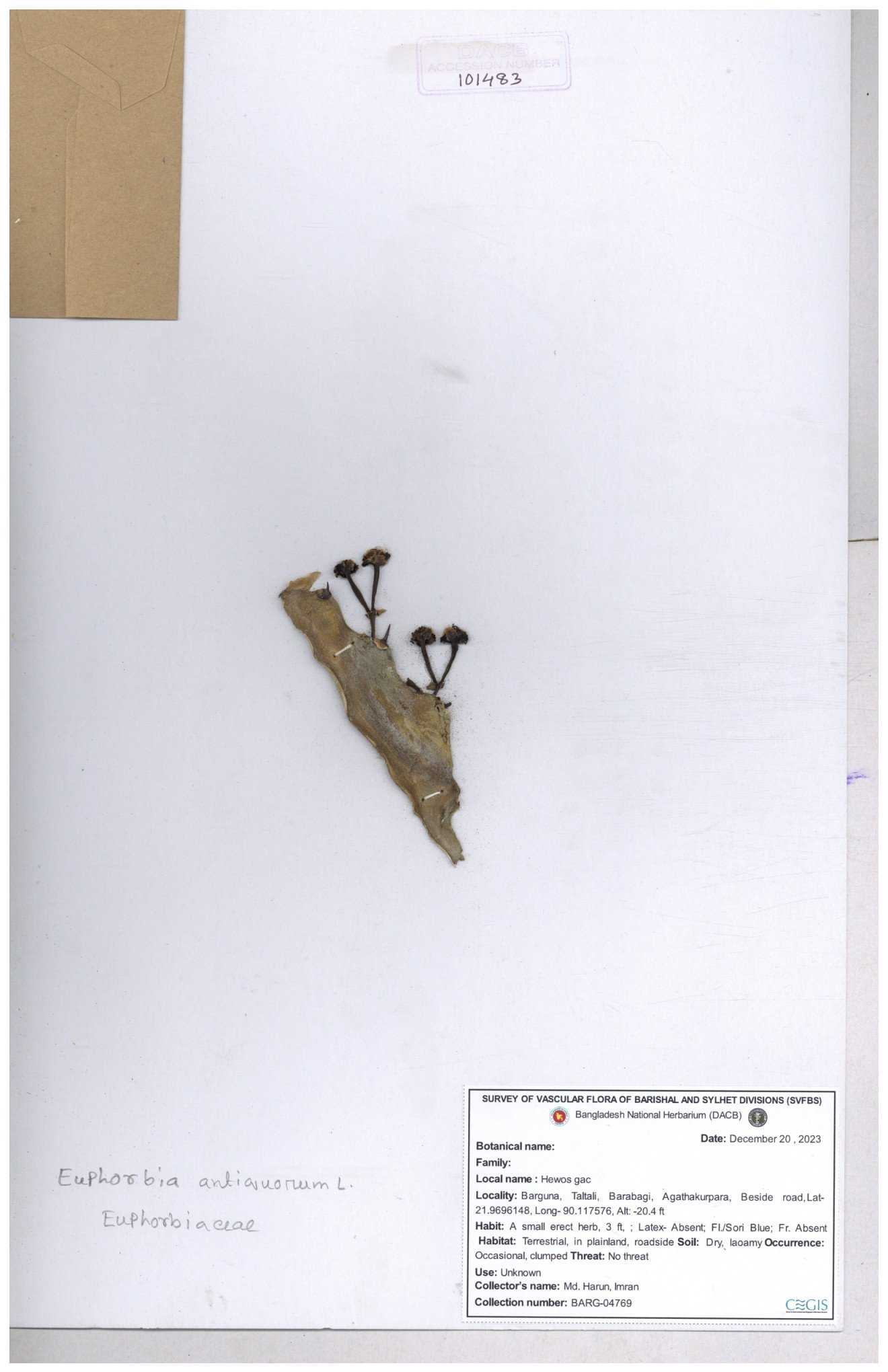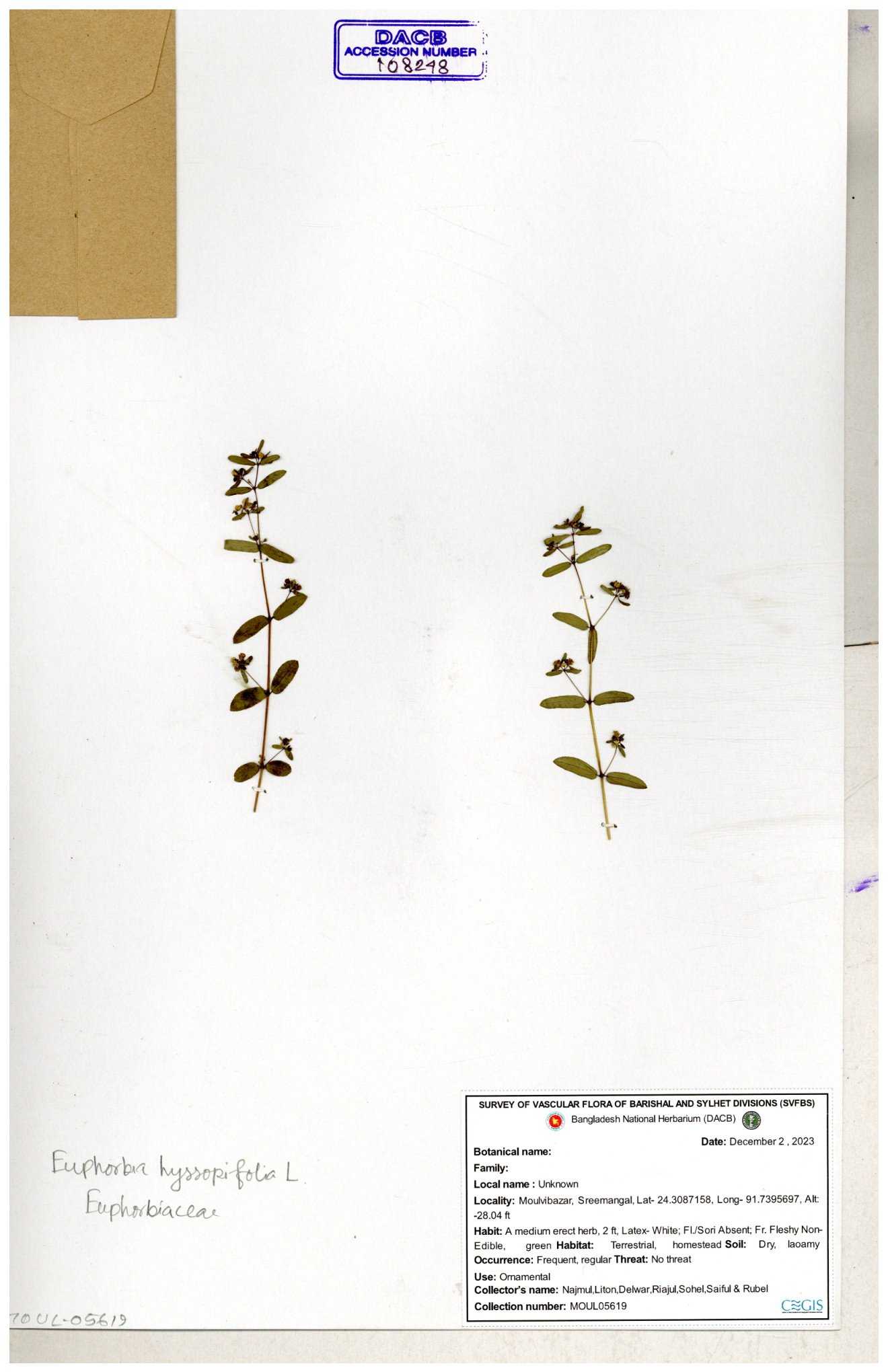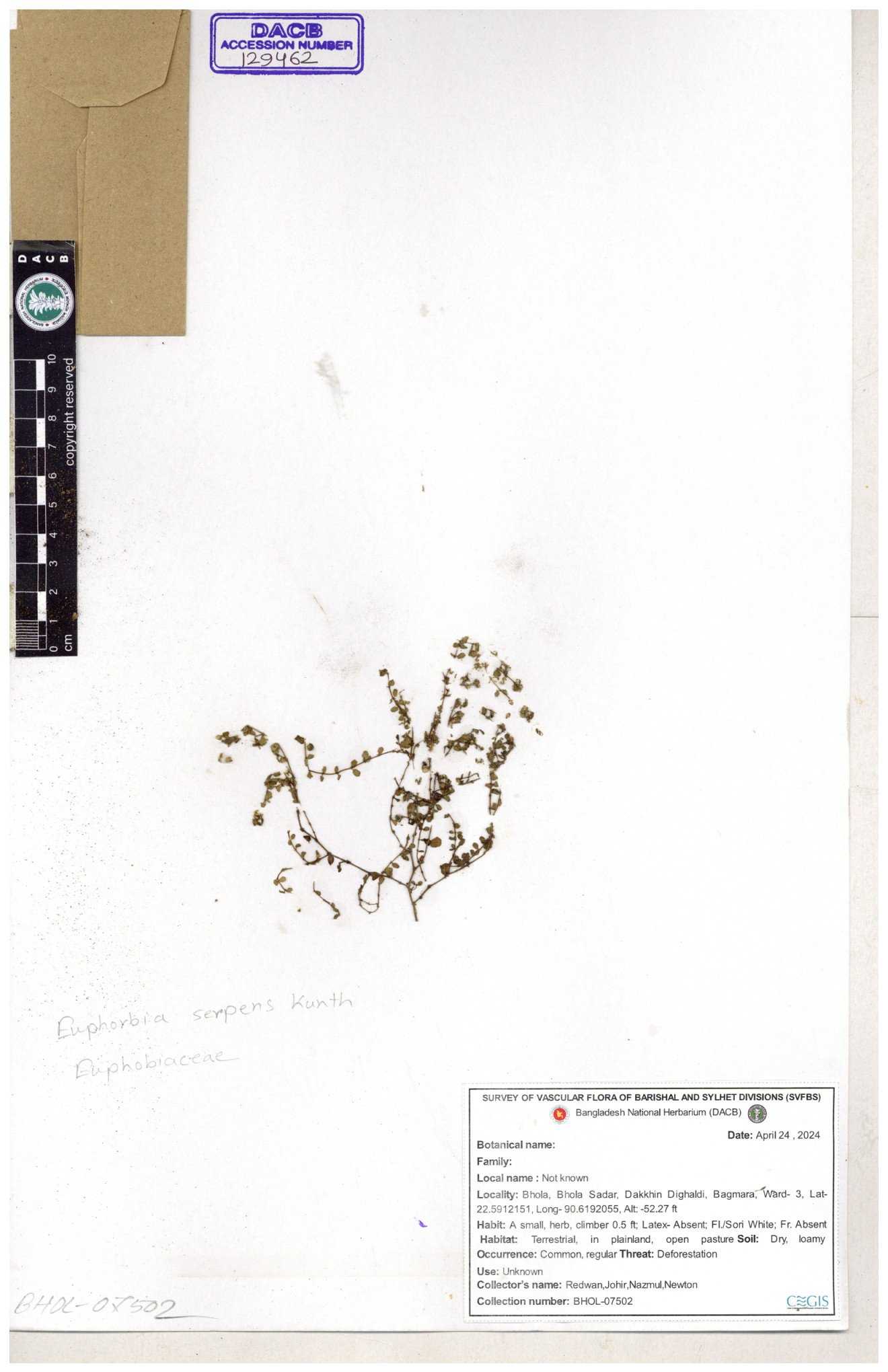 | 11623 | Euphorbiaceae | Euphorbia thymifolia L. | Huq, Mia & Mahbuba | H-6074 30-11--0001 |