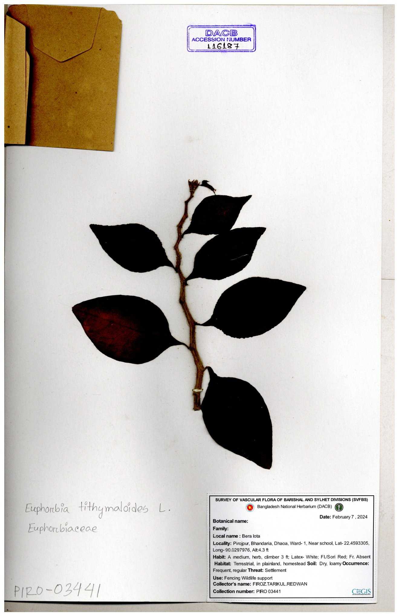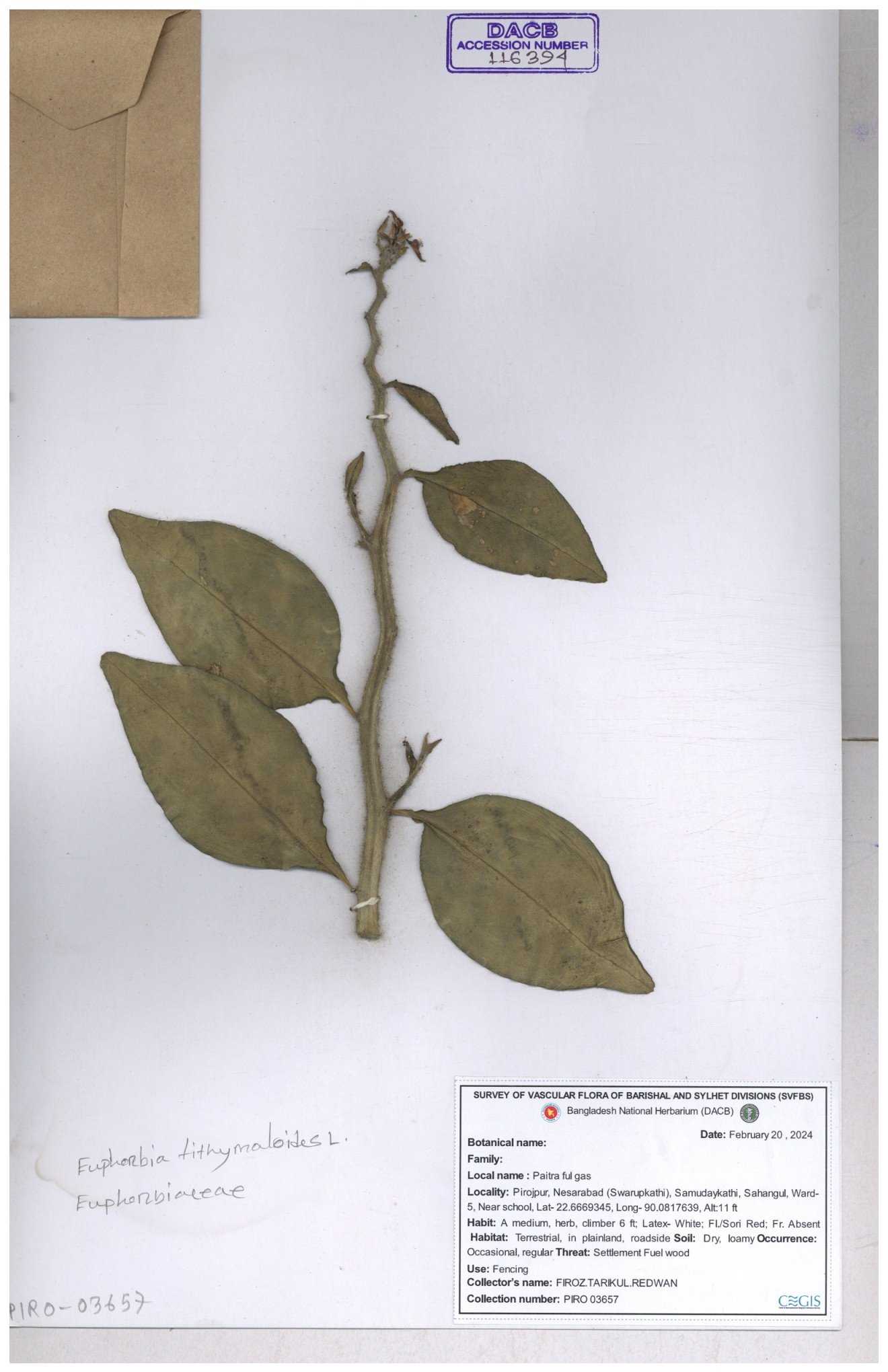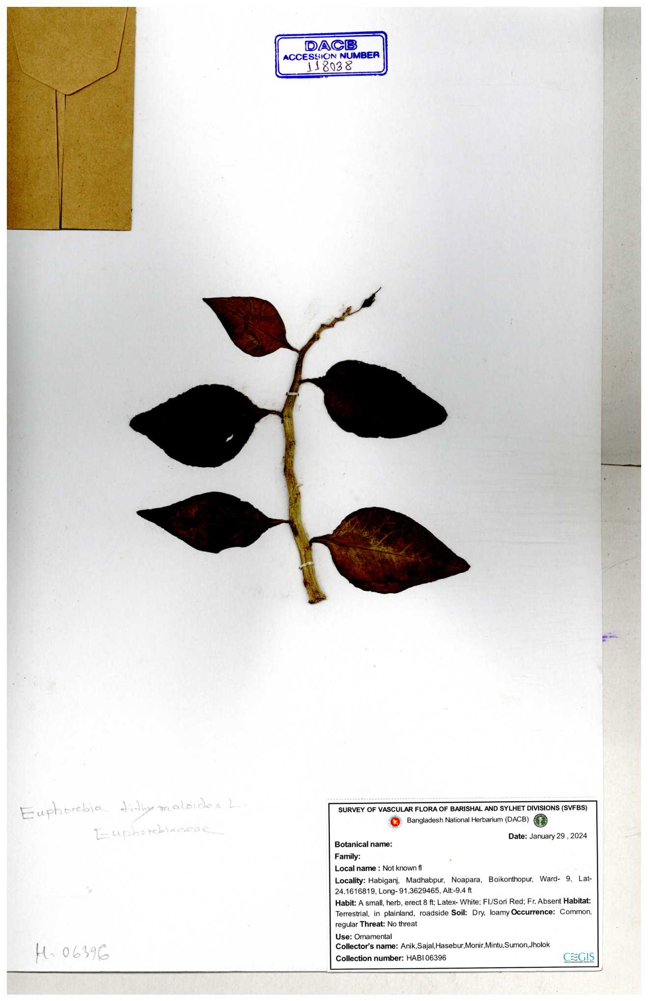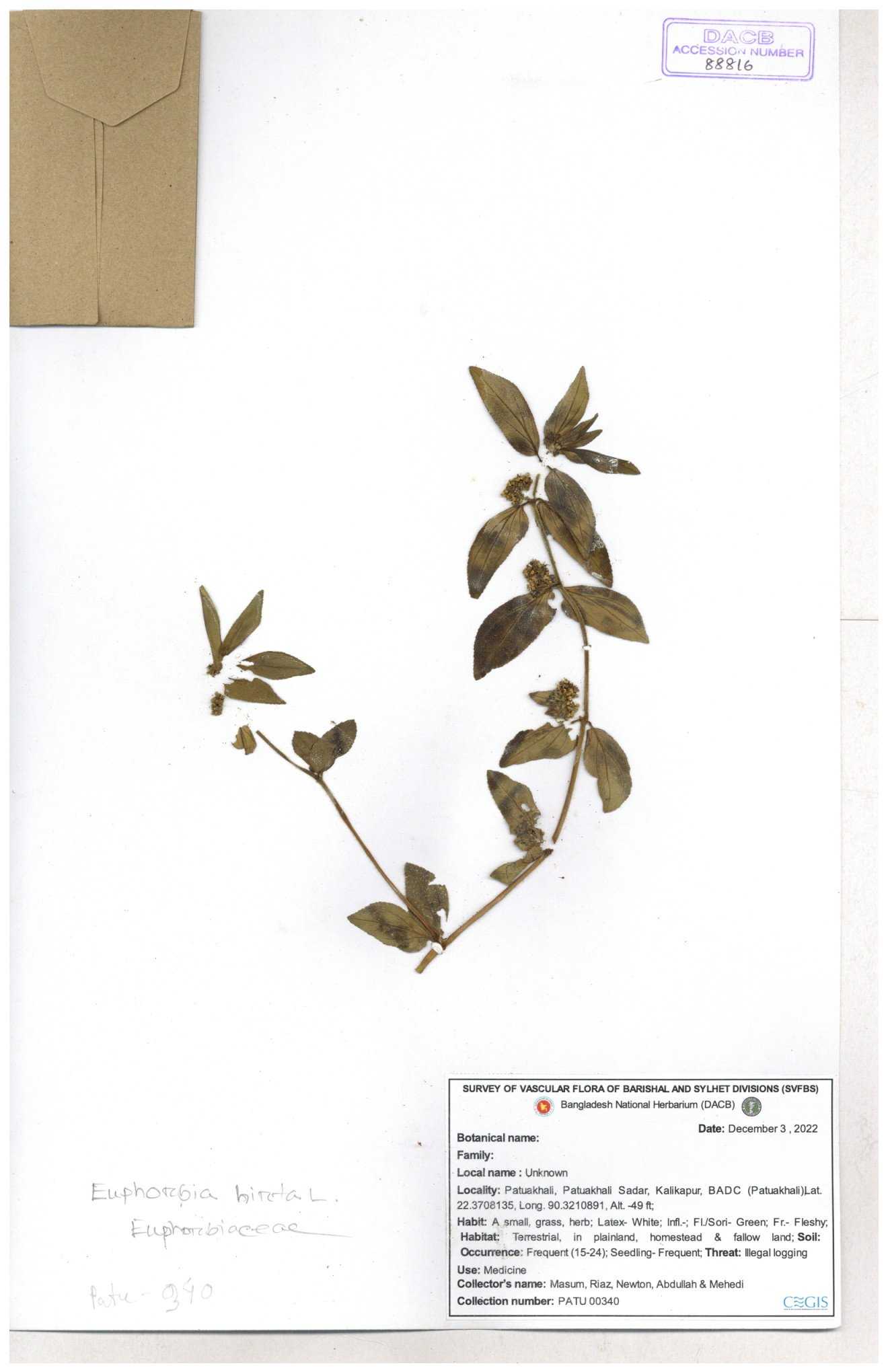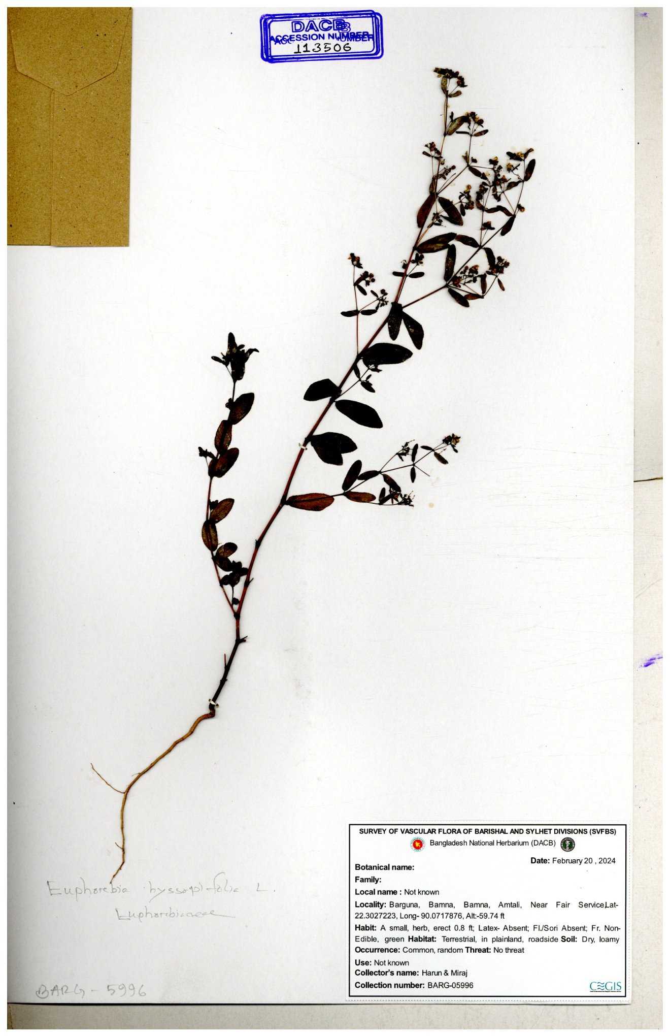 | 11623 | Euphorbiaceae | Euphorbia thymifolia L. | Huq, Mia & Mahbuba | H-6074 30-11--0001 |