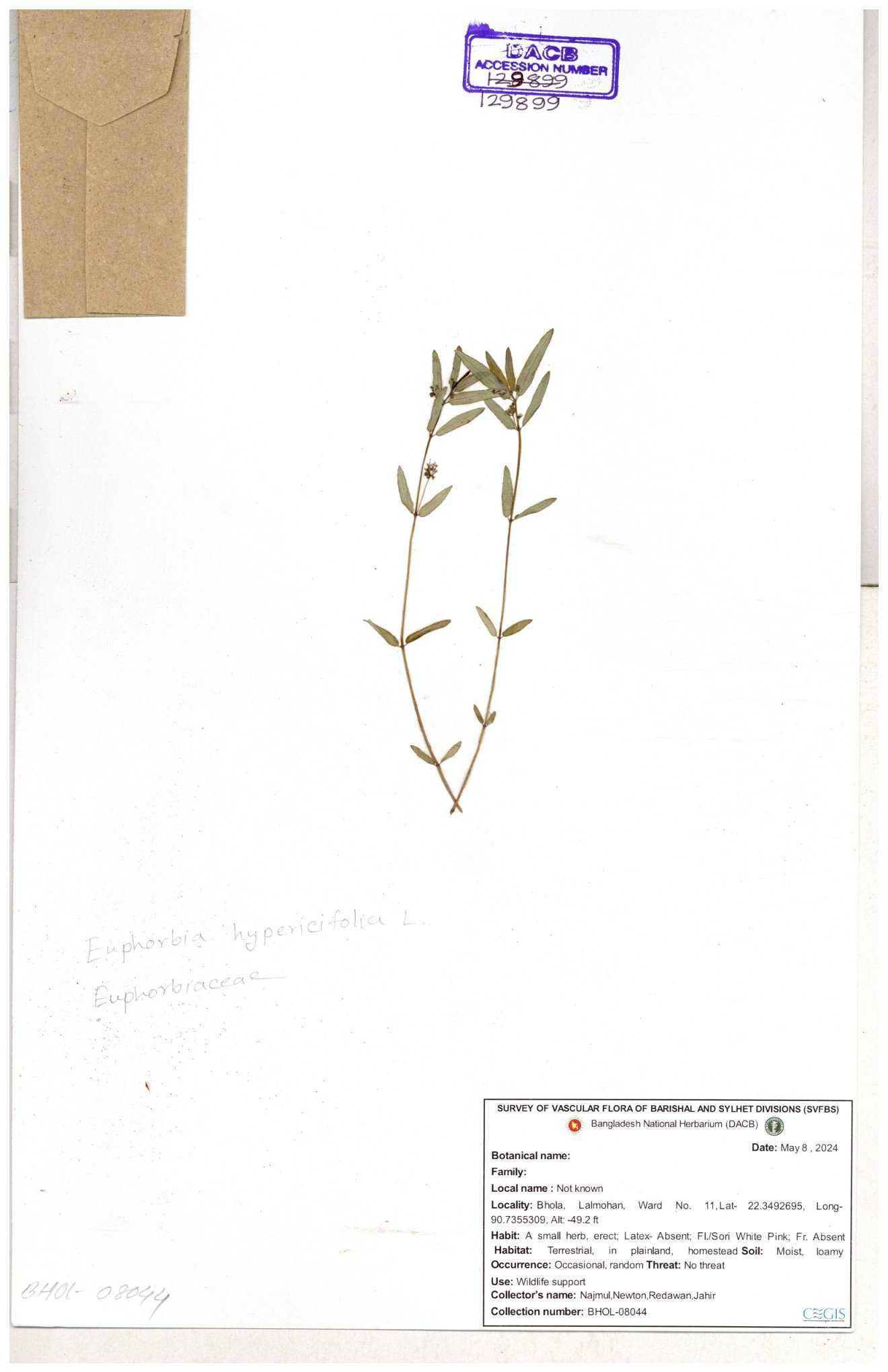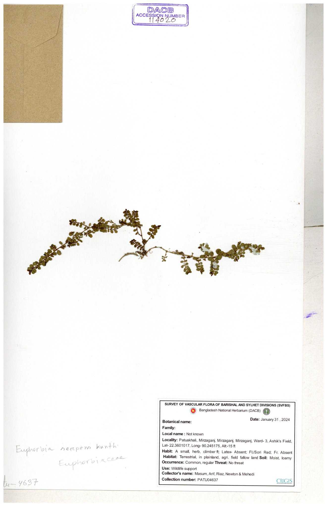 | 40142 | Euphorbiaceae | Euphorbia thymifolia L. | B.M. Rezia Khatun & Hosne Ara | RK-4363 04-09-2003 |