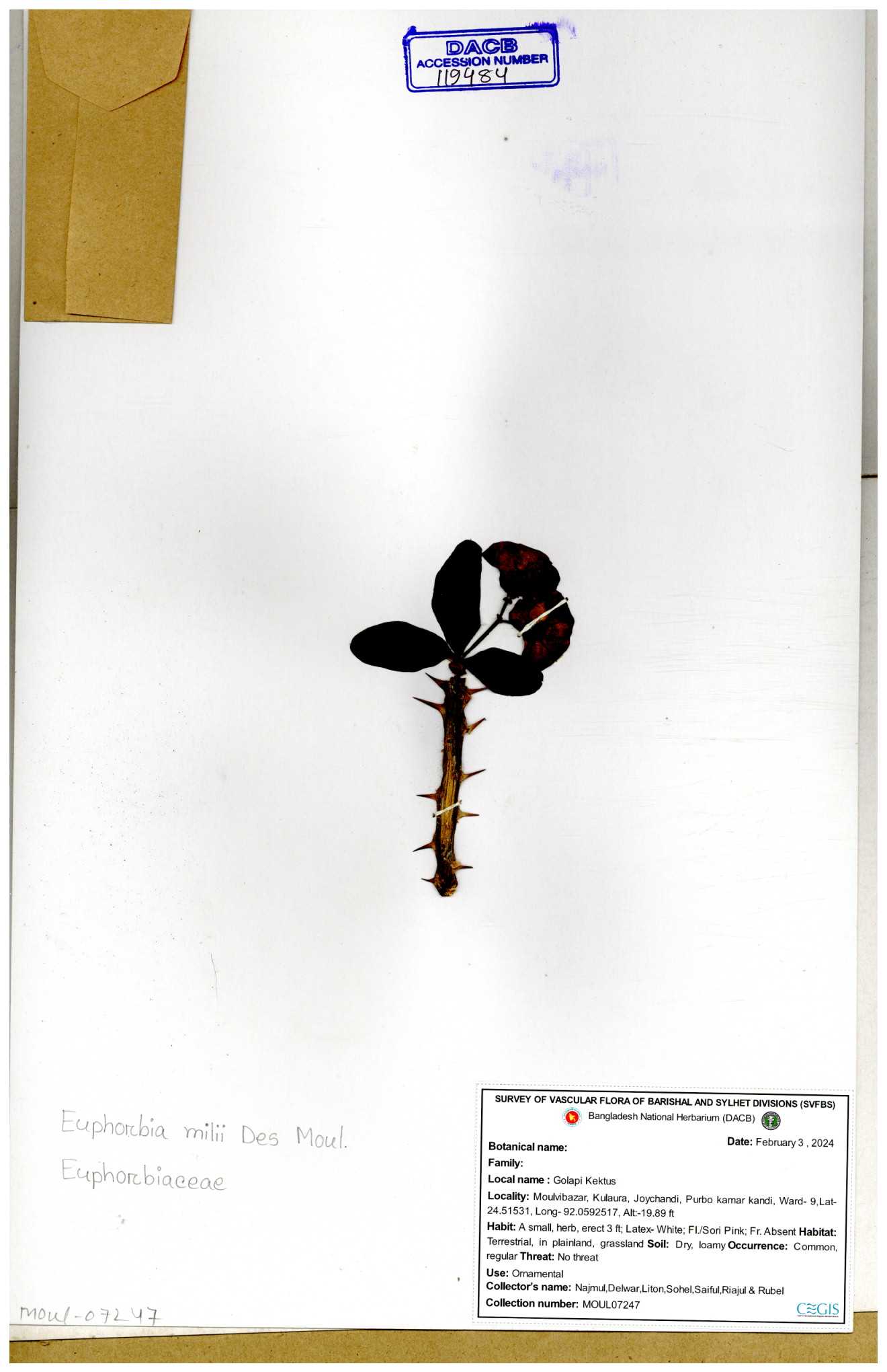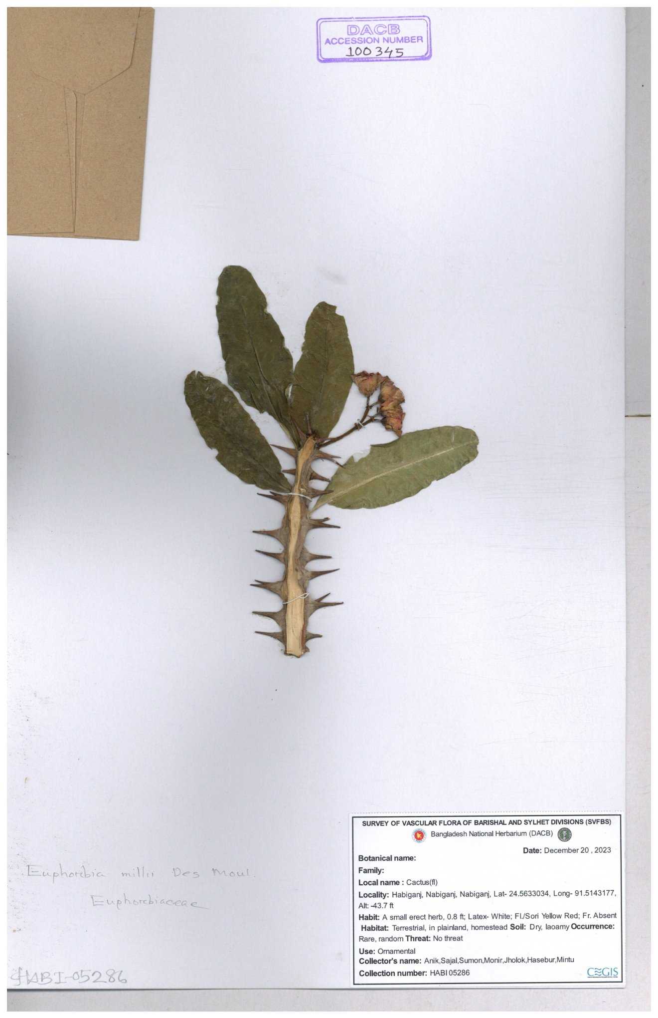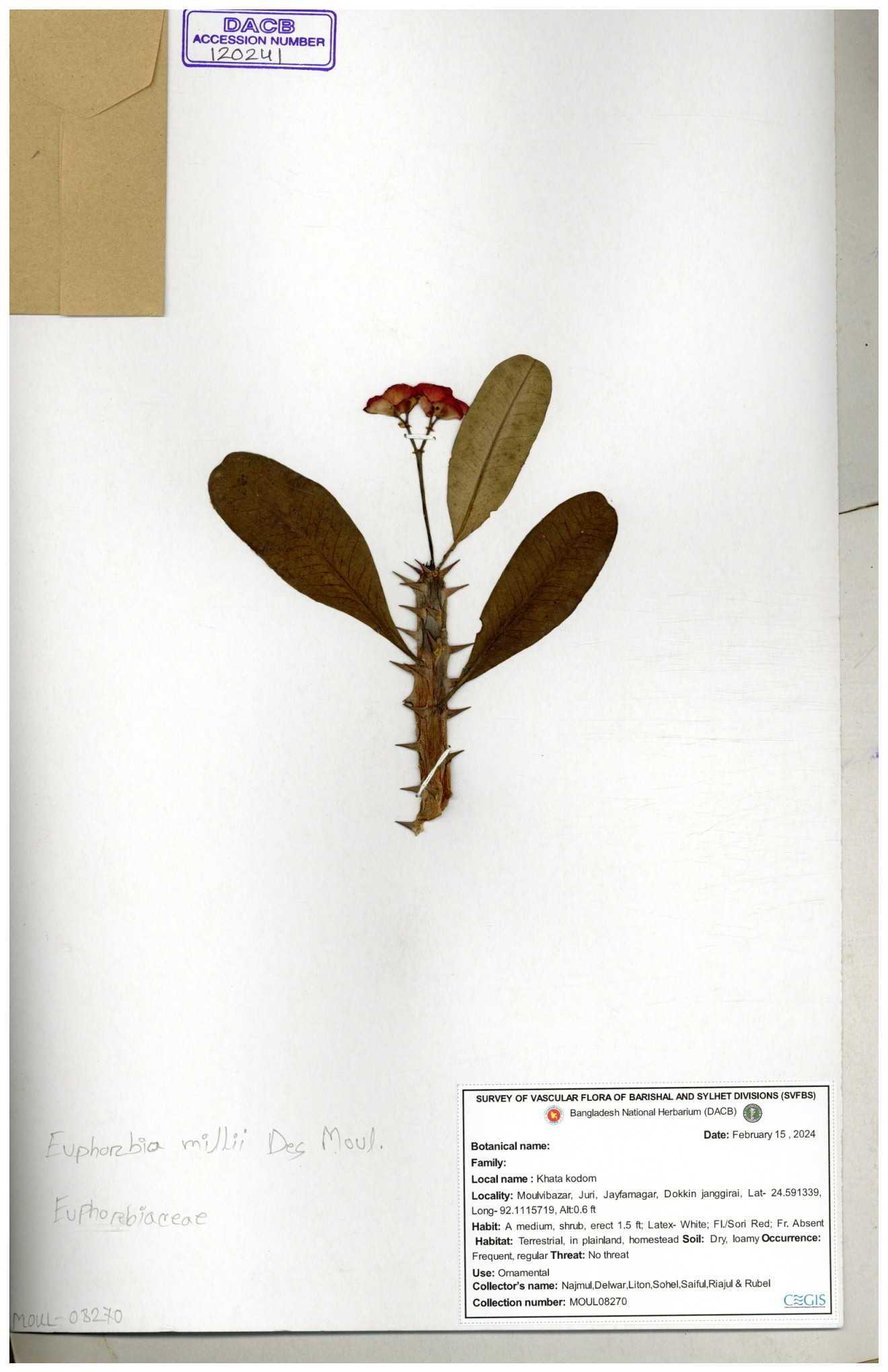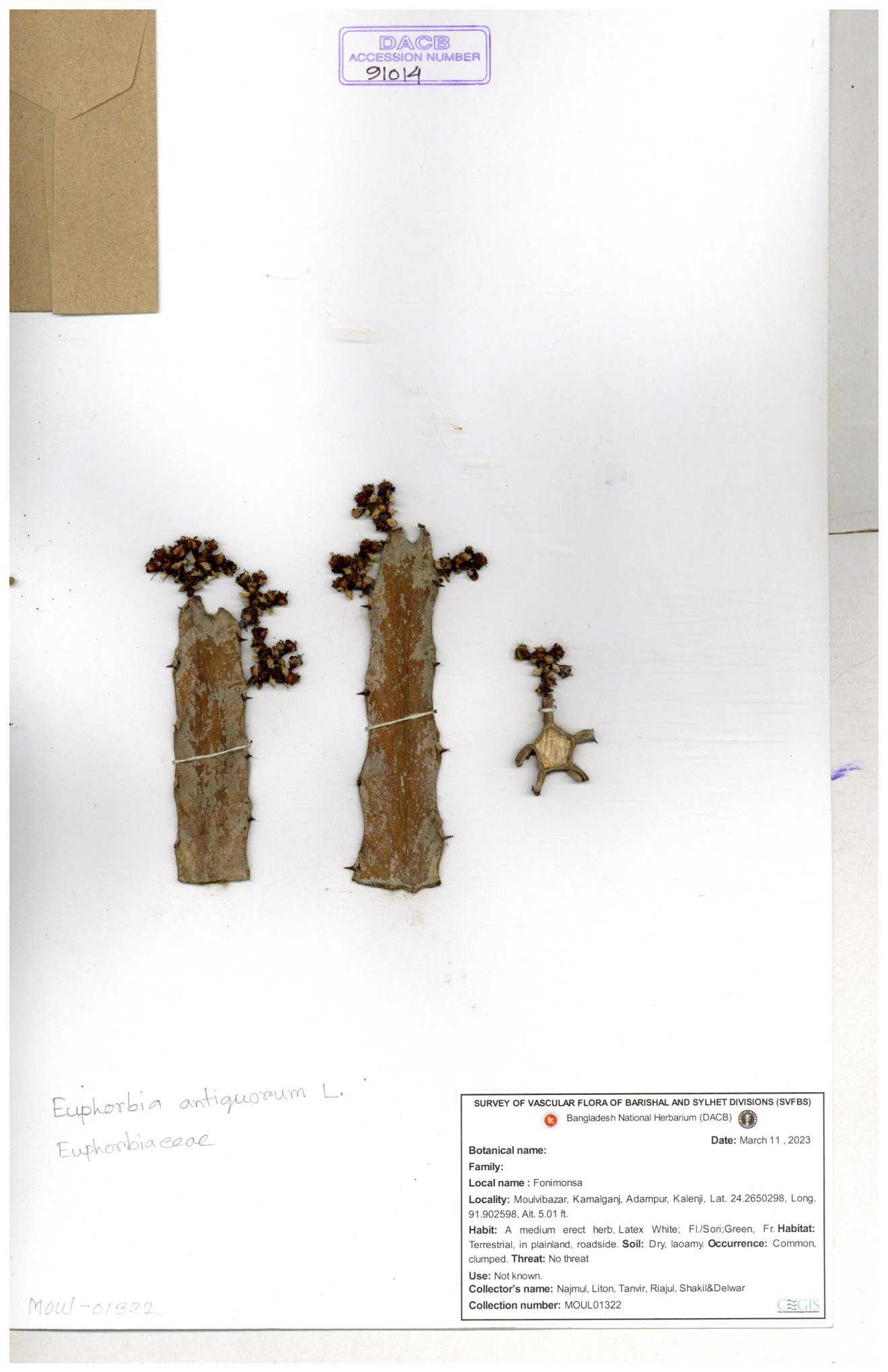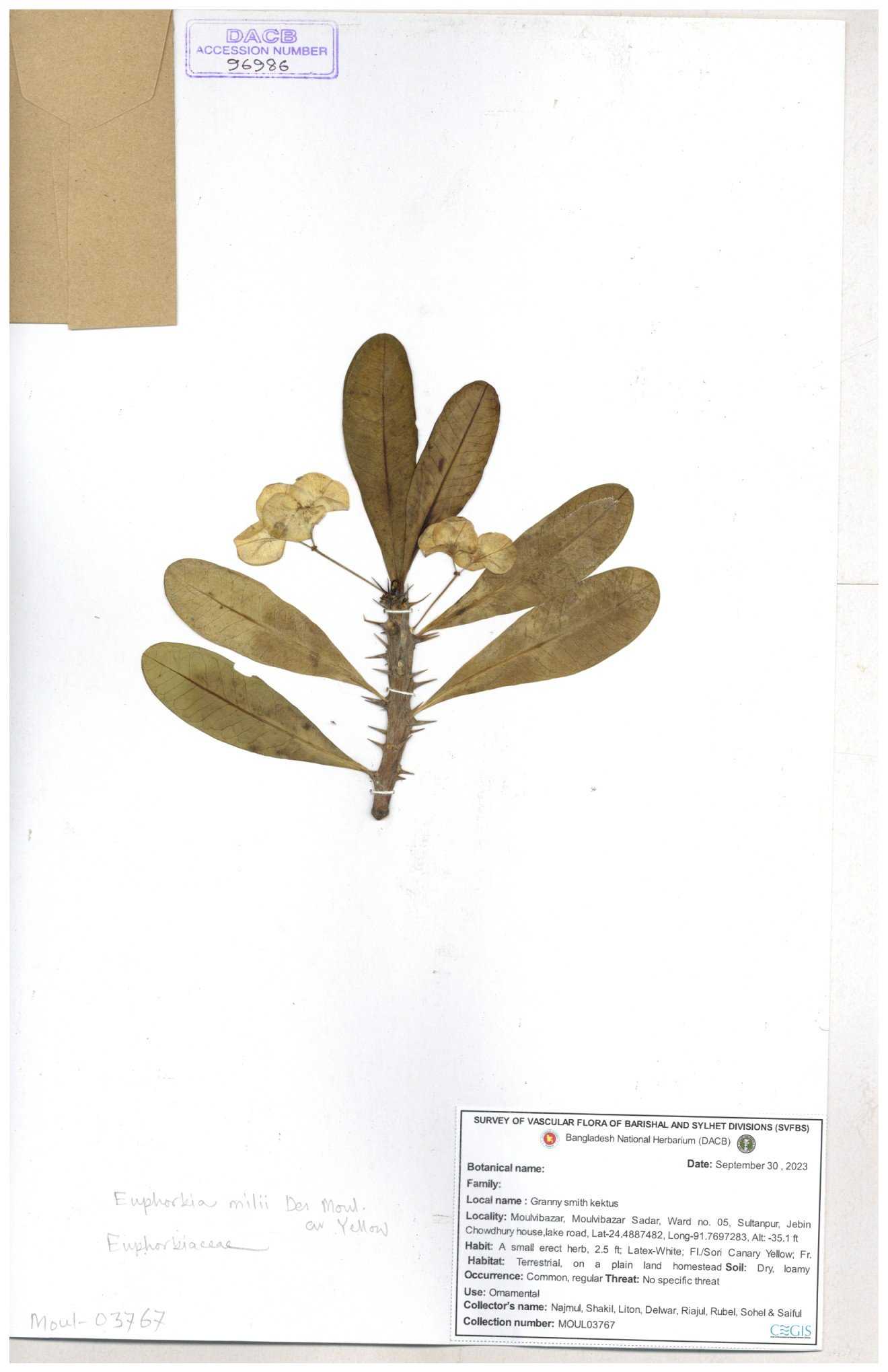 | 11460 | Euphorbiaceae | Euphorbia antiquorum L. | Huq & Rahman & Mia | H-6622 30-11--0001 |