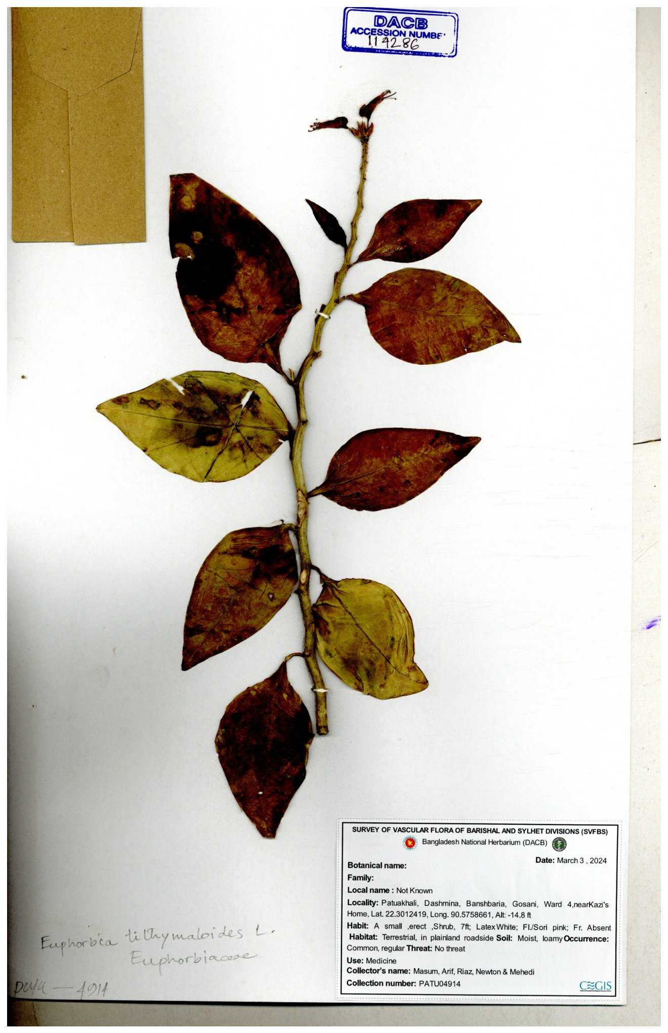 | 11602 | Euphorbiaceae | Euphorbia thymifolia L. | Mia, Huq & Rahman | M-376 30-11--0001 |