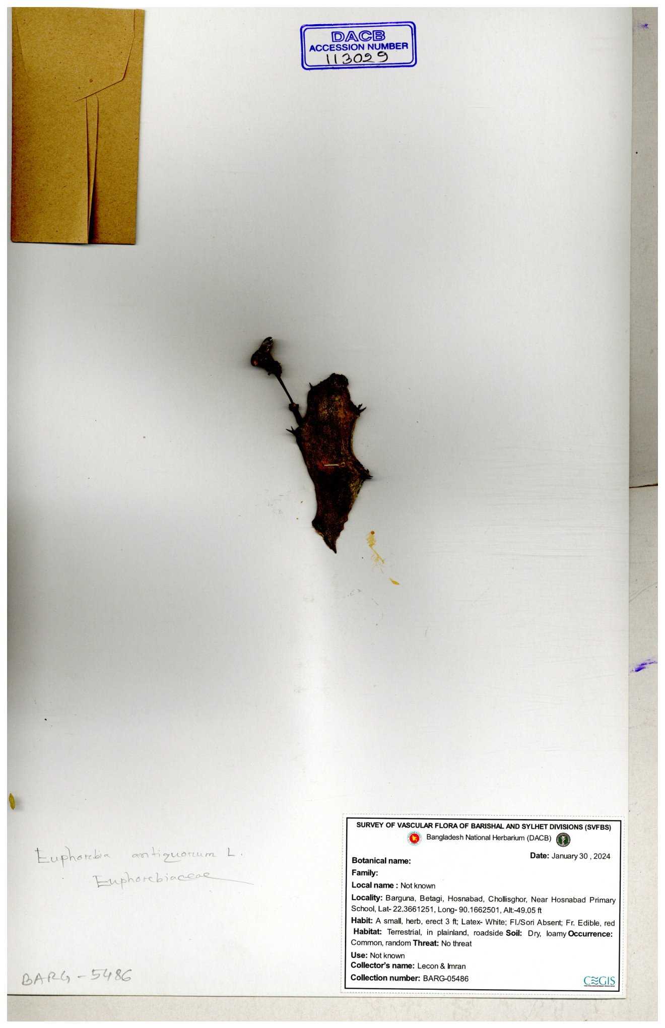 | 11462 | Euphorbiaceae | Euphorbia antiquorum L. | Mahbuba Halim | 686 30-11--0001 |