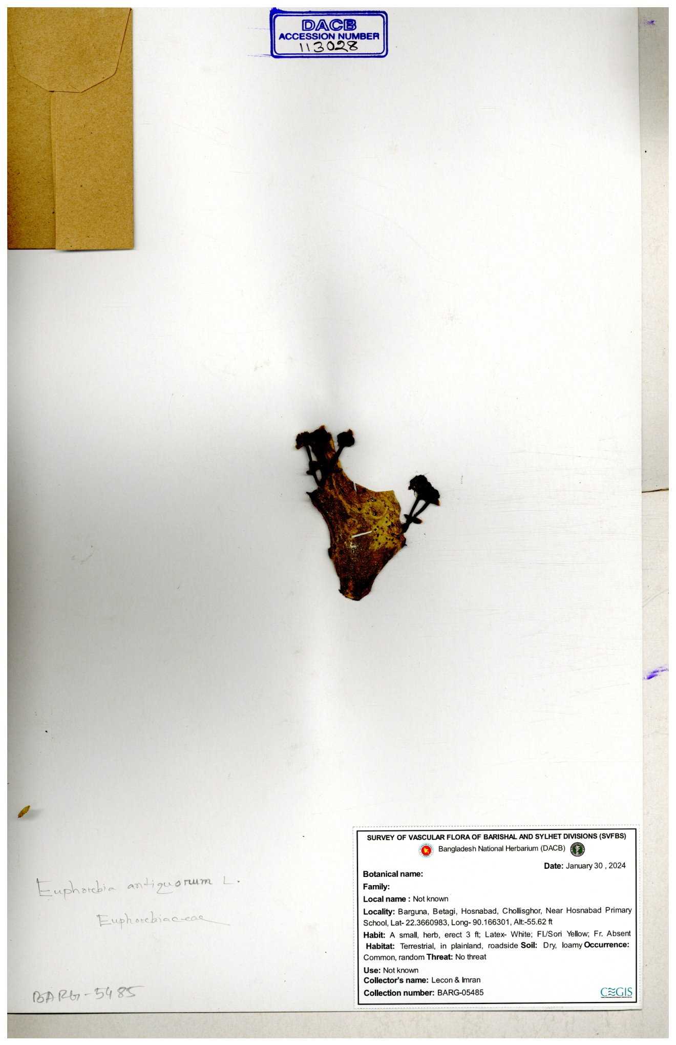 | 11467 | Euphorbiaceae | Euphorbia dracunculoides Lauk. | Huq, Rahman & Mia | H-1816 01-02-1976 |