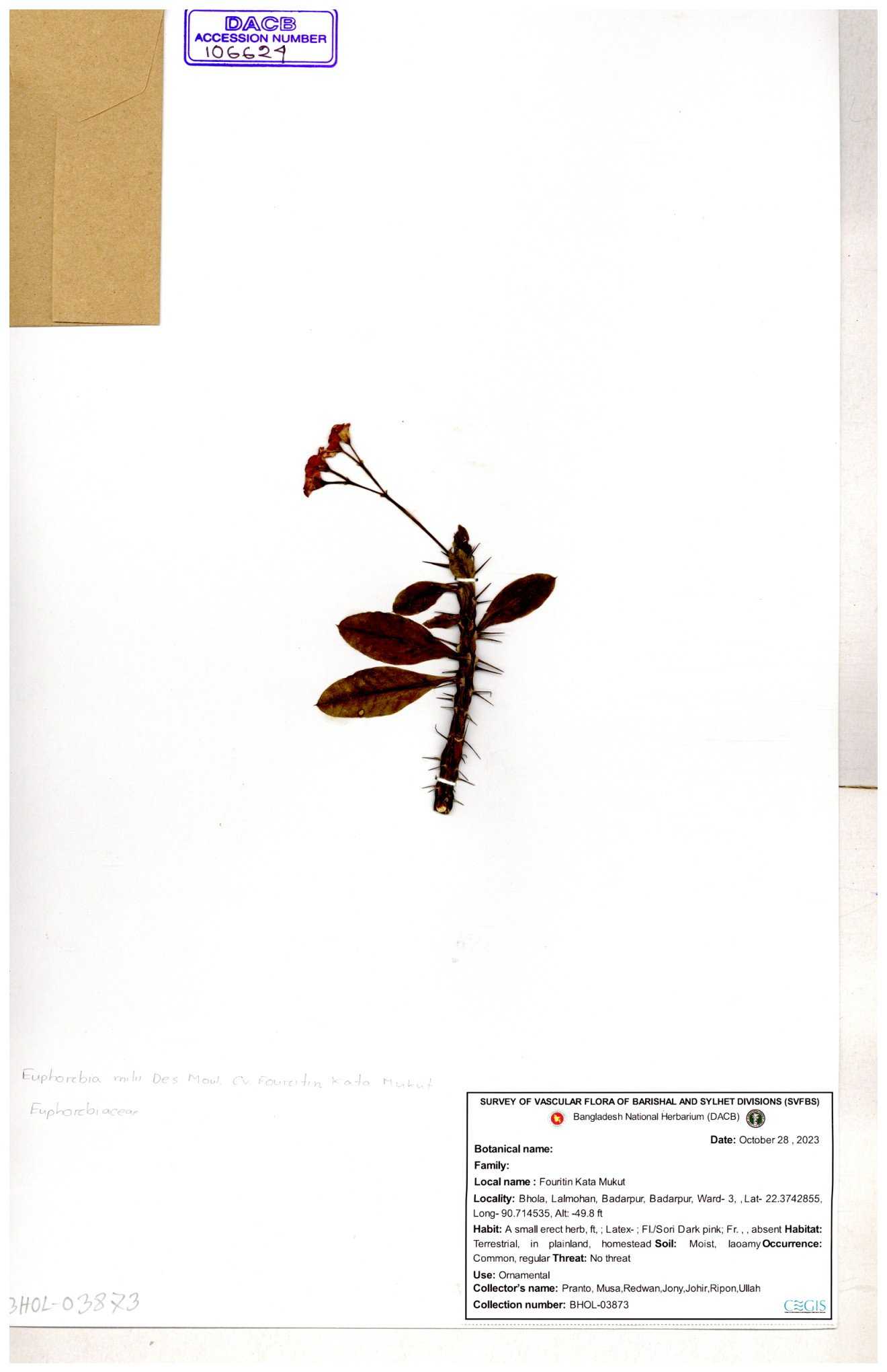| 11461 | Euphorbiaceae | Euphorbia antiquorum L. | Huq & Rahman & Mia | H-6622 30-11--0001 |