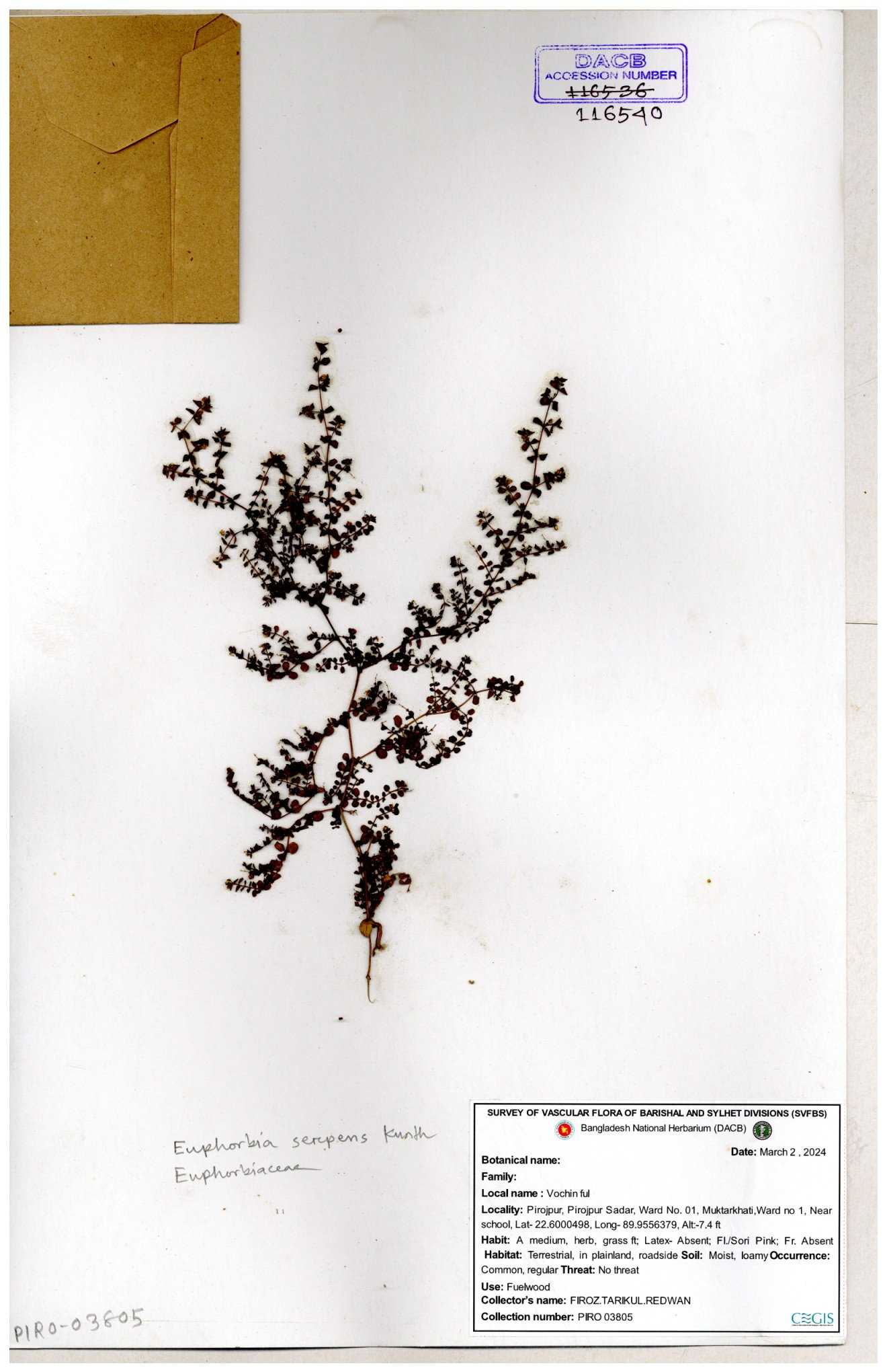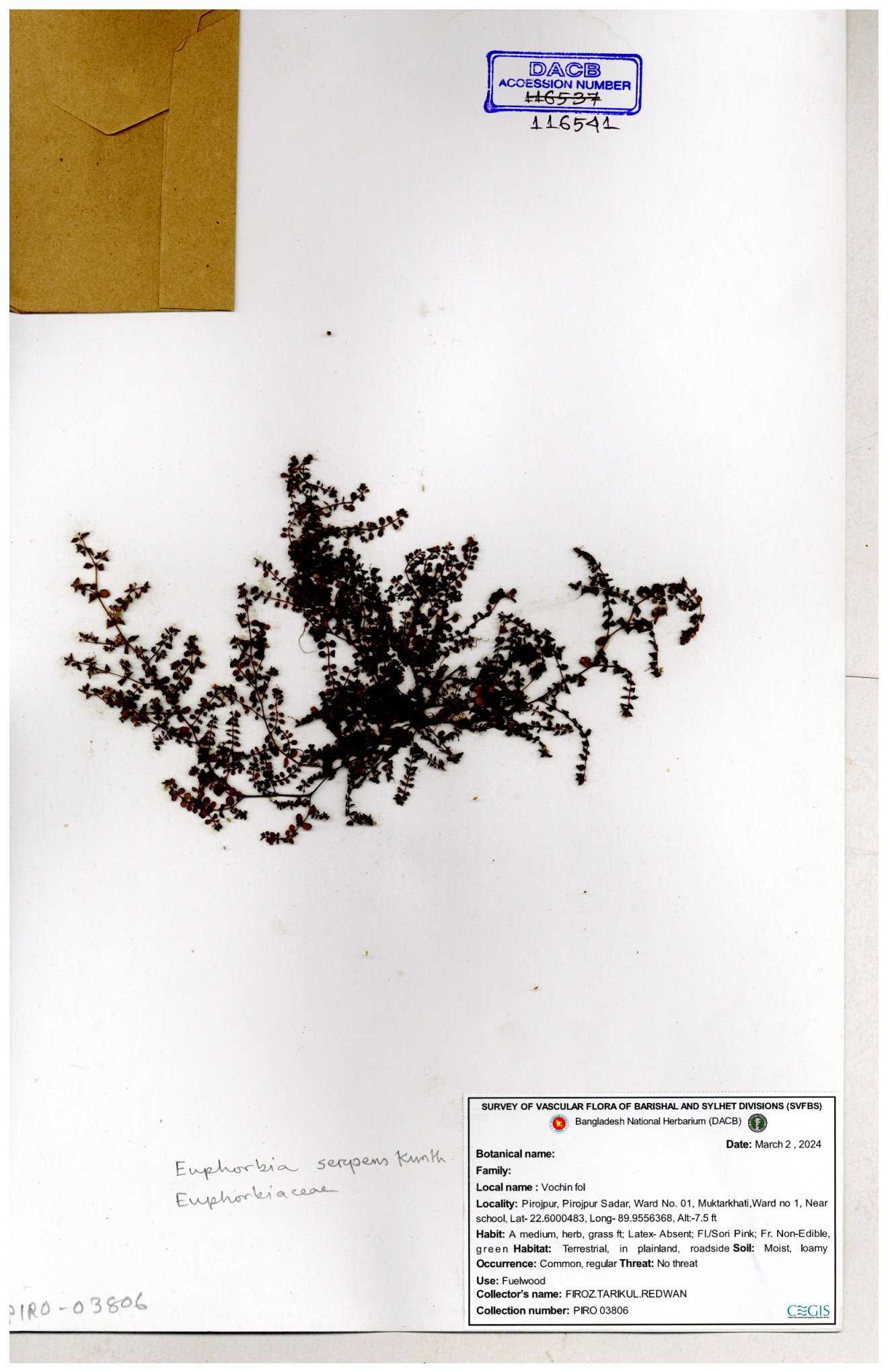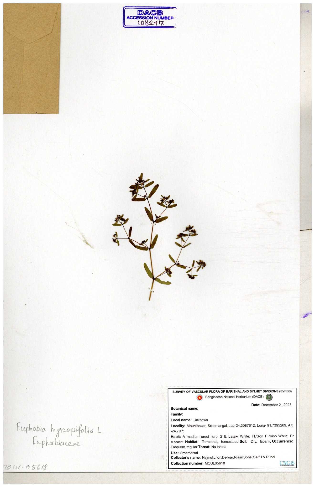| 86382 | Euphorbiaceae | Euphorbia thymifolia (L.) | Choto keru | Dr. M. Sultana | DMS-4605 25-05-2022 |