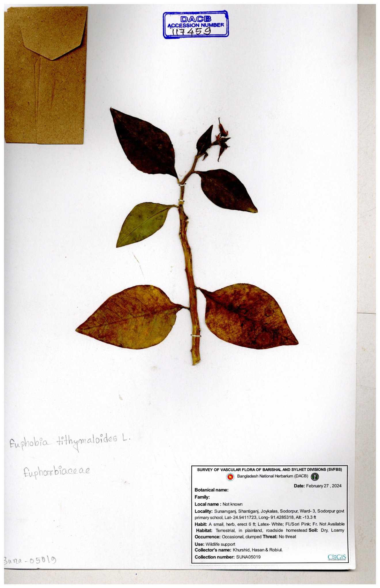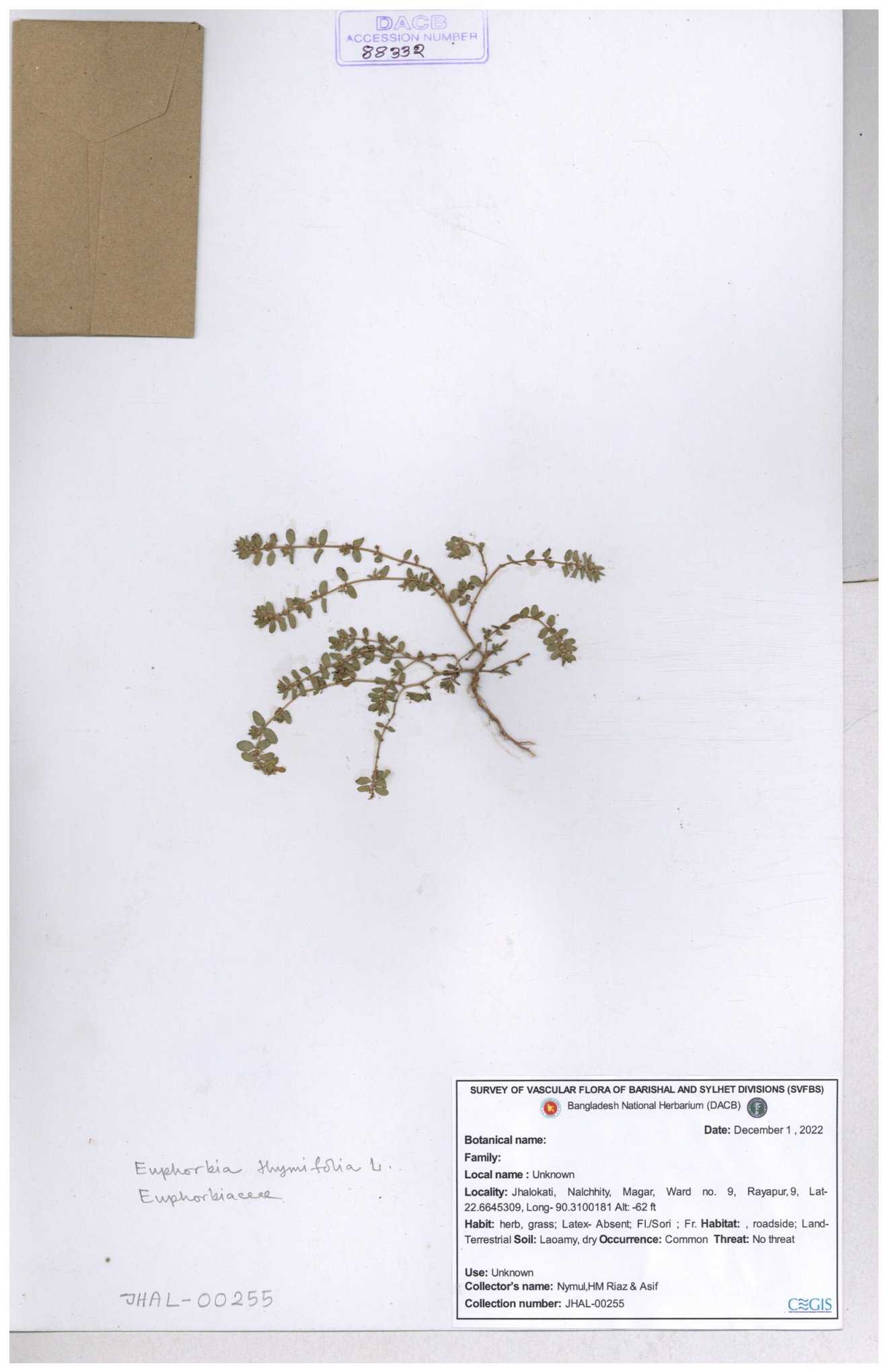 | 77300 | Euphorbiaceae | Euphorbia thymifolia L. | Joyanta, Mominur, Kamrul & Suborno. | JCR-6188 08-06-2017 |