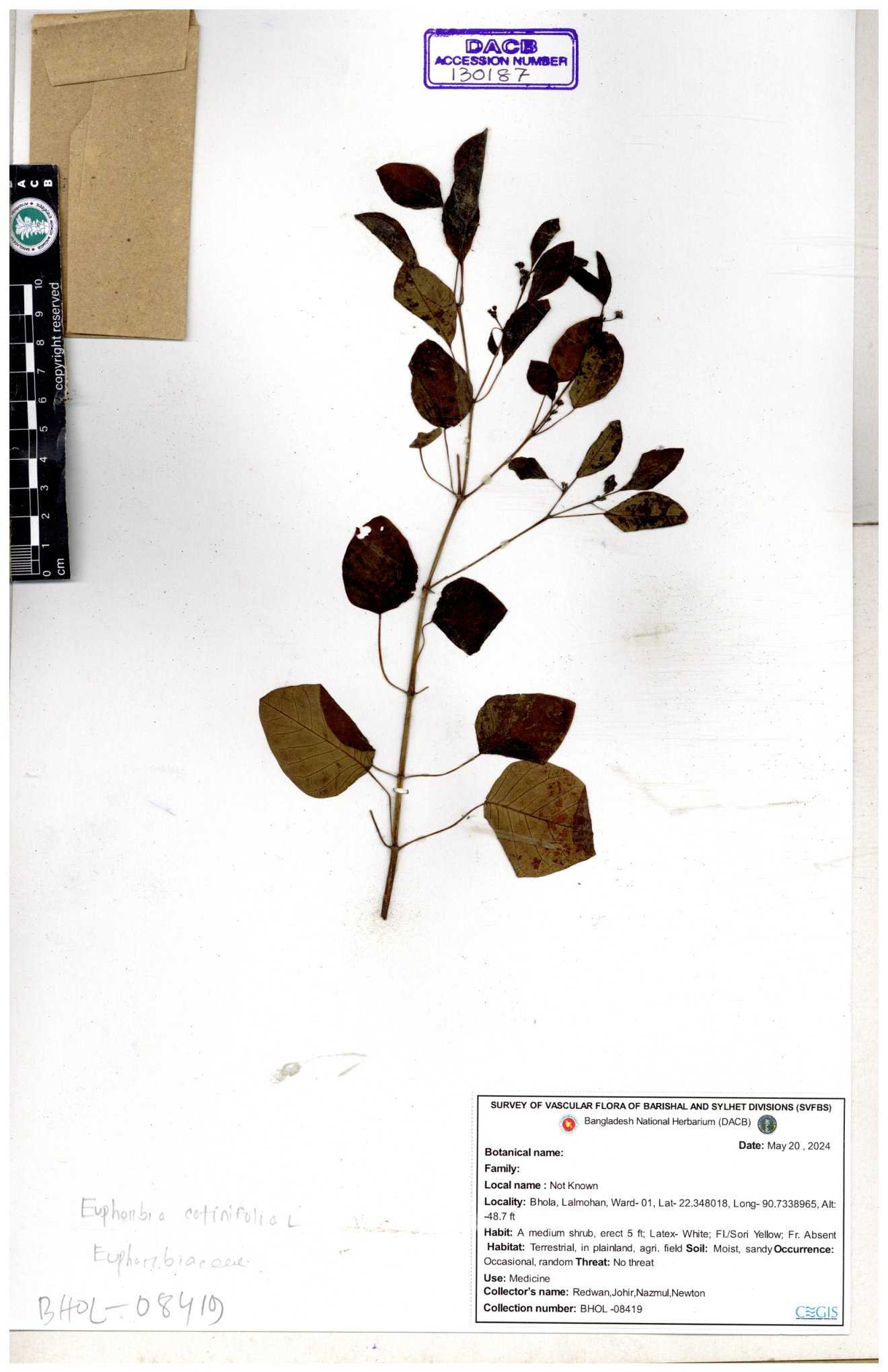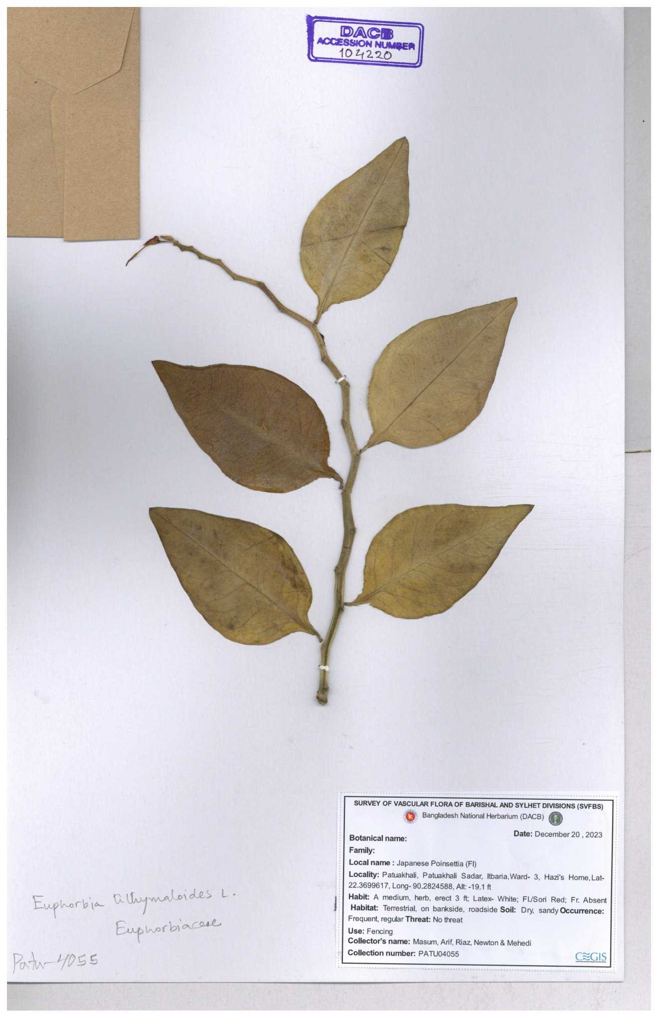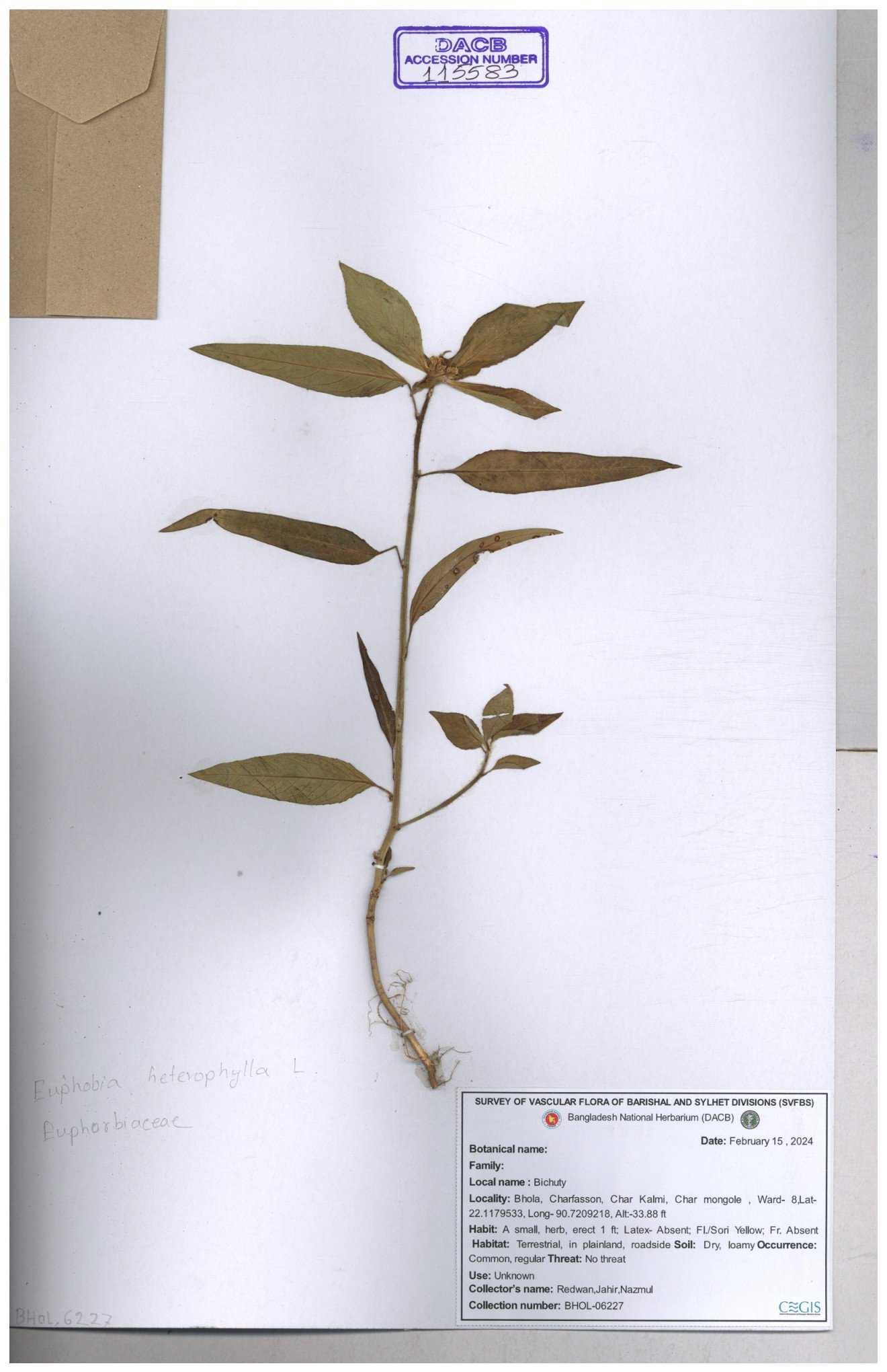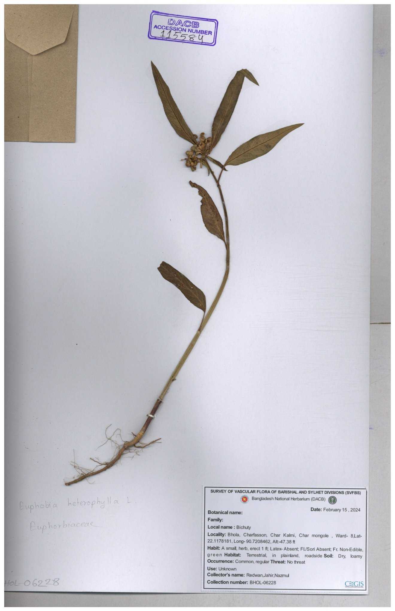 | 11483 | Euphorbiaceae | Euphorbia heterophylla L. | Momtaz Begum. | 205 30-11--0001 |