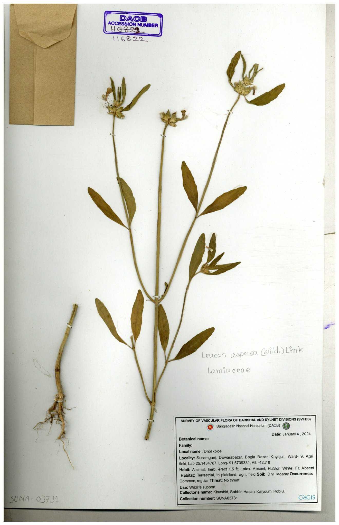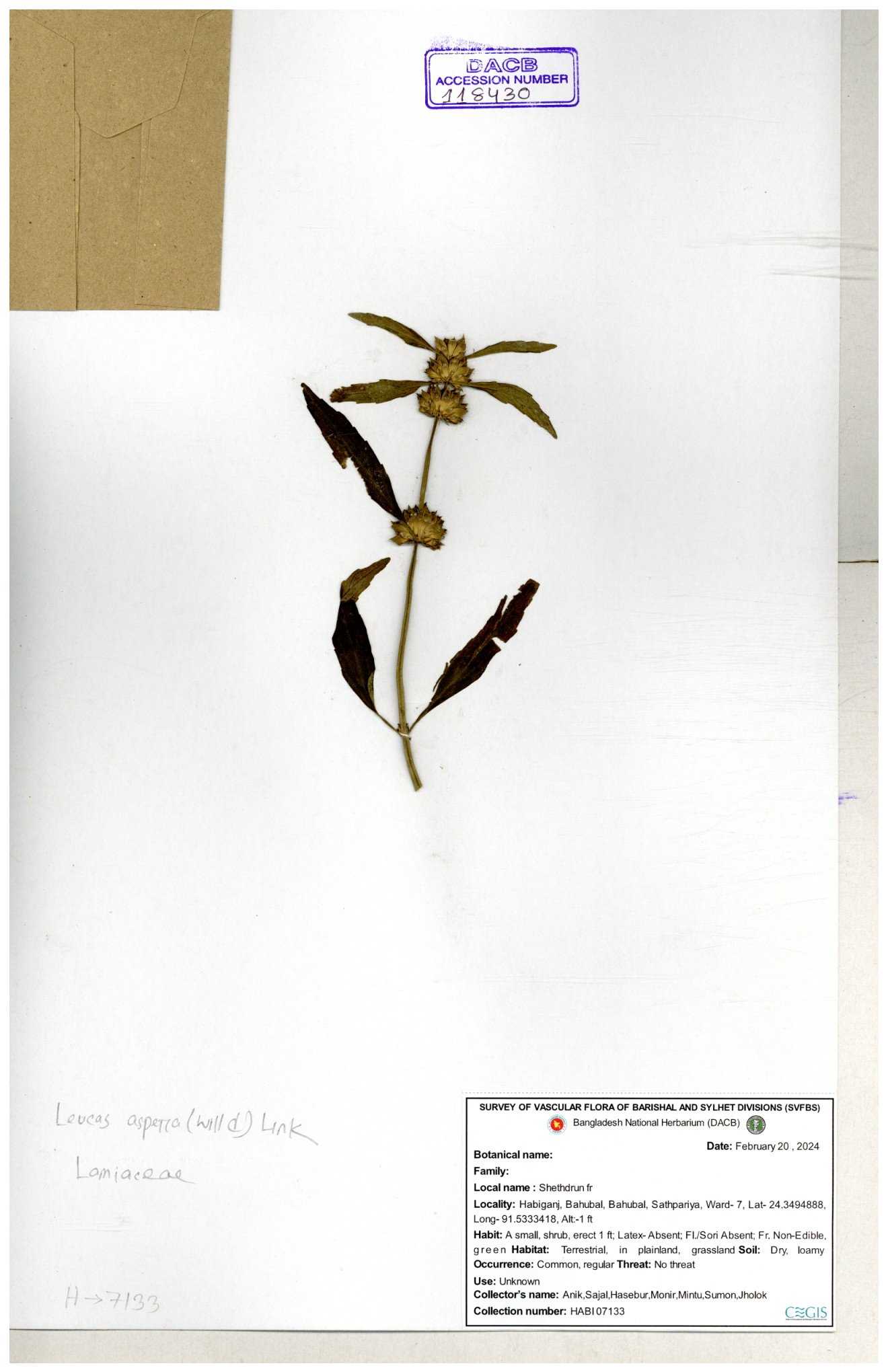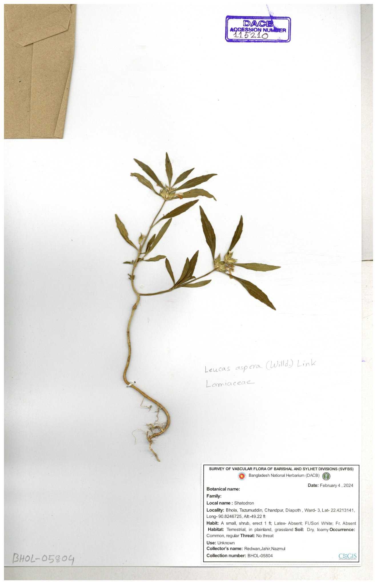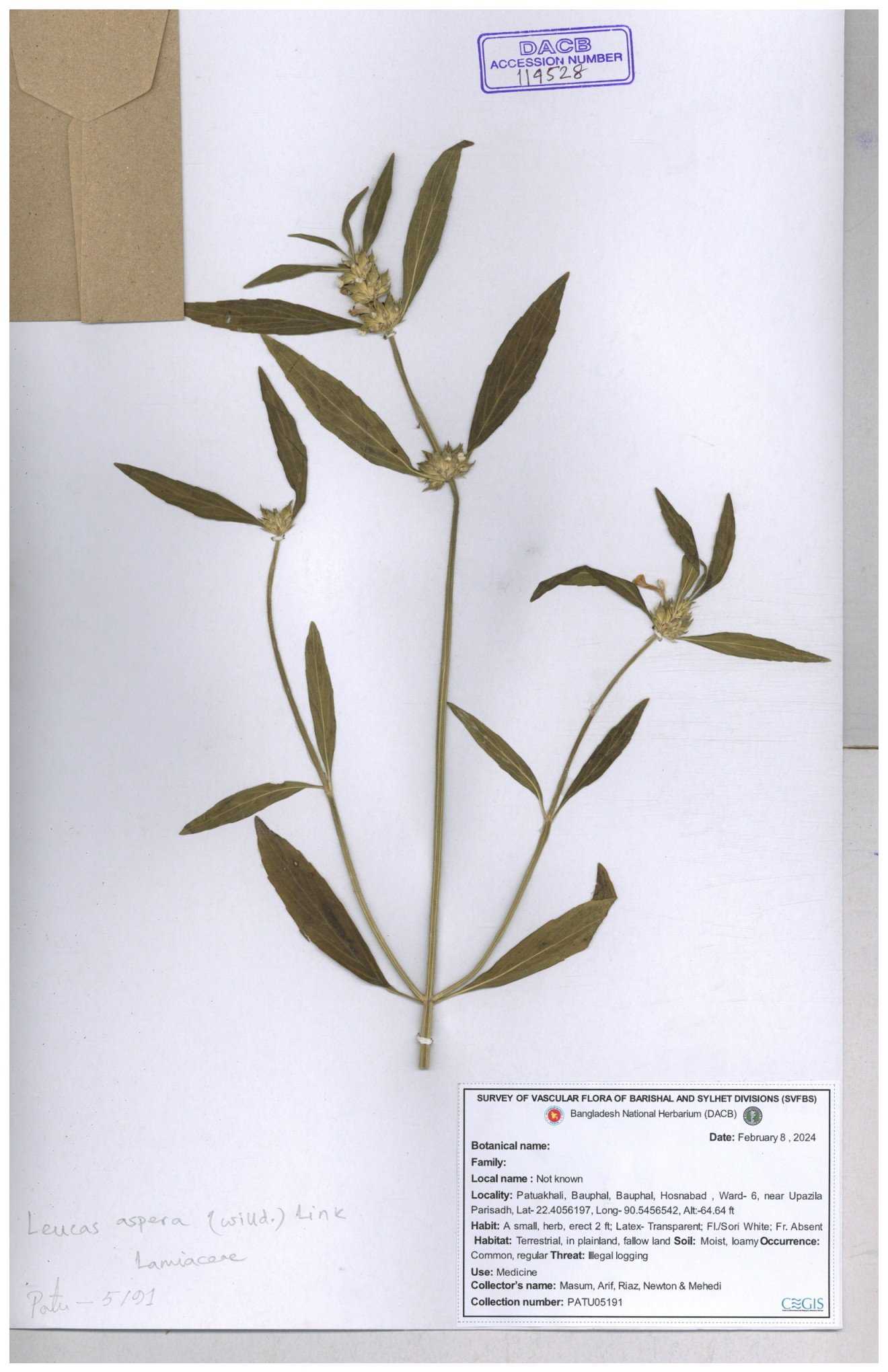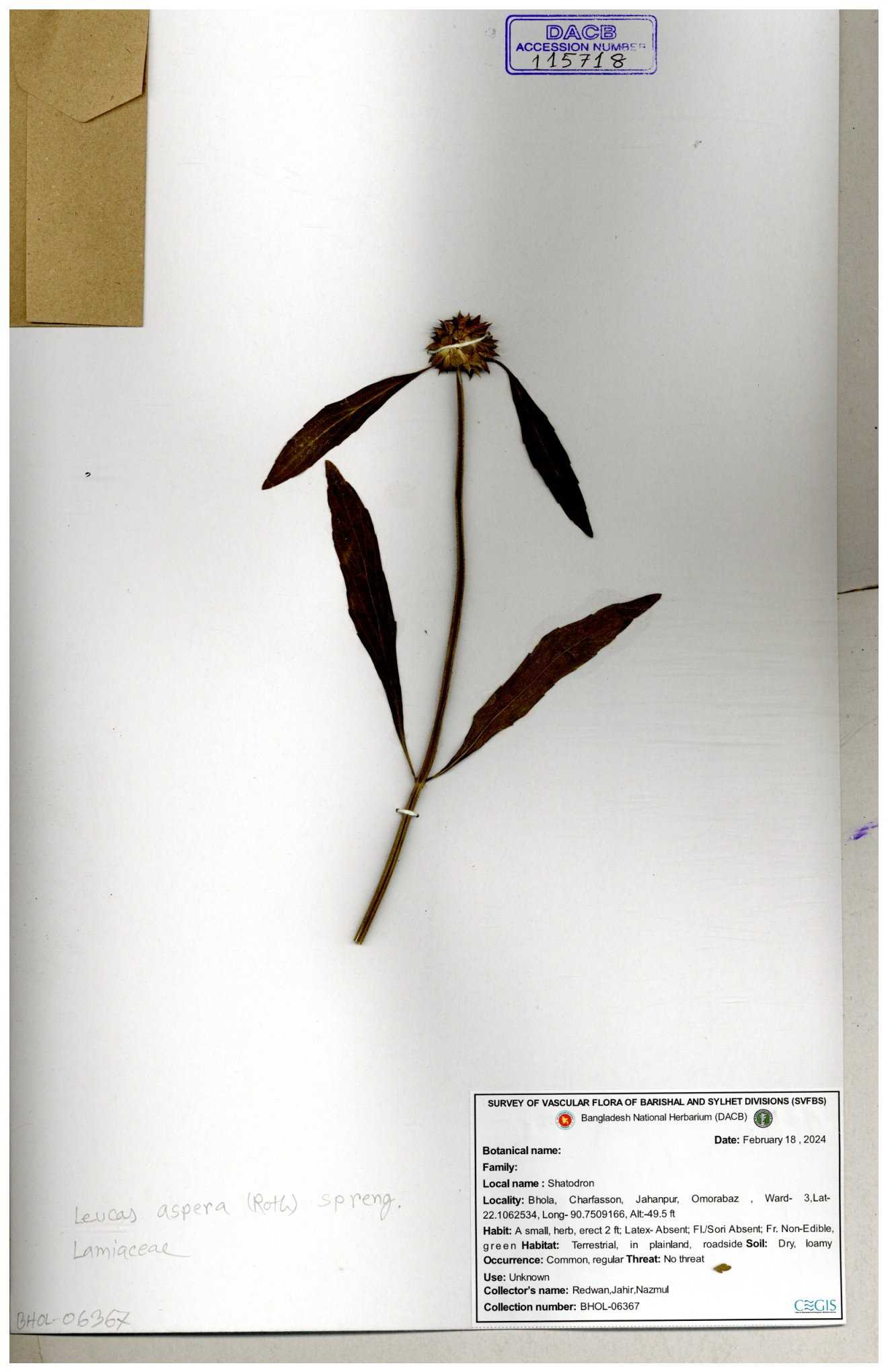 | 65959 | Lamiaceae | Leucas zeylanica (L.) W.T.Aiton | Domkolos | Khandakar Kamrul Islam | KKI-4020 12-02-2020 |