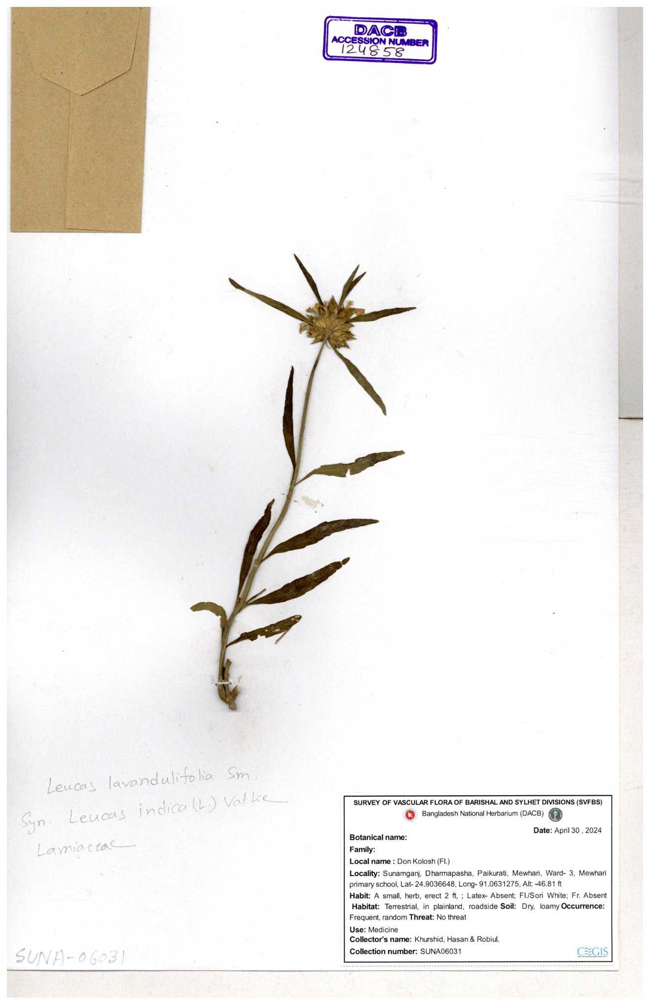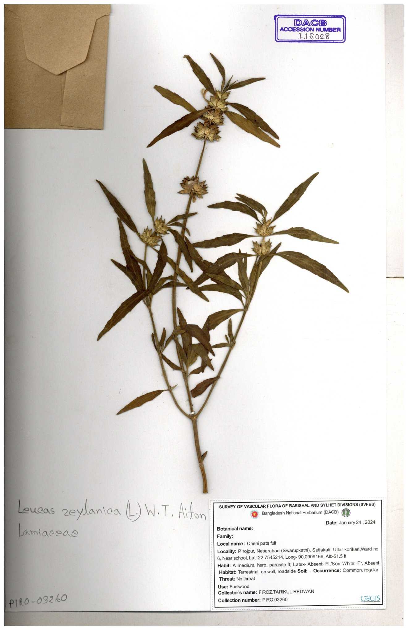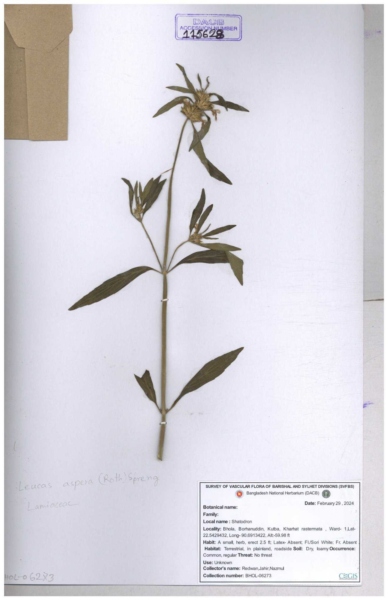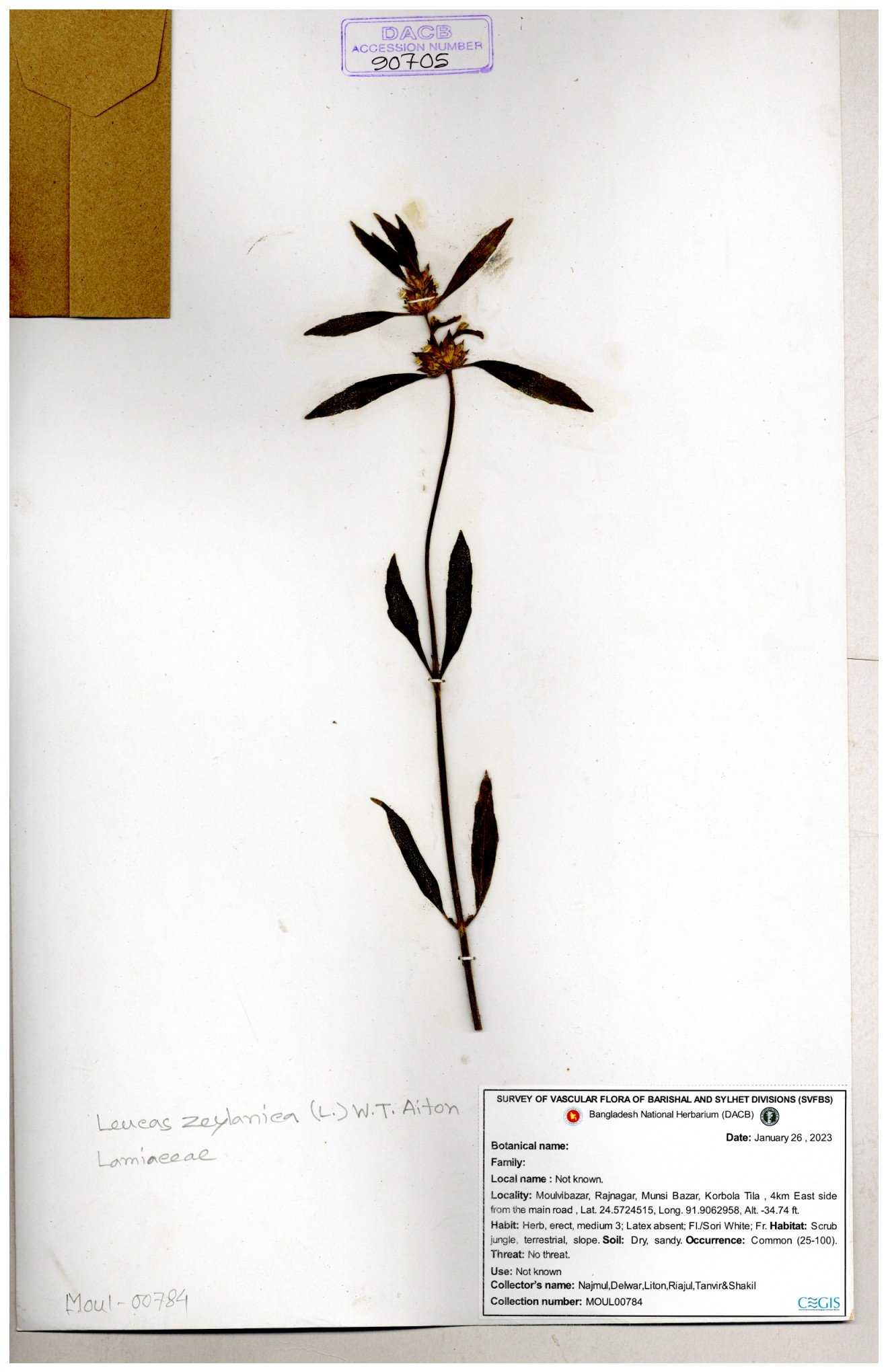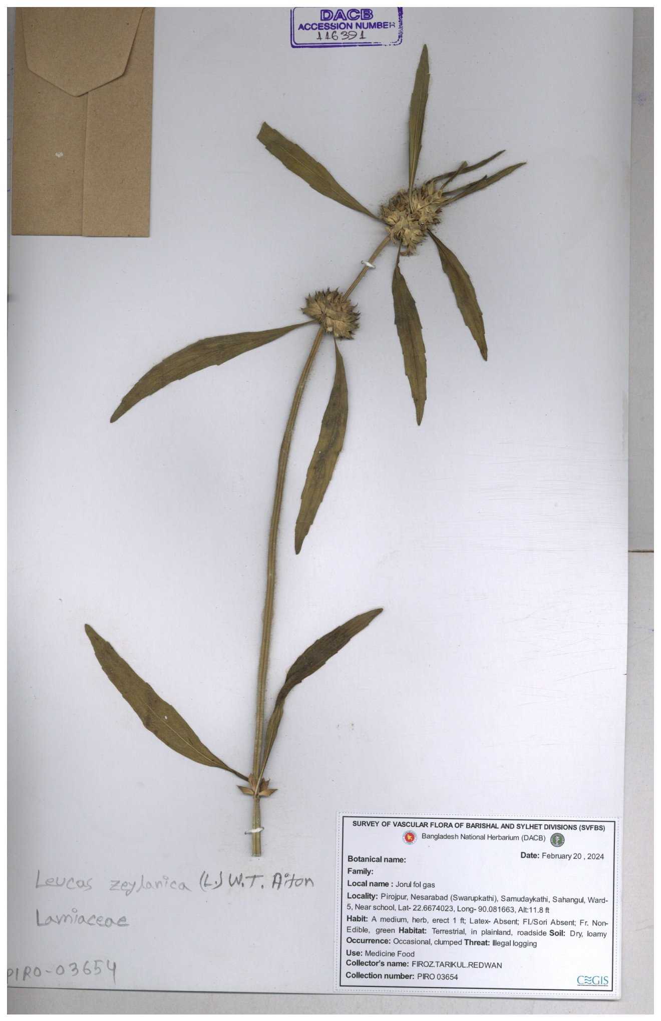 | 65959 | Lamiaceae | Leucas zeylanica (L.) W.T.Aiton | Domkolos | Khandakar Kamrul Islam | KKI-4020 12-02-2020 |