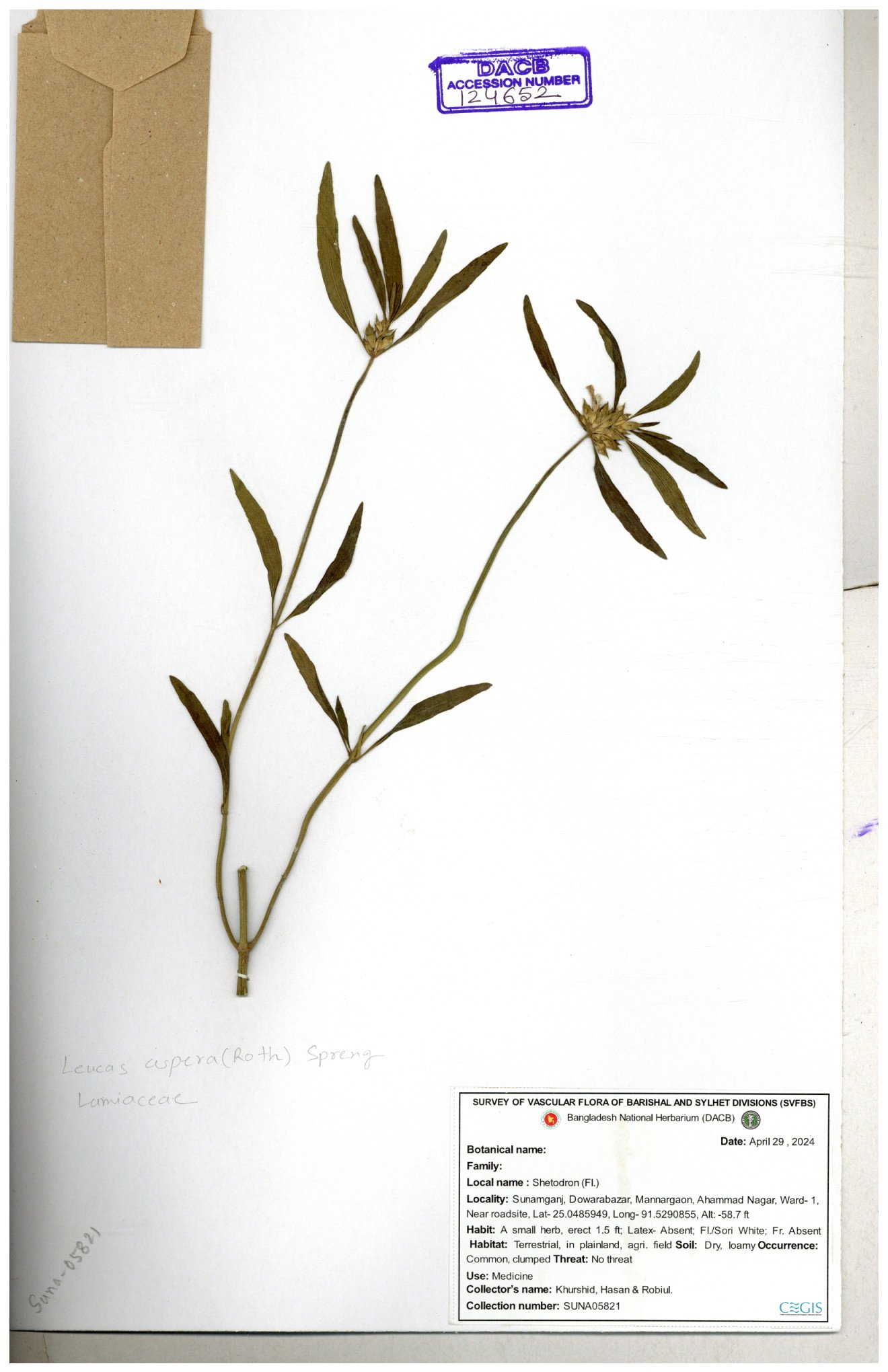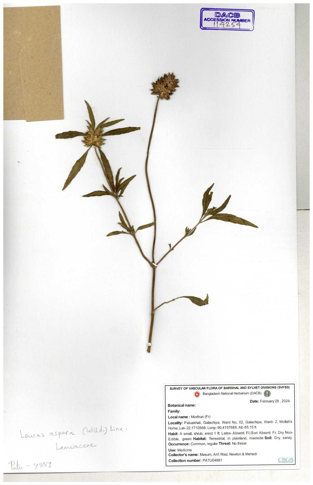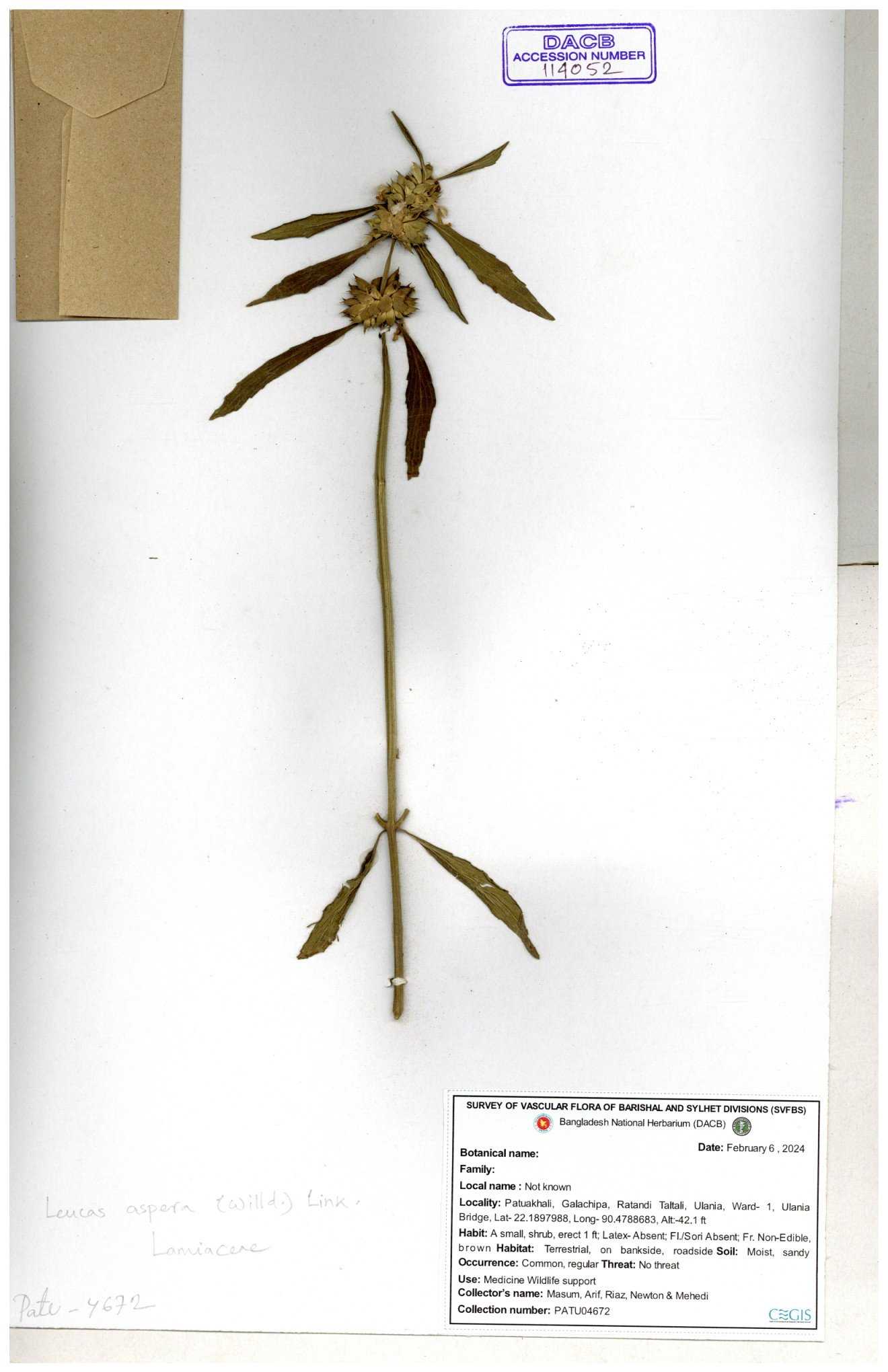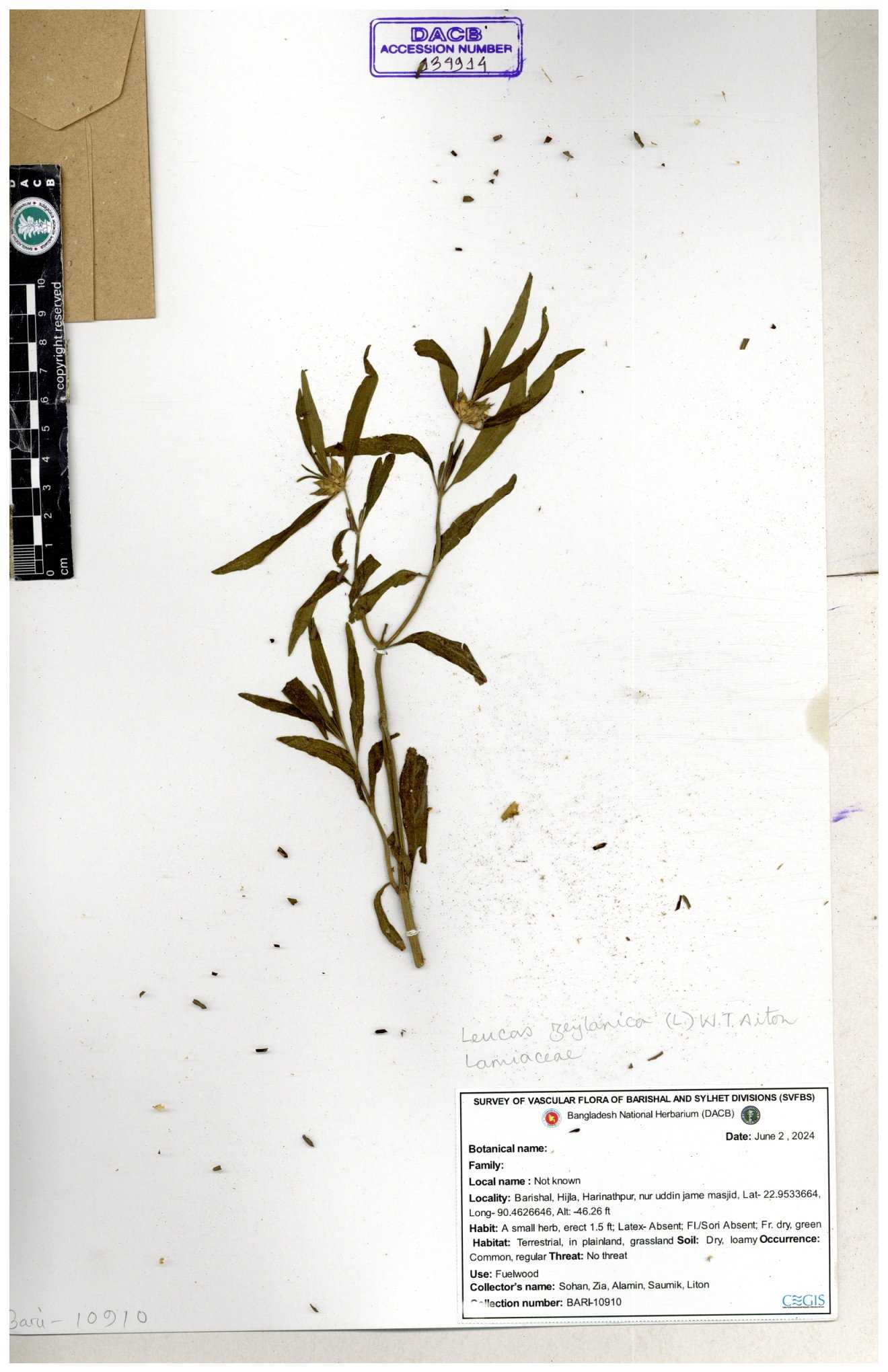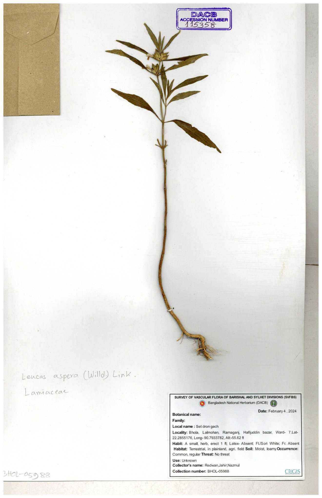 | 65959 | Lamiaceae | Leucas zeylanica (L.) W.T.Aiton | Domkolos | Khandakar Kamrul Islam | KKI-4020 12-02-2020 |