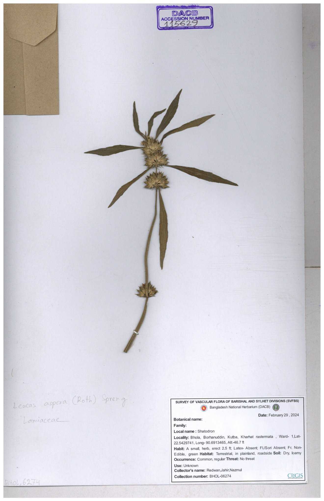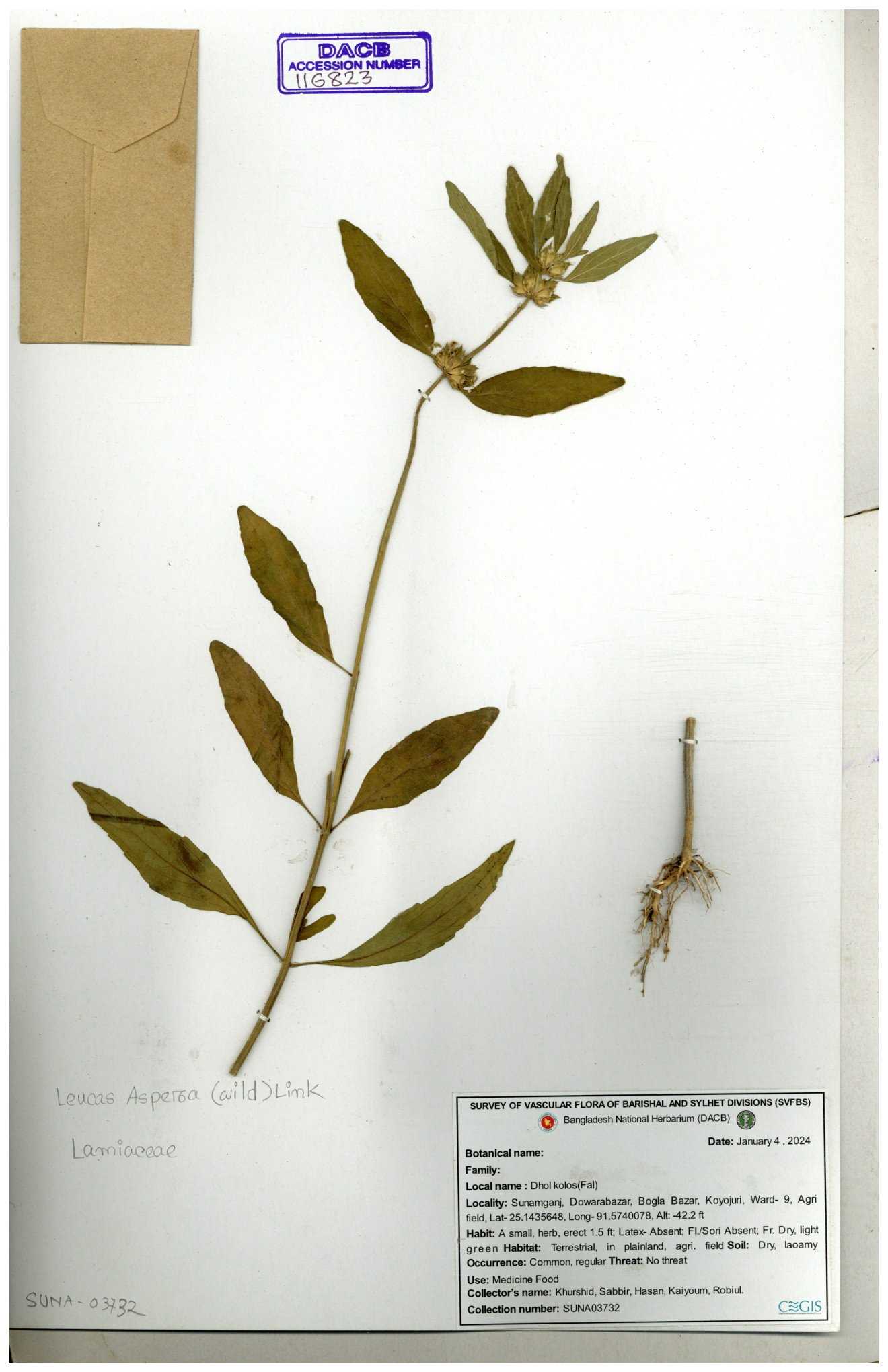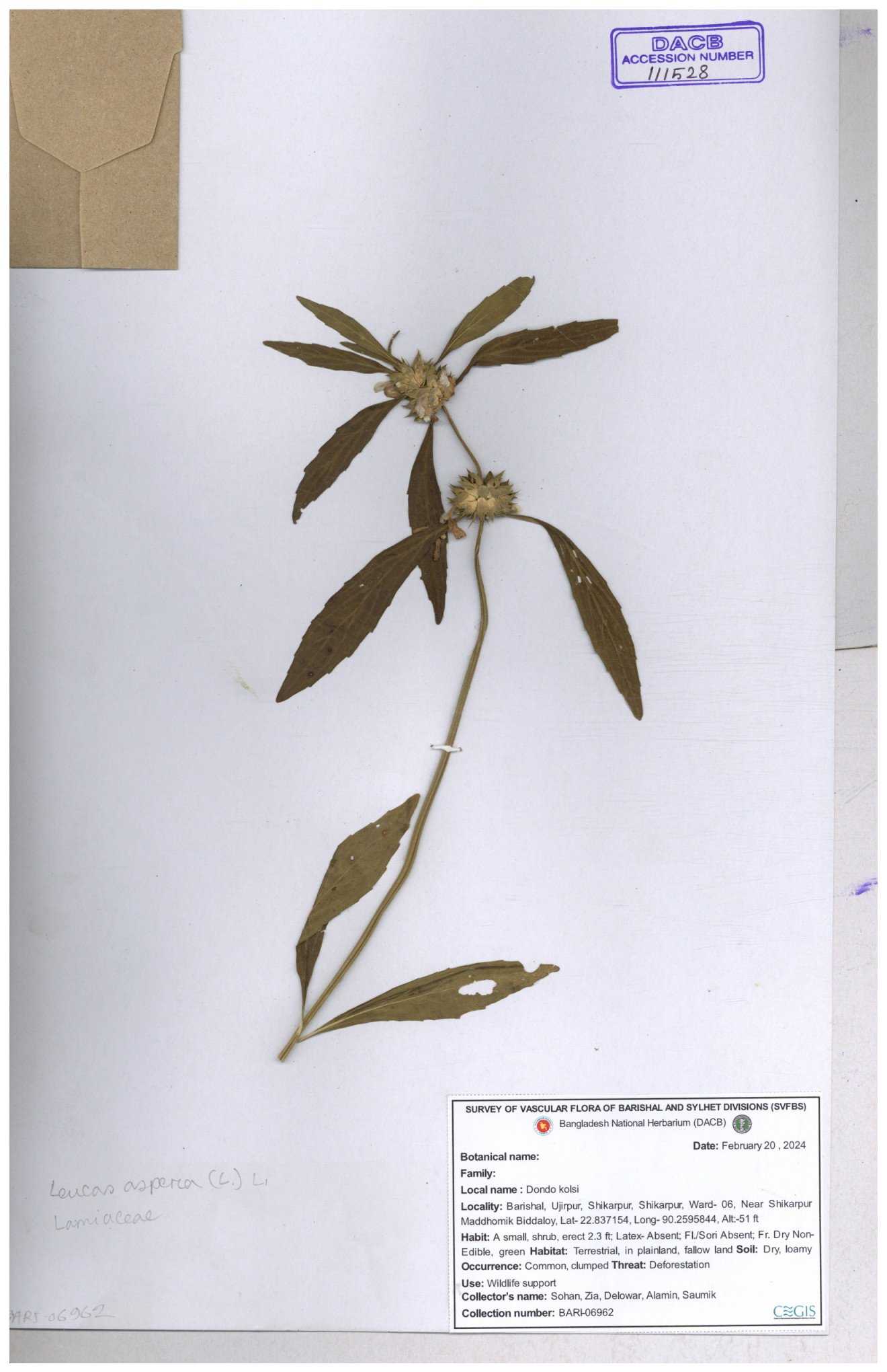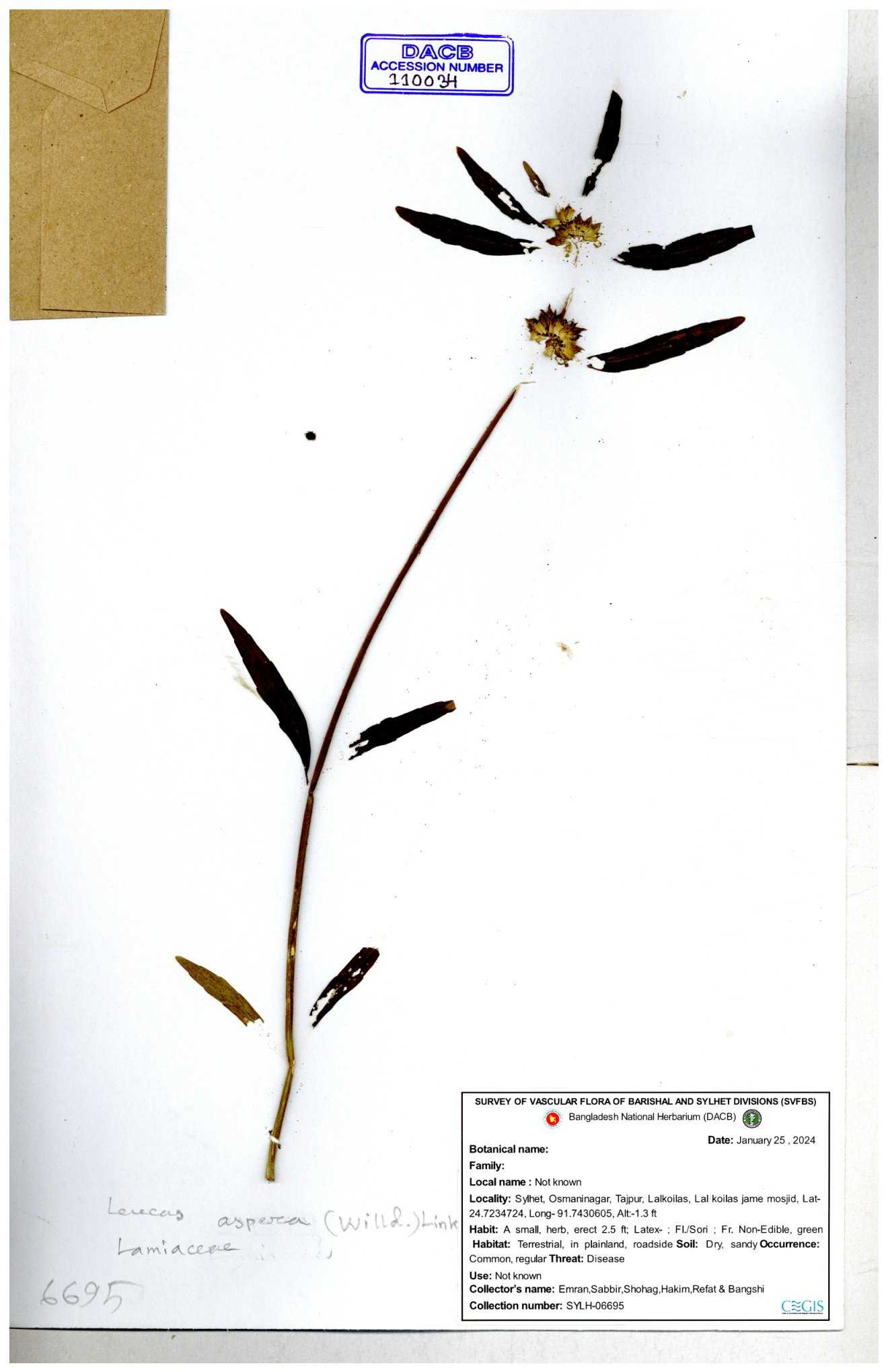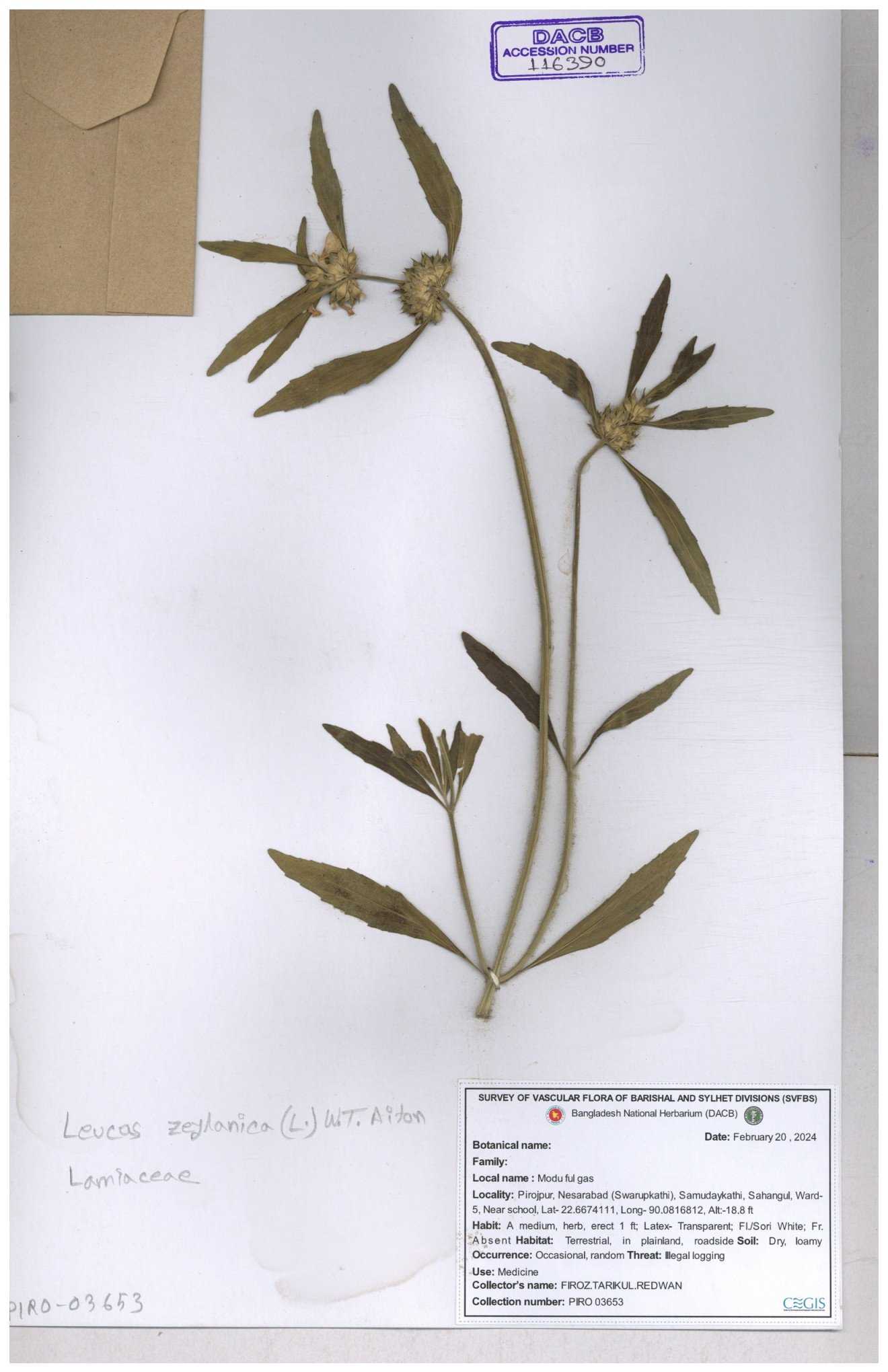 | 65959 | Lamiaceae | Leucas zeylanica (L.) W.T.Aiton | Domkolos | Khandakar Kamrul Islam | KKI-4020 12-02-2020 |