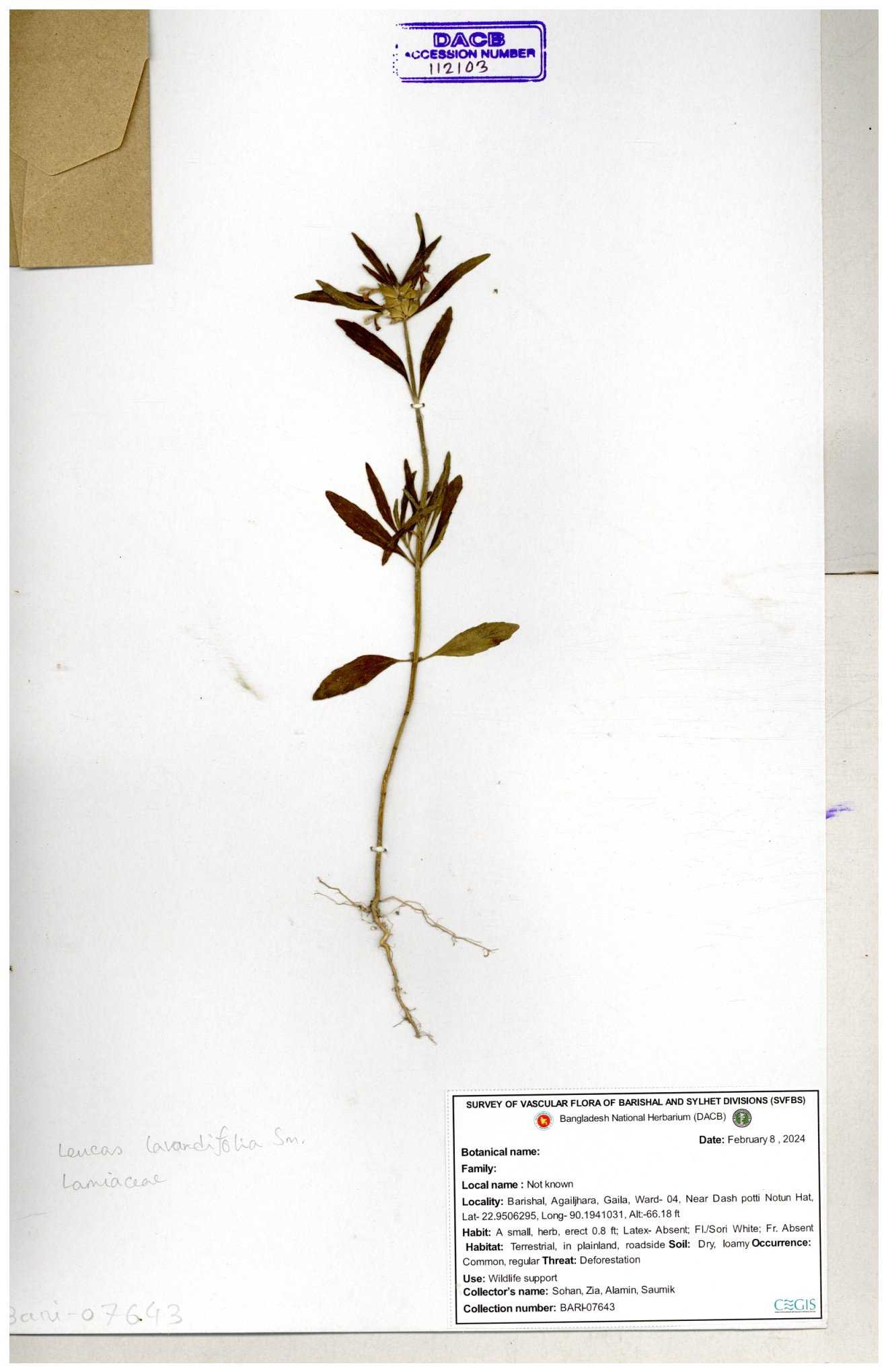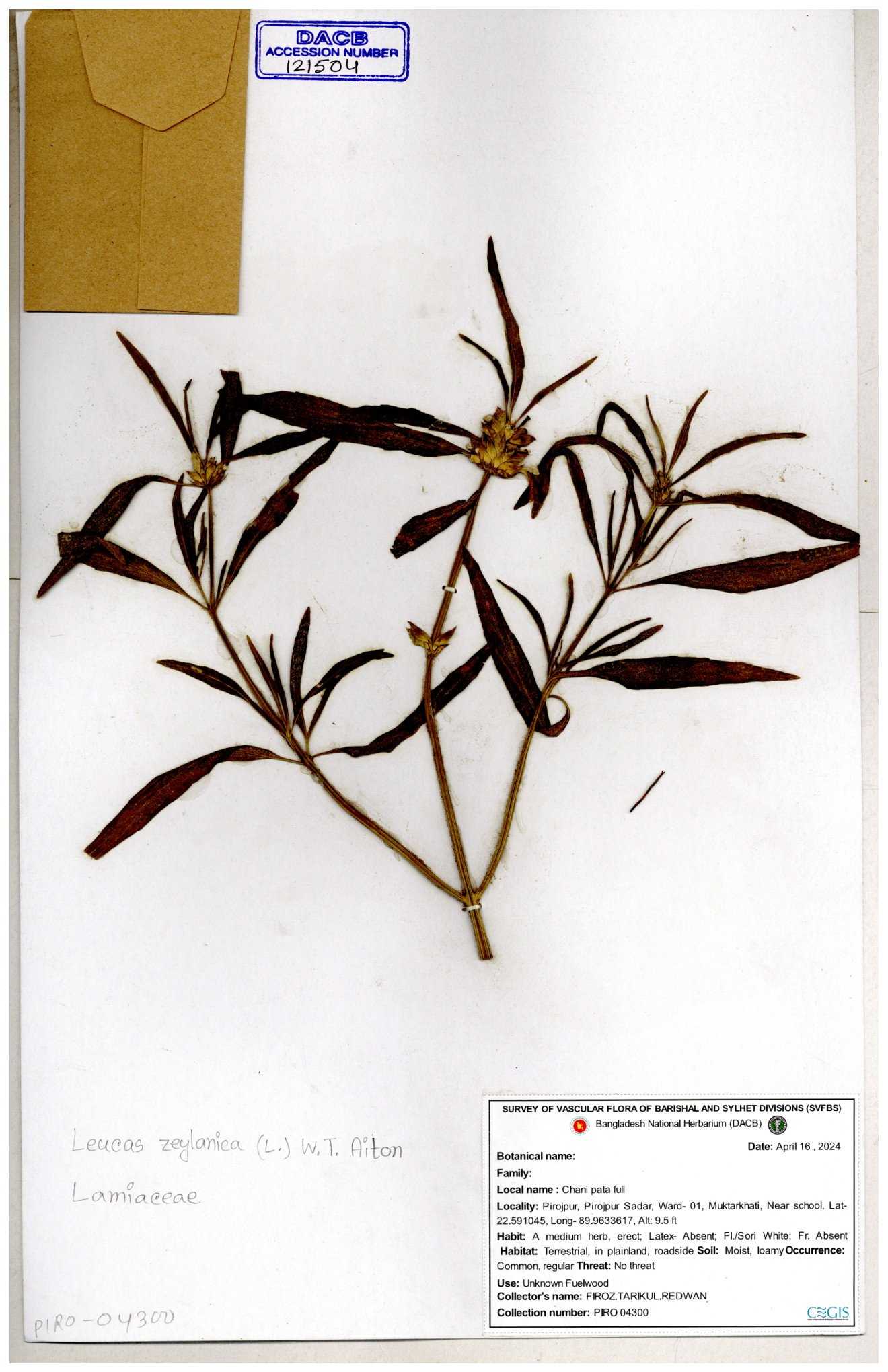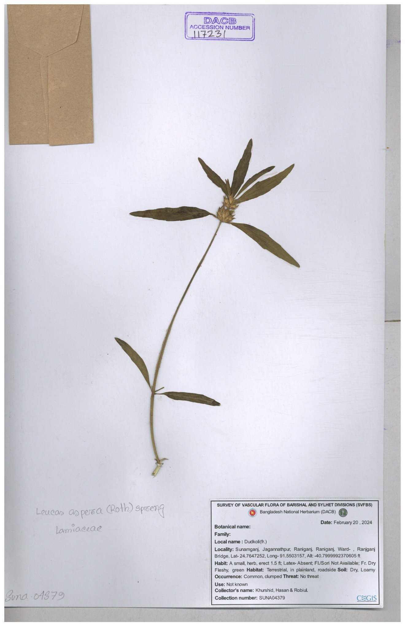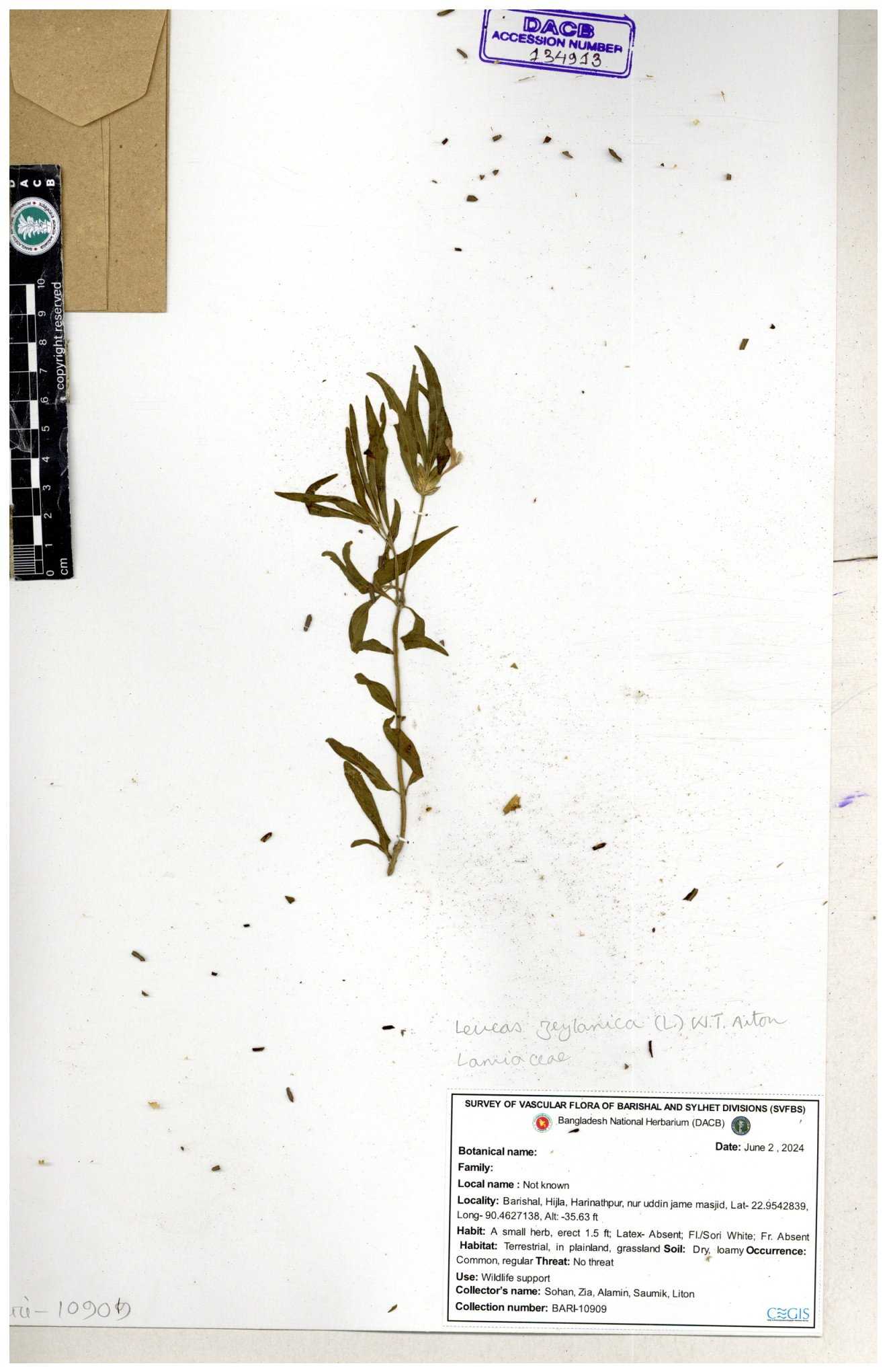 | 65959 | Lamiaceae | Leucas zeylanica (L.) W.T.Aiton | Domkolos | Khandakar Kamrul Islam | KKI-4020 12-02-2020 |