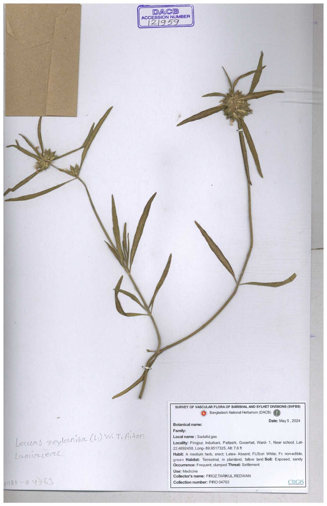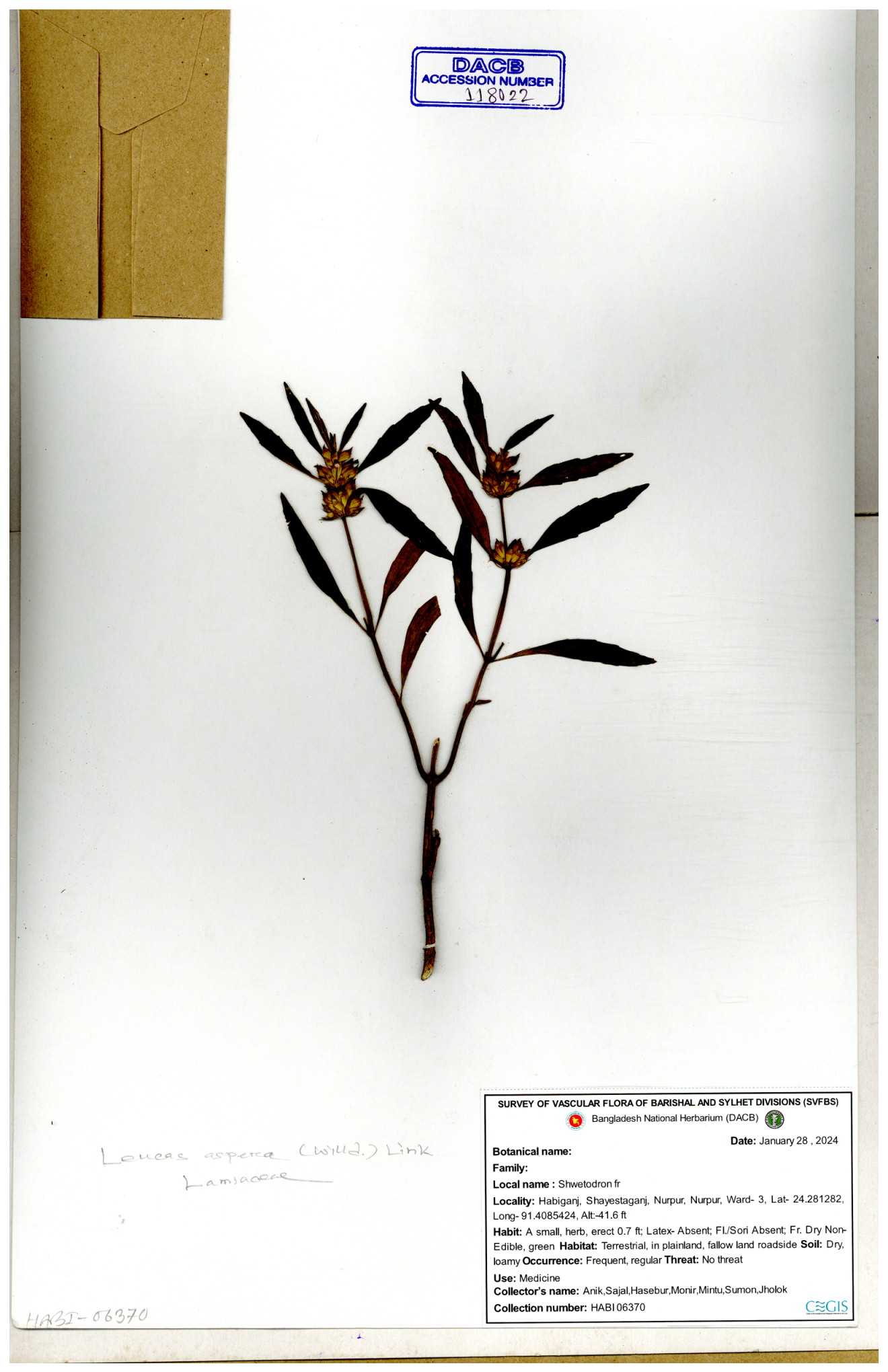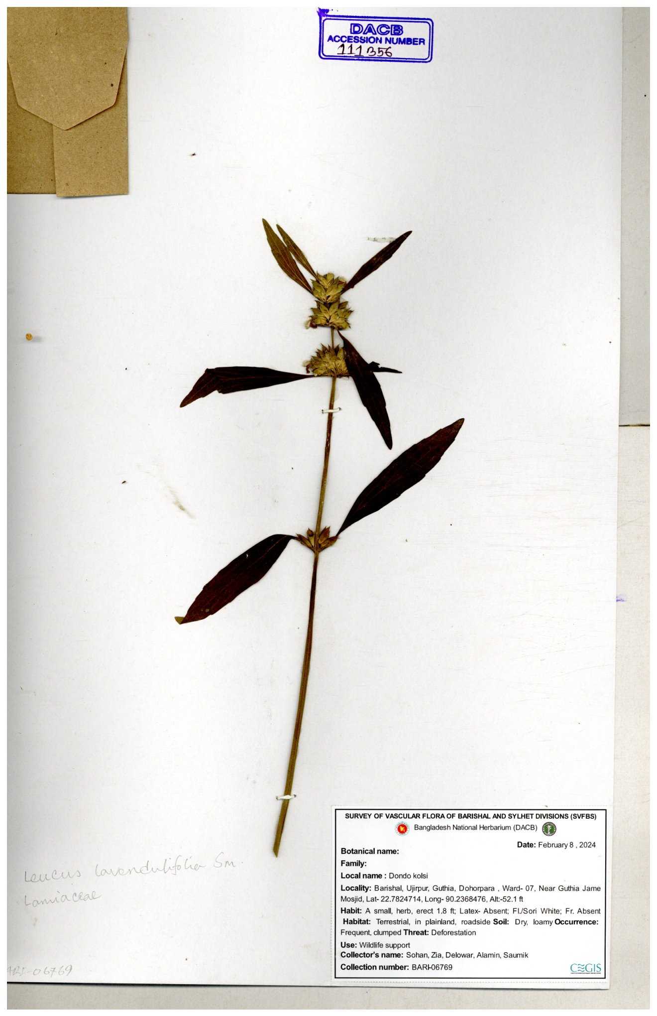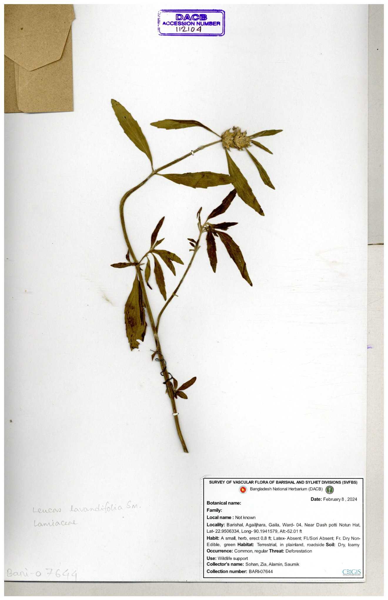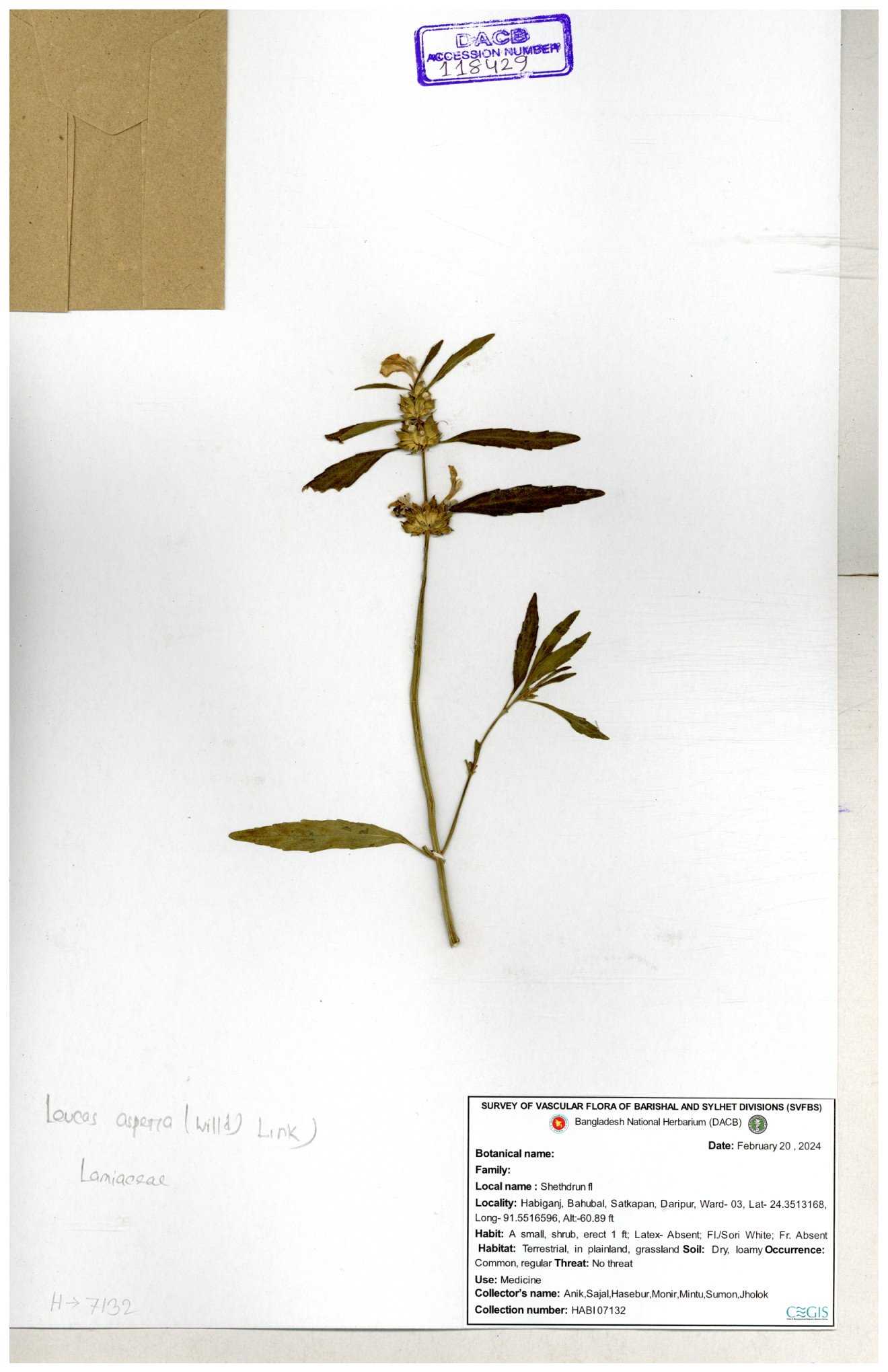 | 65959 | Lamiaceae | Leucas zeylanica (L.) W.T.Aiton | Domkolos | Khandakar Kamrul Islam | KKI-4020 12-02-2020 |