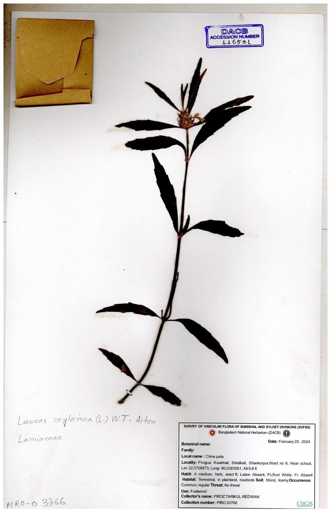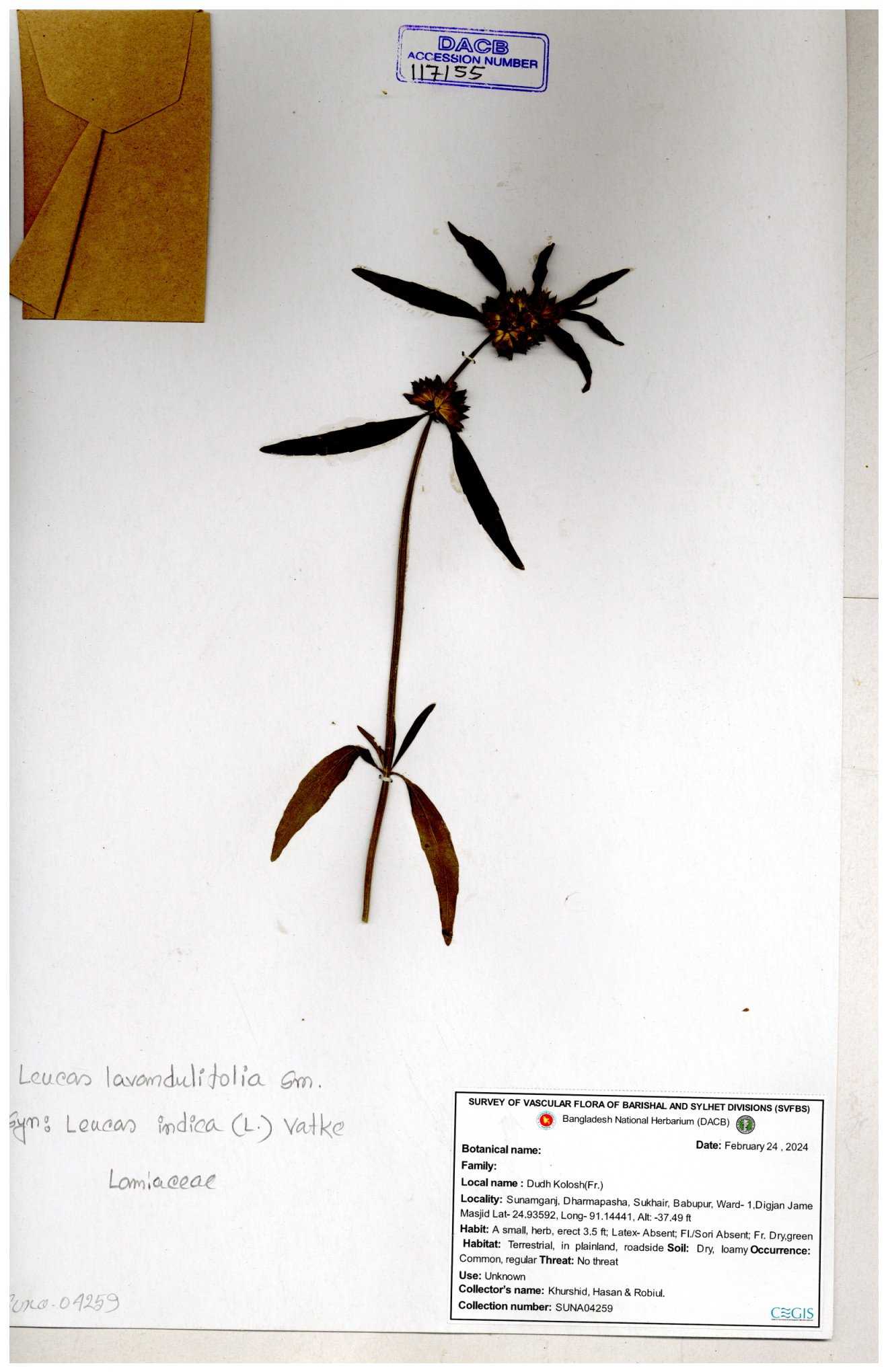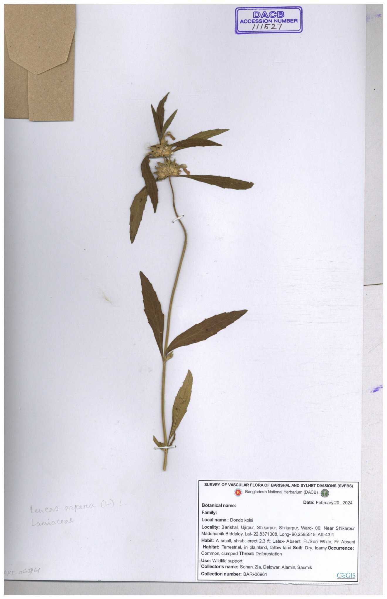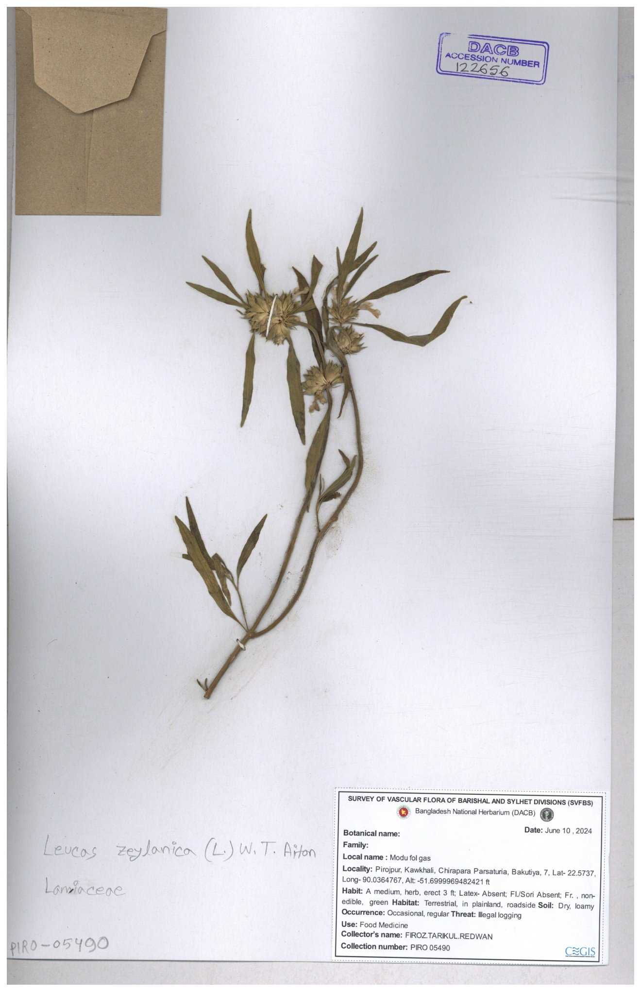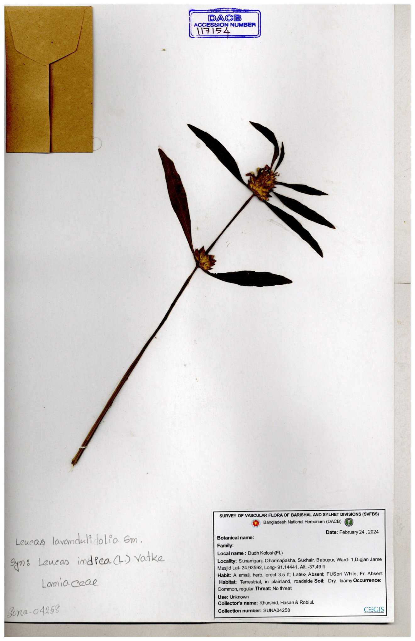 | 65959 | Lamiaceae | Leucas zeylanica (L.) W.T.Aiton | Domkolos | Khandakar Kamrul Islam | KKI-4020 12-02-2020 |
