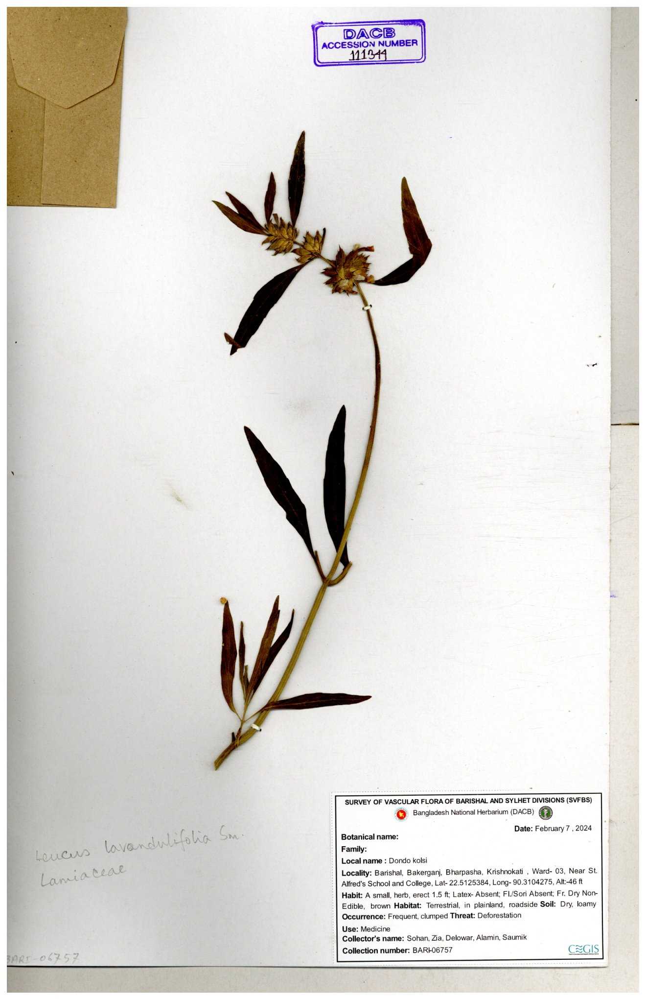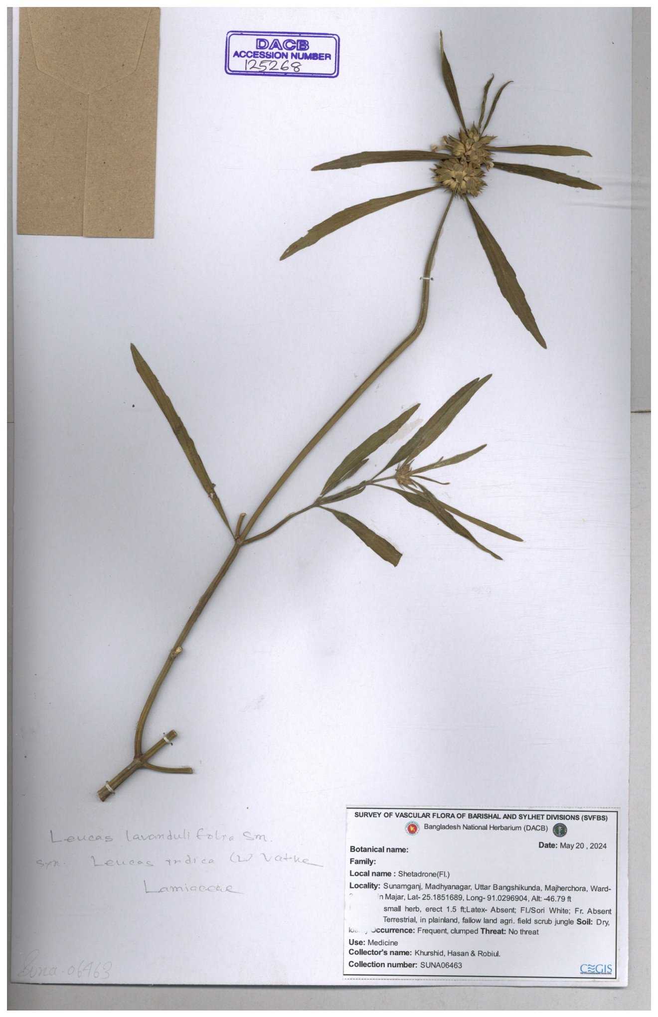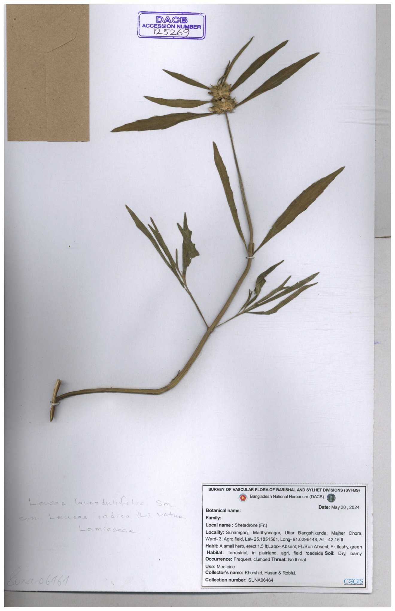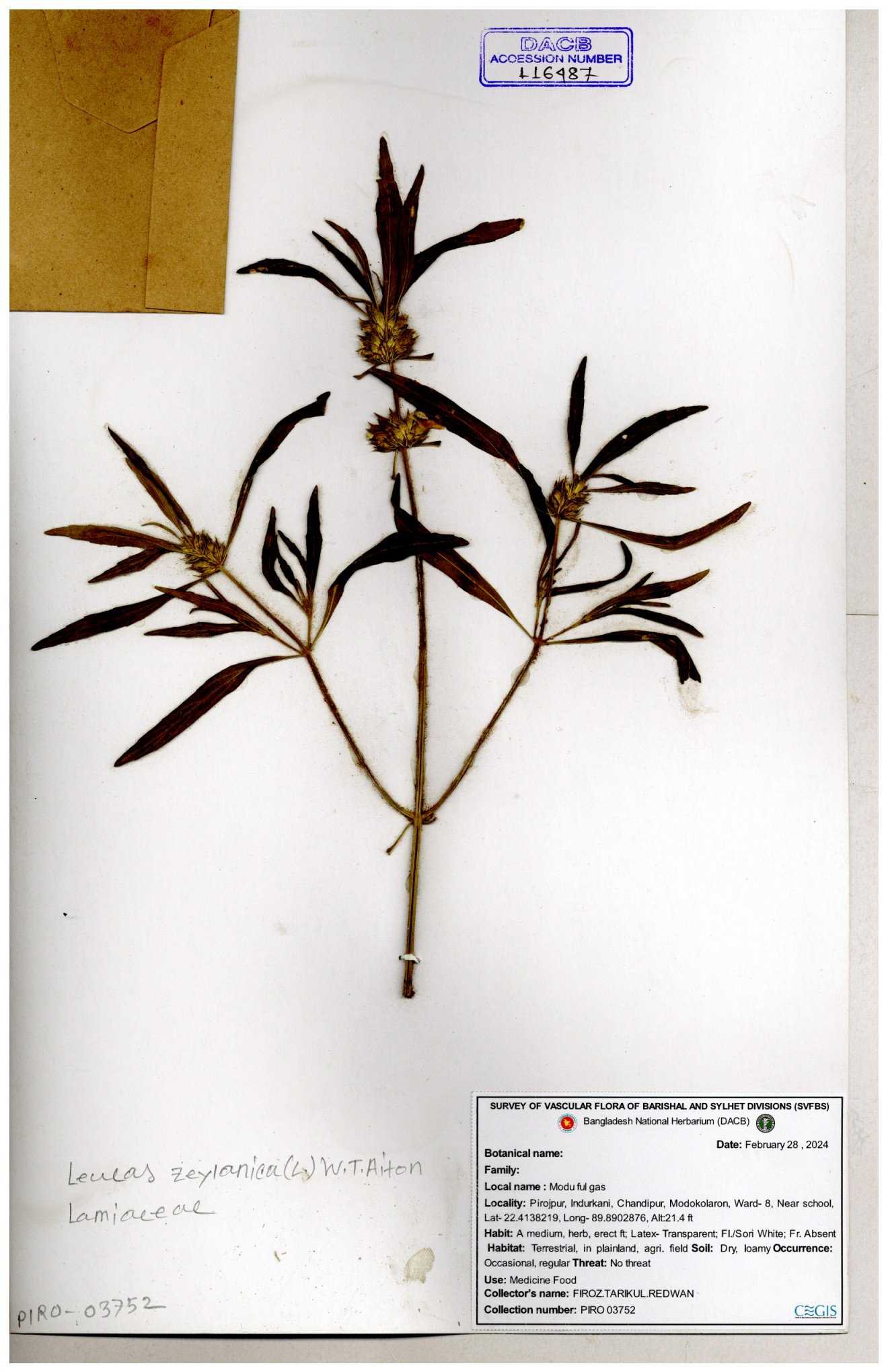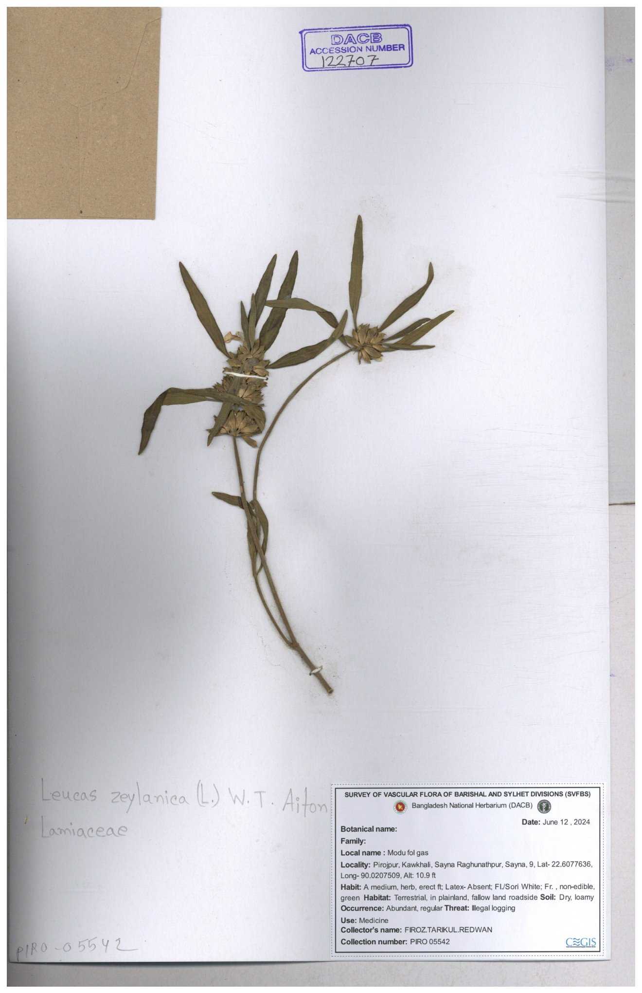 | 65959 | Lamiaceae | Leucas zeylanica (L.) W.T.Aiton | Domkolos | Khandakar Kamrul Islam | KKI-4020 12-02-2020 |