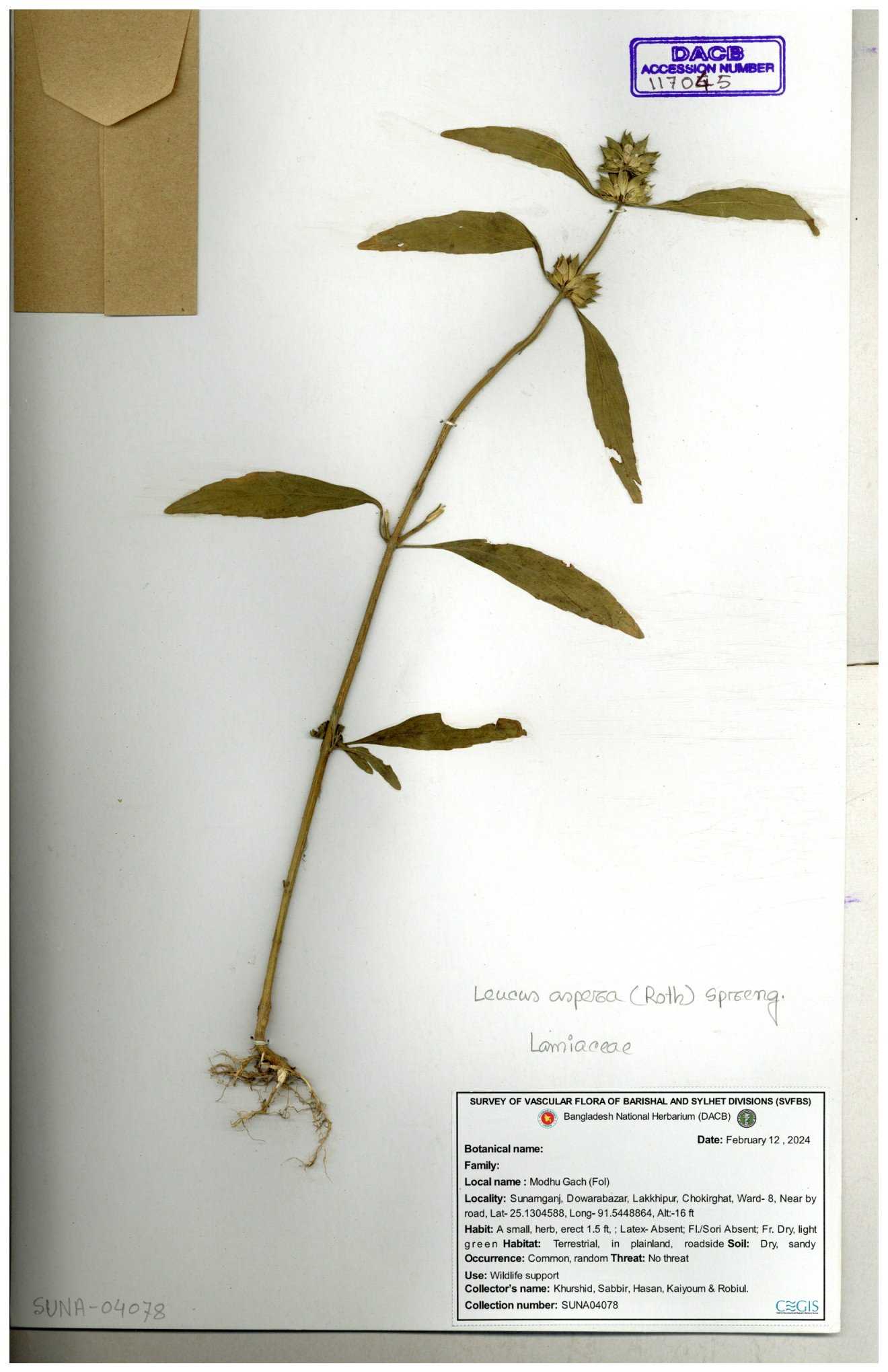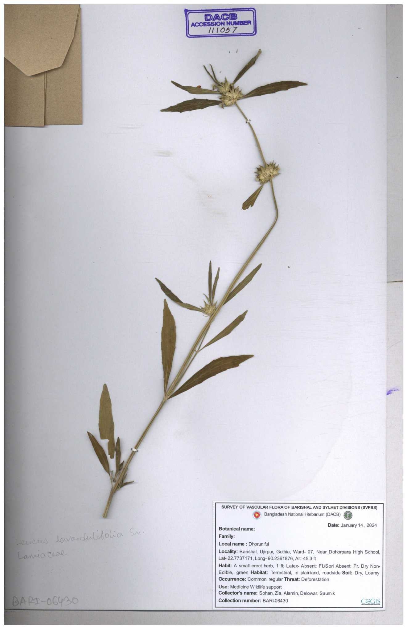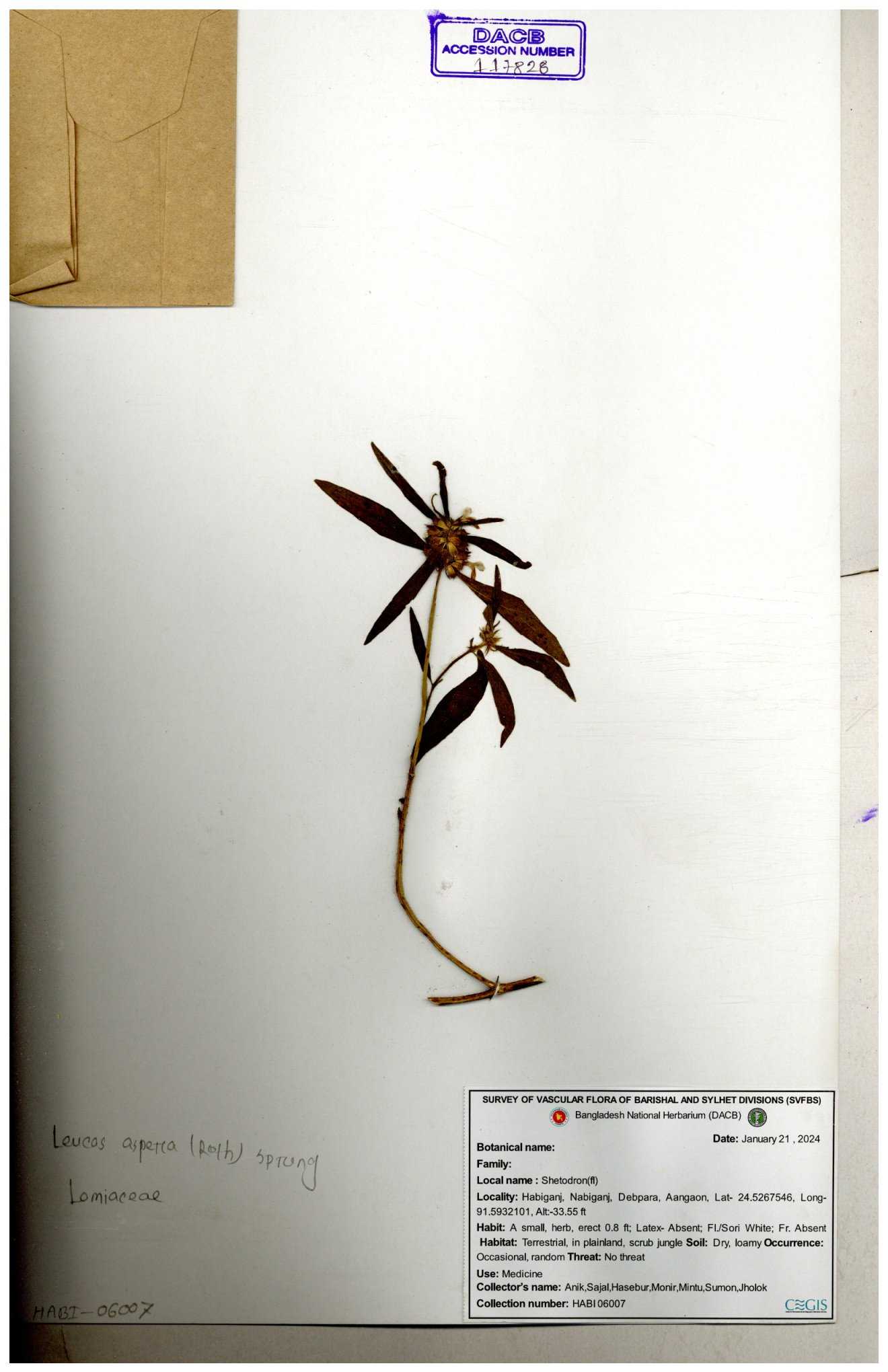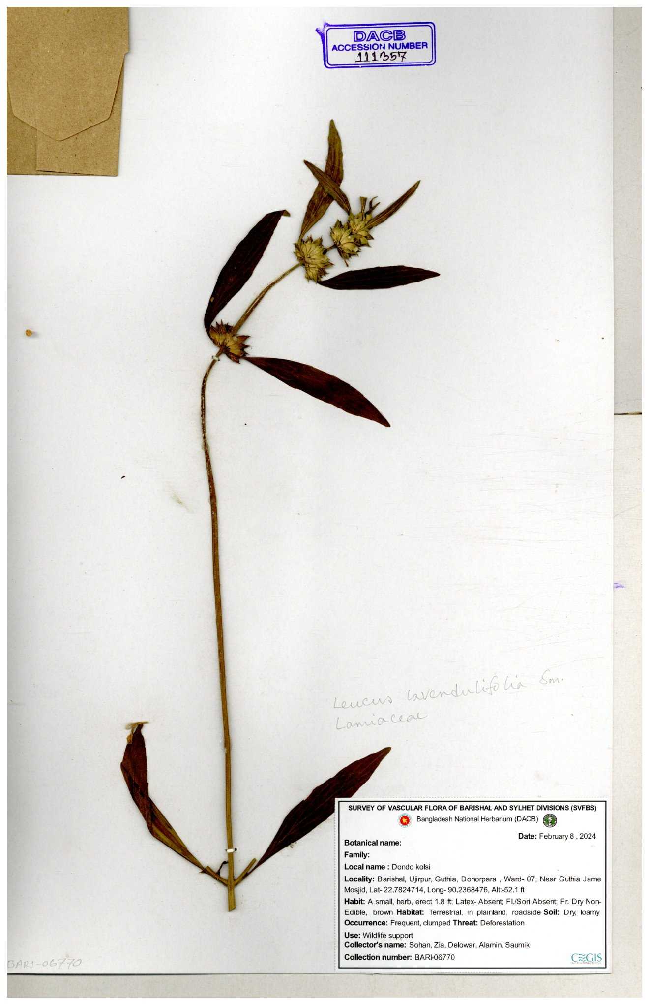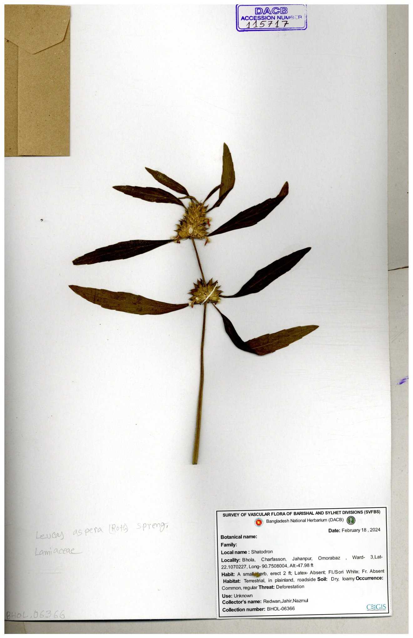 | 65959 | Lamiaceae | Leucas zeylanica (L.) W.T.Aiton | Domkolos | Khandakar Kamrul Islam | KKI-4020 12-02-2020 |